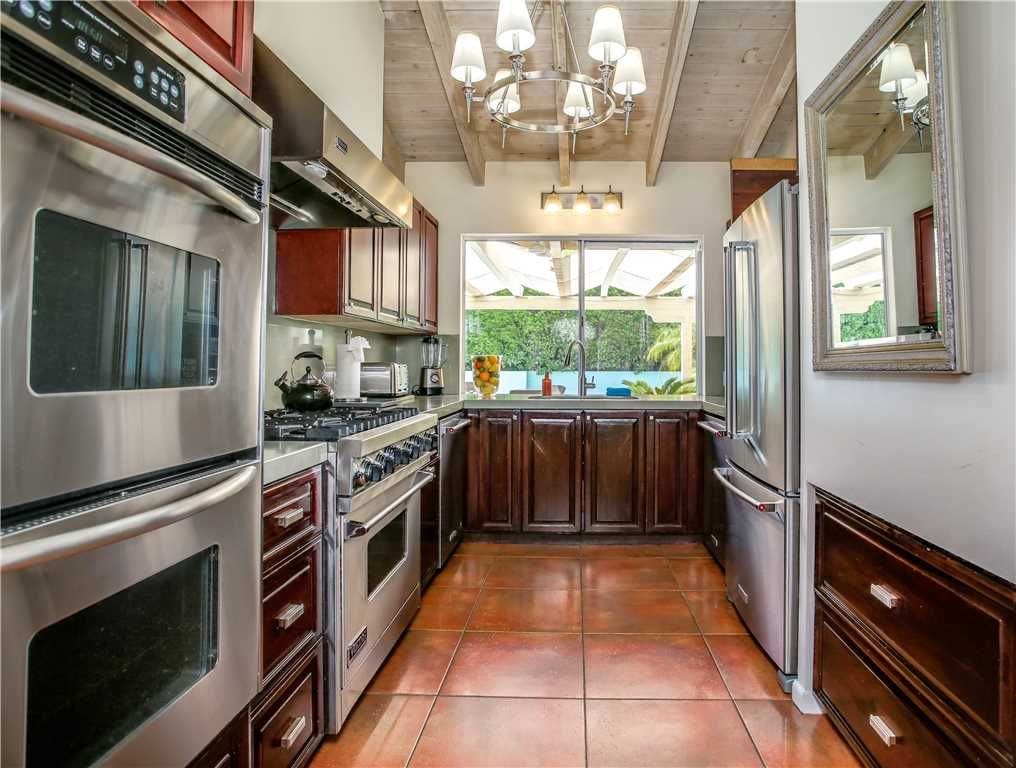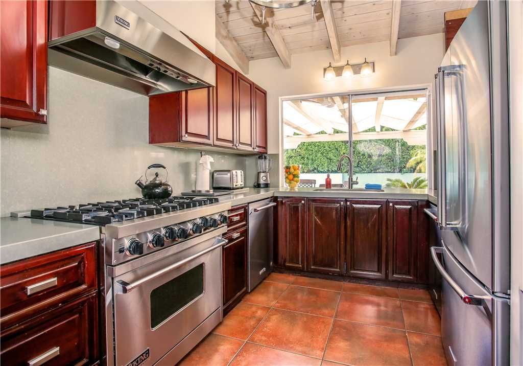 For important celebrations of family and friends, golf retreats, festival weekends, reunions, or corporate events, this vacation home's formal dining room (featuring one of two fireplaces in the home) is another great feature. The dining room opens on to a terrace area alongside the pool for outdoor dining and entertaining. The homes excellently appointed kitchen is nestled to one side. Our old style Palm Springs kitchen is appointed with a Viking oven and high end KitchenAid appliances. Our kitchen is also fully loaded with anything needed for cooking, baking, and grilling, including poolside cups and plates for outside entertaining The kitchen houses a regular coffee maker, as well as a Keurig coffee maker for your brewing choice There is also a pass-through window to the outside dining area. A Weber BBQ can be found on the outside patio.