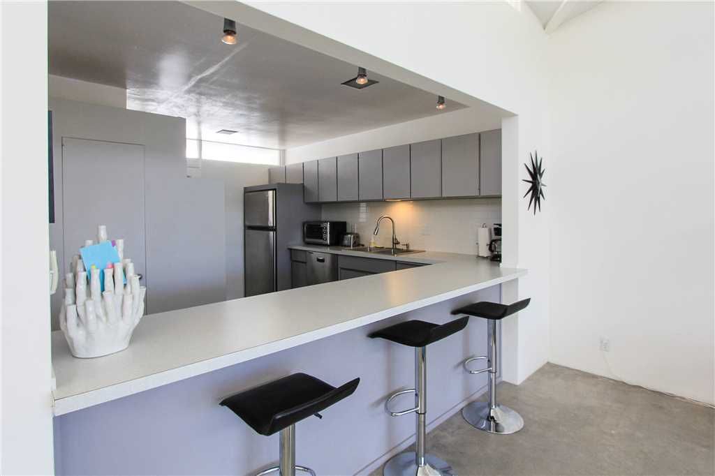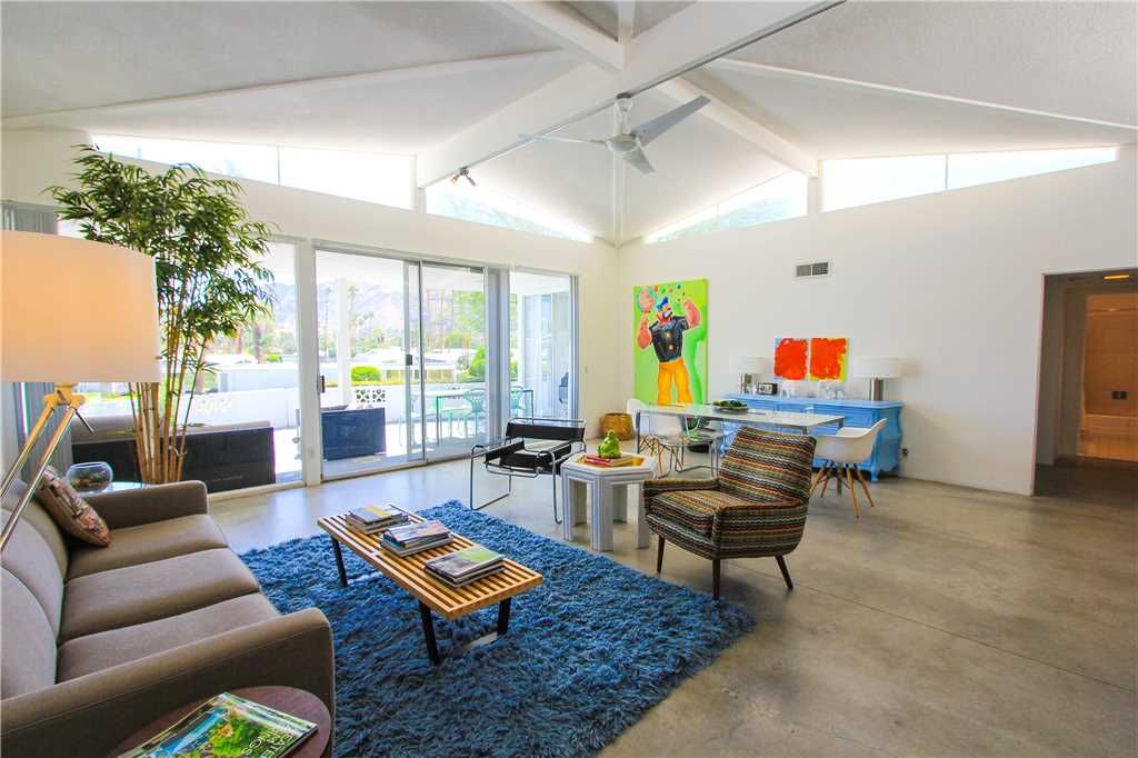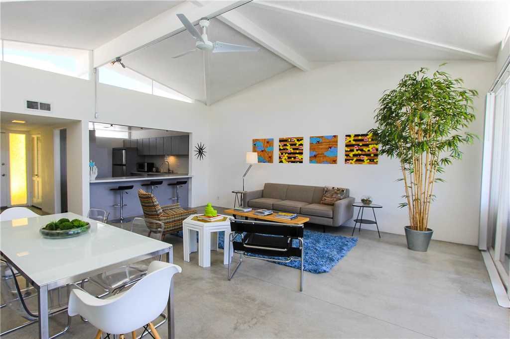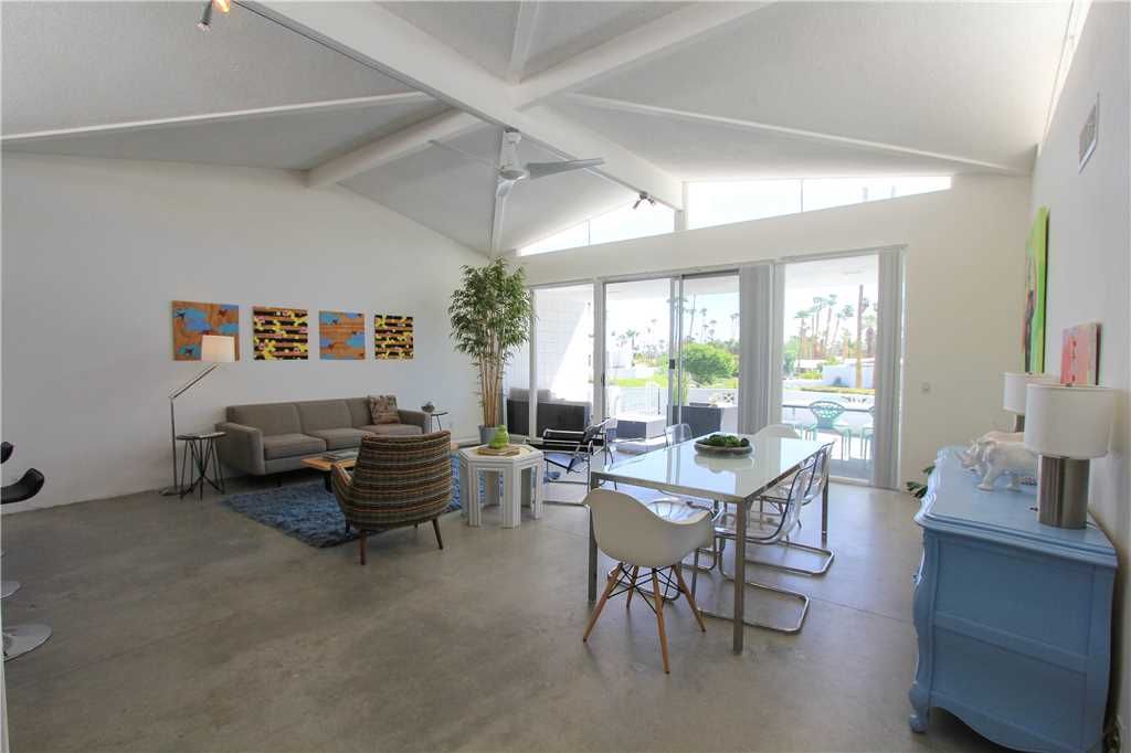 This midcentury modern Palm Springs condo for rent features a private and sophisticated space that includes a large open living/dining room with high ceilings and classic clerestory windows providing amazing light and breathtaking views, a media room/den with 50" HD flat screen TV, Cable, DVD player and a comfortable sleeper sofa.