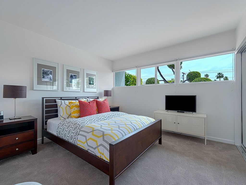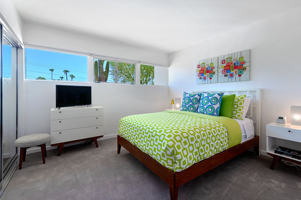 The master bedroom features a king bed, 42" TV, a modern en-suite bath, walk-in closet and glass slider to the backyard and pool. The two guest bedrooms share a fully upgraded hall bath and both include queen size beds and 32" TVs.