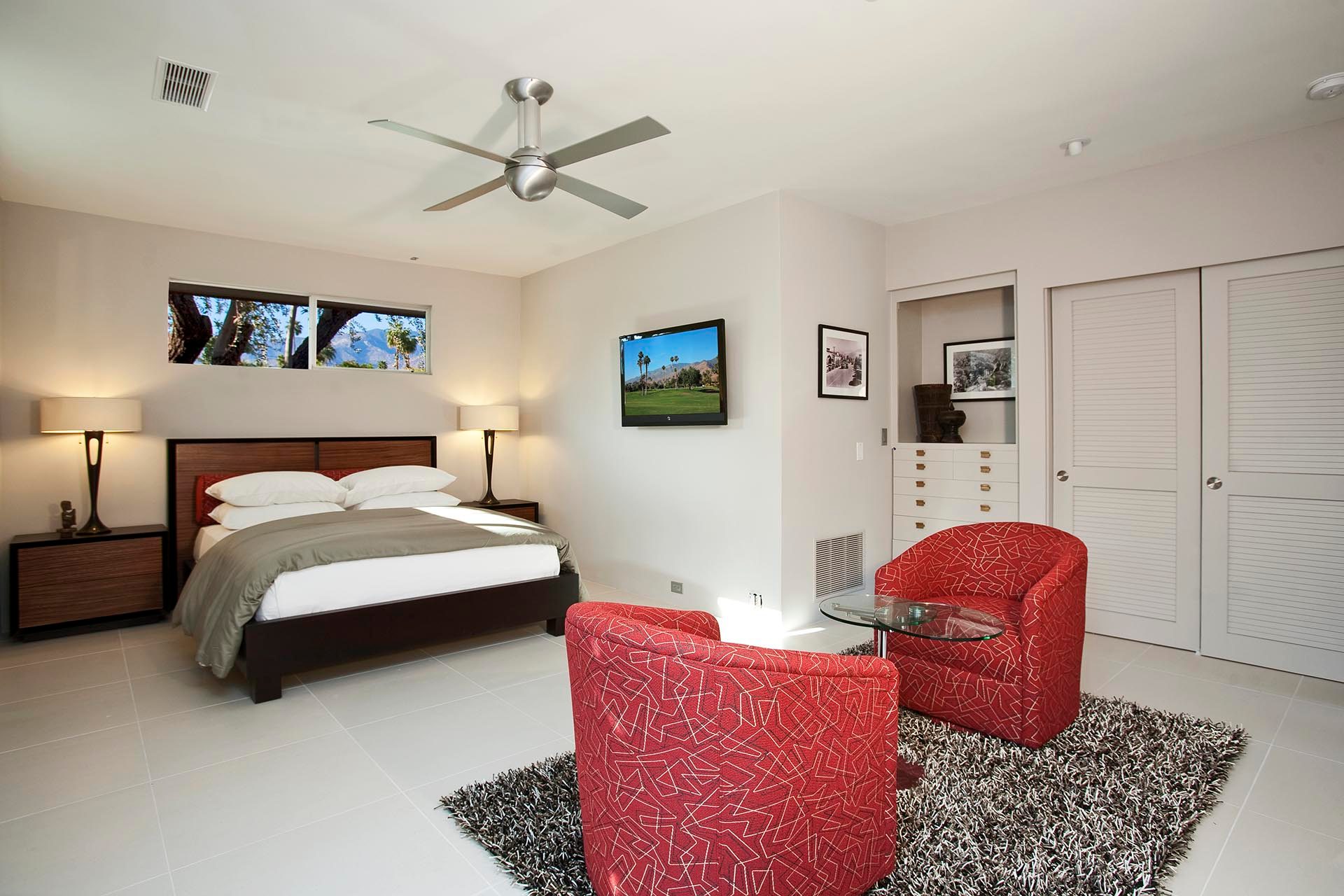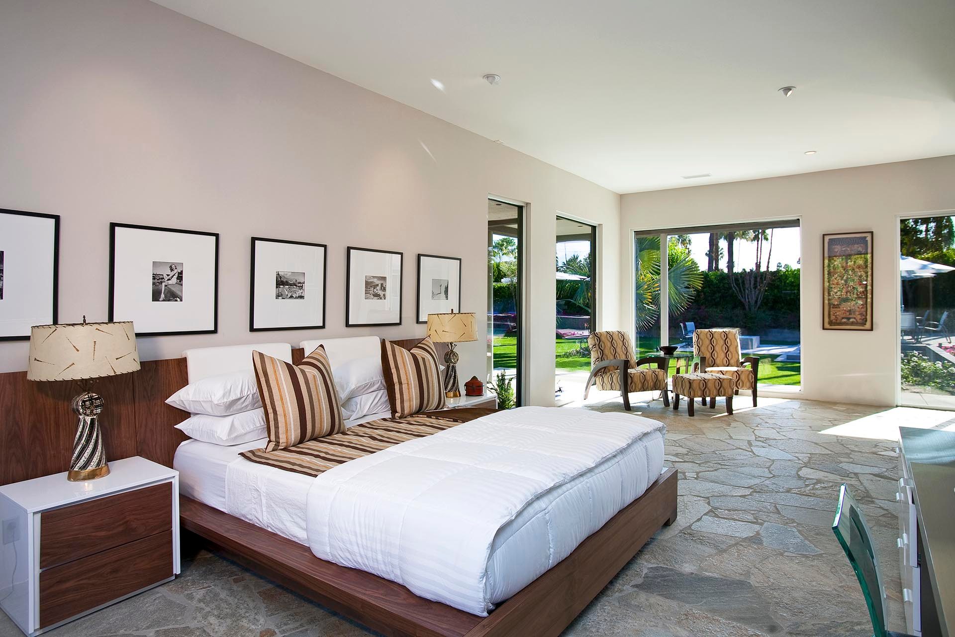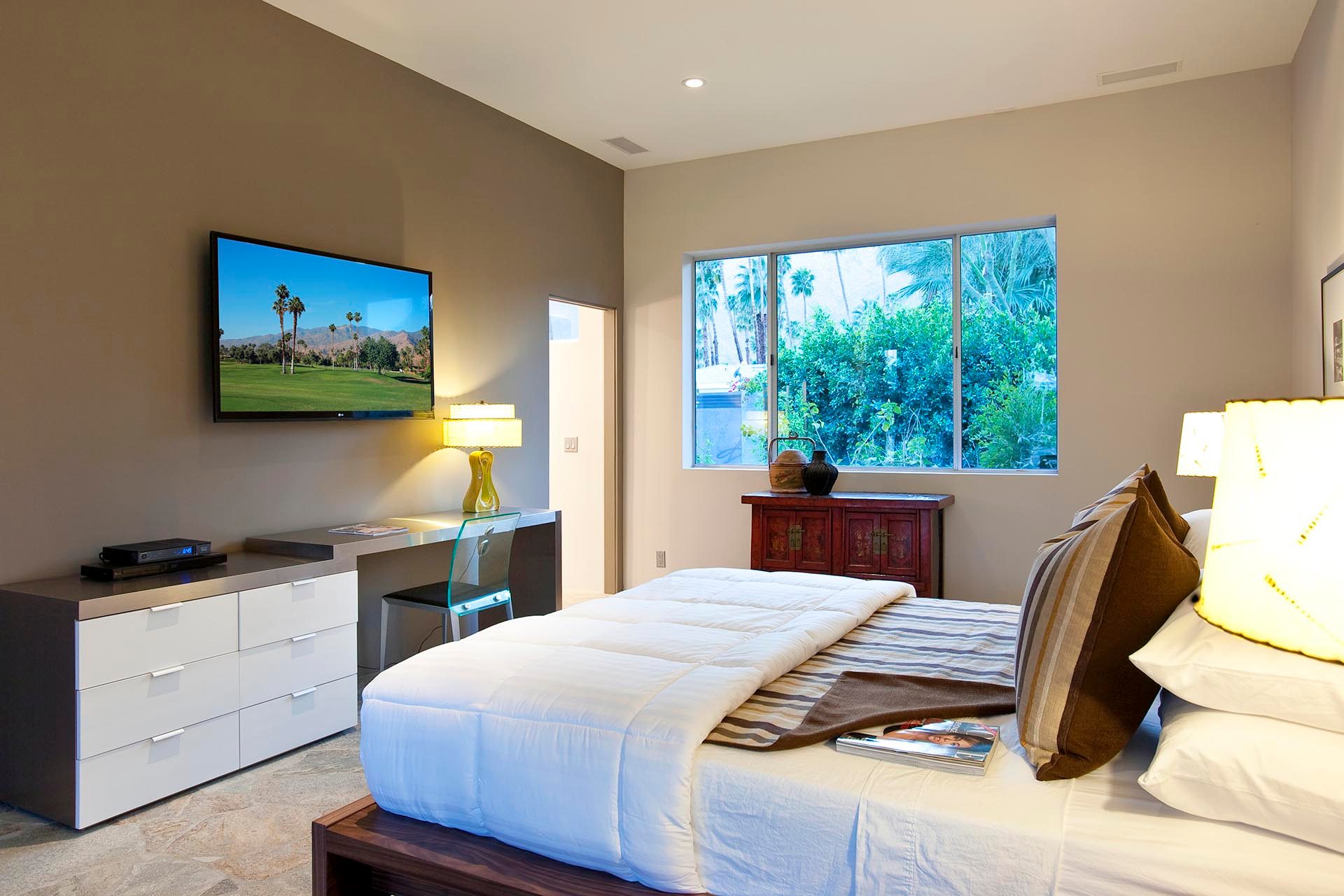 Master 3 located in private wing on the northwest side of the main home. Featuring two Queen Beds 55" LED TV with Blu Ray/DVD Player. This bedroom is uniquely situated with views to the mountains to the west and the Blue Palm, garden and pool to the east. It also has its own separate seating area for privacy and relaxation. The spacious en suite bath features a large shower, double sinks and views to the mountains.
