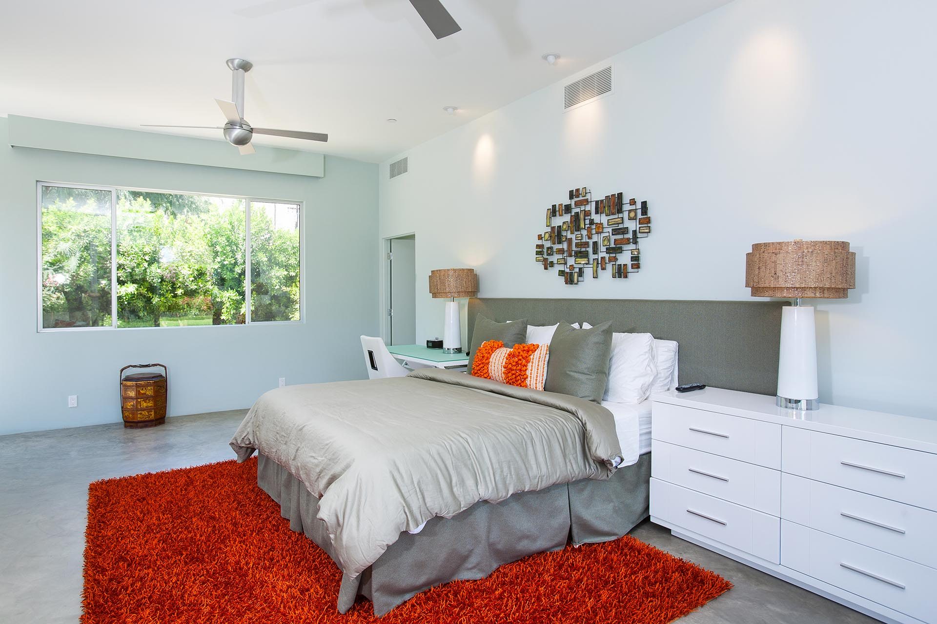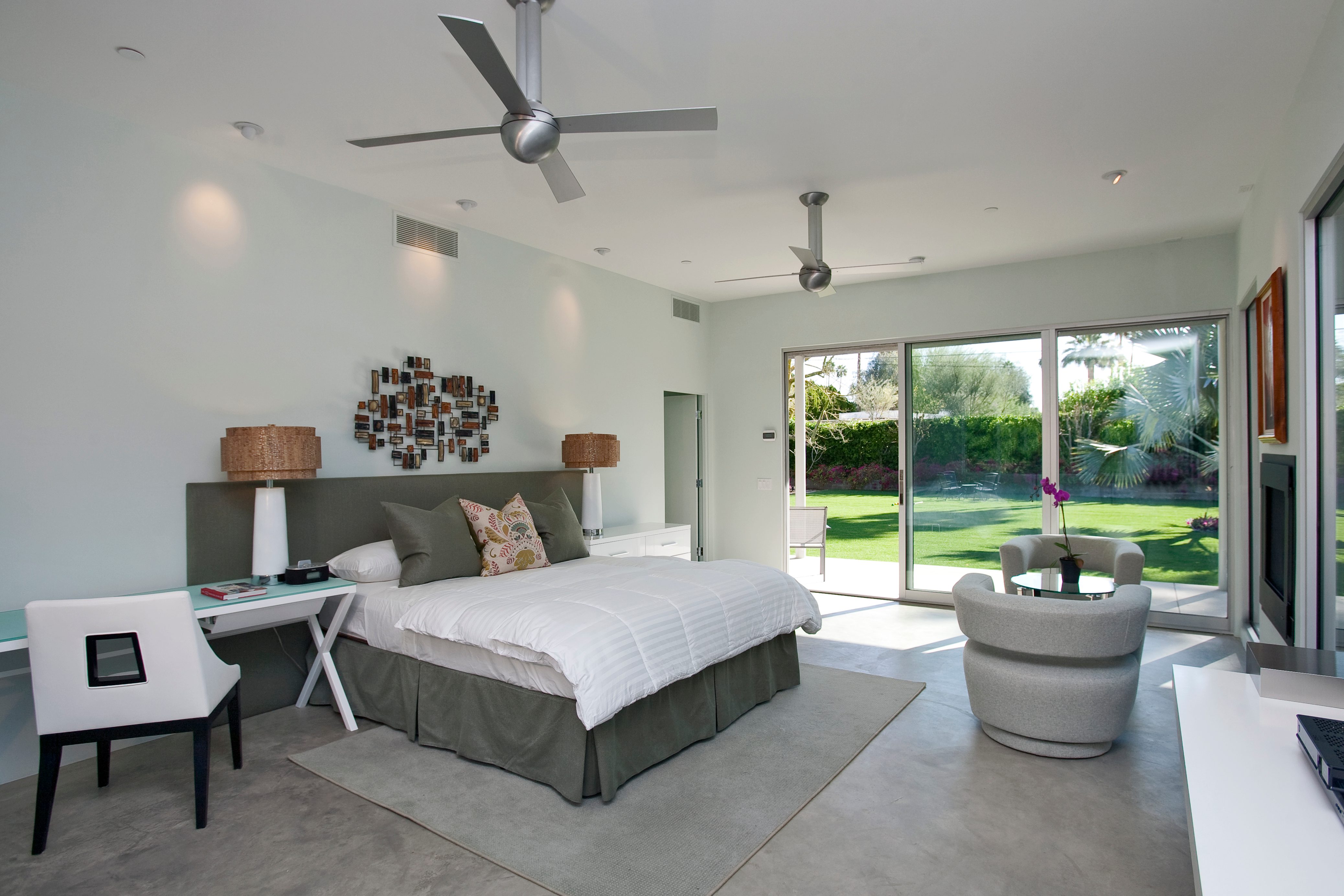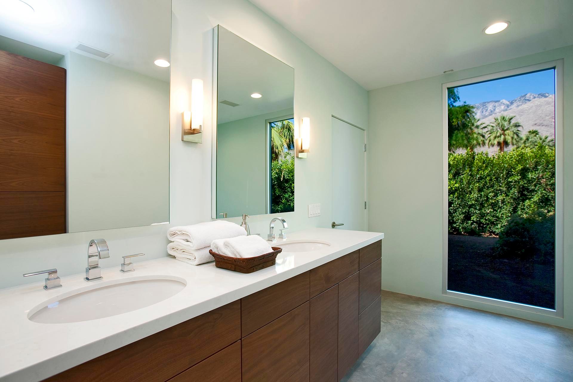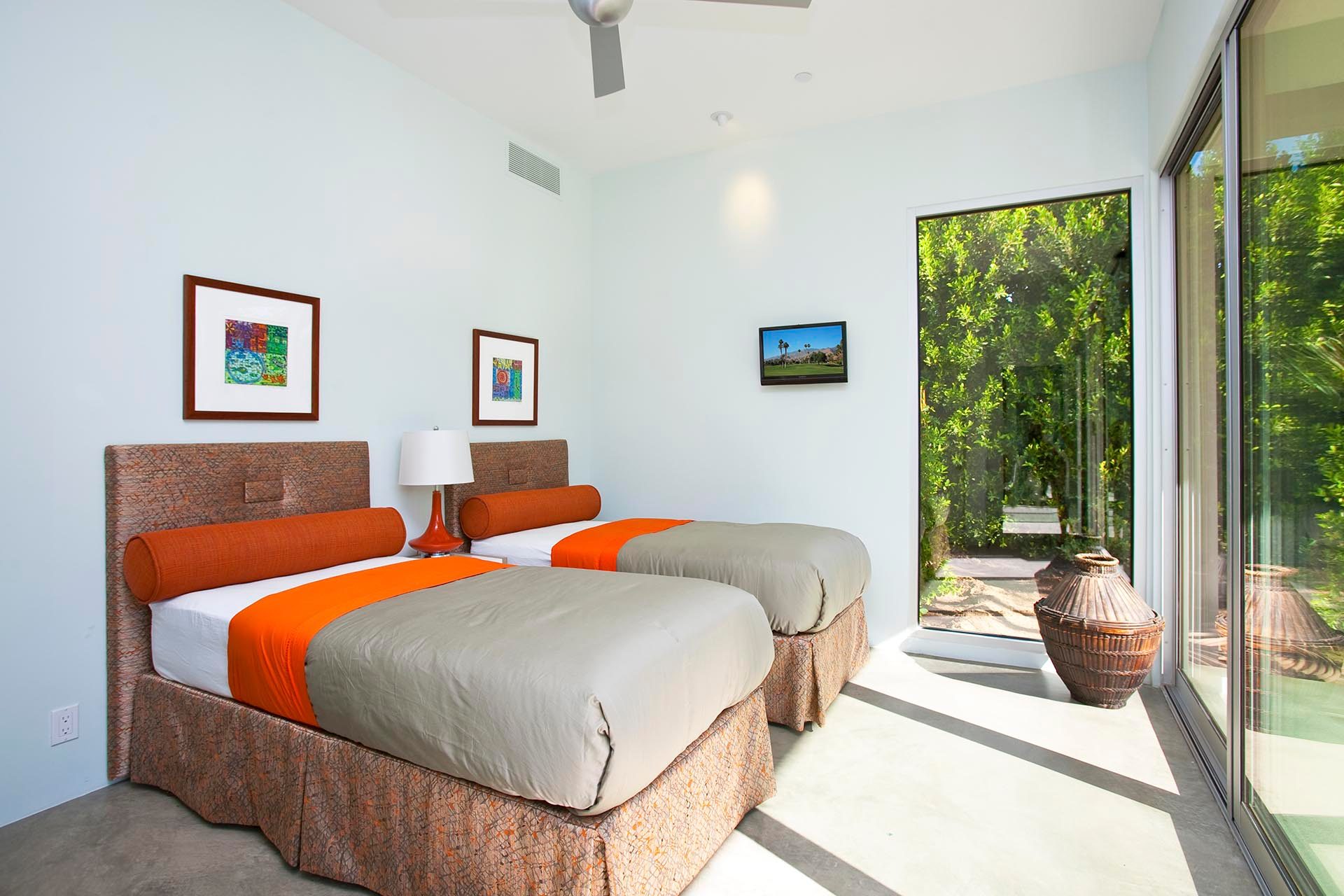 Master 3 located in private wing on the northwest side of the main home. Featuring two Queen Beds 55" LED TV with Blu Ray/DVD Player. This bedroom is uniquely situated with views to the mountains to the west and the Blue Palm, garden and pool to the east. It also has its own separate seating area for privacy and relaxation. The spacious en suite bath features a large shower, double sinks and views to the mountains.