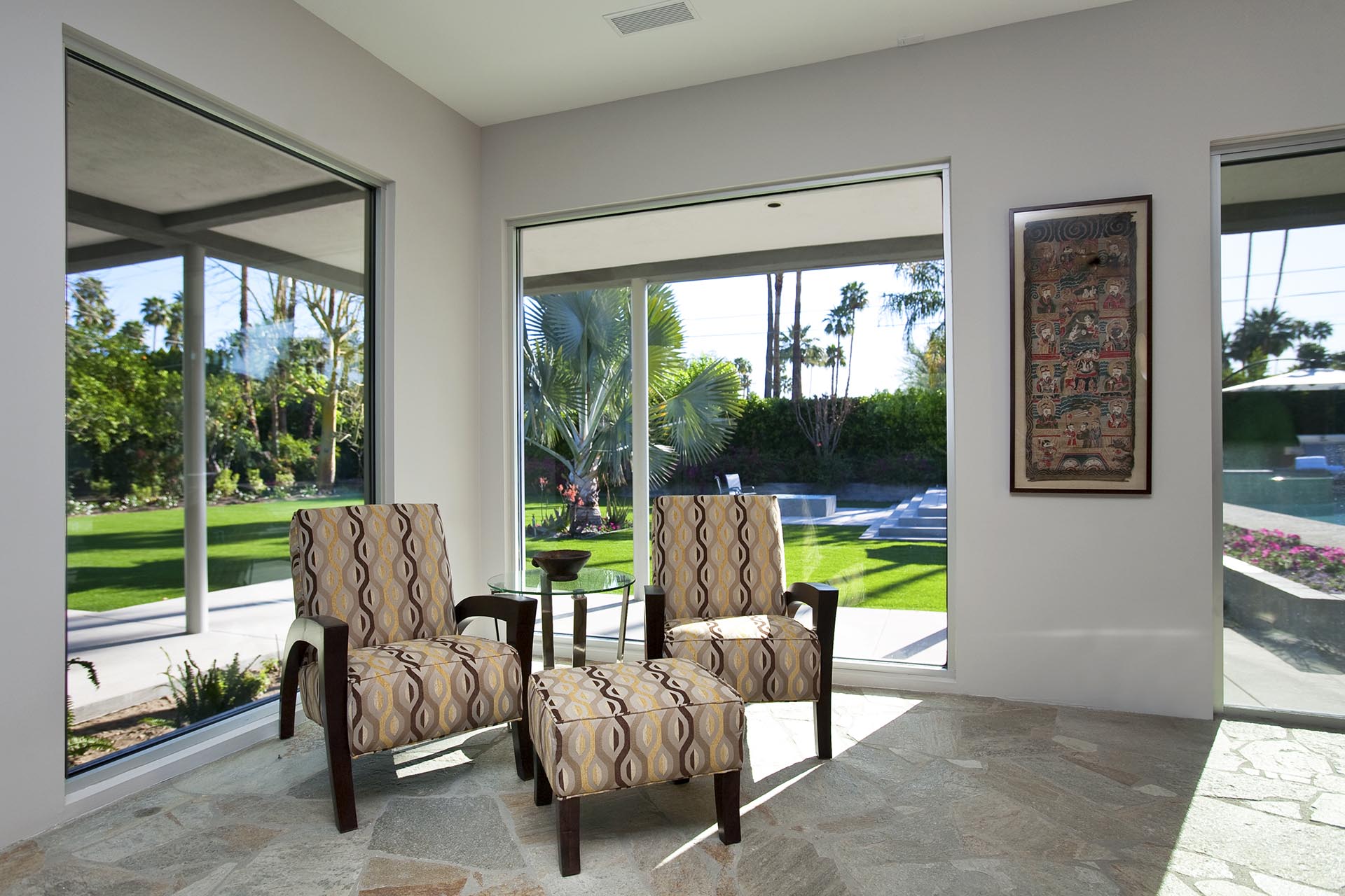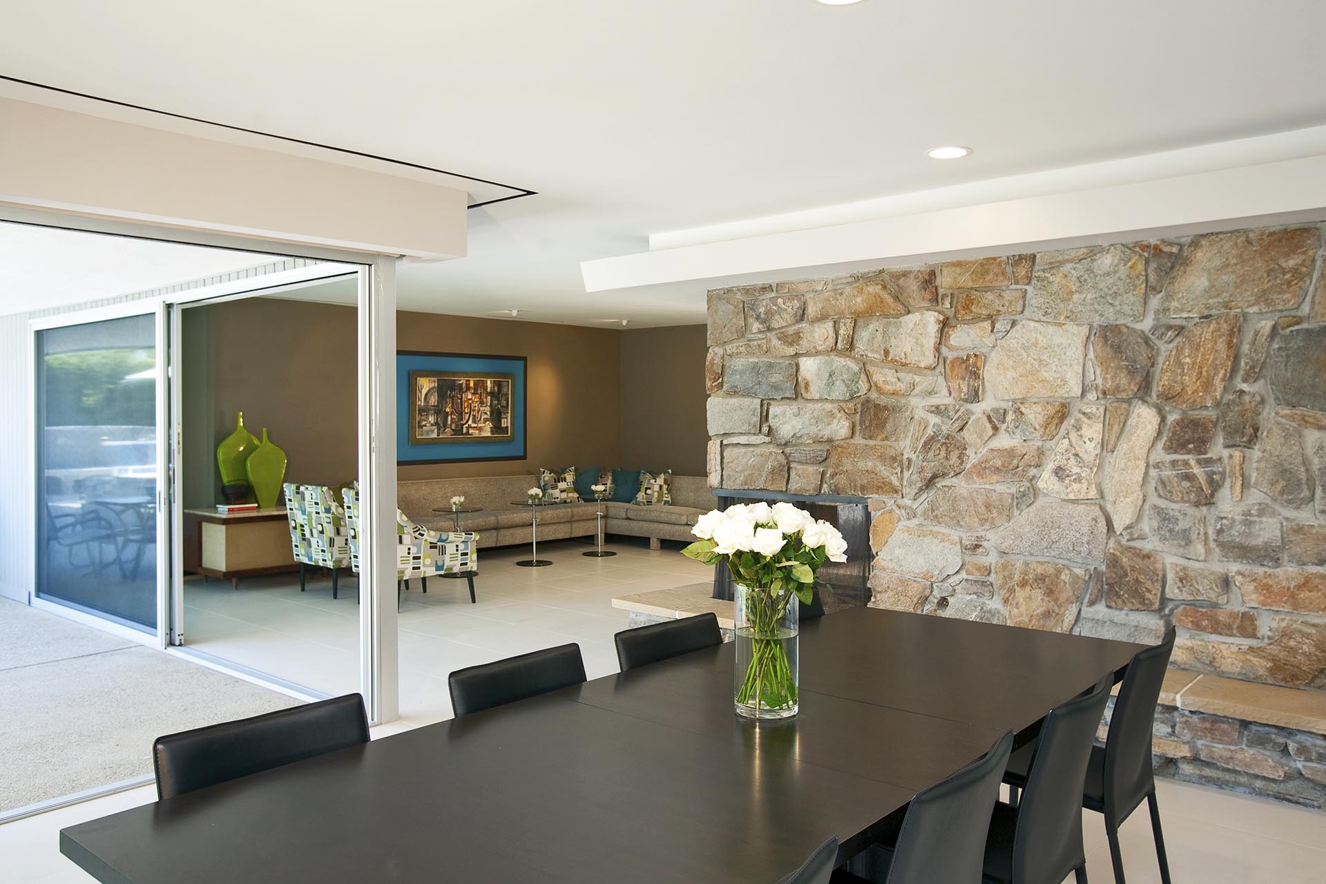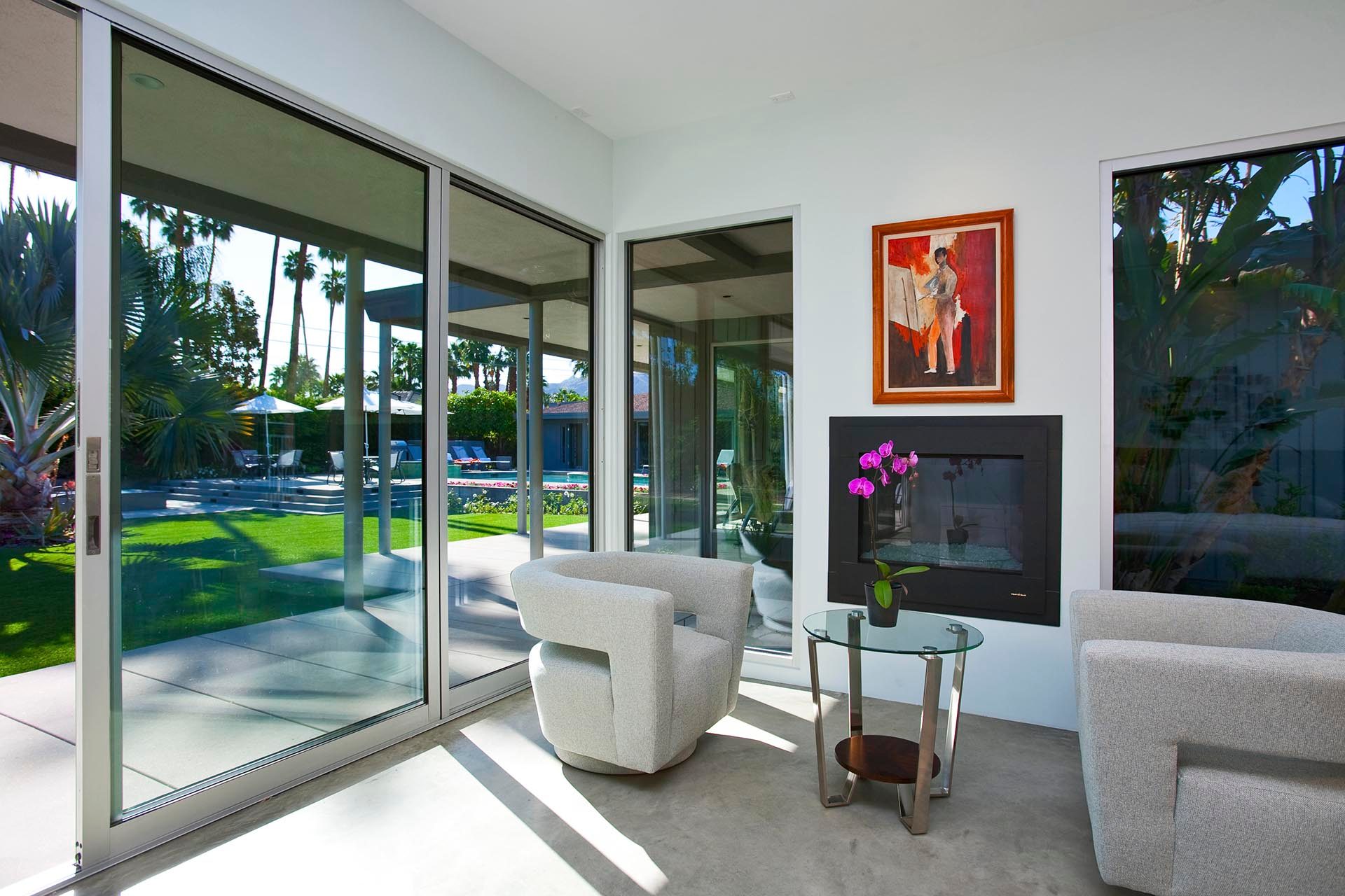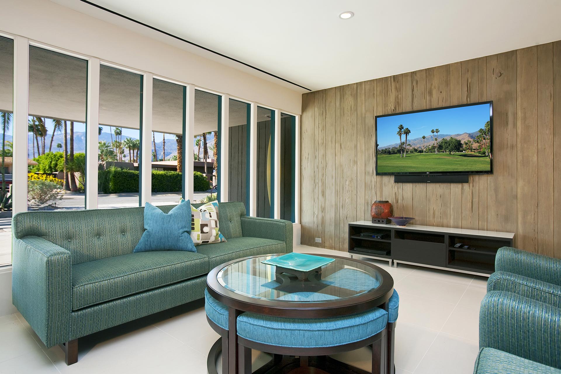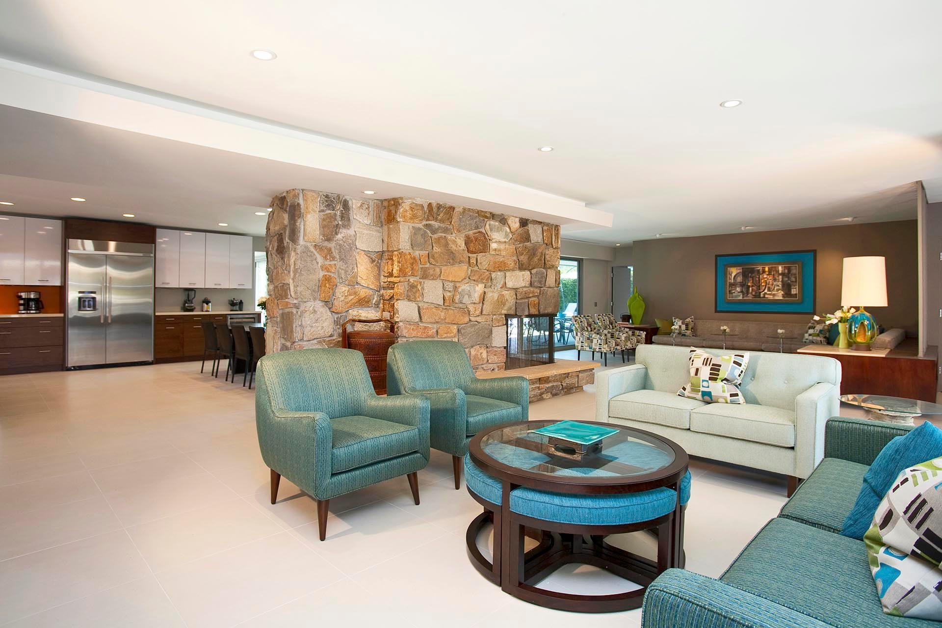 Indoors is an open concept floorplan with walls of glass, spacious interiors and fine furnishing throughout. The main great room still has the massive original stone fireplace as the centerpiece. This extraordinary space also includes many of the original mid-century architectural features and built in furnishings. The second entertainment area provides comfortable stylish seating and a 60" HDTV and Blu Ray/DVD player.