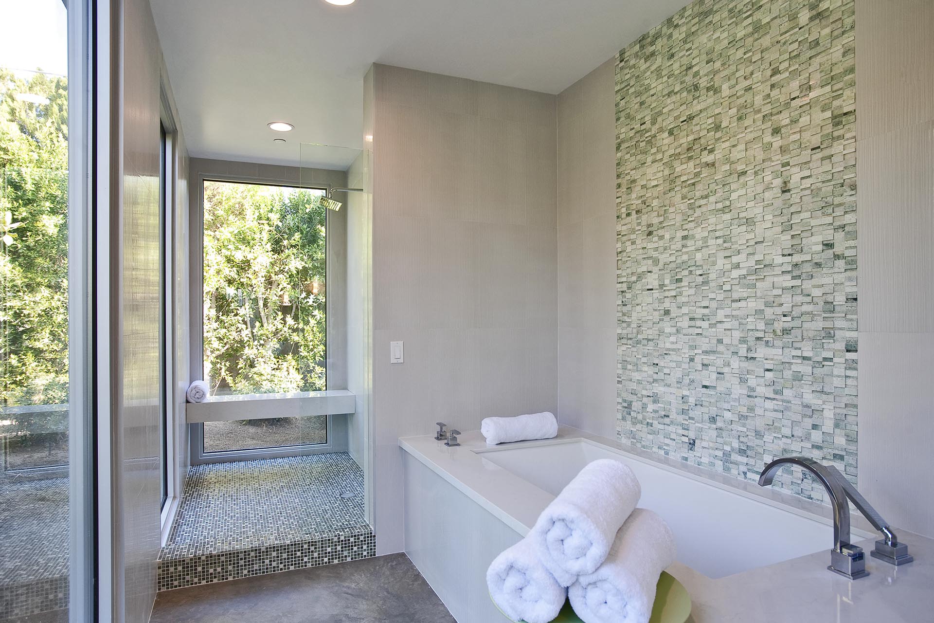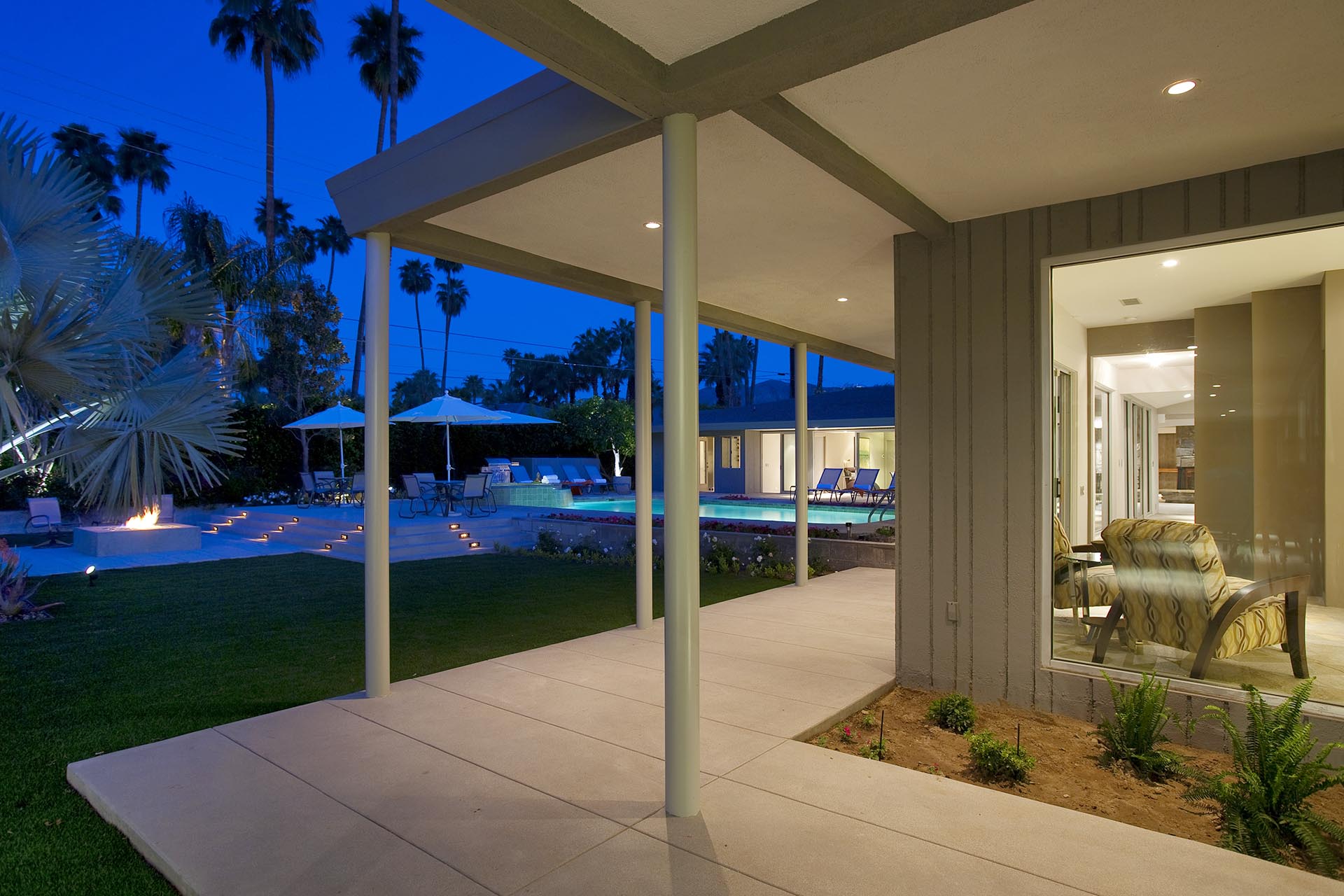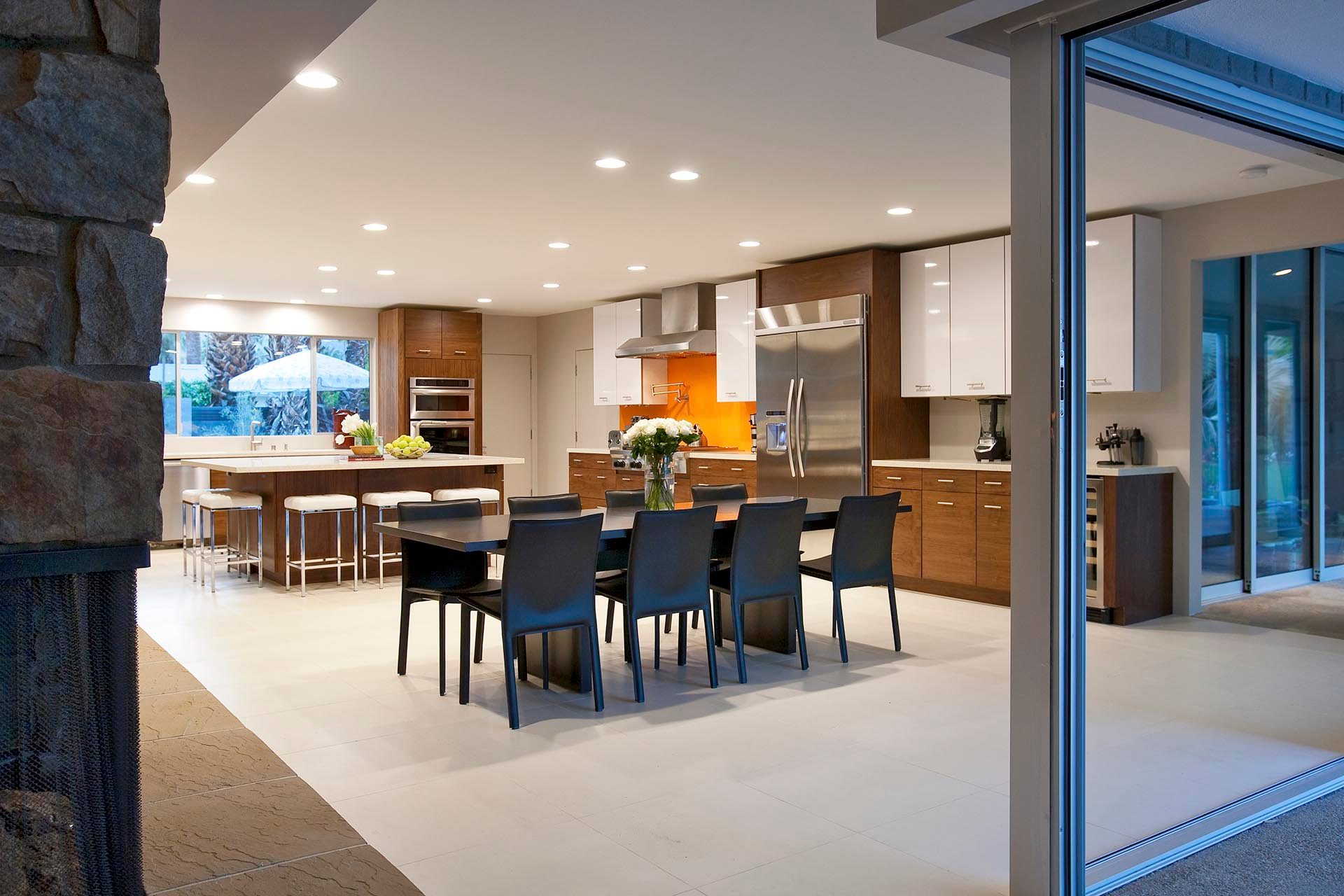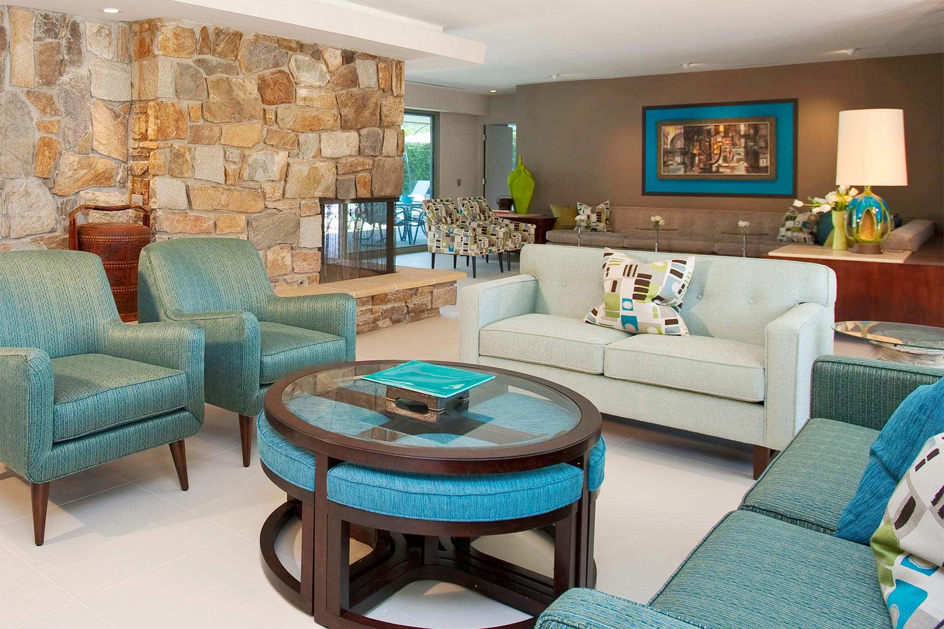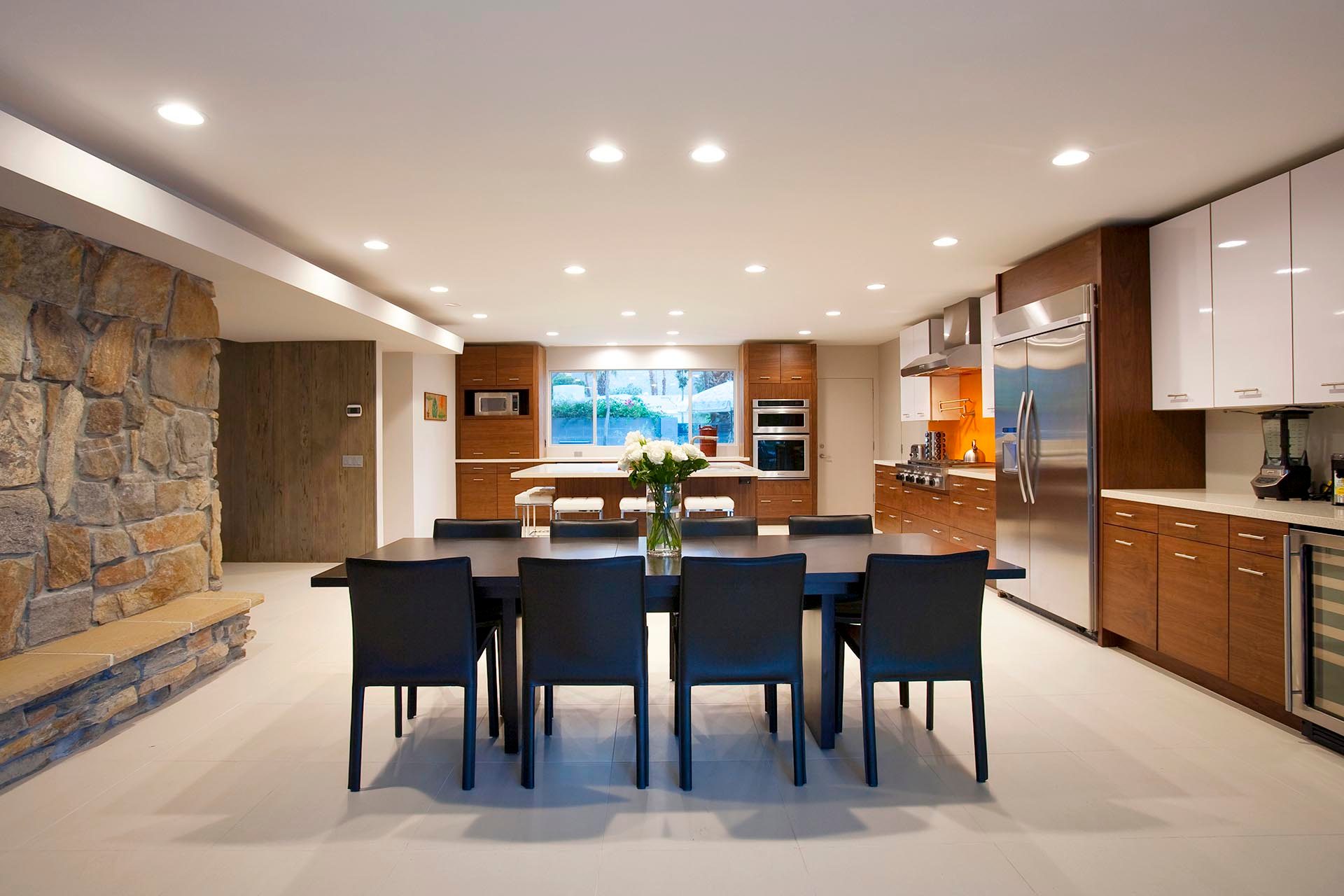 Indoors is an open concept floorplan with walls of glass, spacious interiors and fine furnishing throughout. The main great room still has the massive original stone fireplace as the centerpiece. This extraordinary space also includes many of the original mid-century architectural features and built in furnishings. The second entertainment area provides comfortable stylish seating and a 60" HDTV and Blu Ray/DVD player.