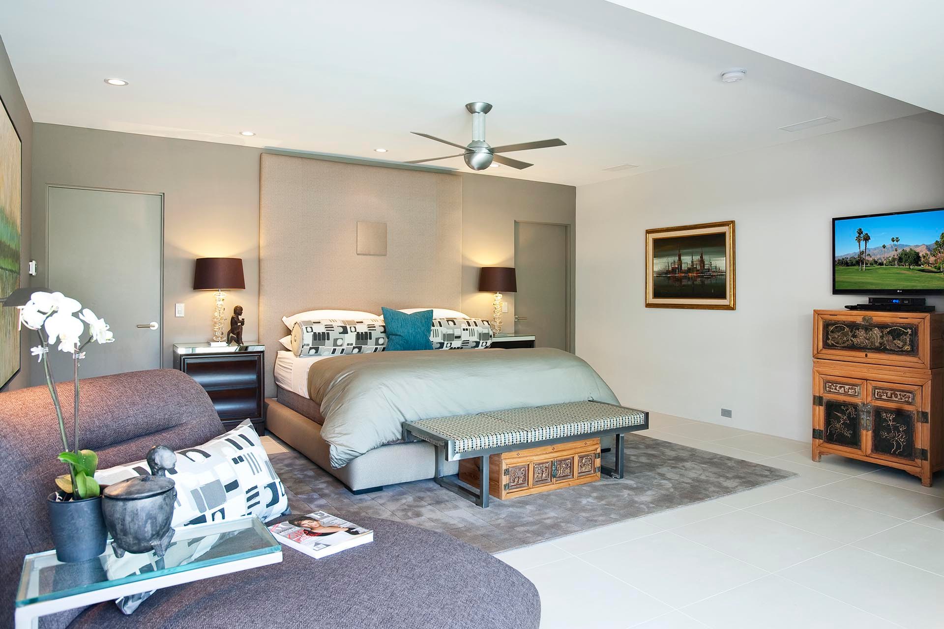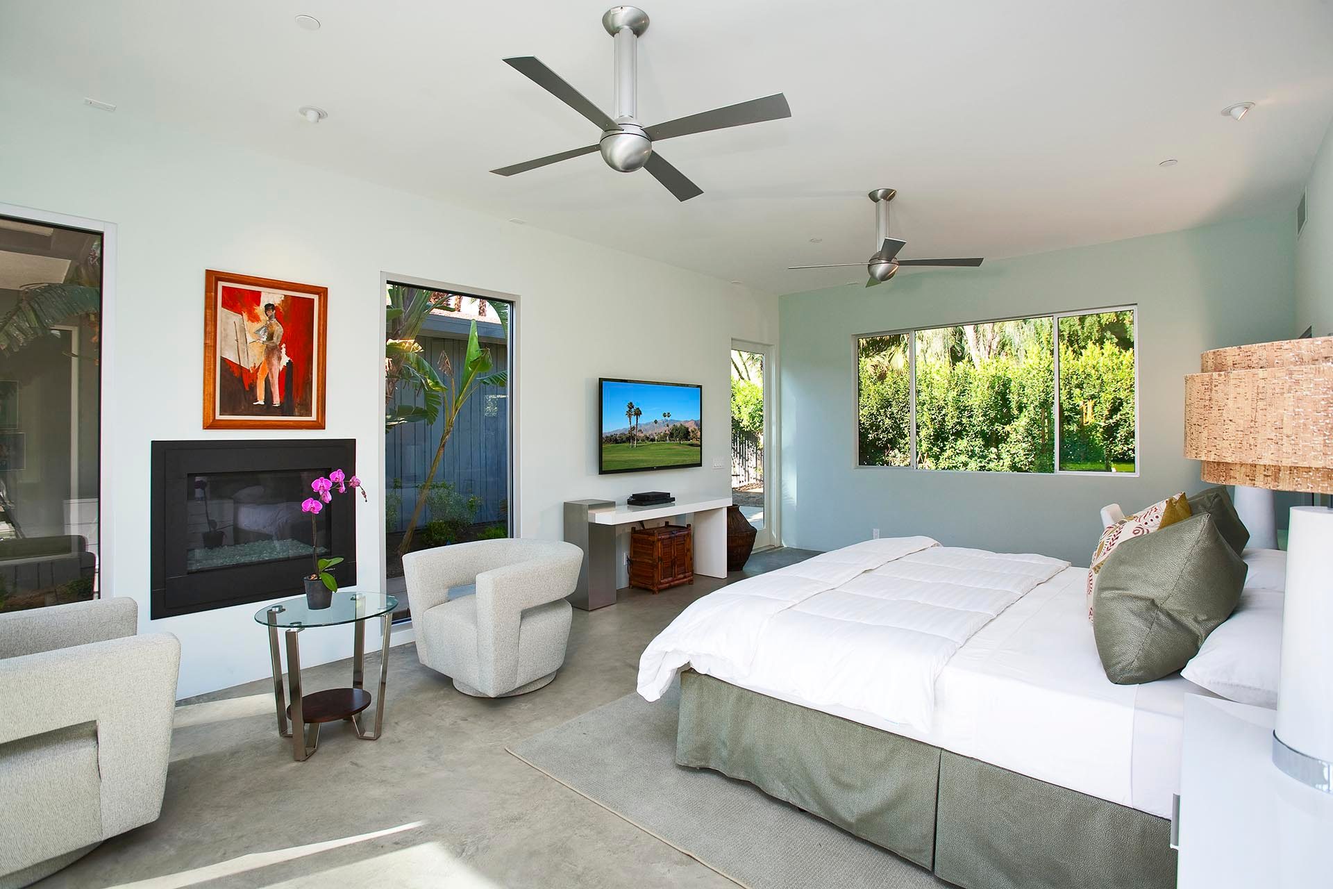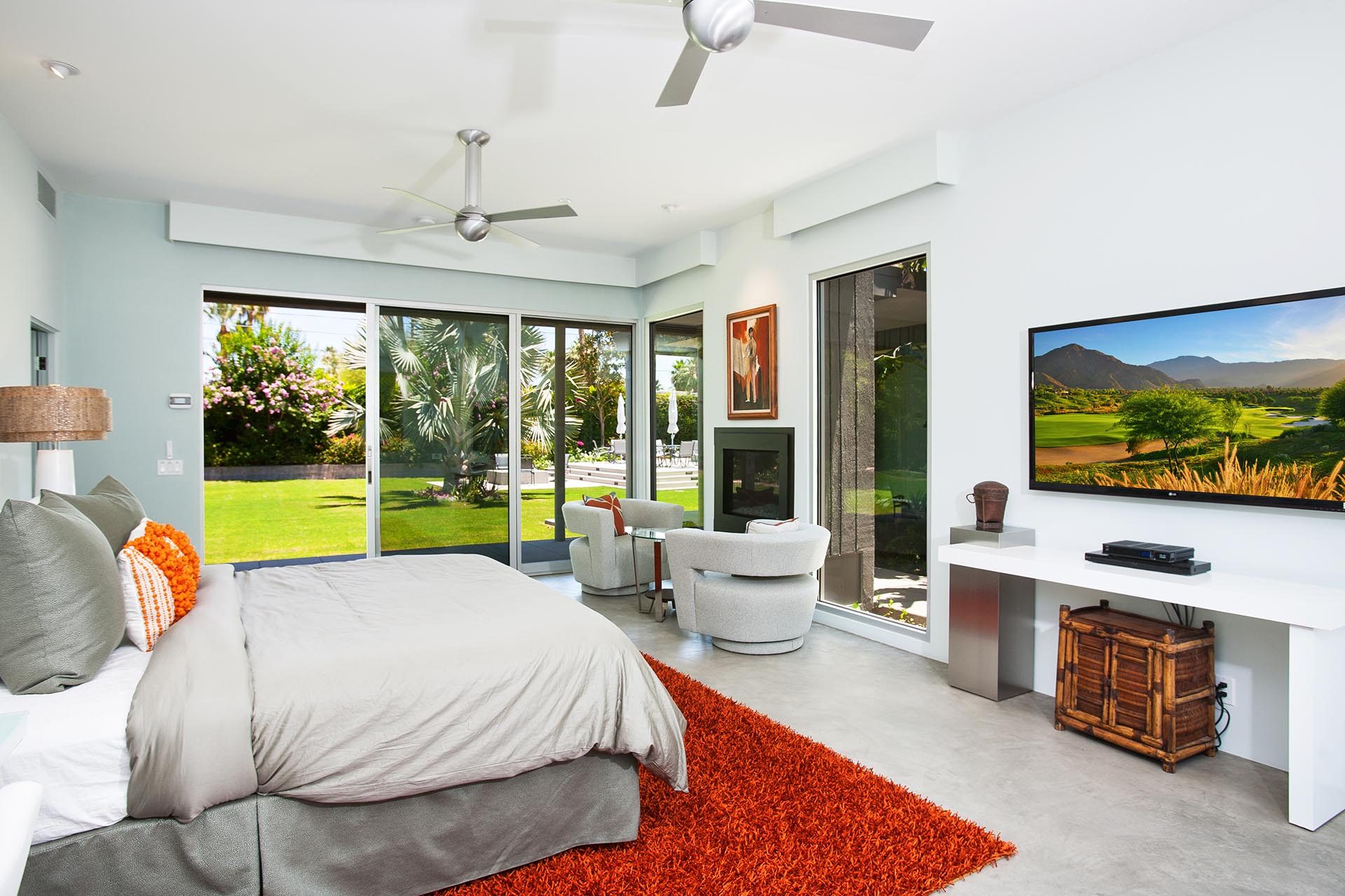 Blue Palm Guest House - Master 4 is located in the southwest corner of the Guest house. Featuring a Cal King Bed with 60" LED TV with Blu Ray/DVD Player. This is a grand guest room with a fireplace and views to the Blue Palm, poolside gardens and the mountains. There is a large private sitting area to enjoy as well. This luxurious guest suite has a spacious en suite luxury bath with walk in shower, separate bath (soaking tub) double sinks, walk-in closet and gorgeous mountain and garden views.