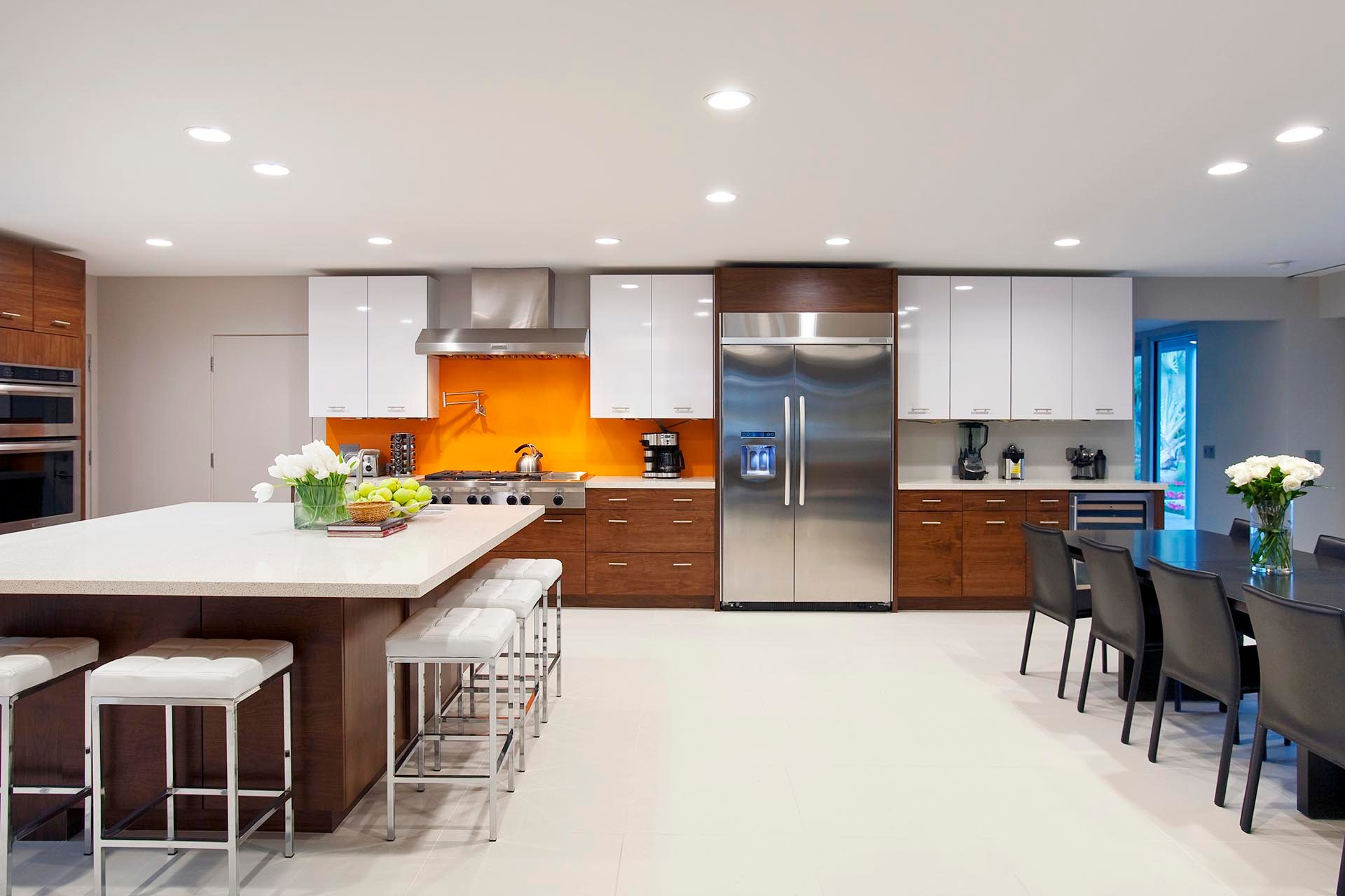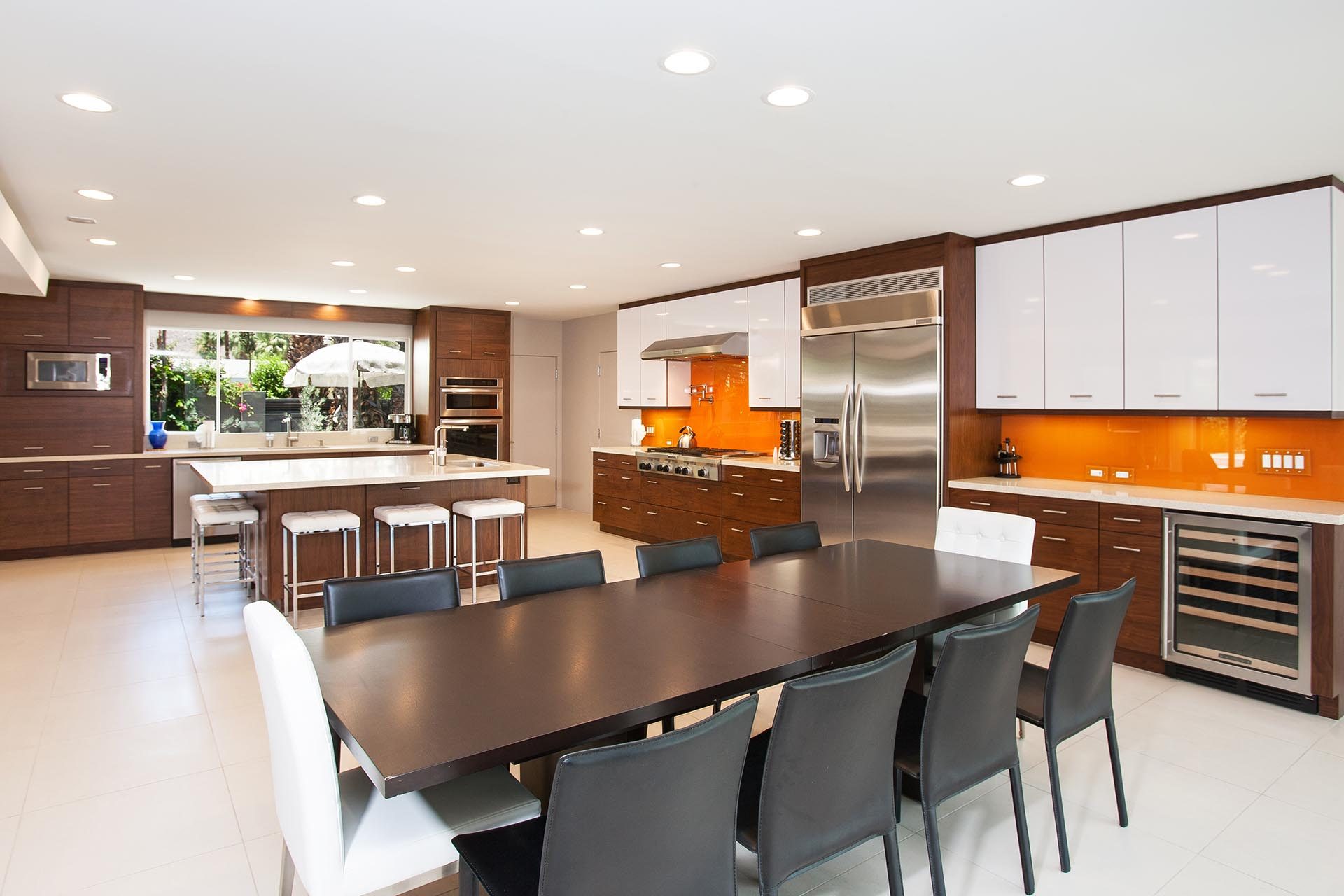 The contemporary kitchen features a large island, great counter space, top of the line appliances, including 48" refrigerator, 2 dishwashers, wine cooler, 6 burner stove with griddle, one convection microwave, one standard microwave and a stove top pot filler. The kitchen is fully equipped with almost every imaginable cooking utensil and appliance. If cooking is part of your vacation plans, you will not be disappointed! Seating for 8-10 at the dining table, and seating for 5 at the large kitchen island.