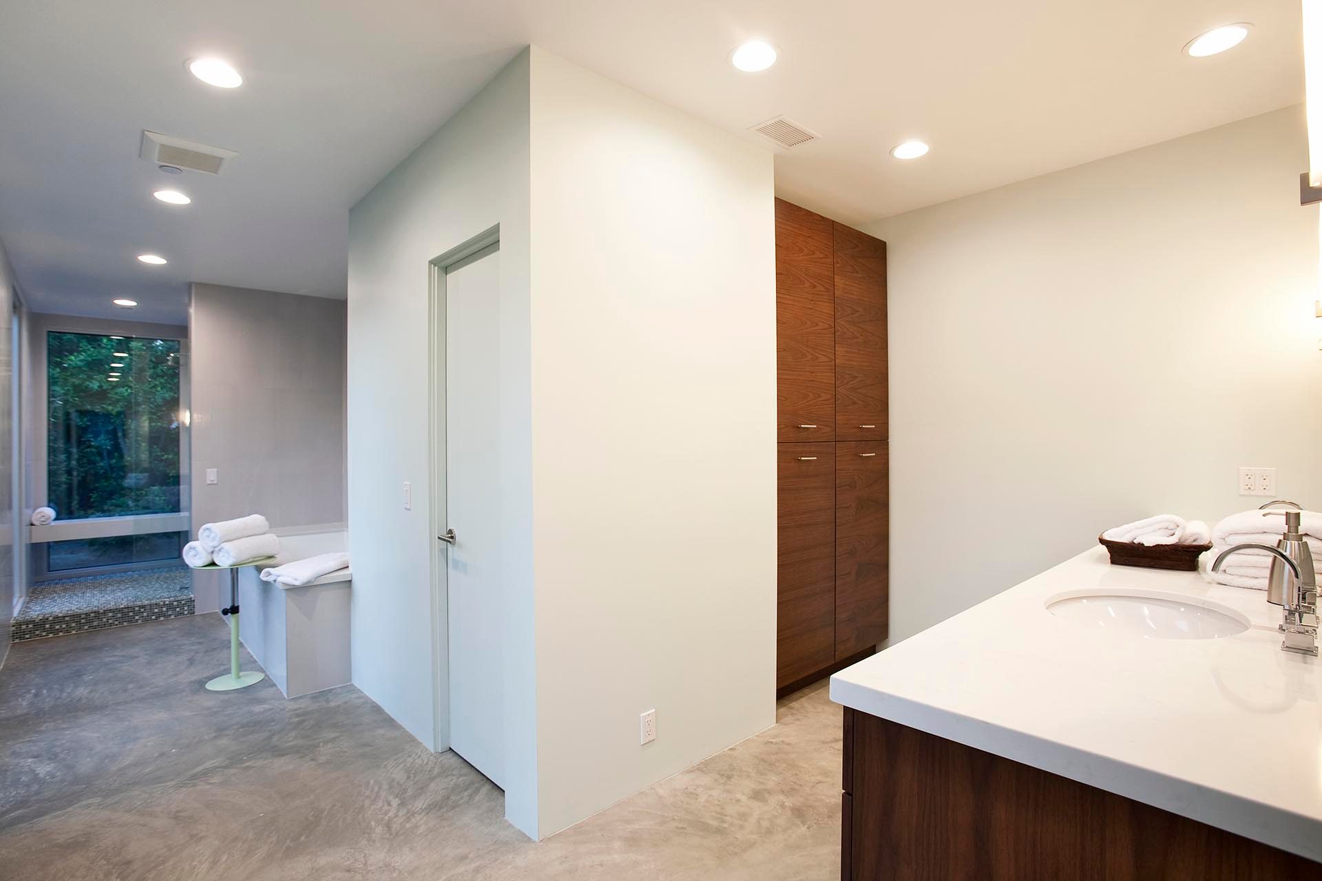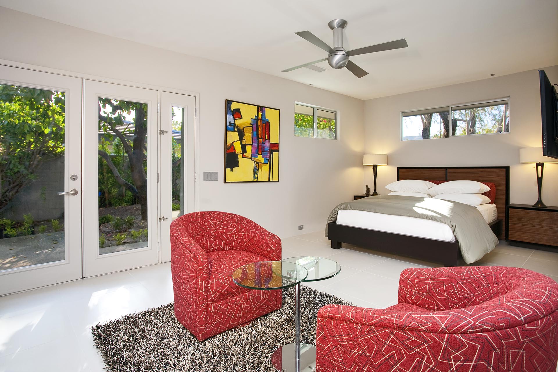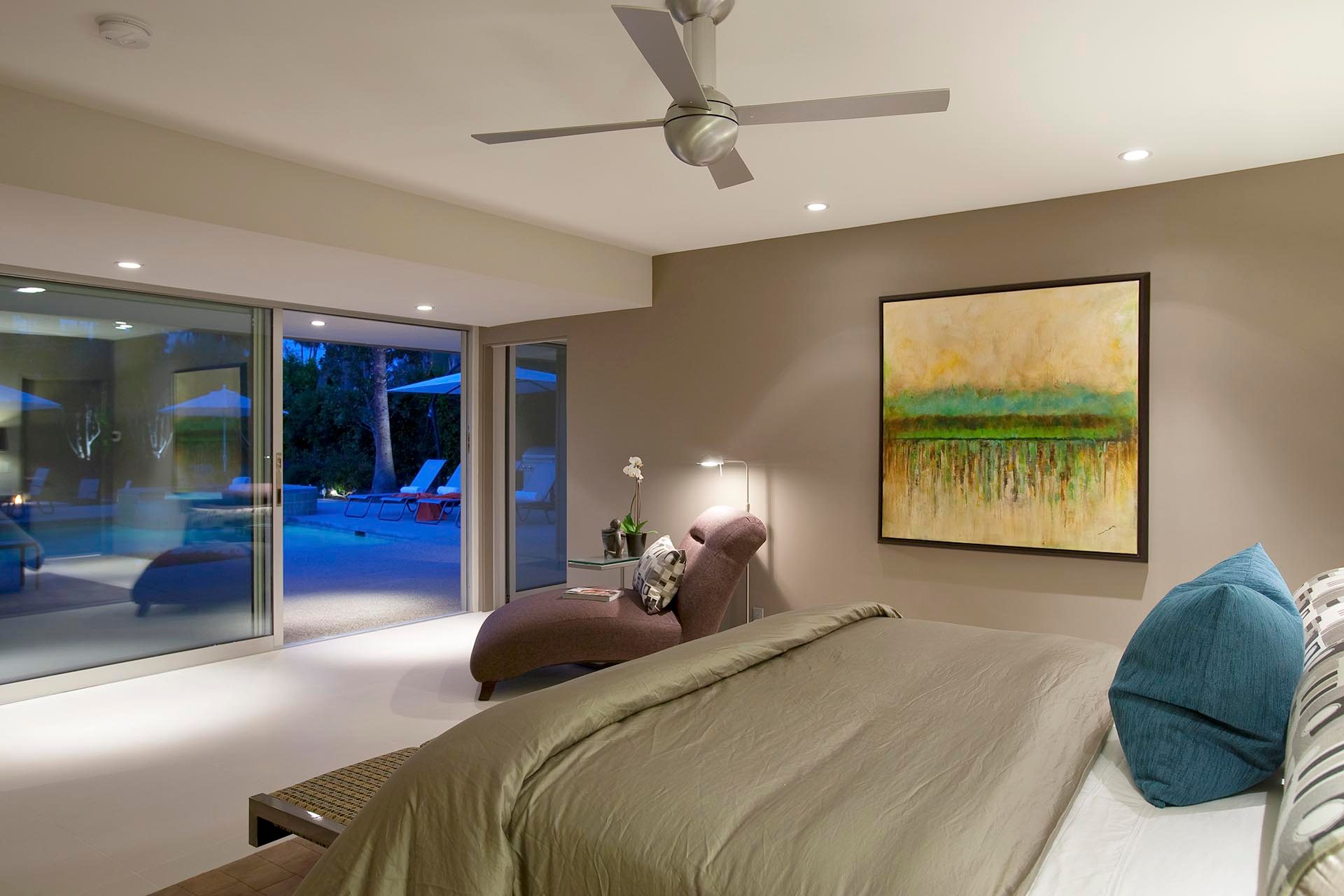Bedroom 2 - The Guest house is modern, spacious, private and built with spacious comfort in mind. This middle bedroom features a queen bed, Jack and Jill ensuite bath that is shared with the bedroom next door. It has direct access to the large yard and pool deck through the oversized sliding glass doors.