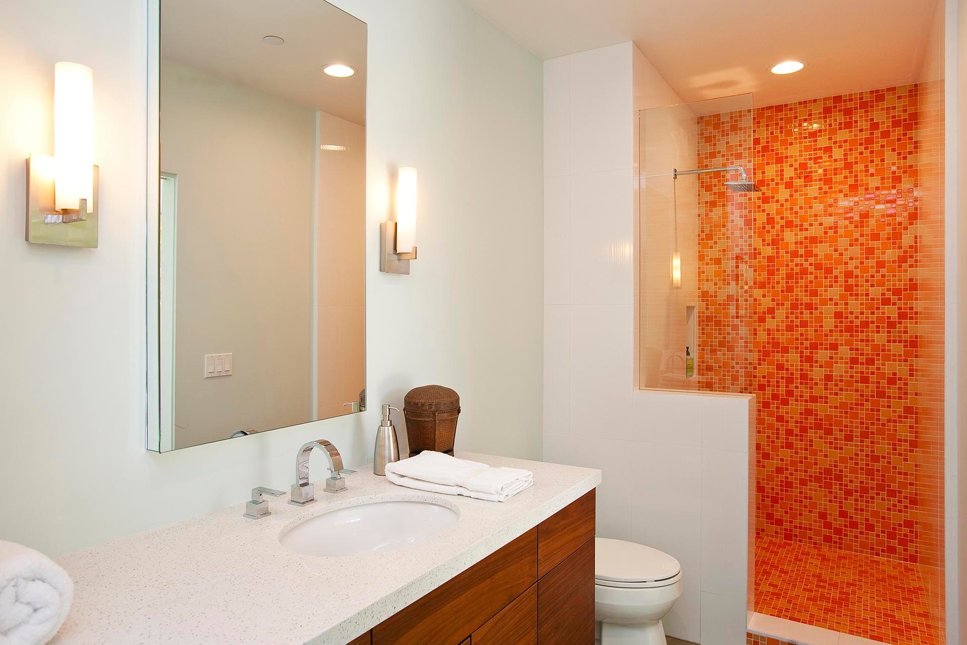 Bedroom 3 located on the northwest corner of the Guest house. It features a King ben (Can be split into two Twin beds) with 32" TV. The Jack and Jill ensuite bath is shared by the bedroom next door and has a bright and colorful walk in shower.
