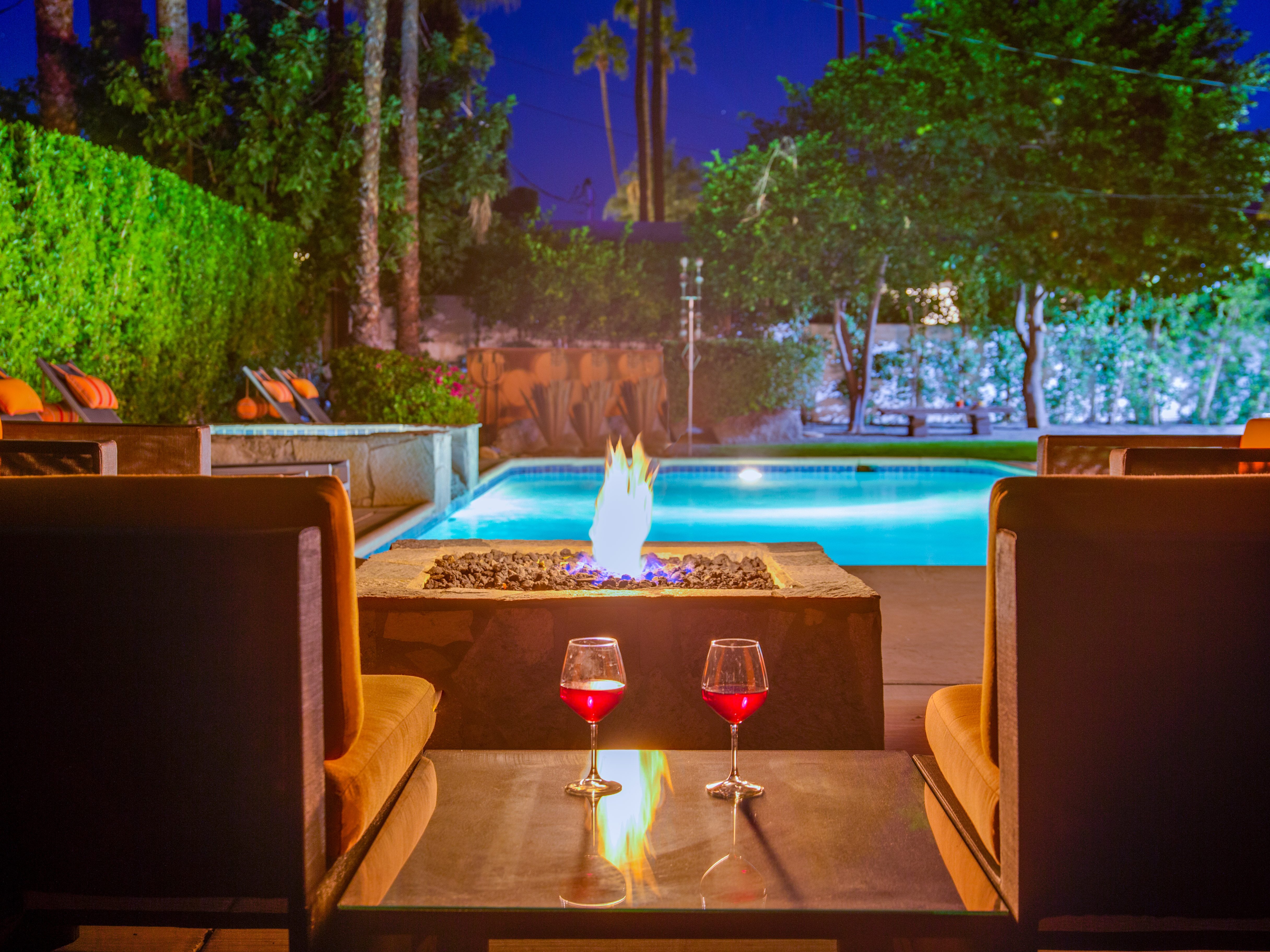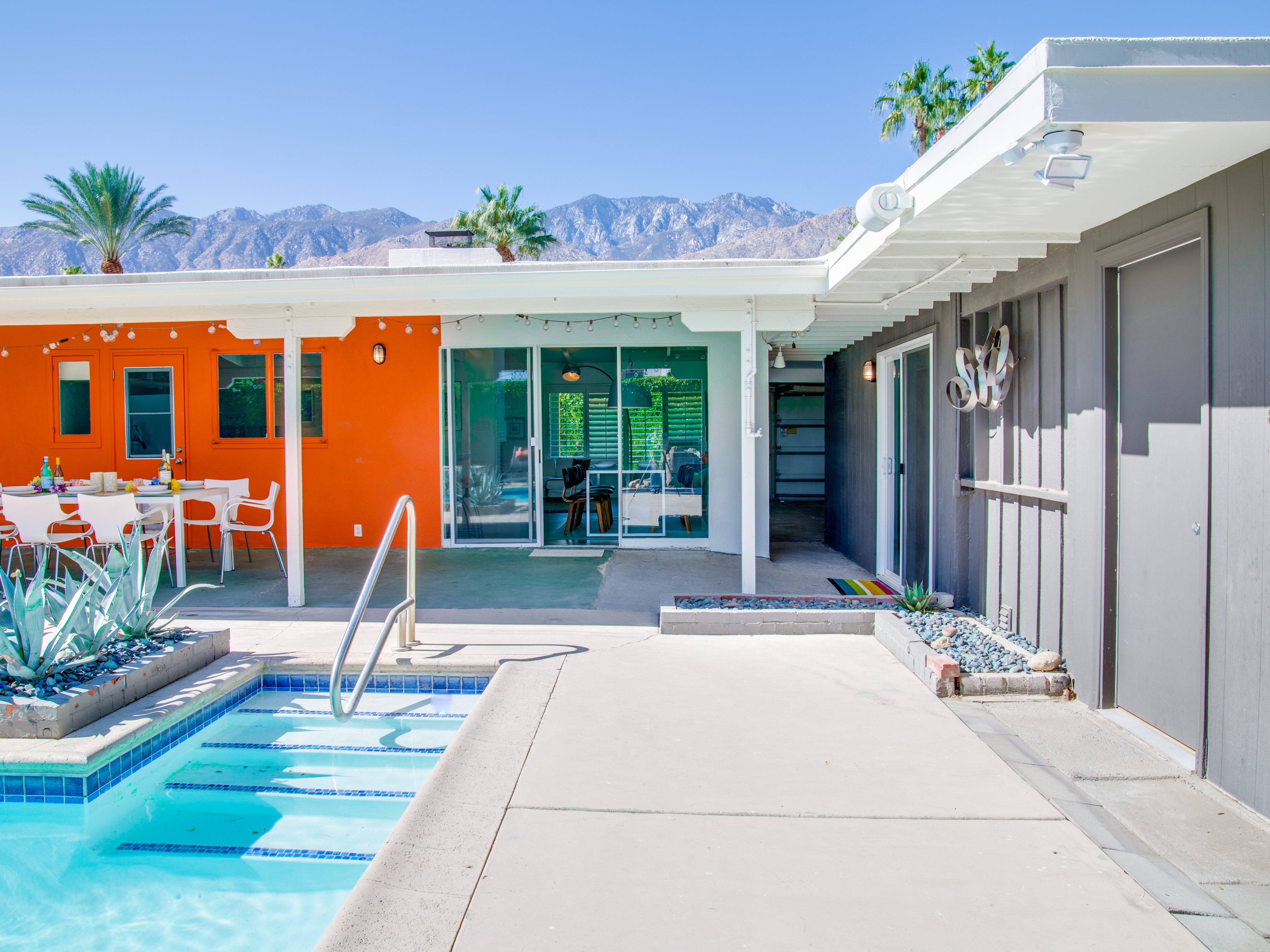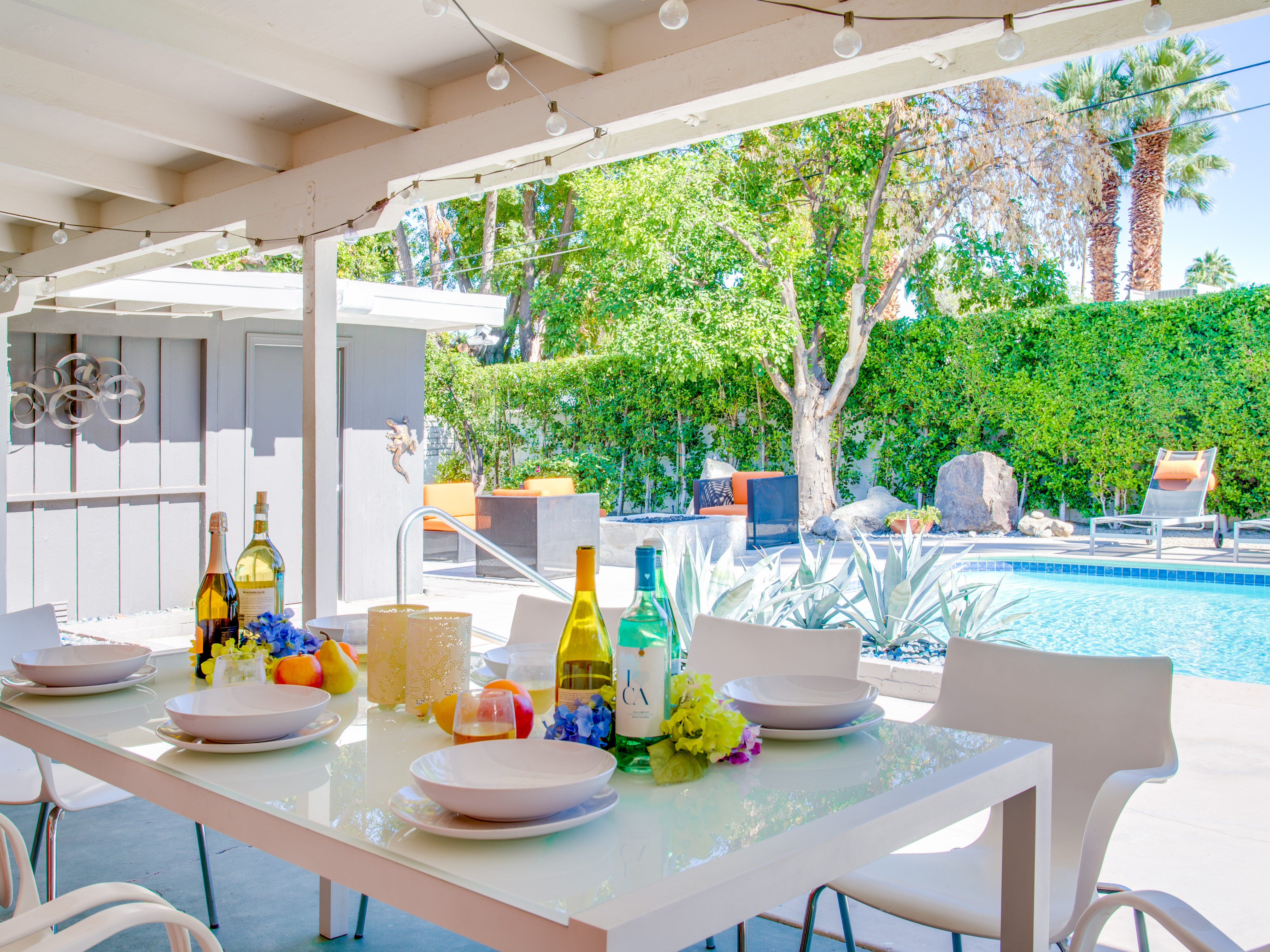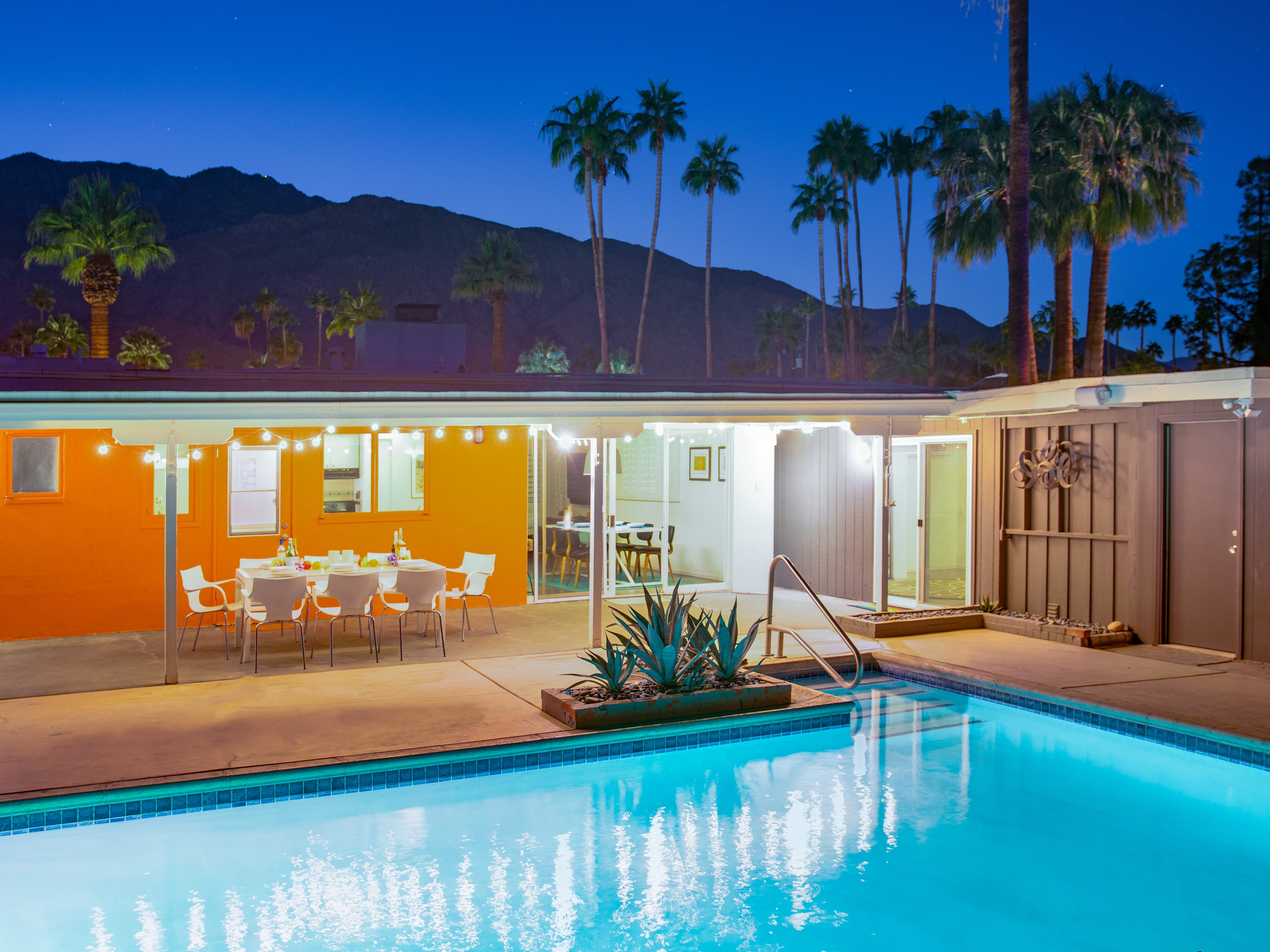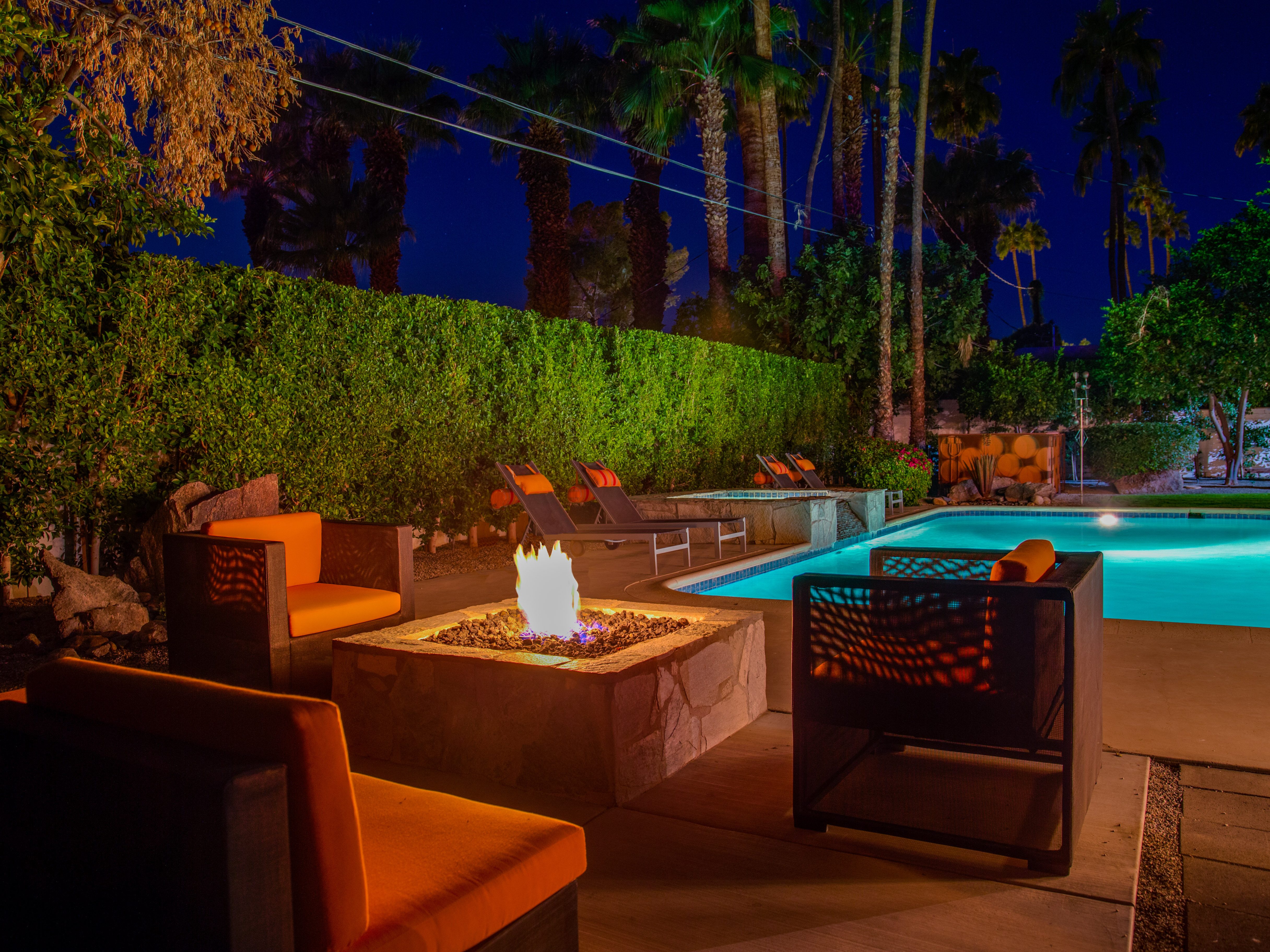 Very private mini-estate just a 2 minute walk to the world famous Palm Canyon Drive. Completely walled and gated for privacy. Spacious open concept floor plan. Three master suites, with one being a separate casita, plus den for occasional guests. Sleeps 6. P.S. City ID #2955 Primary renter must be at least 25 years of age. No Pets Allowed Very private mini-estate just a 2 minute walk to the world famous Palm Canyon Drive. Completely walled and gated for privacy. Spacious open concept floor plan. Three master suites plus den for occasional overflow guests. Sleeps 6. Resort-style yard with heated inground saltwater pool, integrated waterfall spa, firepit lounge, covered outdoor dining pavilion. Ping pong. Fabulous mountain views.The Property Owners have created the perfect Palm Springs vacation home rental where it’s all about relaxing in the sunshine. Beds: K,K,Q other Welcome to Citrus Twist, where iconic mid-century architecture meets a private setting and gorgeous mountain views to create a fabulous vacation paradise. This classic mid mod home (circa 1956) has been lovingly restored - respecting its architectural pedigree while updating it for the way we live today. 4 flat screen televisions, hi speed internet access, updated baths, gas fireplace, a misting system, and all the other modern conveniences are paired with period-inspired art and furnishings to create the quintessential Palm Springs experience. THE INTERIOR LIVING SPACES This home is bright, comfortable, impeccably clean and well-maintained. It is gorgeous in its simplicity - with an understated, unpretentious elegance throughout. You’ll find clean lines, high ceilings, an open concept floor plan and spectacular walls of glass that let the light pour in - revealing the very private pool yard. The living room, den, dining area and kitchen are all open to each other - providing enough space for your entire group to gather, relax and enjoy. SLEEPING QUARTERS Citrus Twist offers two King-sized master suites and one Queen size suite. Two in the main house and one in the separate casita. All of the bedrooms feature a comfortable hotel-quality mattress, a private bath, a flat screen television and ample storage. Each suite is furnished like a boutique hotel - warm, welcoming and comfortable. You are going to love it here. THE OUTDOOR LIVING SPACES Located on a quiet residential street in the historic Deepwell Neighborhood, this property captures the magic of Southern California glamour in true Palm Springs-style. The convenient city location is softened by privacy walls, mature plantings, towering palms and gorgeous landscaping that is drought-conscious and lush at the same time. The entire property has been walled and gated for privacy and is surrounded by a 10 foot tall mature ficus hedge. The backyard itself is a slice of heaven. So private, spacious and well-planned. The awesome mountain views through the swaying palm trees is pure magic. The heated inground saltwater pool with integrated waterfall spa is surrounded by the fire pit lounge and the covered dining pavilion. You’ll find a gas barbecue, plenty of poolside chaise lounges, and a rolling green lawn that is great for kids, pets and lawn games. OPTIONAL CONCIERGE SERVICES Private chef, pre-arrival grocery stocking, daily and mid-stay maid service, and poolside massage can be arranged with three weeks advance notice. Advance reservations strongly advised. ...Amenities
