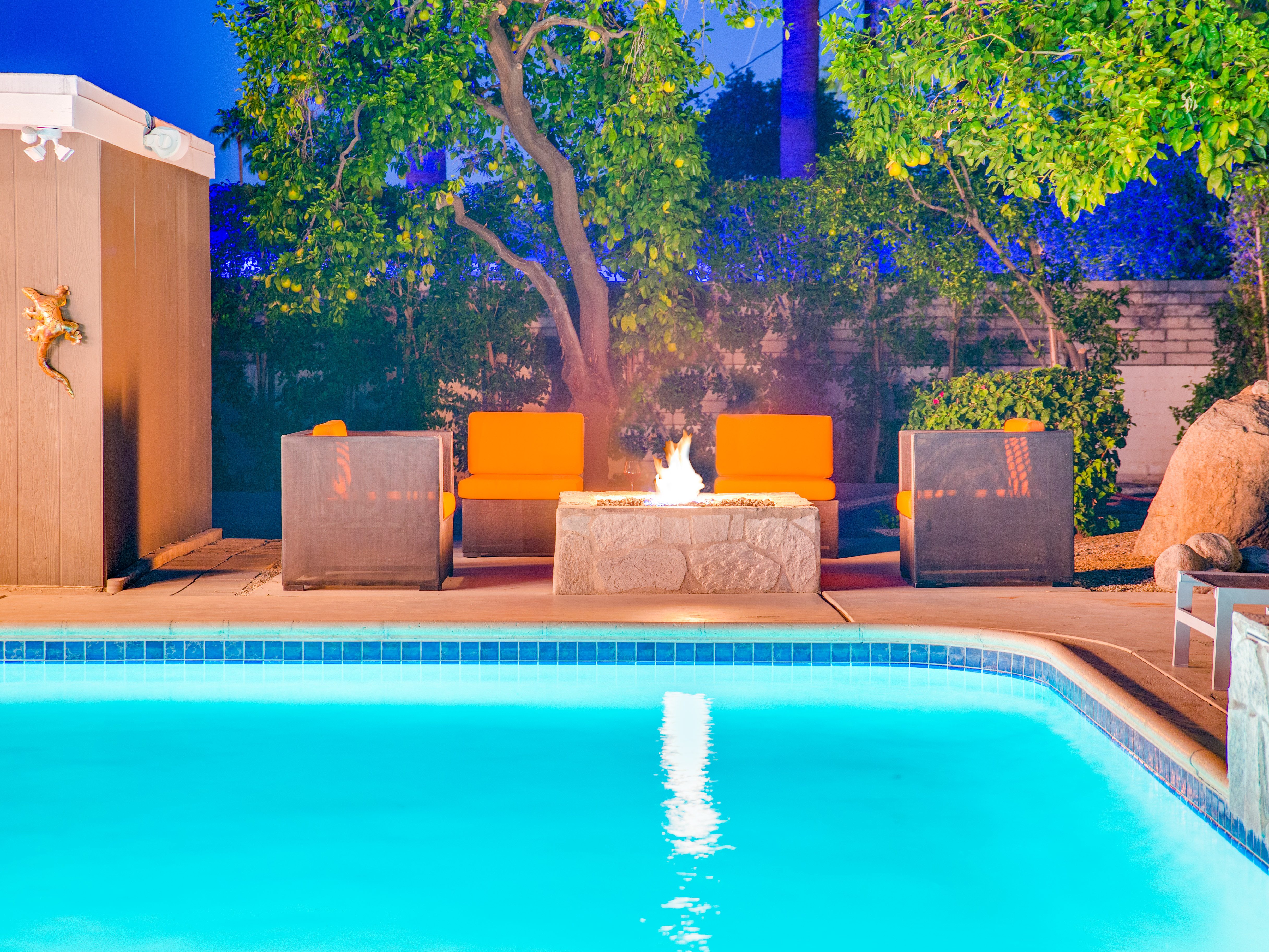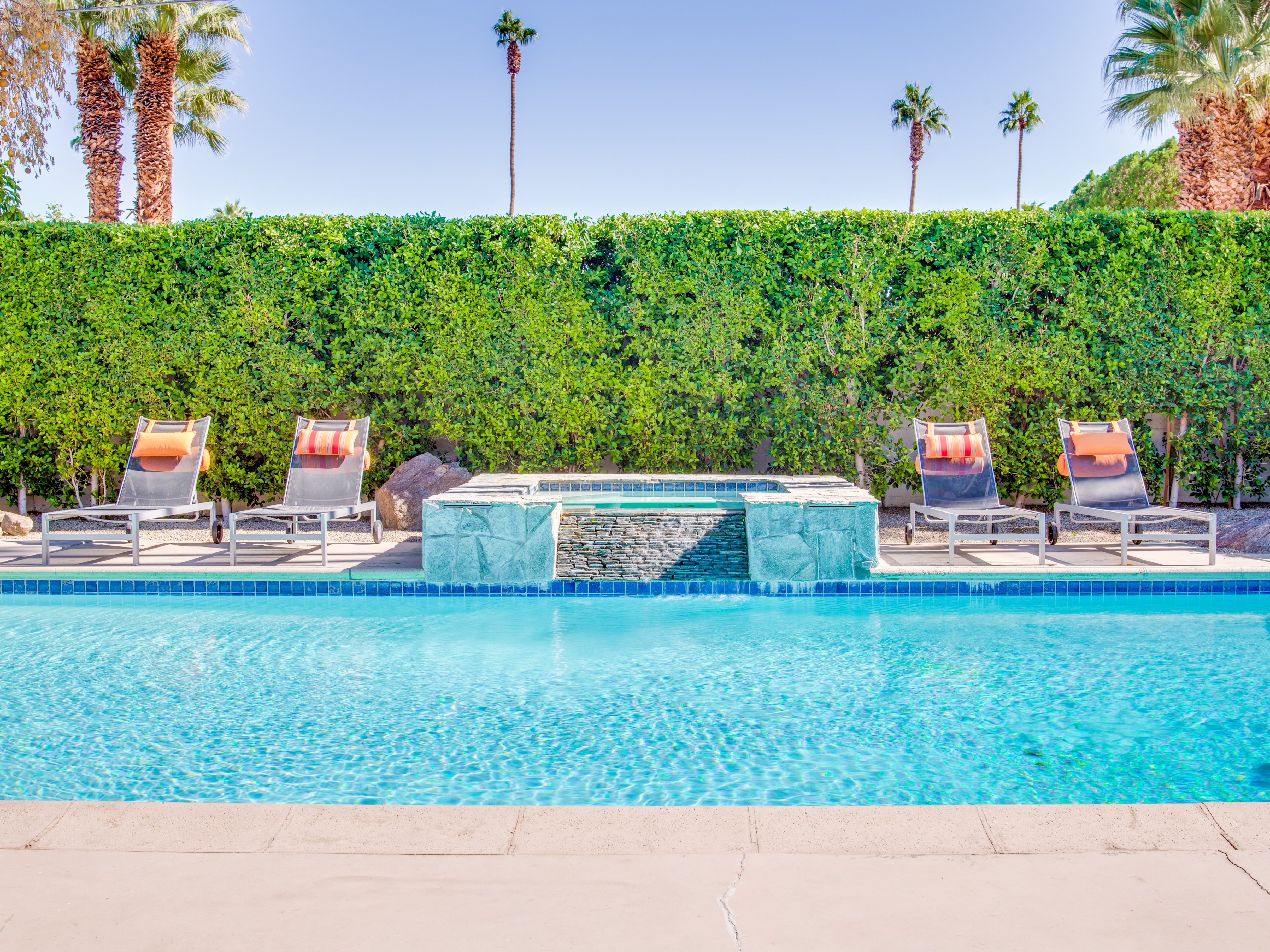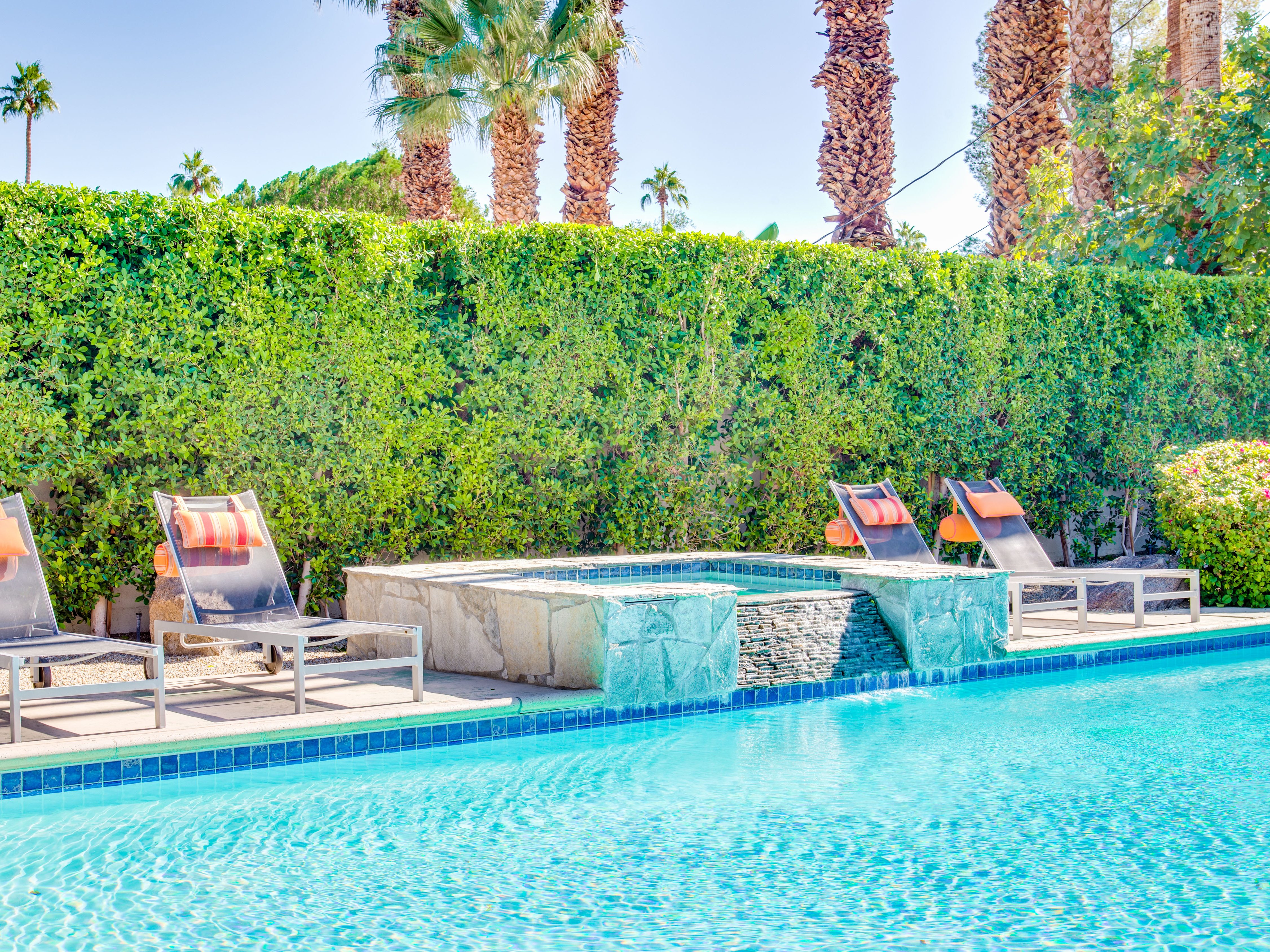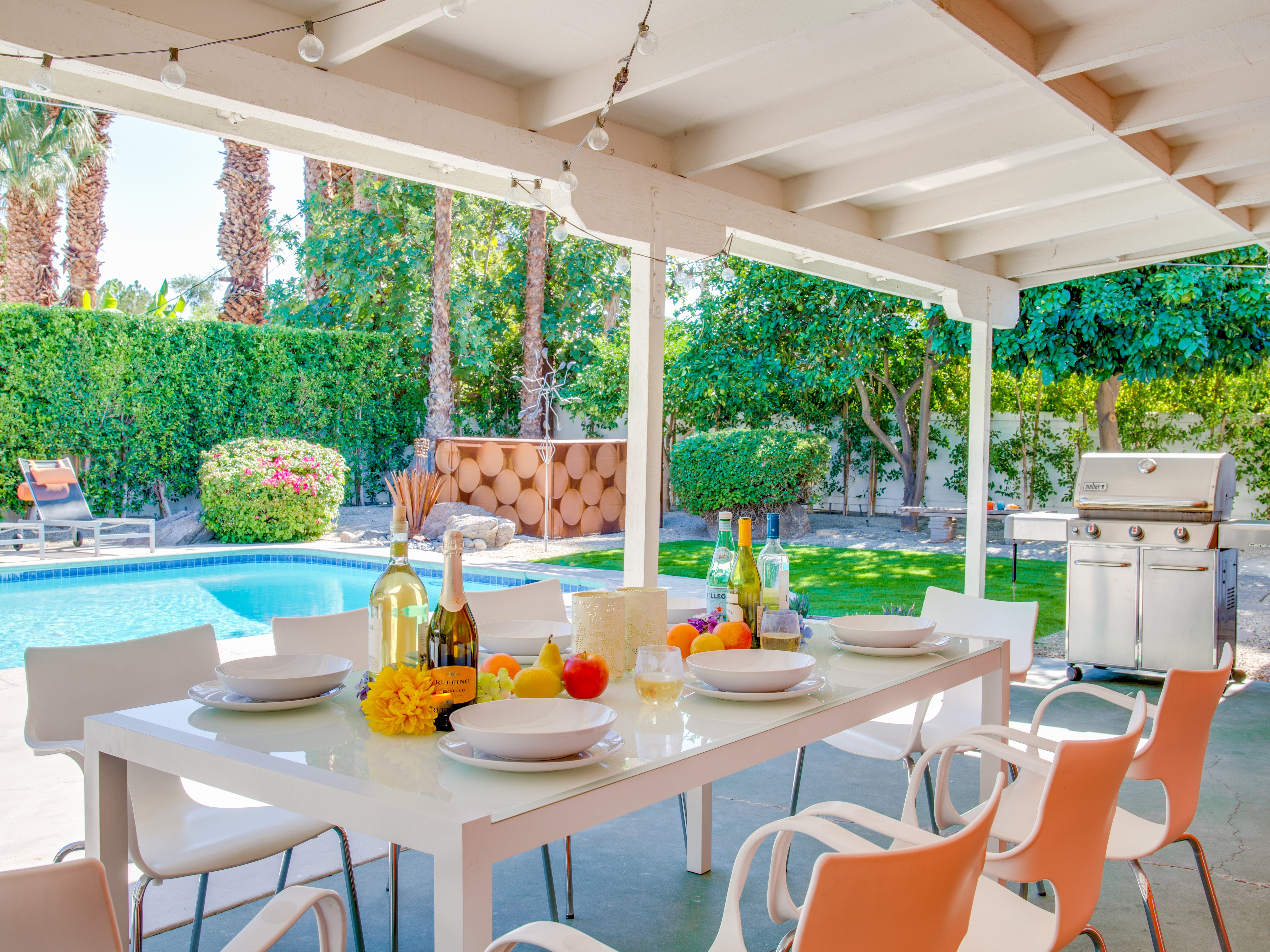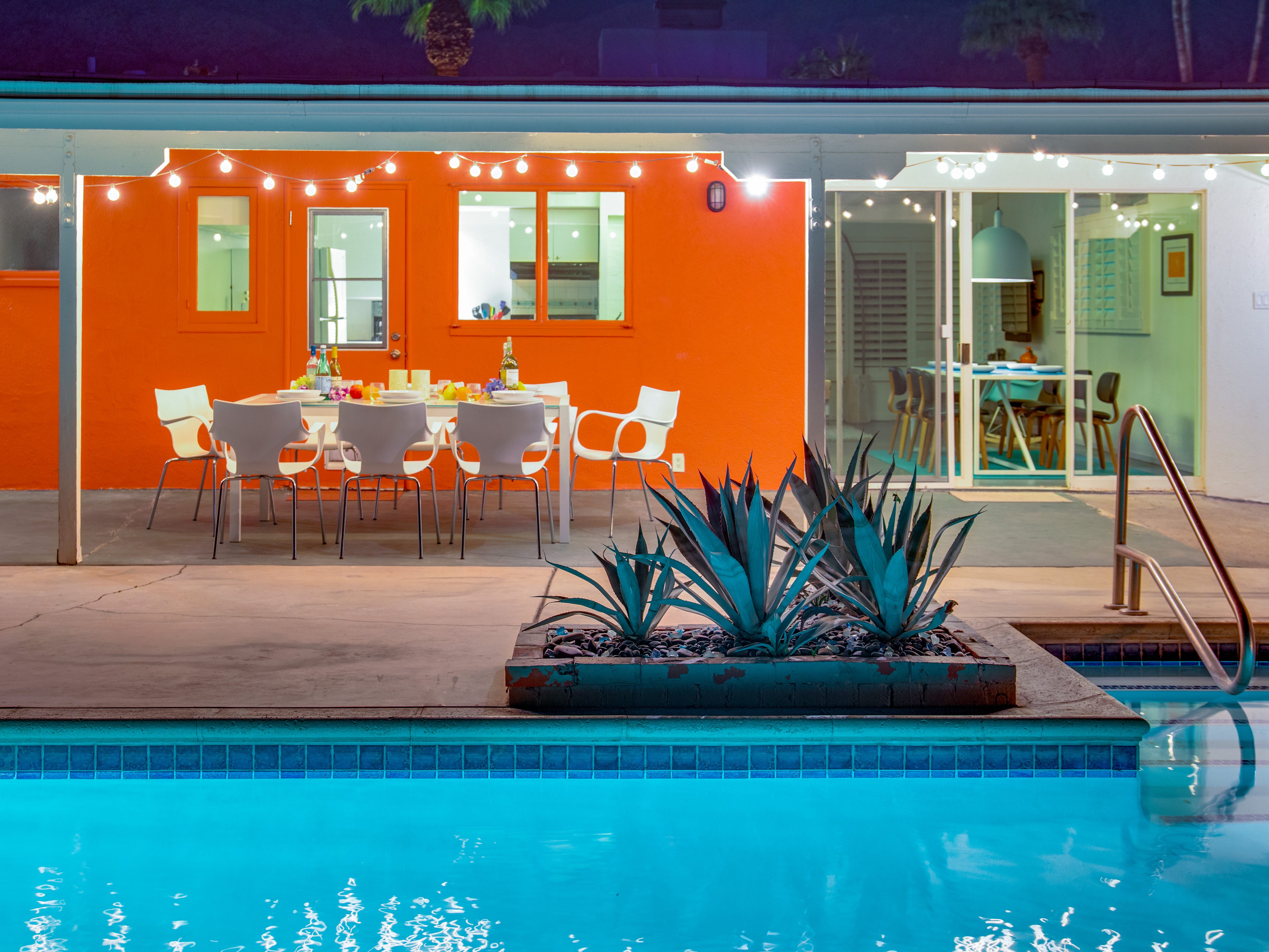 Very private mini-estate just a 2 minute walk to the world famous Palm Canyon Drive. Completely walled and gated for privacy. Spacious open concept floor plan. Three master suites, with one being a separate casita, plus den for occasional guests. Sleeps 6. P.S. City ID #2955 Primary renter must be at least 25 years of age. No Pets Allowed Very private mini-estate just a 2 minute walk to the world famous Palm Canyon Drive. Completely walled and gated for privacy. Spacious open concept floor plan. Three master suites plus den for occasional overflow guests. Sleeps 6. Resort-style yard with heated inground saltwater pool, integrated waterfall spa, firepit lounge, covered outdoor dining pavilion. Ping pong. Fabulous mountain views.The Property Owners have created the perfect Palm Springs vacation home rental where it’s all about relaxing in the sunshine. Beds: K,K,Q other Welcome to Citrus Twist, where iconic mid-century architecture meets a private setting and gorgeous mountain views to create a fabulous vacation paradise. This classic mid mod home (circa 1956) has been lovingly restored - respecting its architectural pedigree while updating it for the way we live today. 4 flat screen televisions, hi speed internet access, updated baths, gas fireplace, a misting system, and all the other modern conveniences are paired with period-inspired art and furnishings to create the quintessential Palm Springs experience. THE INTERIOR LIVING SPACES This home is bright, comfortable, impeccably clean and well-maintained. It is gorgeous in its simplicity - with an understated, unpretentious elegance throughout. You’ll find clean lines, high ceilings, an open concept floor plan and spectacular walls of glass that let the light pour in - revealing the very private pool yard. The living room, den, dining area and kitchen are all open to each other - providing enough space for your entire group to gather, relax and enjoy. SLEEPING QUARTERS Citrus Twist offers two King-sized master suites and one Queen size suite. Two in the main house and one in the separate casita. All of the bedrooms feature a comfortable hotel-quality mattress, a private bath, a flat screen television and ample storage. Each suite is furnished like a boutique hotel - warm, welcoming and comfortable. You are going to love it here. THE OUTDOOR LIVING SPACES Located on a quiet residential street in the historic Deepwell Neighborhood, this property captures the magic of Southern California glamour in true Palm Springs-style. The convenient city location is softened by privacy walls, mature plantings, towering palms and gorgeous landscaping that is drought-conscious and lush at the same time. The entire property has been walled and gated for privacy and is surrounded by a 10 foot tall mature ficus hedge. The backyard itself is a slice of heaven. So private, spacious and well-planned. The awesome mountain views through the swaying palm trees is pure magic. The heated inground saltwater pool with integrated waterfall spa is surrounded by the fire pit lounge and the covered dining pavilion. You’ll find a gas barbecue, plenty of poolside chaise lounges, and a rolling green lawn that is great for kids, pets and lawn games. OPTIONAL CONCIERGE SERVICES Private chef, pre-arrival grocery stocking, daily and mid-stay maid service, and poolside massage can be arranged with three weeks advance notice. Advance reservations strongly advised. ...Amenities