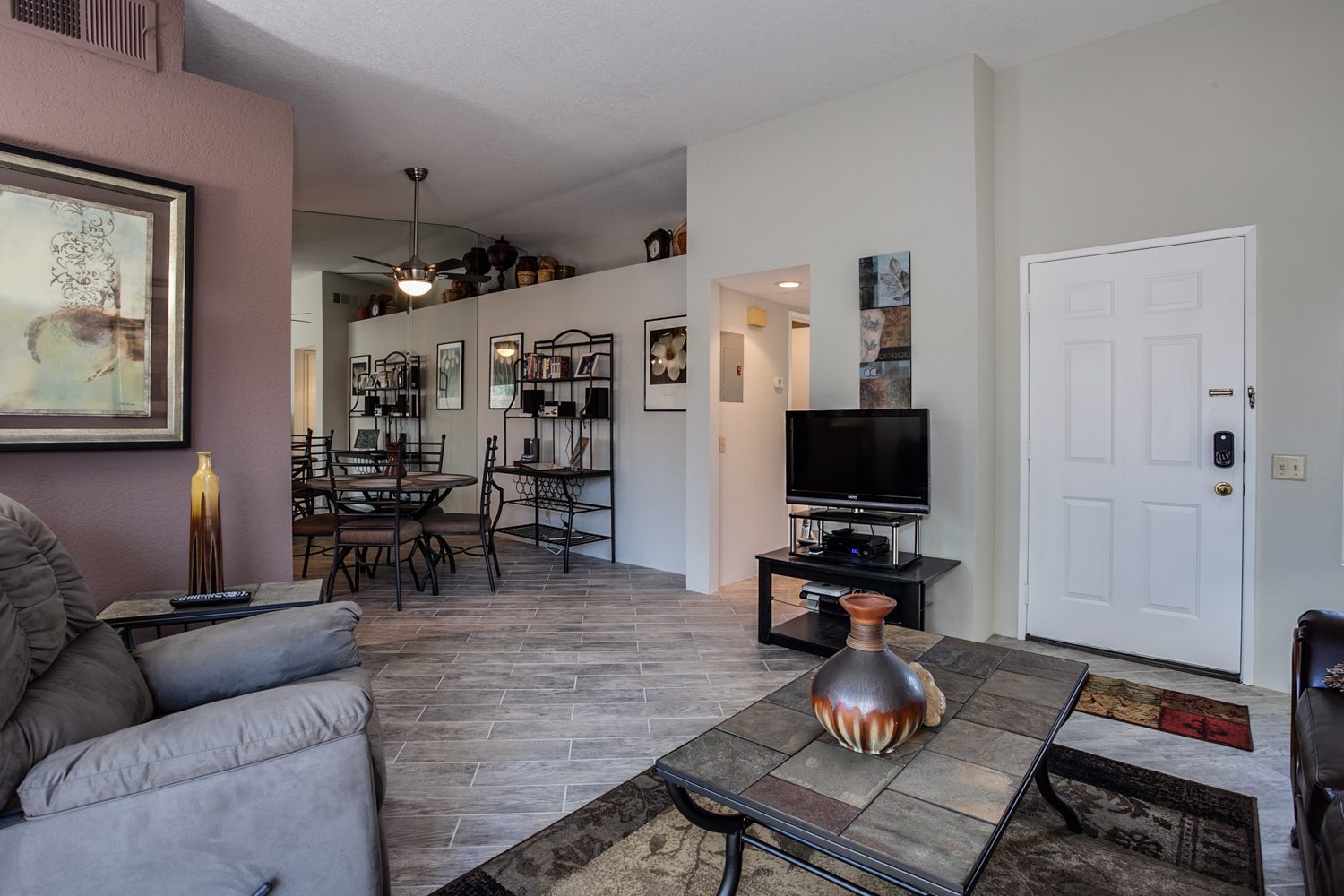 Palm Springs Golf Course Condo! Experience desert living at its best! Majestic views of Mount San Jacinto, palm trees, golf course, fountains, flowers and complete serenity, all from this spacious condo. Only minutes from all the action of downtown Palm Springs; Agua Caliente Spa & Casino, restaurants, boutiques, day spas, entertainment and night life.Located in the lush, quiet, gated grounds of Mesquite Country Club. Entire condo recently remodeled new kitchen cabinets, appliances, flooring, custom paint, bathroom with walk-in shower. This Palm Springs condo features private entrance, two private decks with panoramic views of the mountains, vaulted ceilings, comfortable furnishings. Steps from the pool and spa, in a remote and beautifully landscaped location off the golf course. Starbucks, grocery store, drug and health food stores conveniently located at the end of the block.