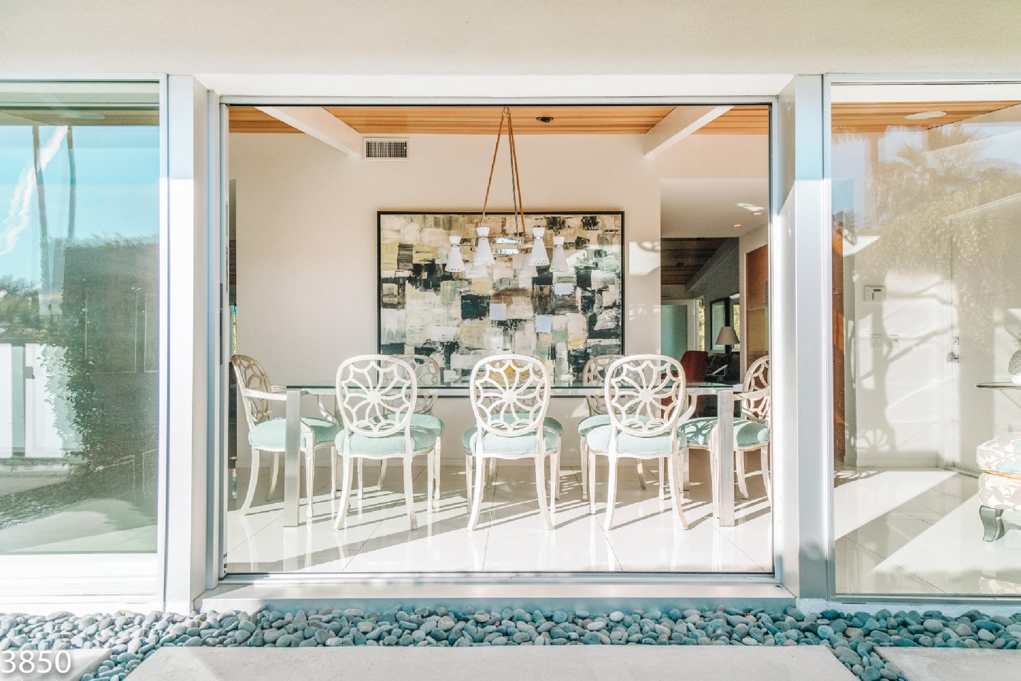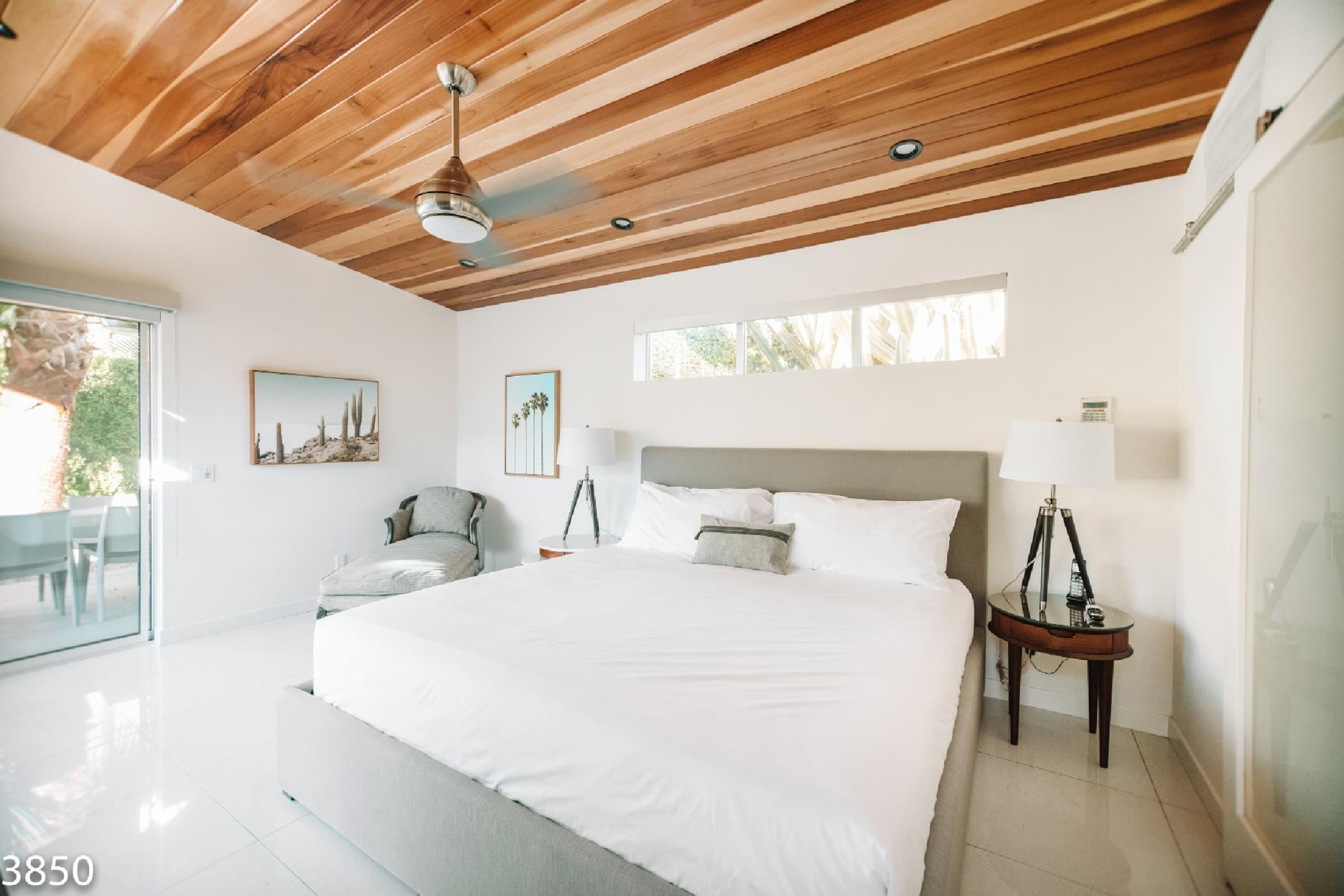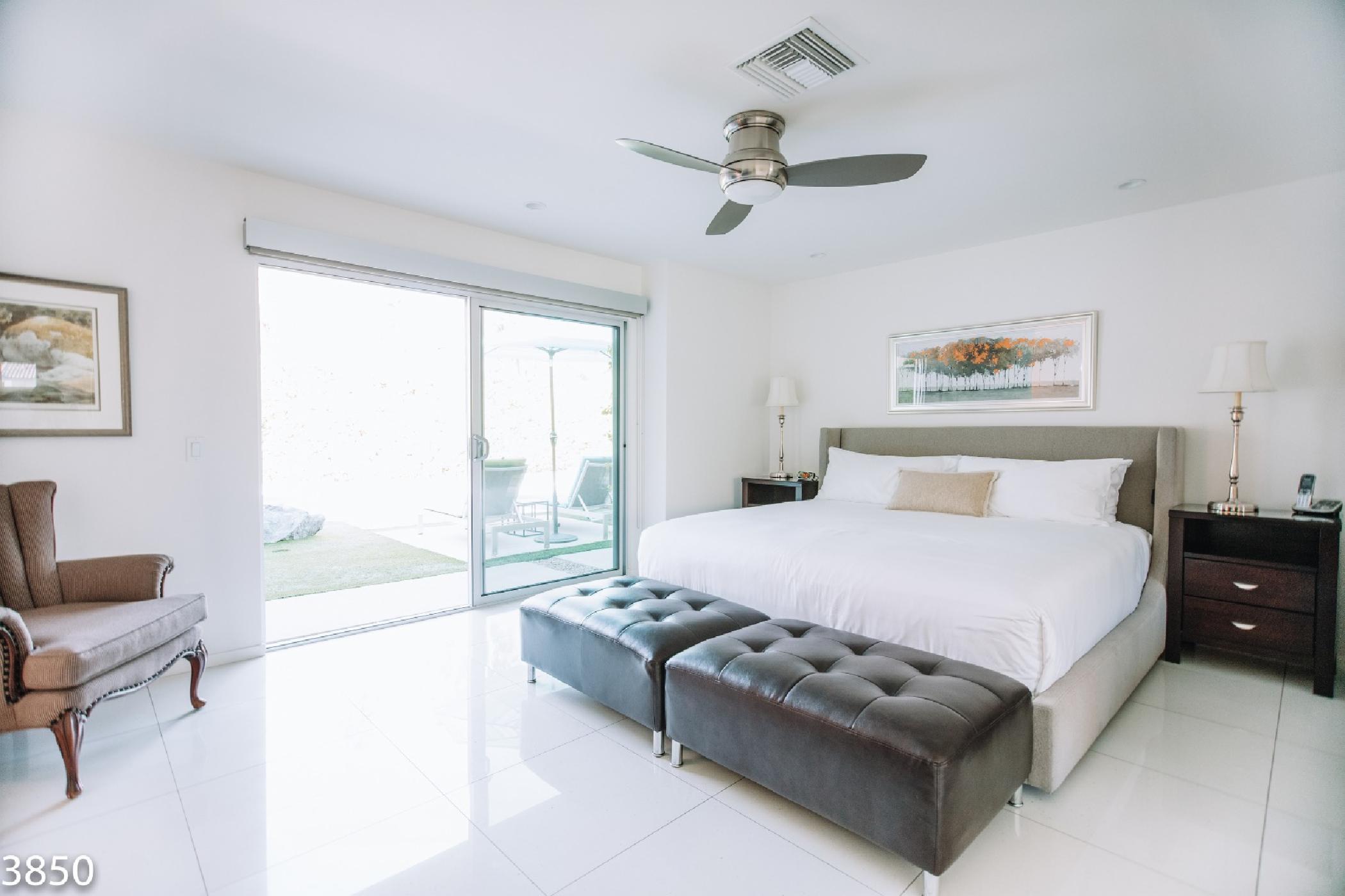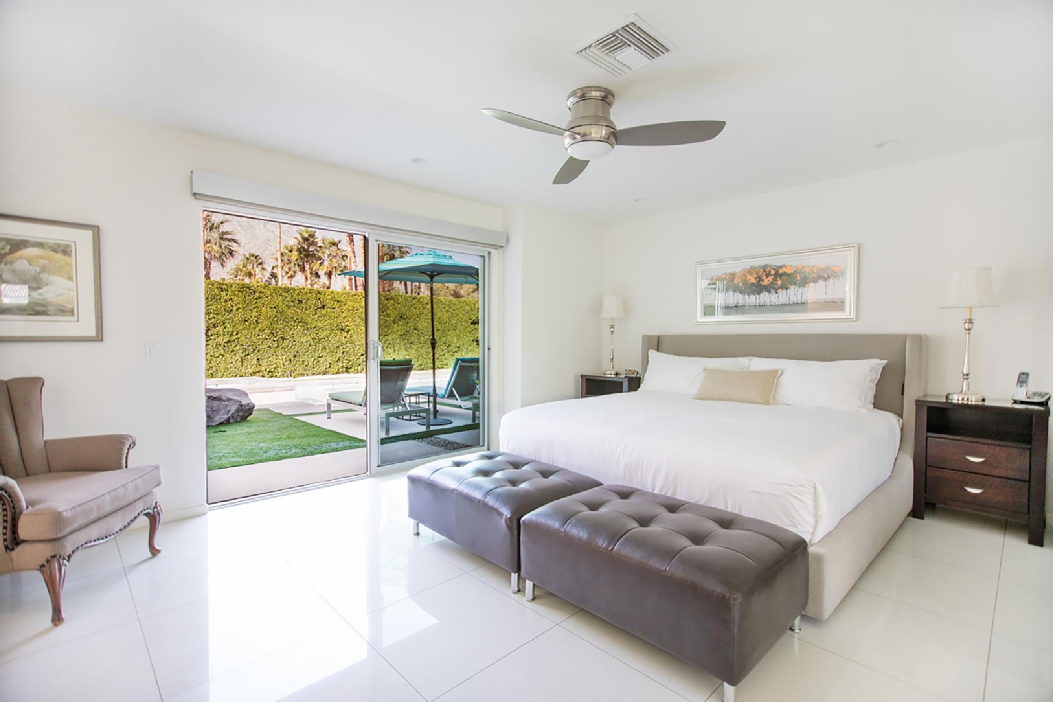Champagne Dream is a stunning four bedroom, four bath home with a detached casita and exceptional views of the San Jacinto Mountains. The estate features state of the art audio/video systems with music throughout the home. The home is beautifully designed with a nod the mid century design style and recently remodeled in January 2017. Original artwork, a state of the art kitchen and electric blinds are just a few of the many luxurious amenities of this amazing desert getaway.On the south end of the home there are 2 spacious bedrooms along the front of the home and a master suite located poolside of the home providing privacy from the main living spaces. The master suite features a King bed, flat screen TV, walk-in closet, and en suite bath with access to private outdoor shower. The large sliding glass door opens onto the sunny pool & patio. The sliders are outfitted with blackout shades. The second bedroom features a King bed, flat screen TV and private side patio access. The third bedroom offers a king size bed, flat screen TV and a semi-private patio off the home’s main entrance. All bedrooms come equipped with blackout blinds.