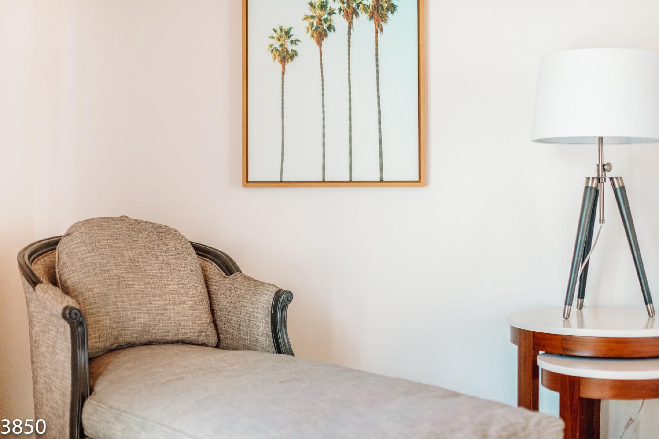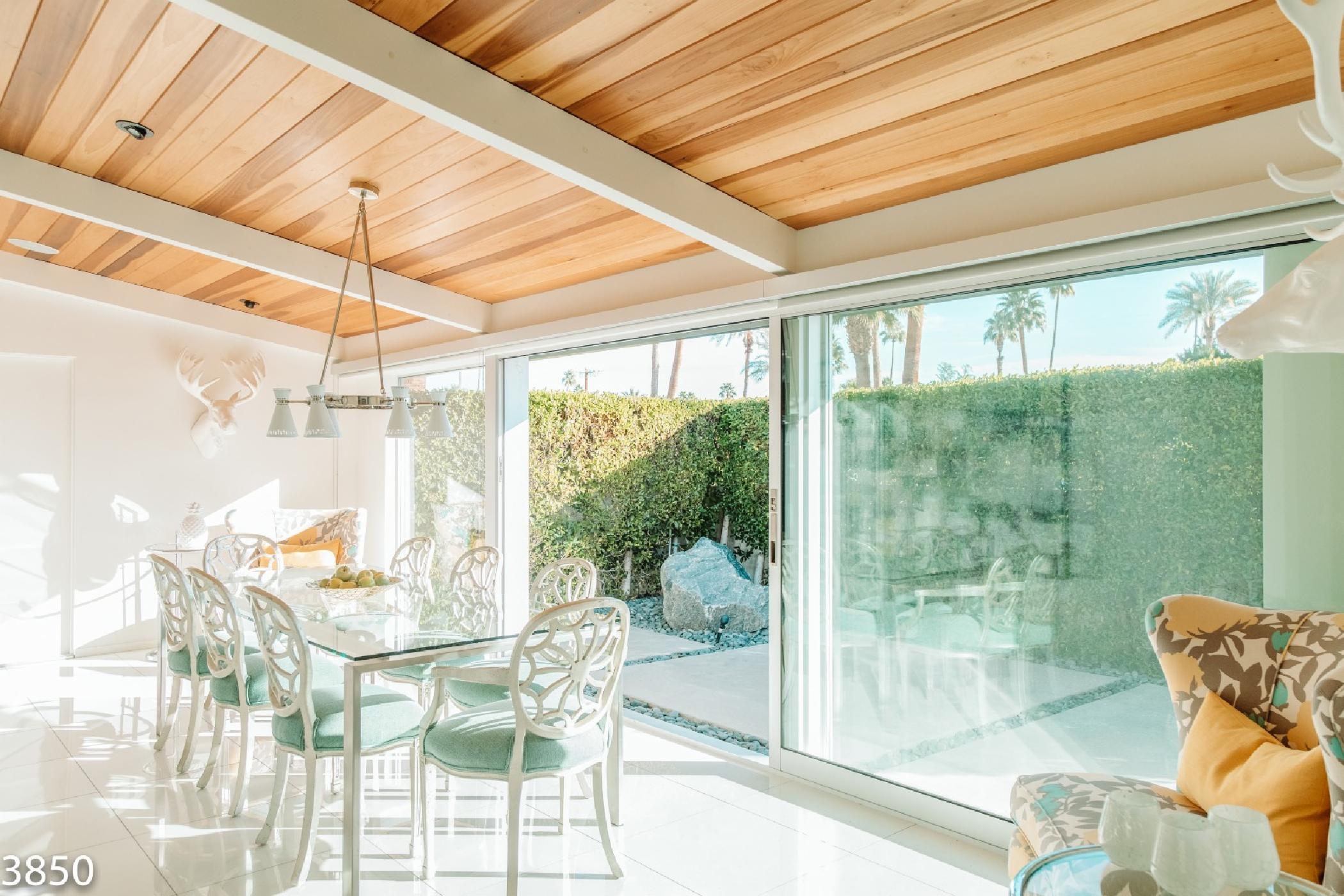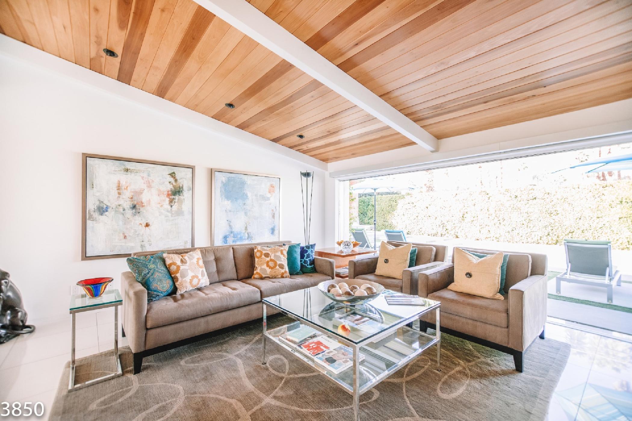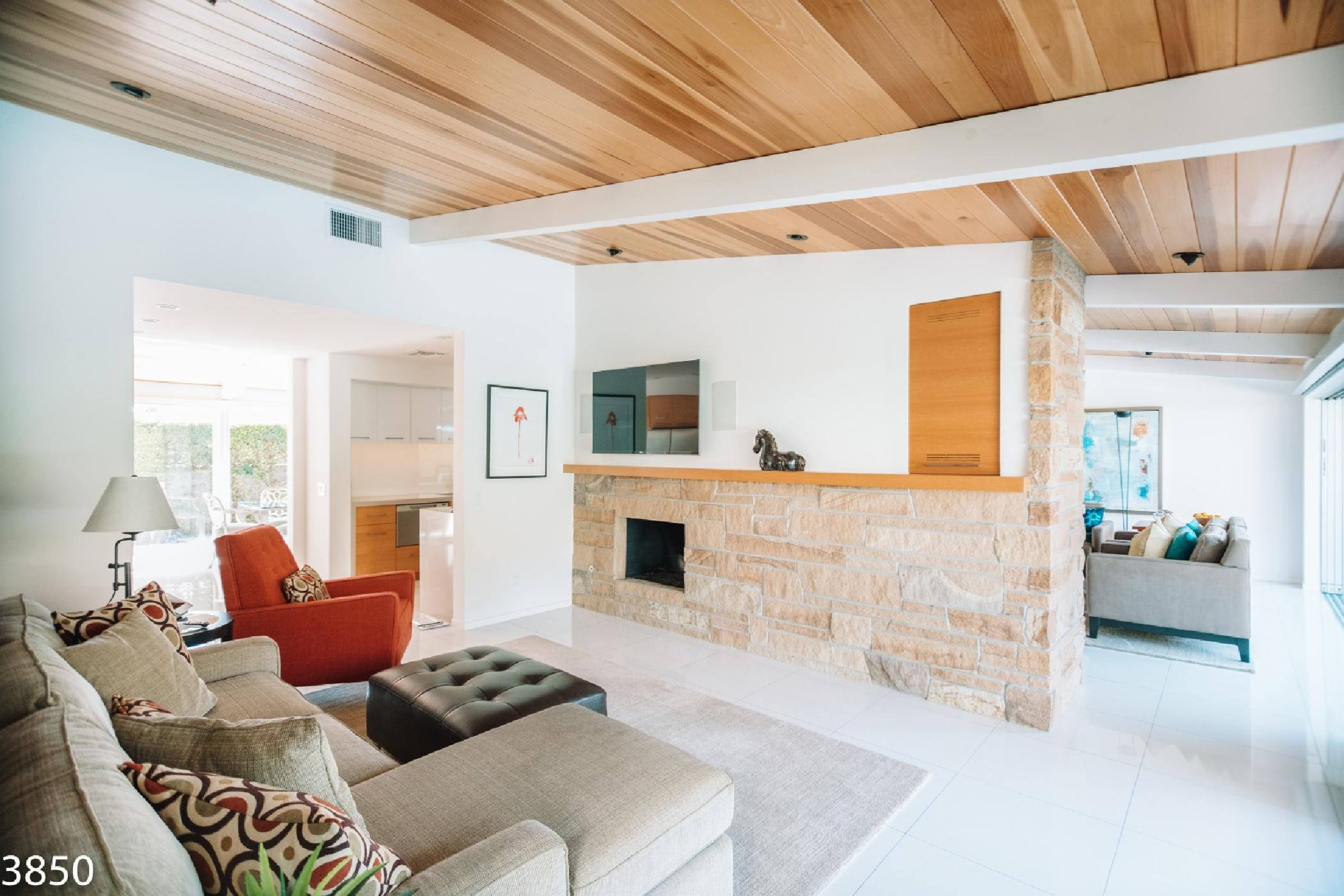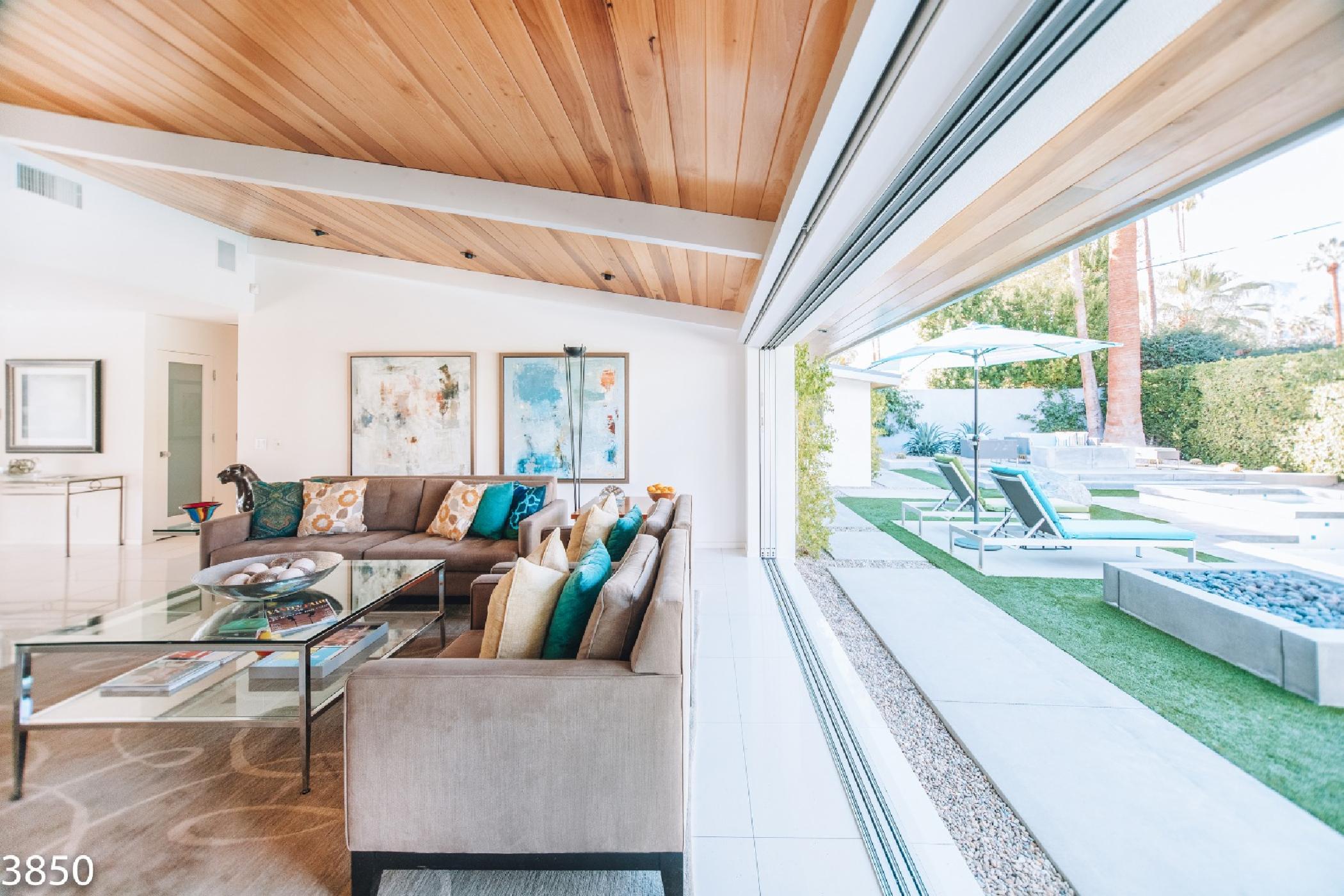 Champagne Dream is a stunning four bedroom, four bath home with a detached casita and exceptional views of the San Jacinto Mountains. The estate features state of the art audio/video systems with music throughout the home. The home is beautifully designed with a nod the mid century design style and recently remodeled in January 2017. Original artwork, a state of the art kitchen and electric blinds are just a few of the many luxurious amenities of this amazing desert getaway.On the south end of the home there are 2 spacious bedrooms along the front of the home and a master suite located poolside of the home providing privacy from the main living spaces. The master suite features a King bed, flat screen TV, walk-in closet, and en suite bath with access to private outdoor shower. The large sliding glass door opens onto the sunny pool & patio. The sliders are outfitted with blackout shades. The second bedroom features a King bed, flat screen TV and private side patio access. The third bedroom offers a king size bed, flat screen TV and a semi-private patio off the home’s main entrance. All bedrooms come equipped with blackout blinds.
