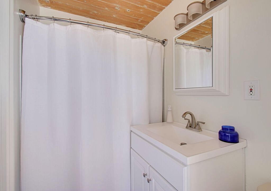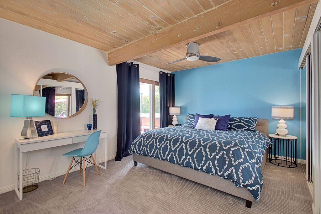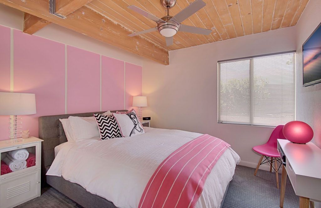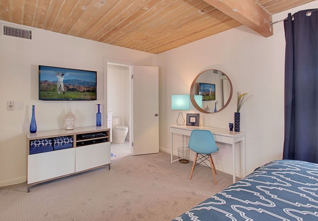 The master bedroom features a king bed with comfortable bedding. The sliding glass door offers direct access to the backyard pool area. It also includes a modern ensuite bathroom with custom sink and walk in shower. The two guest bedrooms each feature queen size pillow-top beds and are stylishly appointed and comfortable. These 2 guest bedrooms share a hall bath with walk in shower.