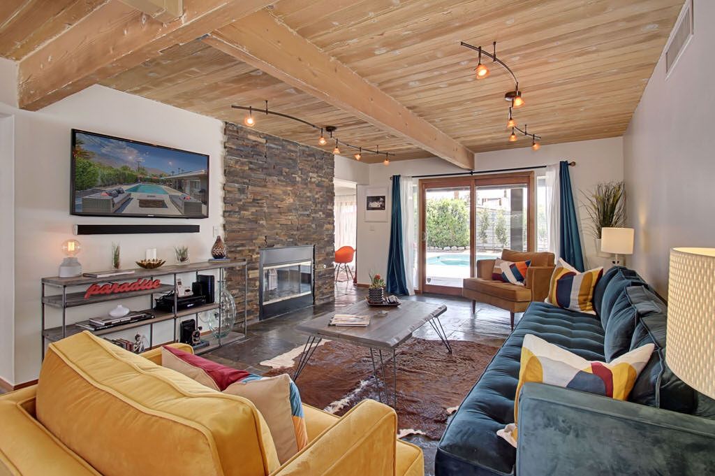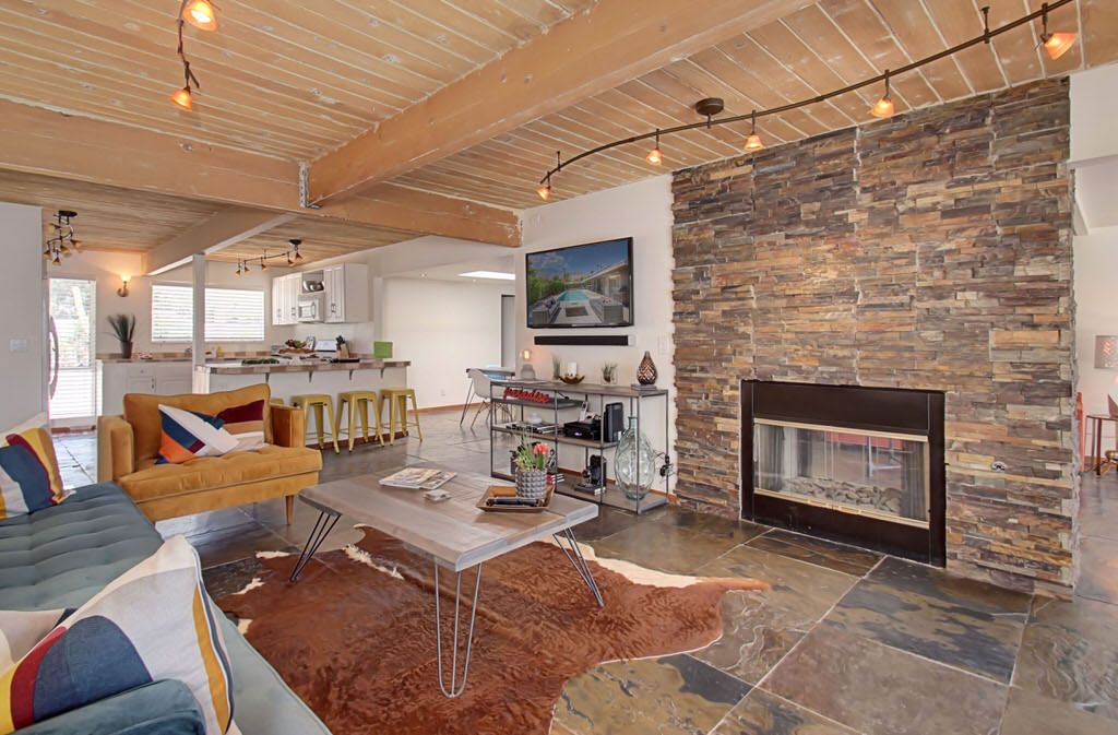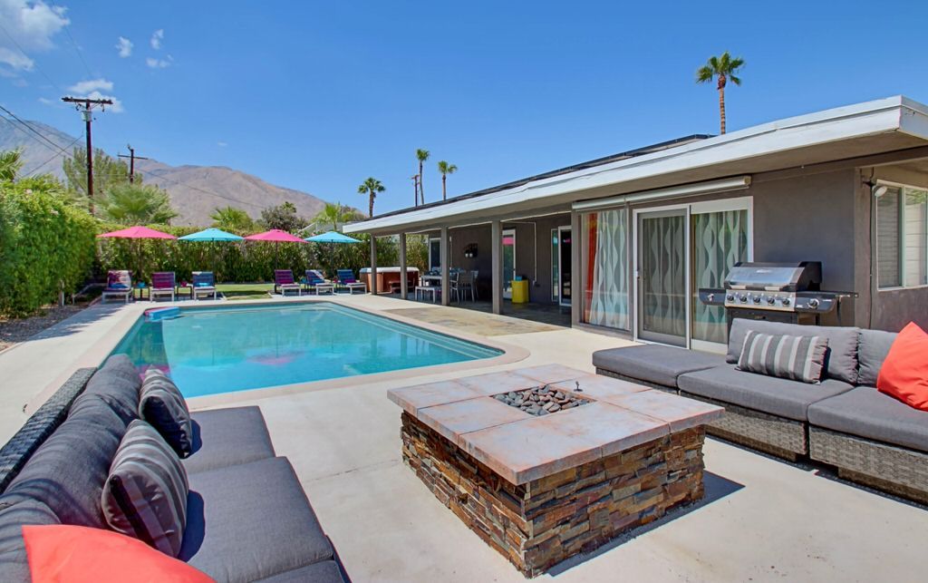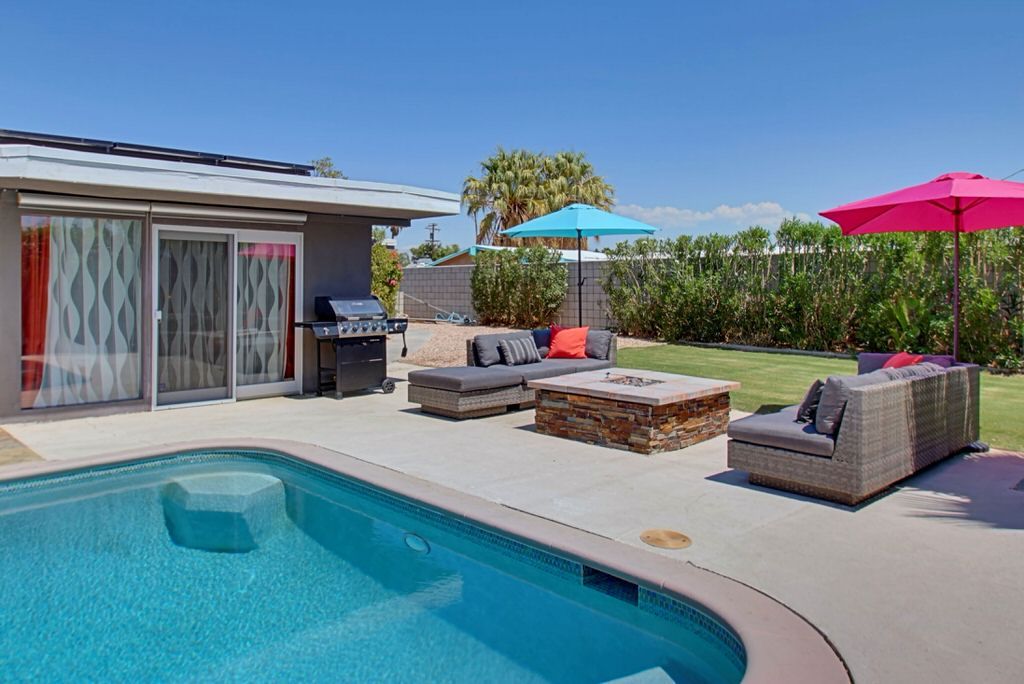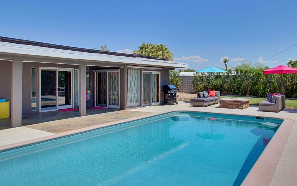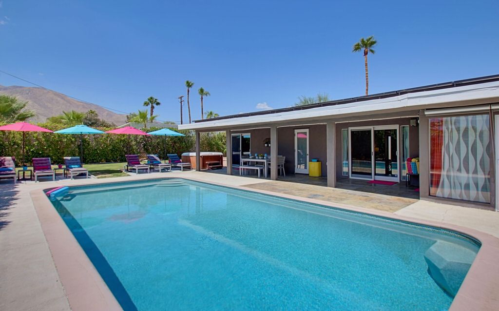 Recently remodeled in 2015, this mid-century modern Alexander home features, post and beam architecture, rock fireplace, new carpet, new furnishings and colorful fun decor throughout. This vacation rental is a great example of the wonderful indoor-outdoor living that makes Palm Springs such a popular year-round resort and vacation destination.