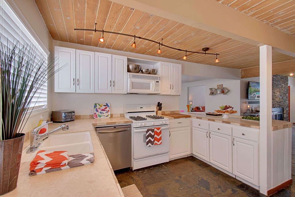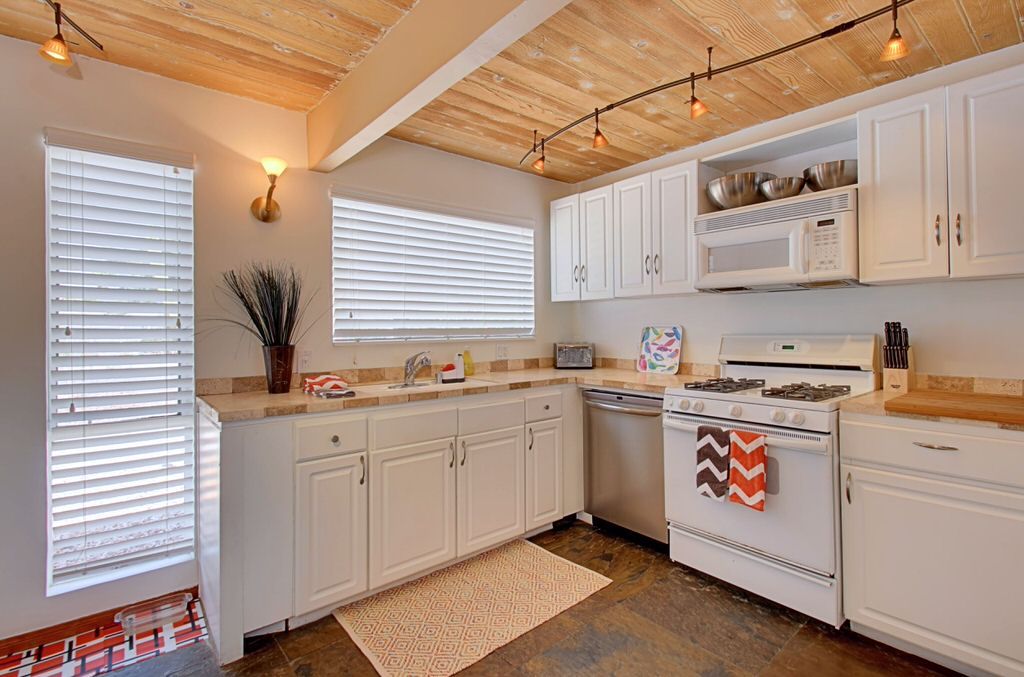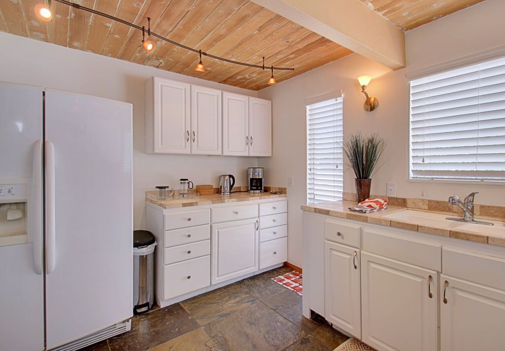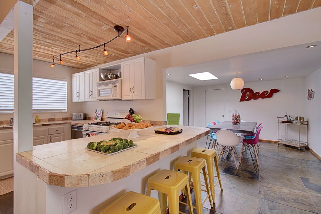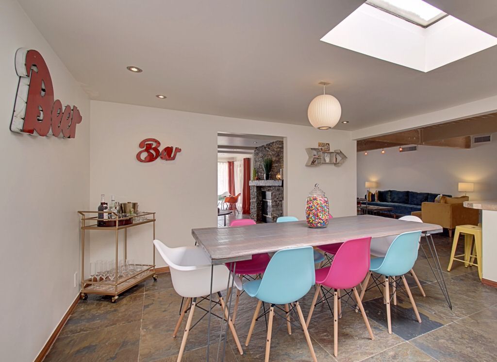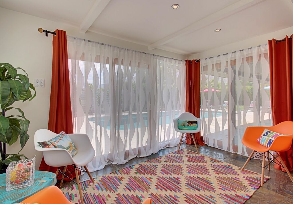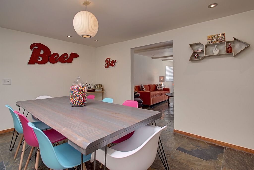 Walk in to the vintage style living room where you'll find fabulous new furnishings with walls of glass looking outside to the pool area. With an open floor plan it's easy to enjoy dining and entertaining with friends and family. The kitchen is supplied with everything you need to cook a gourmet meal. Just steps away the colorful dining area sits 8 more for plenty of room for everyone. Enjoy the colorful and fun decor.