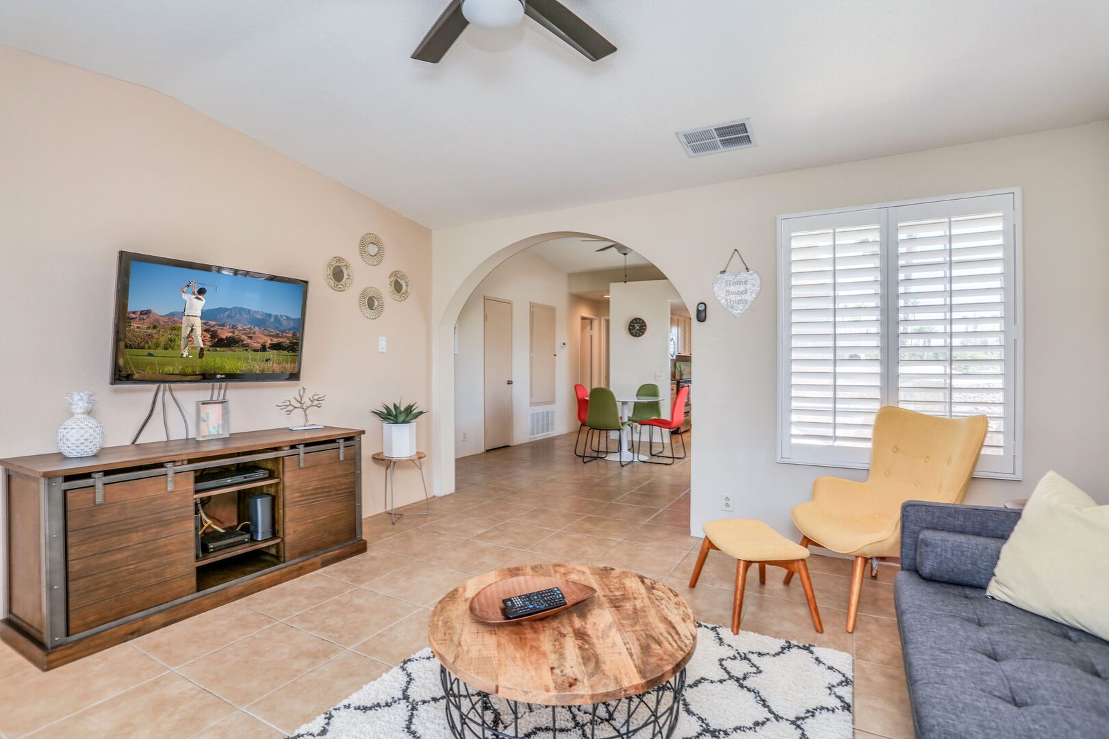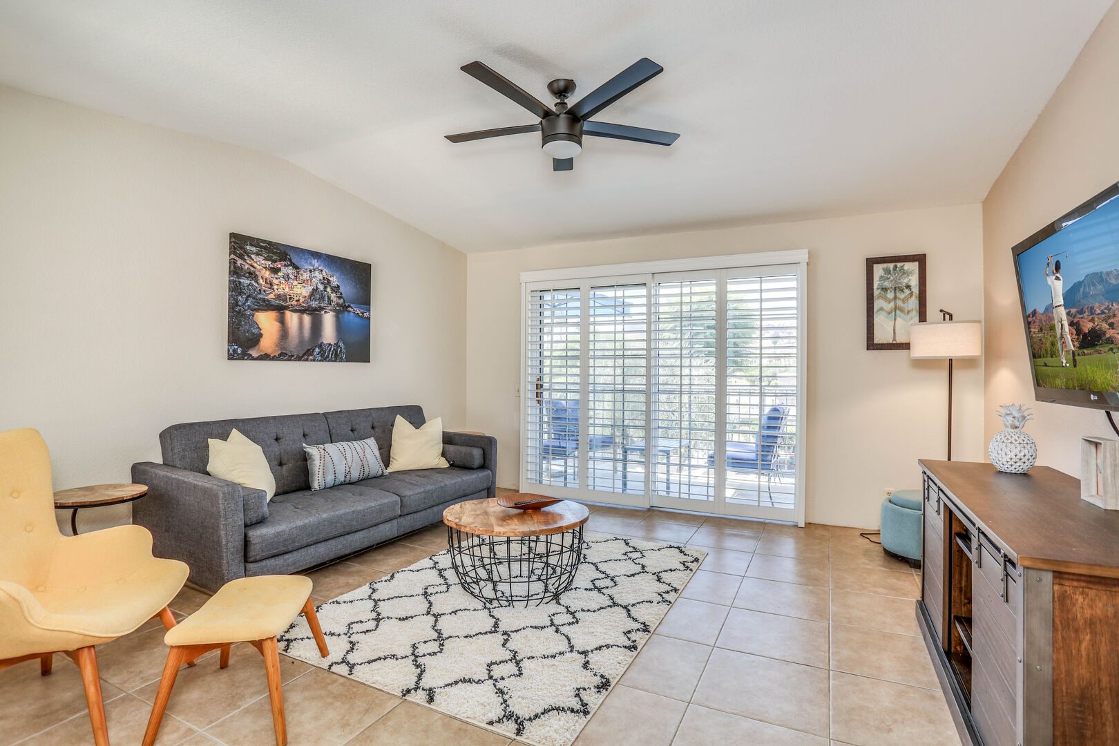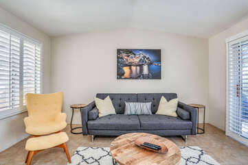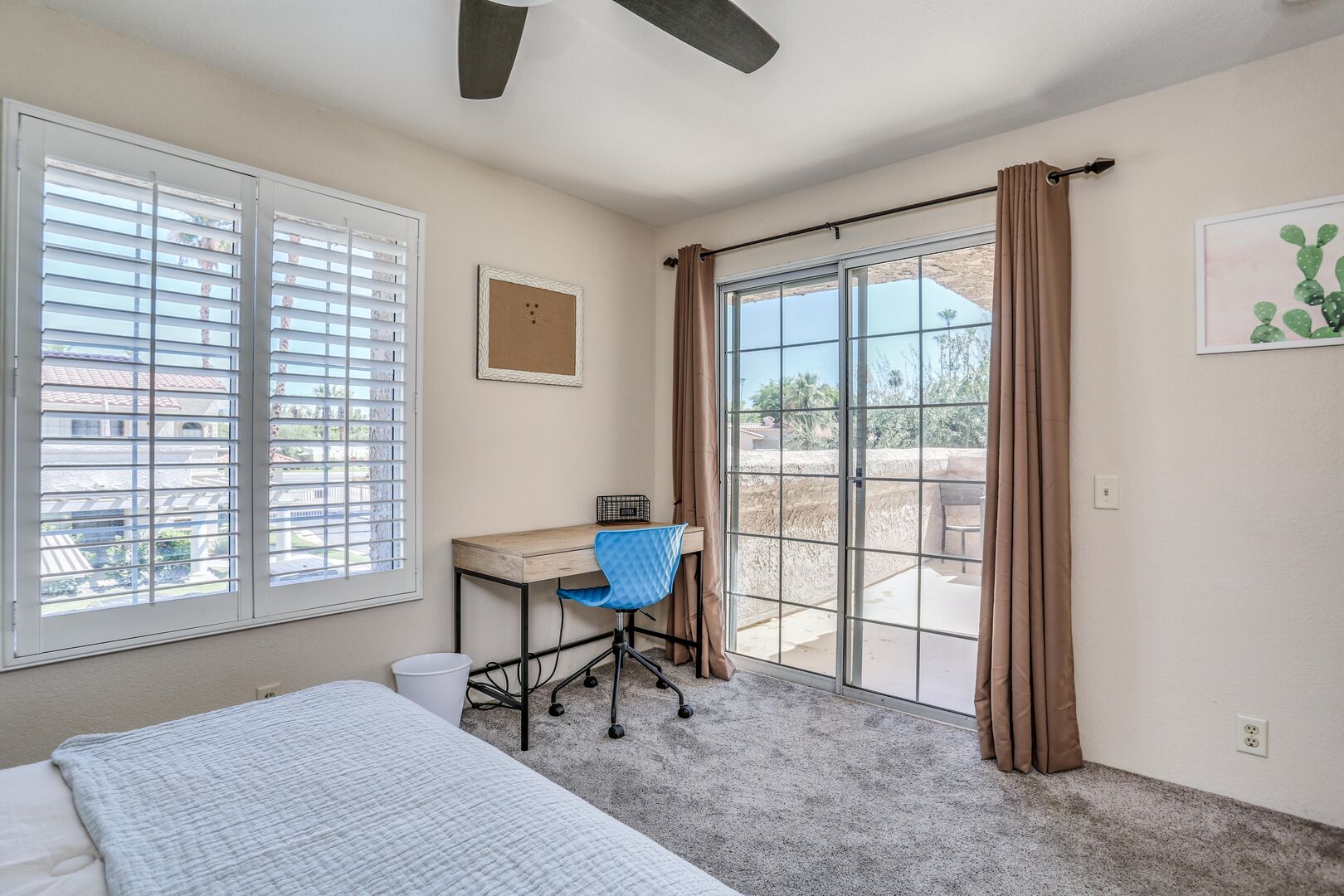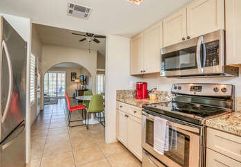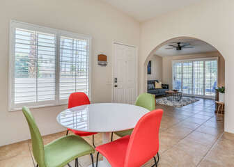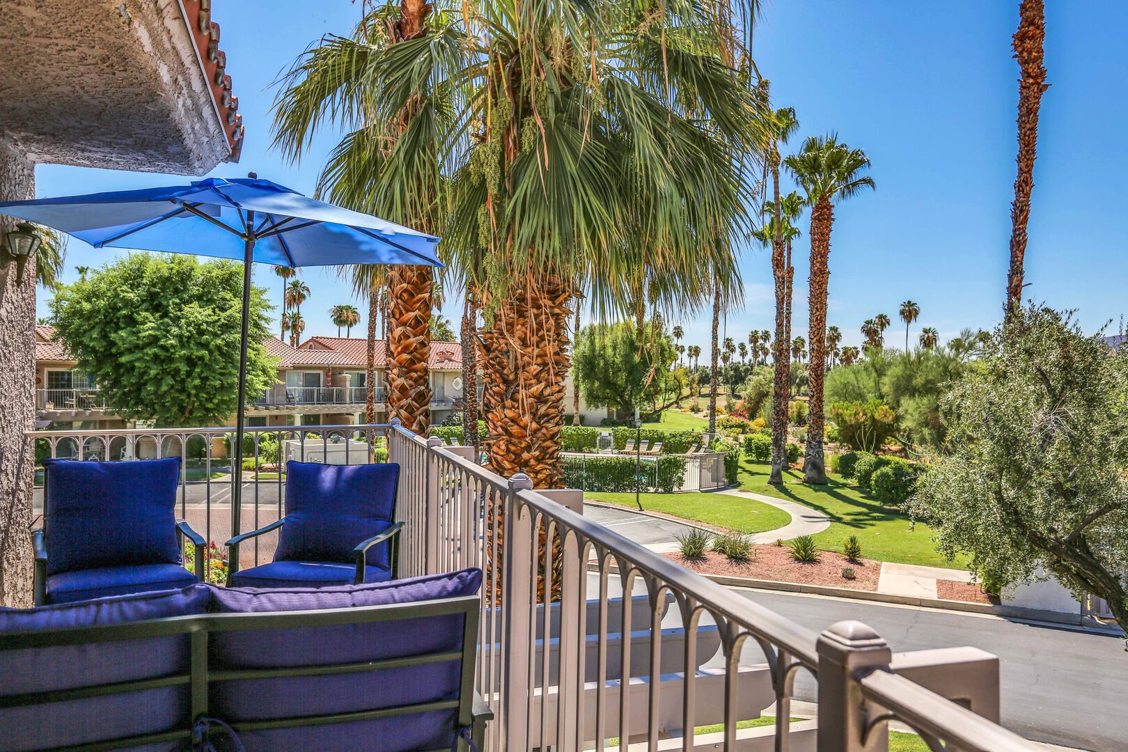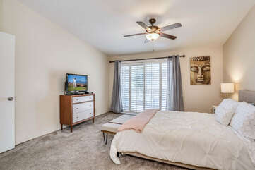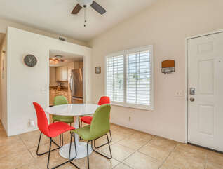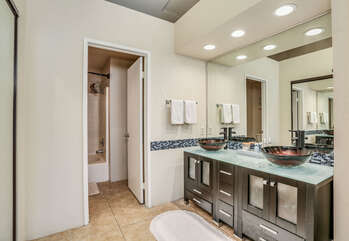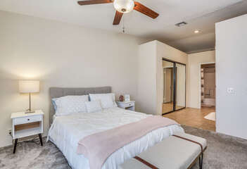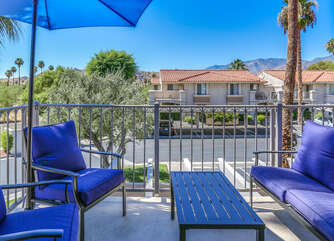 The two bedrooms of this Palm Springs vacation condo are on separate sides of the home to allow for optimum privacy, and both offer direct access to their own unique patio space. The spacious master suite features a Queen bed, Flat Screen 34" TV, dual vanities, combo soaking tub and shower, and direct rear patio access. The second bedroom is located in the front of the condo and features a Queen bed, Flat Screen 19" TV, desk, and shared hallway bathroom with combo tub/shower. This guest bedroom also has its own balcony where you can enjoy morning coffee at the bistro set.
