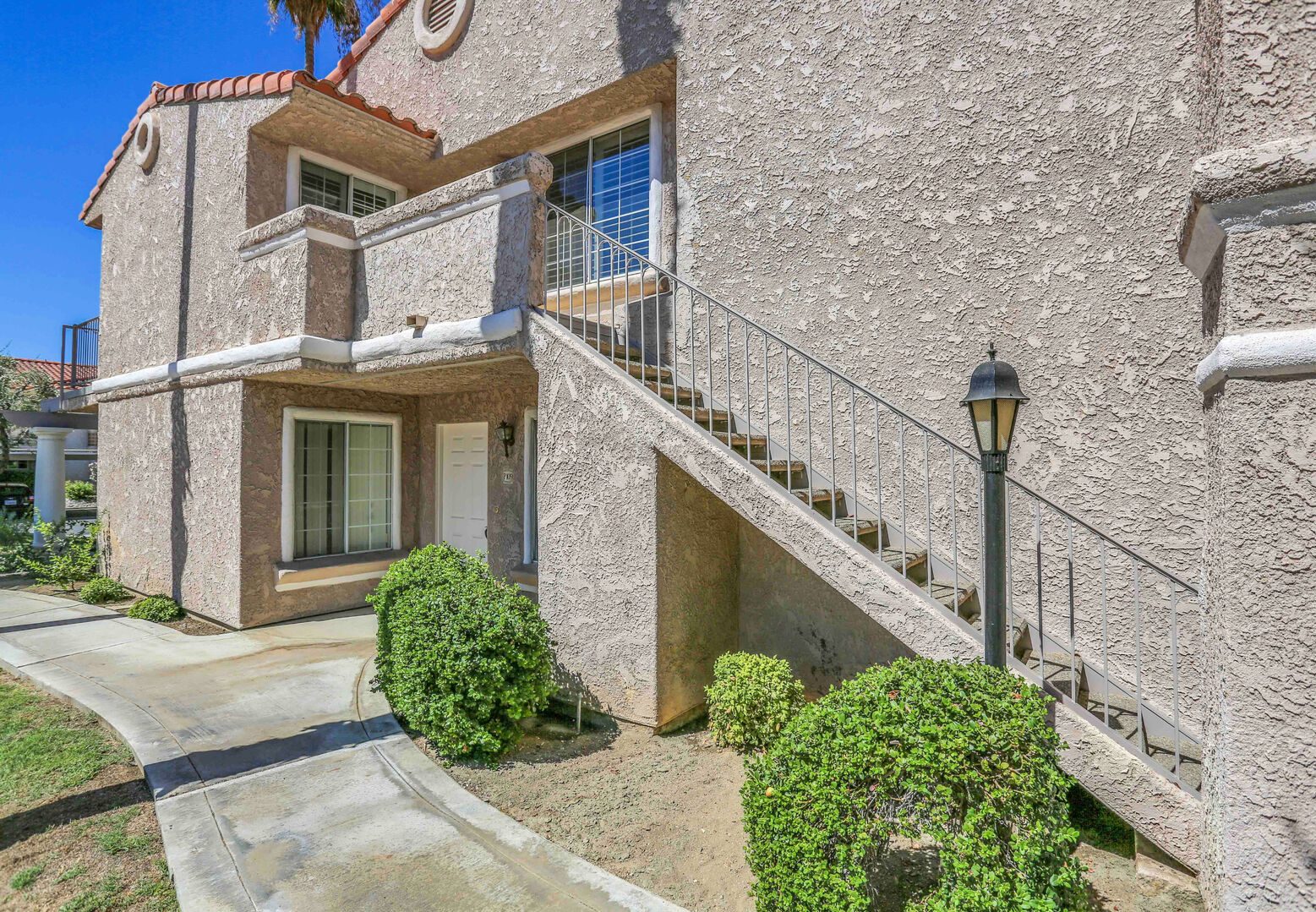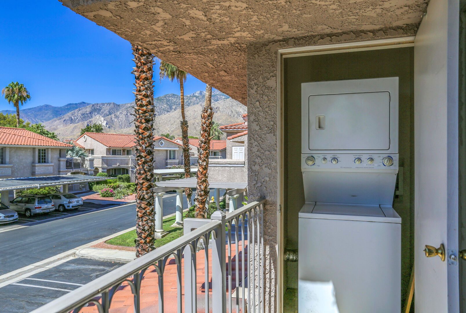 Mesquite Phase III is centrally located in Palm Springs and within easy walking distance to restaurants, shopping, and amenities. This upper floor unit is now available for you to enjoy and features two bedroom, two bathrooms and new decor and furnishings. This Mesquite Country Club condo is an end unit, upper level, and mere steps from one of the multiple community swimming pools and spas. Covered parking is just a few steps from the front door, and the rear deck offers views of the pool, mountains, and golf course.Comfortable and Contemporary styling defines this open-concept floor plan. You'll appreciate the plantation shutters throughout, wall to wall tile flooring in the common areas, new plush carpeting in the bedrooms, updated kitchen with granite counters, stainless appliances, and all brand new furniture, bedding and accessories. The Living Room boasts a 46" flat screen TV for your viewing enjoyment. The u-shaped kitchen is well equipped with everything you'll need to prepare meals and entertain guests. The refrigerator is stainless steel with freezer on the bottom, and the stove is a ceramic flat top.