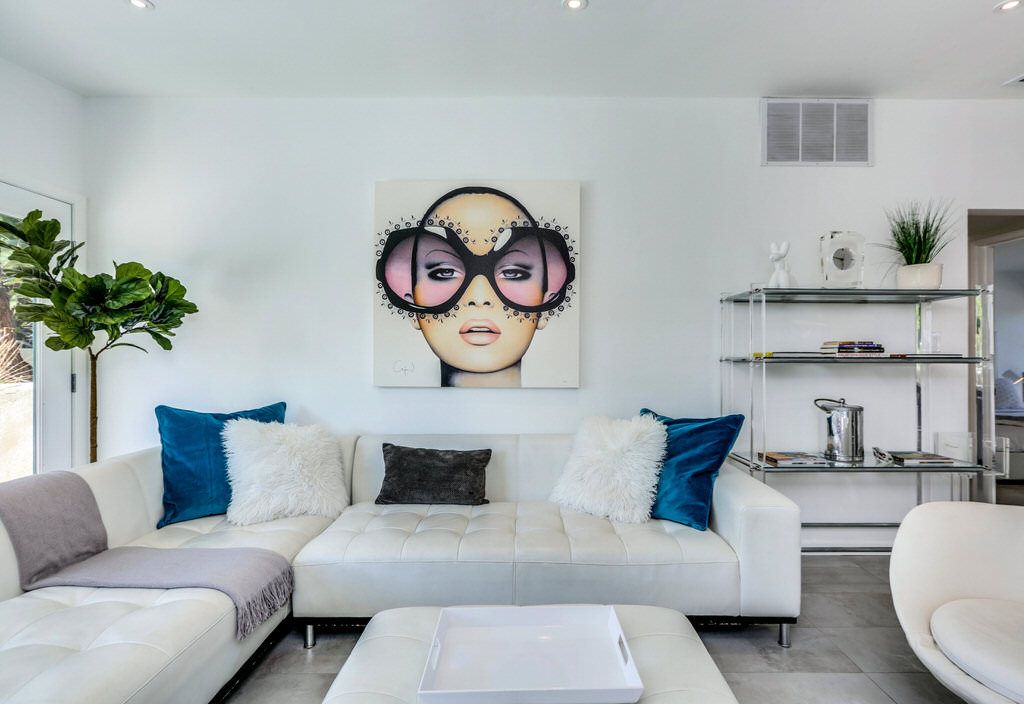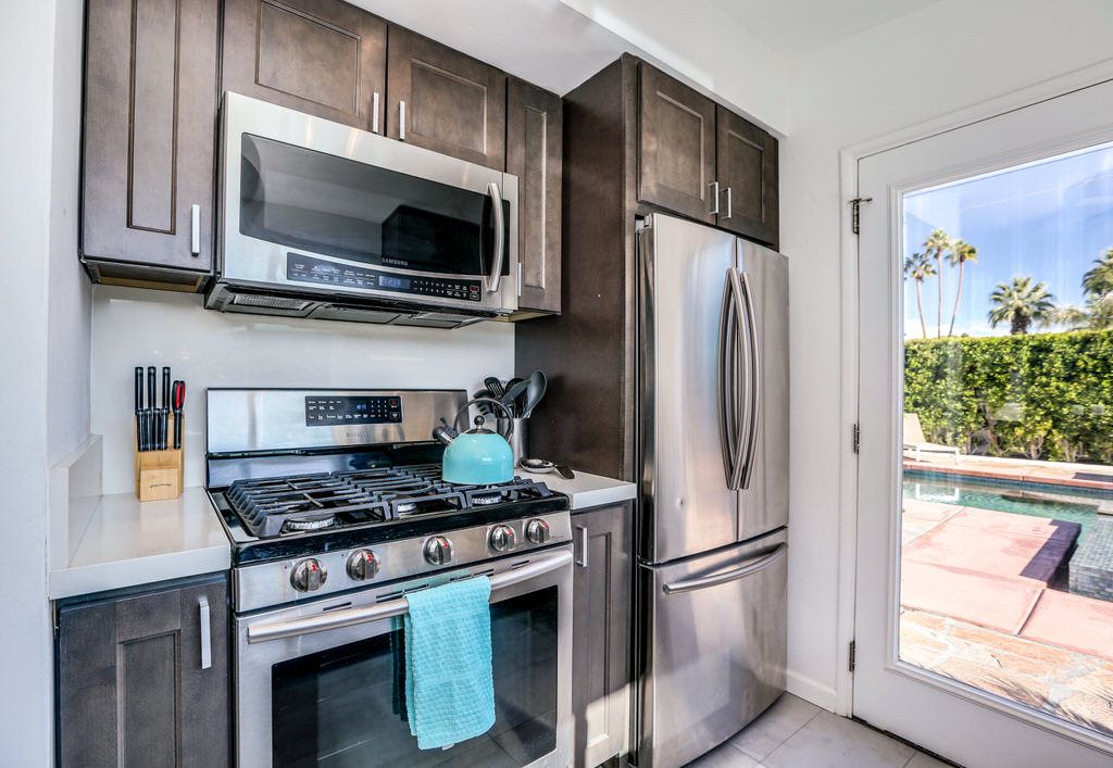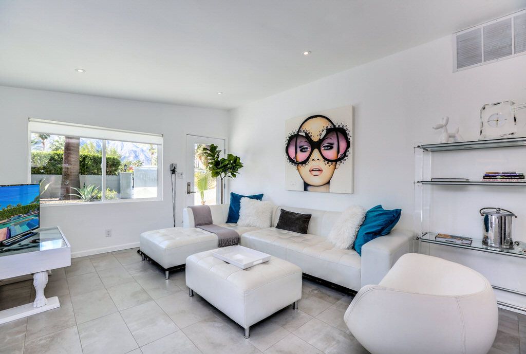 Each bedroom features a king size bed, decorative art and plenty of closet space. The comfortable living room has a large flat screen television with Roku and Netflix, but no cable. The sectional leather couch, decorative artwork and those gorgeous Palm Springs mountain views.