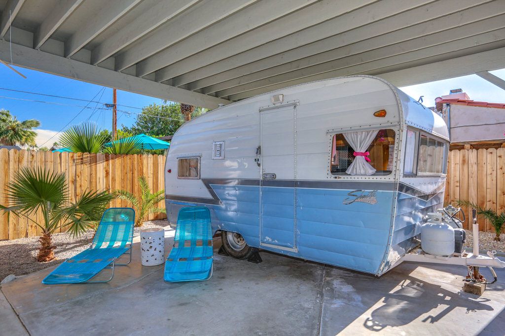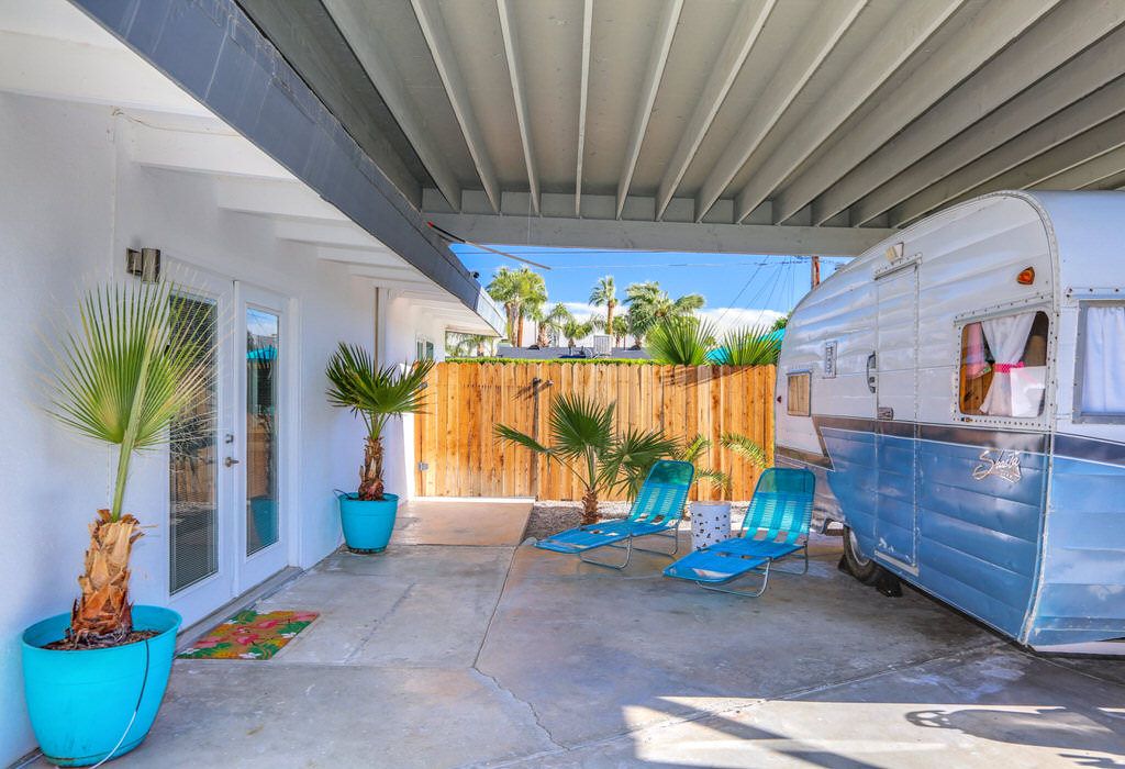 This charming two bedroom bungalow is located well away from any busy streets - ideally located for walking or cycling around the level streets of Palm Springs. There are beautiful mountain views from the front and back yards, the covered carport features a Shasta trailer for posting a photo op, fire feature in the back yard, outdoor dining, BBQ – enjoy sitting in the spa or pool while the sun sets on the mountains.