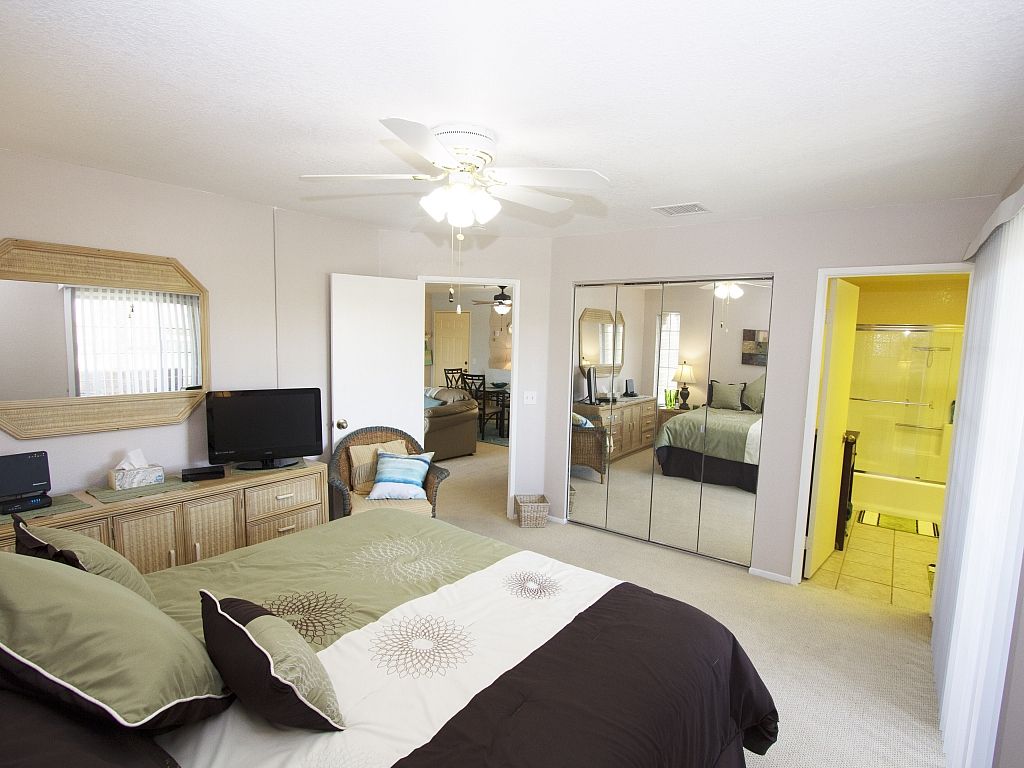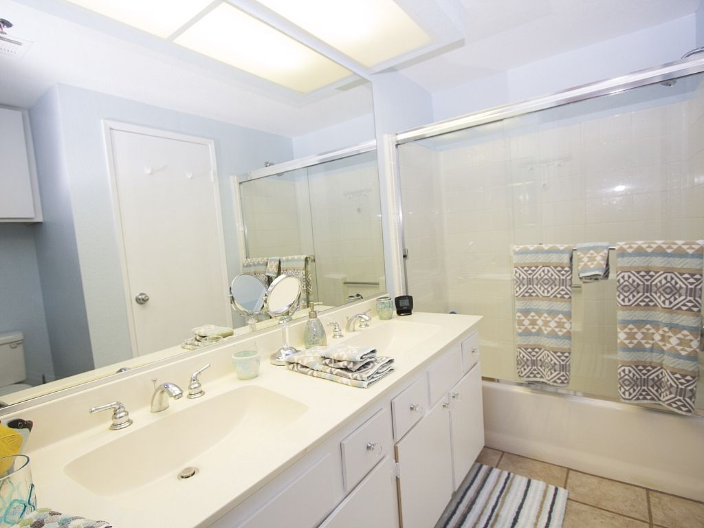 The master bedroom has a King size bed, en-suite bathroom and a private balcony that offers views of desert landscaping and the spa area. The second bedroom has plenty of room to spread out and features a queen size bed and an en-suite bathroom.