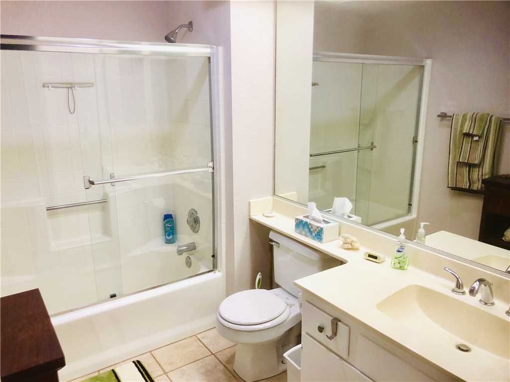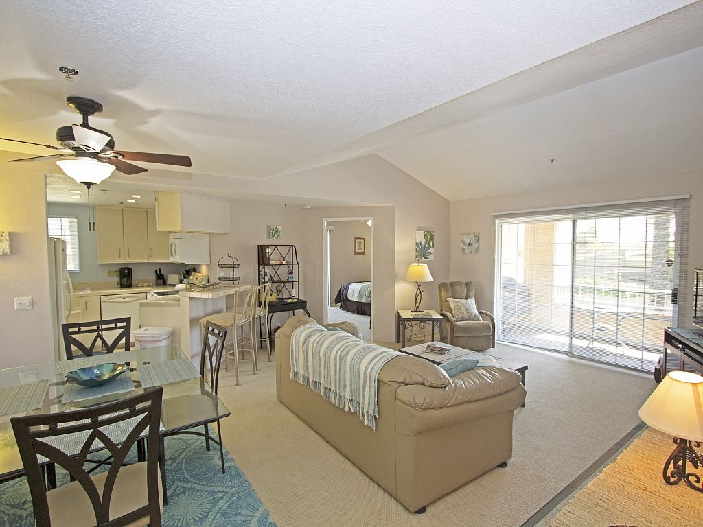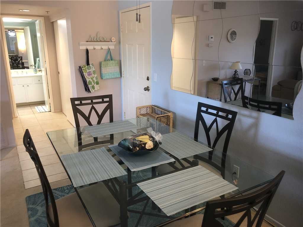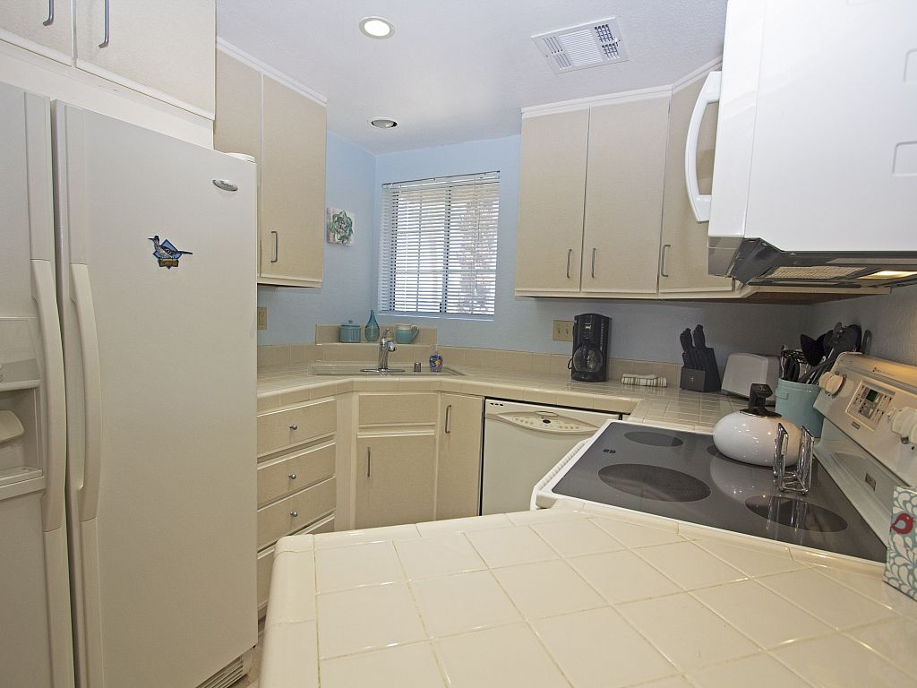 The living room is spacious, with numerous windows and a sliding glass door that leads out to the balcony displaying views that a ground level condo can not produce. The dining room and kitchen are just a few steps away. Inside this kitchen you'll discover wood cabinets, tiled counter tops and all the large and small appliances you'd find in your own home.