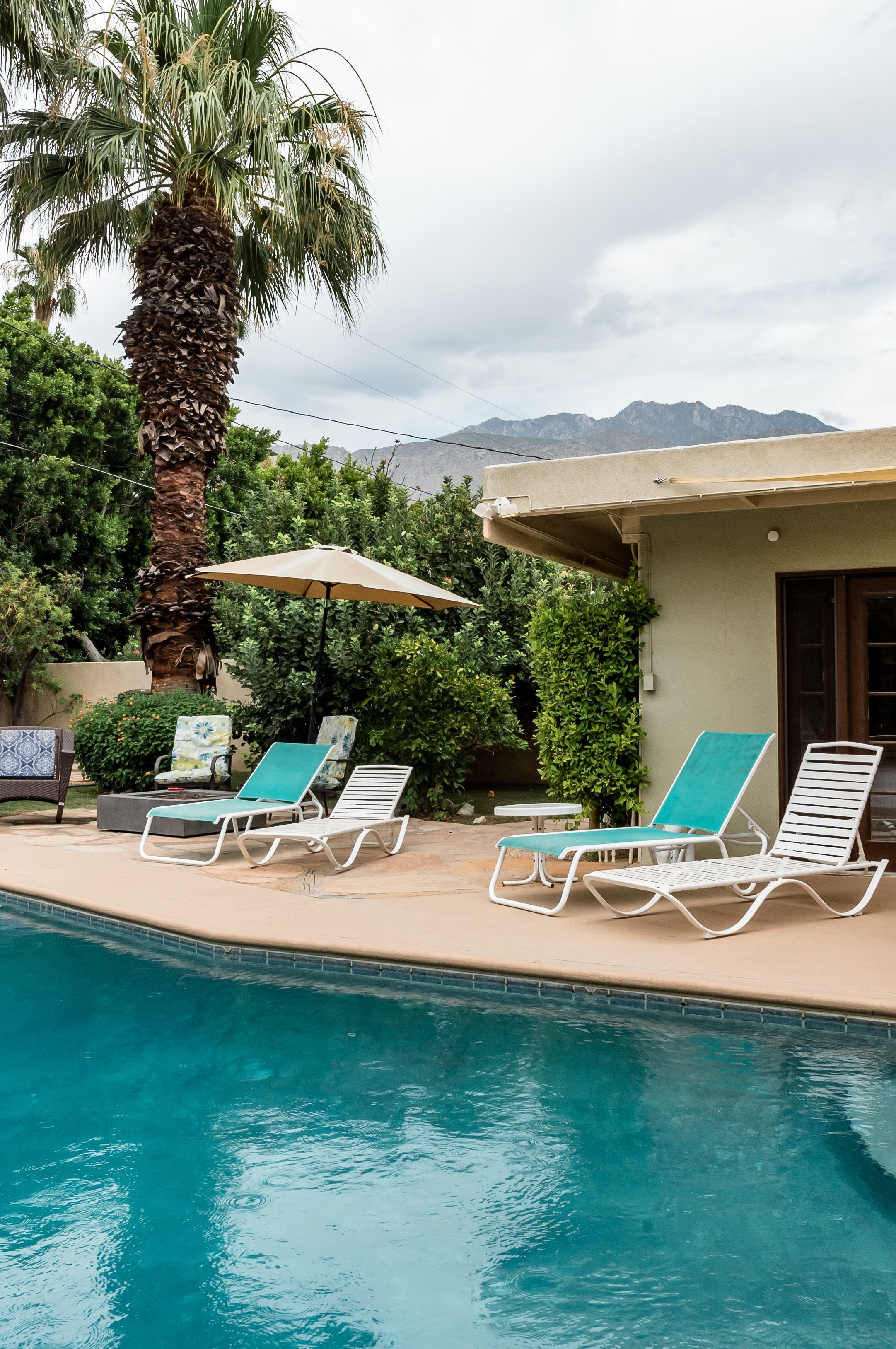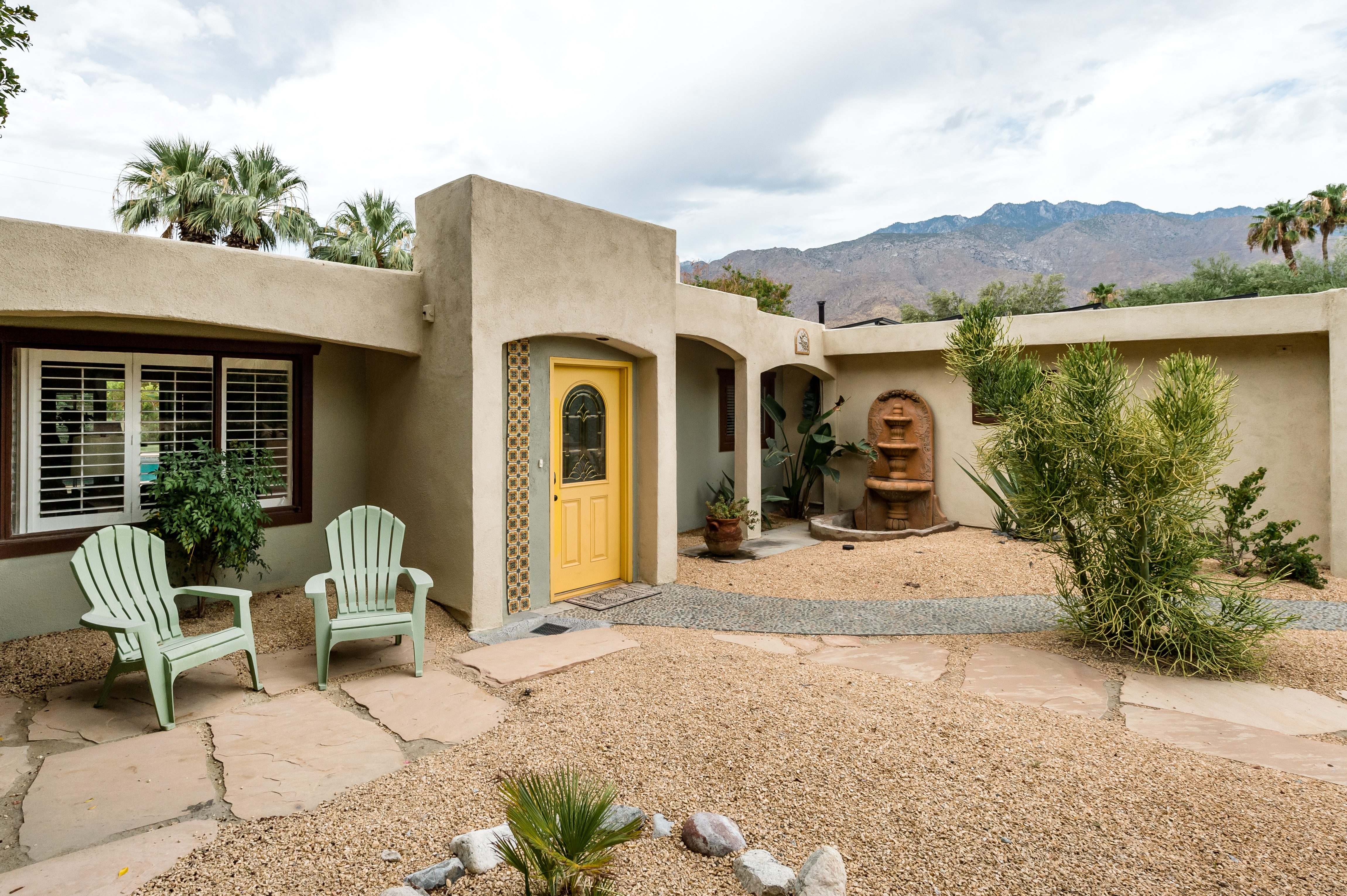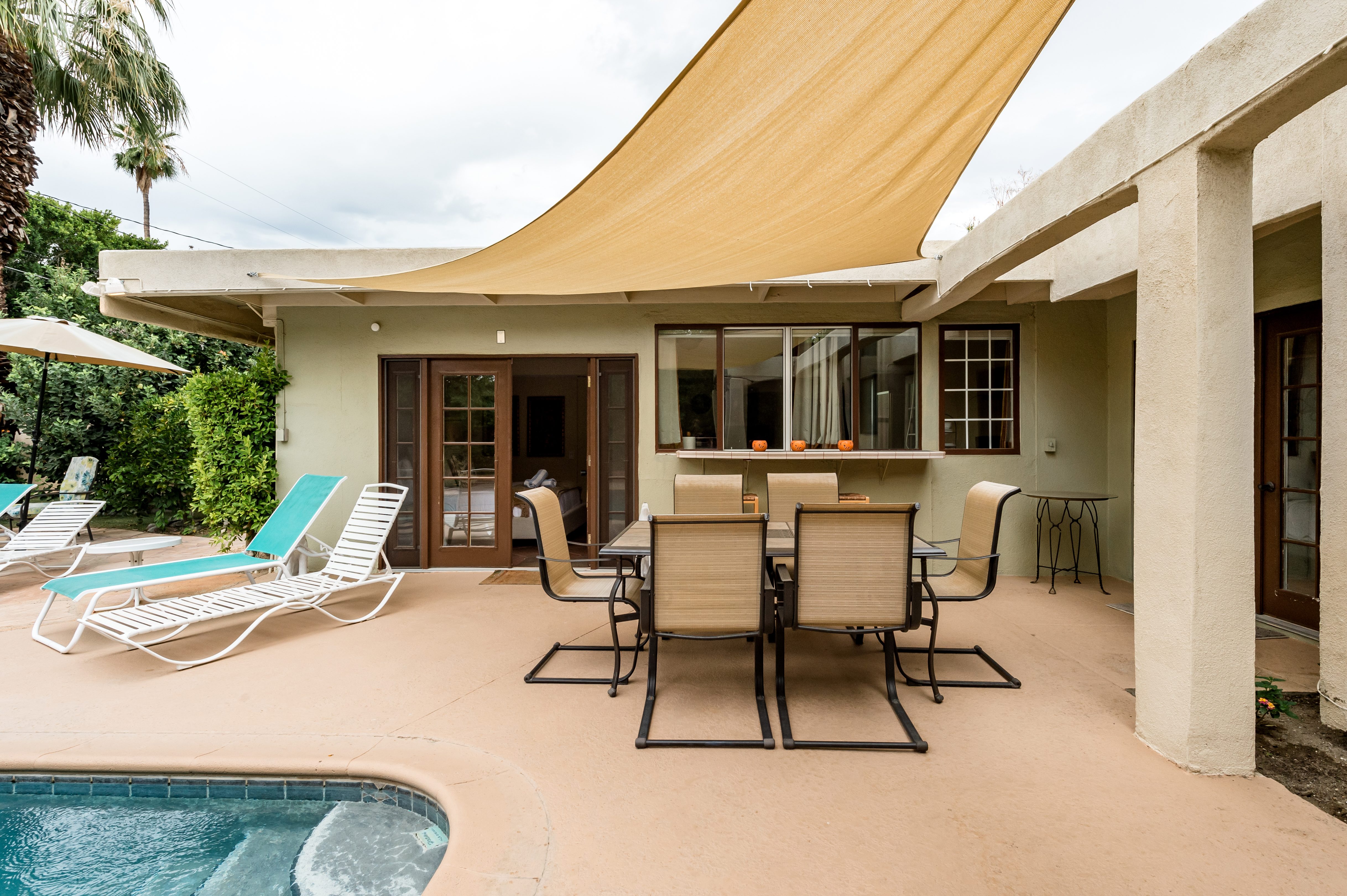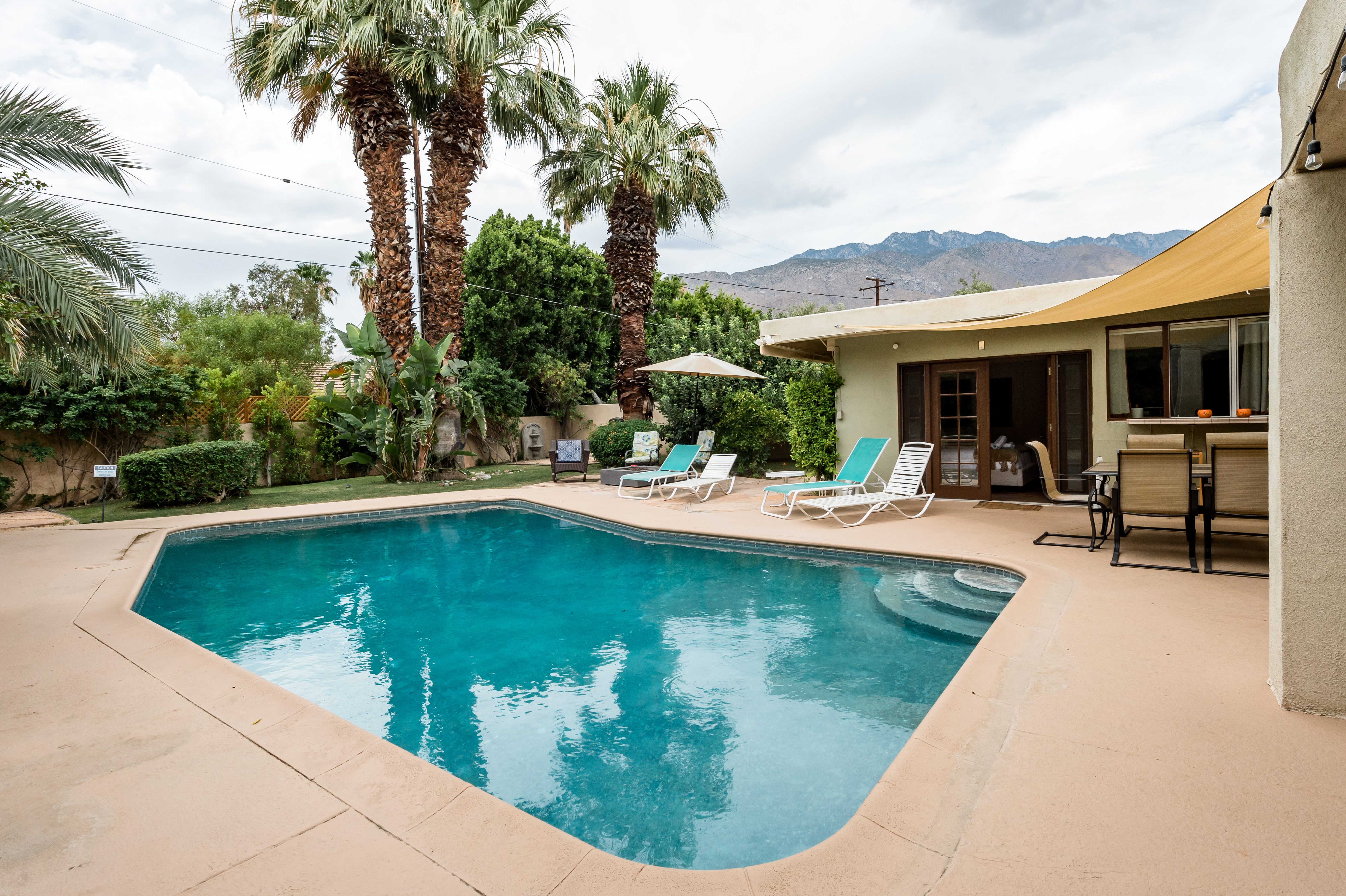 Go for a swim, then kick back under blue skies on a leafy patio offering mountain views. Warm furnishings and Hollywood-themed decor offer a vibrant tenor within this former TV star’s home. At sunset, grab a cold drink and gather by the fire pit. P.S. City ID #1173 Primary renter must be at least 25 years of age Celebrity Home near Ruth Hardy Park. 2 en suite bedrooms + en suite guest casita w/ additional poolside serving kitchen & bar. Private yard, heated pool, covered outdoor dining/ living areas, fire feature, mountain views. Walk to town. Fabulous pool home in walking distance to the world famous Palm Canyon Drive and just steps from Ruth Hardy Park. According to local lore, this was once the home of George Reeves, star of the 1950s Superman television series. So please, no Kryptonite. The owners have updated this midcentury garden house to create a fabulous Vacation Home where it’s all about relaxing in the sunshine. Gorgeous private pool yard with Spa and beautiful mountain views. Spacious open concept floor plan where all of the rooms open up to the outdoor patios, gardens and courtyards. Free WiFi, four flat screen televisions, and three en suite sleeping quarters including a guest casita with a serving kitchen and poolside bar. ABOUT THE INTERIOR LIVING SPACES There is a simple understated elegance about this home that creates a very relaxed, comfortable, easy living vibe. The open layout of the living spaces is perfect for spending time with your entire group. The great room, with its two-sided fireplace, features lots of seating for lounging, dining and binge watching your favorite TV shows. French doors open to the covered lanai to reveal the breathtaking pool yard, gardens and mountain views. The recently remodeled main kitchen with its natural gas stove, is perfect for individual or group meal prep. ABOUT THE SLEEPING QUARTERS All three of the sleeping quarters offer Queen-sized beds with hospitality-quality mattresses, en suite baths, flat screen televisions, ample storage and direct access to the outdoors. Inside the main home are two Queen Masters. The additional Queen guest casita features a poolside bar and service kitchen with a full-size refrigerator. This is Palm Springs living at its best - where we blur the lines between indoor and outdoor living - taking full advantage of the weather, sunshine and spectacular mountain views. ABOUT THE POOL YARD As gorgeous as the interior spaces of this home are - it is the outdoor spaces that are the crowning glory. The entire back yard has been walled and landscaped for complete privacy. Poolside chaise lounges, outdoor dining and hanging spaces, a fire pit, shade umbrellas - this vacation home has it all - perfect for relaxing in the sun or escaping to the shaded areas. At night, beautiful twinkling lights and landscape illumination compliment the desert’s starry skies to give this place a completely magical feel - like your own private Palm Springs resort. ABOUT THE LOCATION Tucked away on a quiet residential street in the Movie Colony East neighborhood, this property is just one block from Ruth Hardy Park, and less than a mile from the world famous Palm Canyon Drive. You’ll be in walking distance to the Palm Springs Uptown Design District with its fine dining restaurants, sidewalk cafes, specialty boutiques, art galleries and midcentury modern furniture showrooms. The casino, convention center and night spots like Tropical and The Copa are just a short stroll away. Neighborhood conveniences like grocery stores, sandwich shops, burger joints and other casual eateries are all very close by. The home is located in Palm Spring’s Movie Colony neighborhood, an area once home to many Hollywood golden-agers. The nearby Ruth Hardy Park offers lush paths and tennis courts. Downtown’s boutiques, museums, restaurants, and bars are minutes away. Certain dog breeds under 65 lbs are allowed at this home, the dog fee is $195 (2 dogs maximum).Amenities