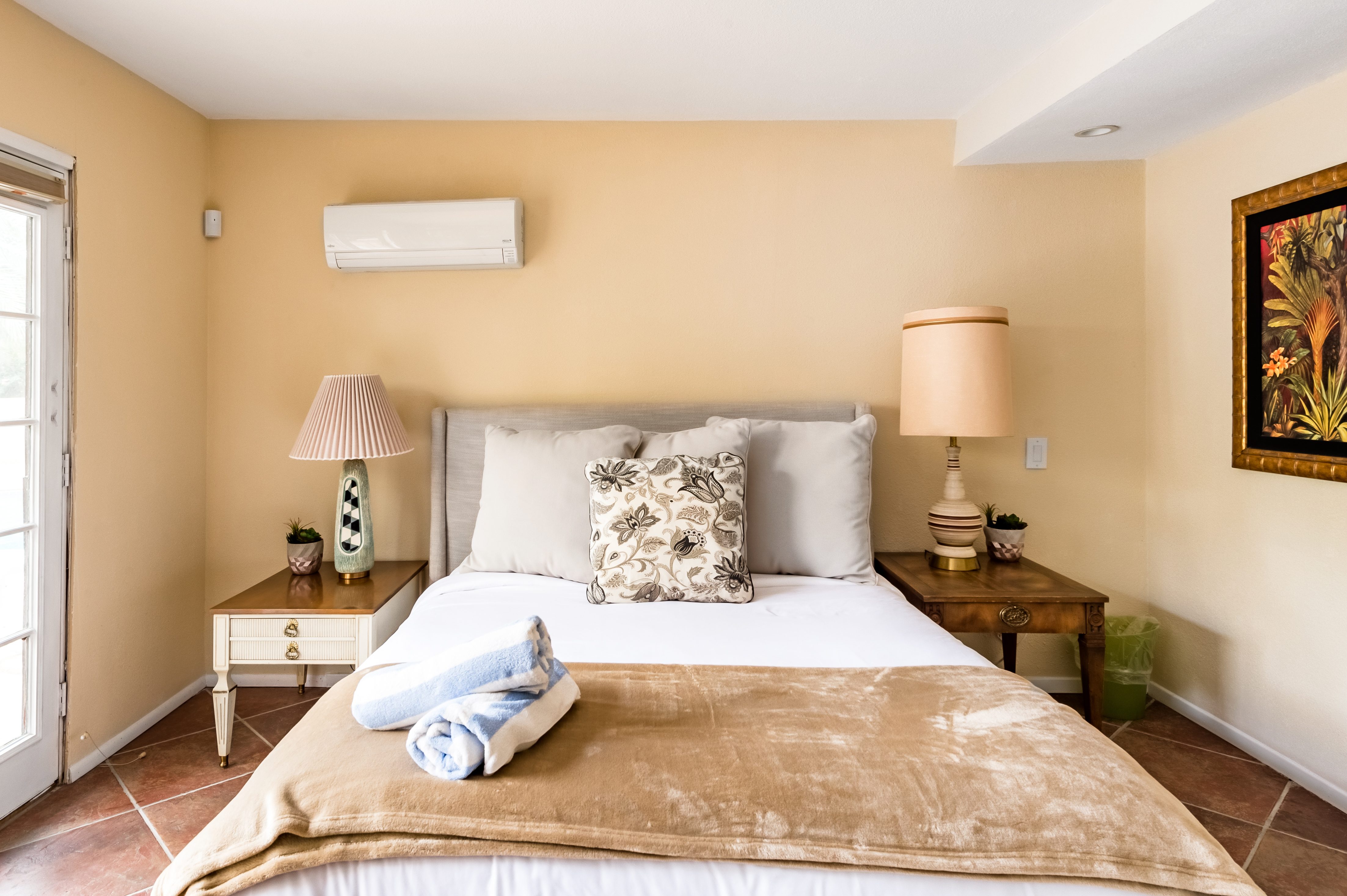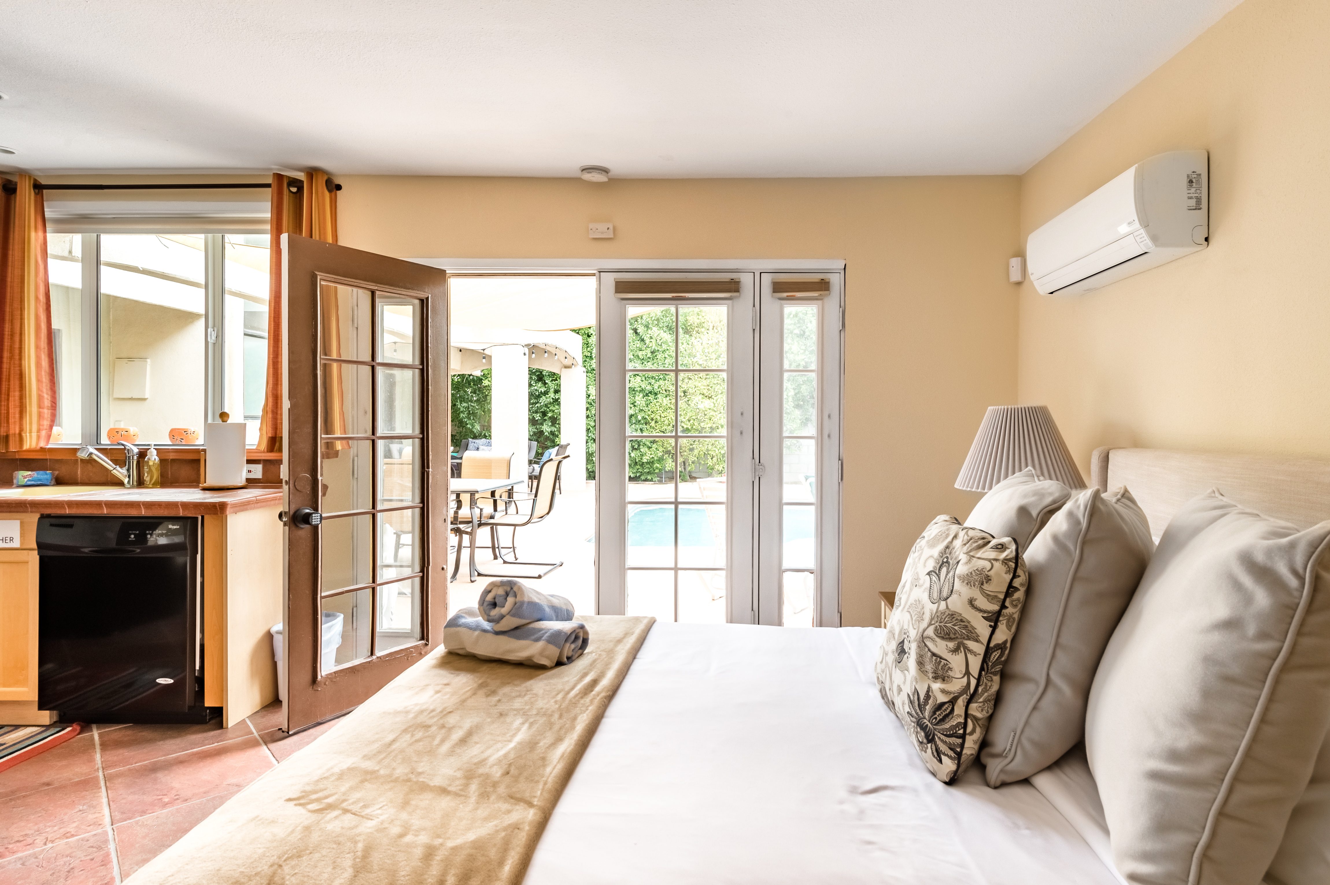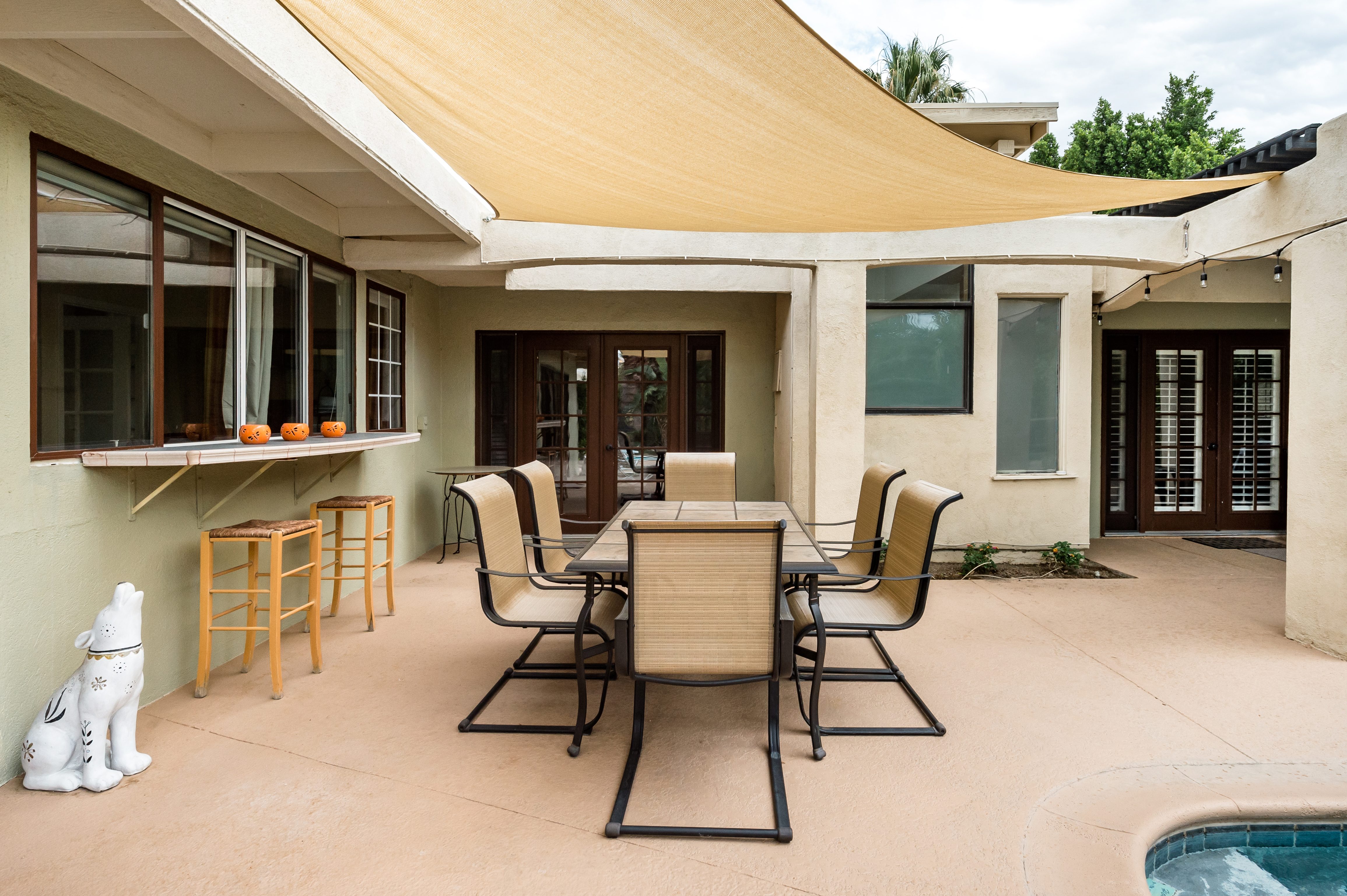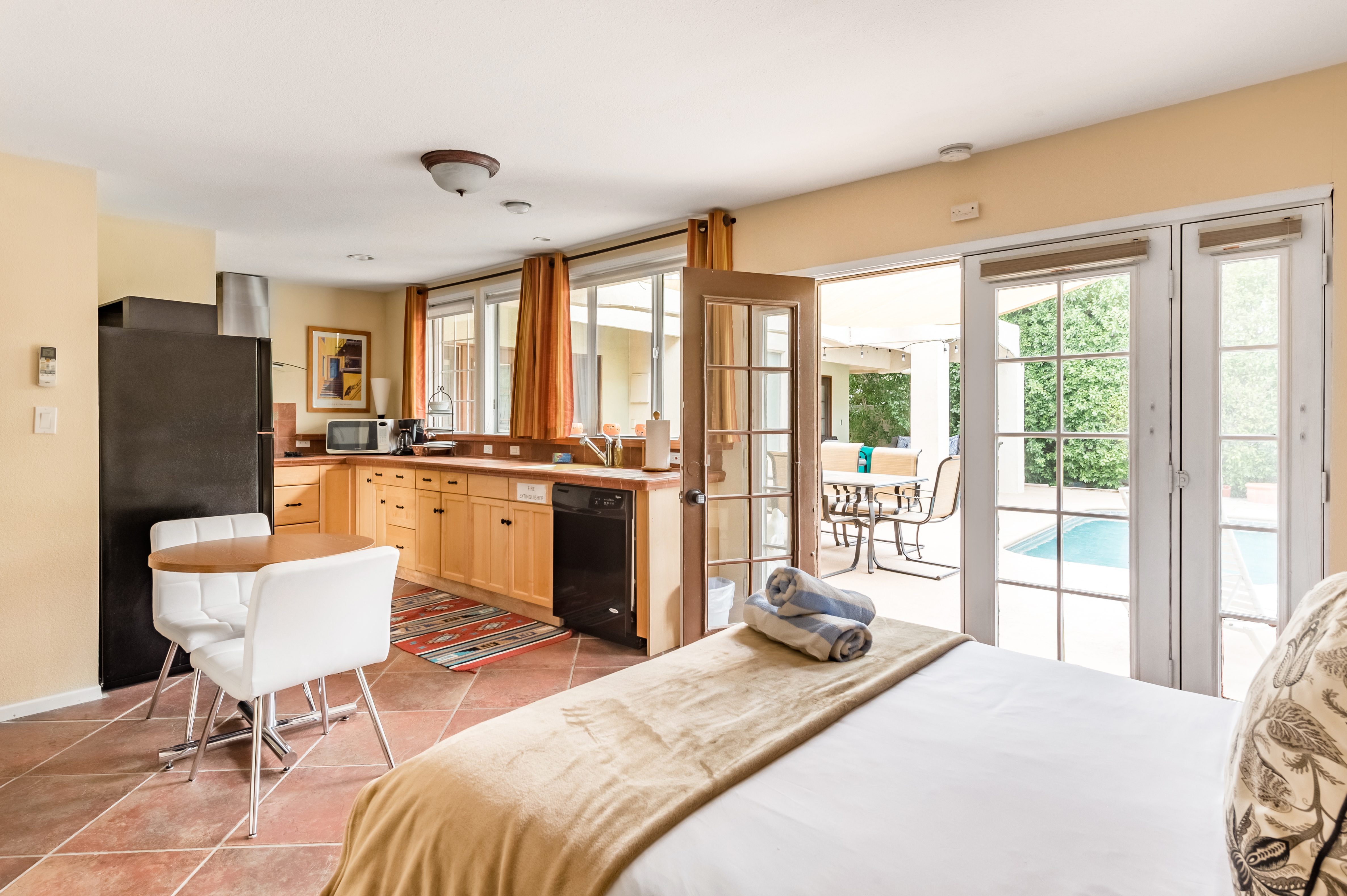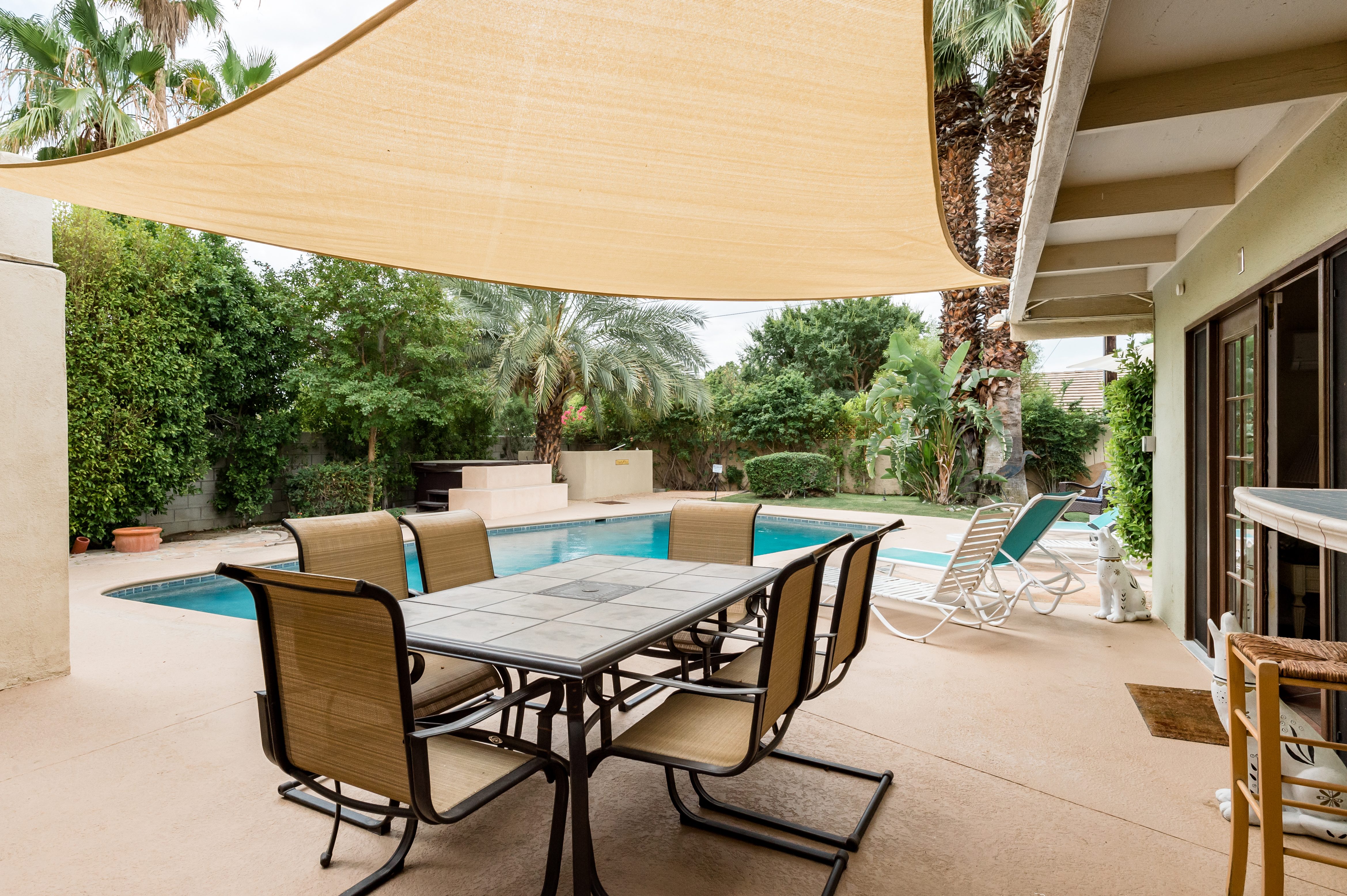 Go for a swim, then kick back under blue skies on a leafy patio offering mountain views. Warm furnishings and Hollywood-themed decor offer a vibrant tenor within this former TV star’s home. At sunset, grab a cold drink and gather by the fire pit. P.S. City ID #1173 Primary renter must be at least 25 years of age Celebrity Home near Ruth Hardy Park. 2 en suite bedrooms + en suite guest casita w/ additional poolside serving kitchen & bar. Private yard, heated pool, covered outdoor dining/ living areas, fire feature, mountain views. Walk to town. Fabulous pool home in walking distance to the world famous Palm Canyon Drive and just steps from Ruth Hardy Park. According to local lore, this was once the home of George Reeves, star of the 1950s Superman television series. So please, no Kryptonite. The owners have updated this midcentury garden house to create a fabulous Vacation Home where it’s all about relaxing in the sunshine. Gorgeous private pool yard with Spa and beautiful mountain views. Spacious open concept floor plan where all of the rooms open up to the outdoor patios, gardens and courtyards. Free WiFi, four flat screen televisions, and three en suite sleeping quarters including a guest casita with a serving kitchen and poolside bar. ABOUT THE INTERIOR LIVING SPACES There is a simple understated elegance about this home that creates a very relaxed, comfortable, easy living vibe. The open layout of the living spaces is perfect for spending time with your entire group. The great room, with its two-sided fireplace, features lots of seating for lounging, dining and binge watching your favorite TV shows. French doors open to the covered lanai to reveal the breathtaking pool yard, gardens and mountain views. The recently remodeled main kitchen with its natural gas stove, is perfect for individual or group meal prep. ABOUT THE SLEEPING QUARTERS All three of the sleeping quarters offer Queen-sized beds with hospitality-quality mattresses, en suite baths, flat screen televisions, ample storage and direct access to the outdoors. Inside the main home are two Queen Masters. The additional Queen guest casita features a poolside bar and service kitchen with a full-size refrigerator. This is Palm Springs living at its best - where we blur the lines between indoor and outdoor living - taking full advantage of the weather, sunshine and spectacular mountain views. ABOUT THE POOL YARD As gorgeous as the interior spaces of this home are - it is the outdoor spaces that are the crowning glory. The entire back yard has been walled and landscaped for complete privacy. Poolside chaise lounges, outdoor dining and hanging spaces, a fire pit, shade umbrellas - this vacation home has it all - perfect for relaxing in the sun or escaping to the shaded areas. At night, beautiful twinkling lights and landscape illumination compliment the desert’s starry skies to give this place a completely magical feel - like your own private Palm Springs resort. ABOUT THE LOCATION Tucked away on a quiet residential street in the Movie Colony East neighborhood, this property is just one block from Ruth Hardy Park, and less than a mile from the world famous Palm Canyon Drive. You’ll be in walking distance to the Palm Springs Uptown Design District with its fine dining restaurants, sidewalk cafes, specialty boutiques, art galleries and midcentury modern furniture showrooms. The casino, convention center and night spots like Tropical and The Copa are just a short stroll away. Neighborhood conveniences like grocery stores, sandwich shops, burger joints and other casual eateries are all very close by. The home is located in Palm Spring’s Movie Colony neighborhood, an area once home to many Hollywood golden-agers. The nearby Ruth Hardy Park offers lush paths and tennis courts. Downtown’s boutiques, museums, restaurants, and bars are minutes away. Certain dog breeds under 65 lbs are allowed at this home, the dog fee is $195 (2 dogs maximum).Amenities
