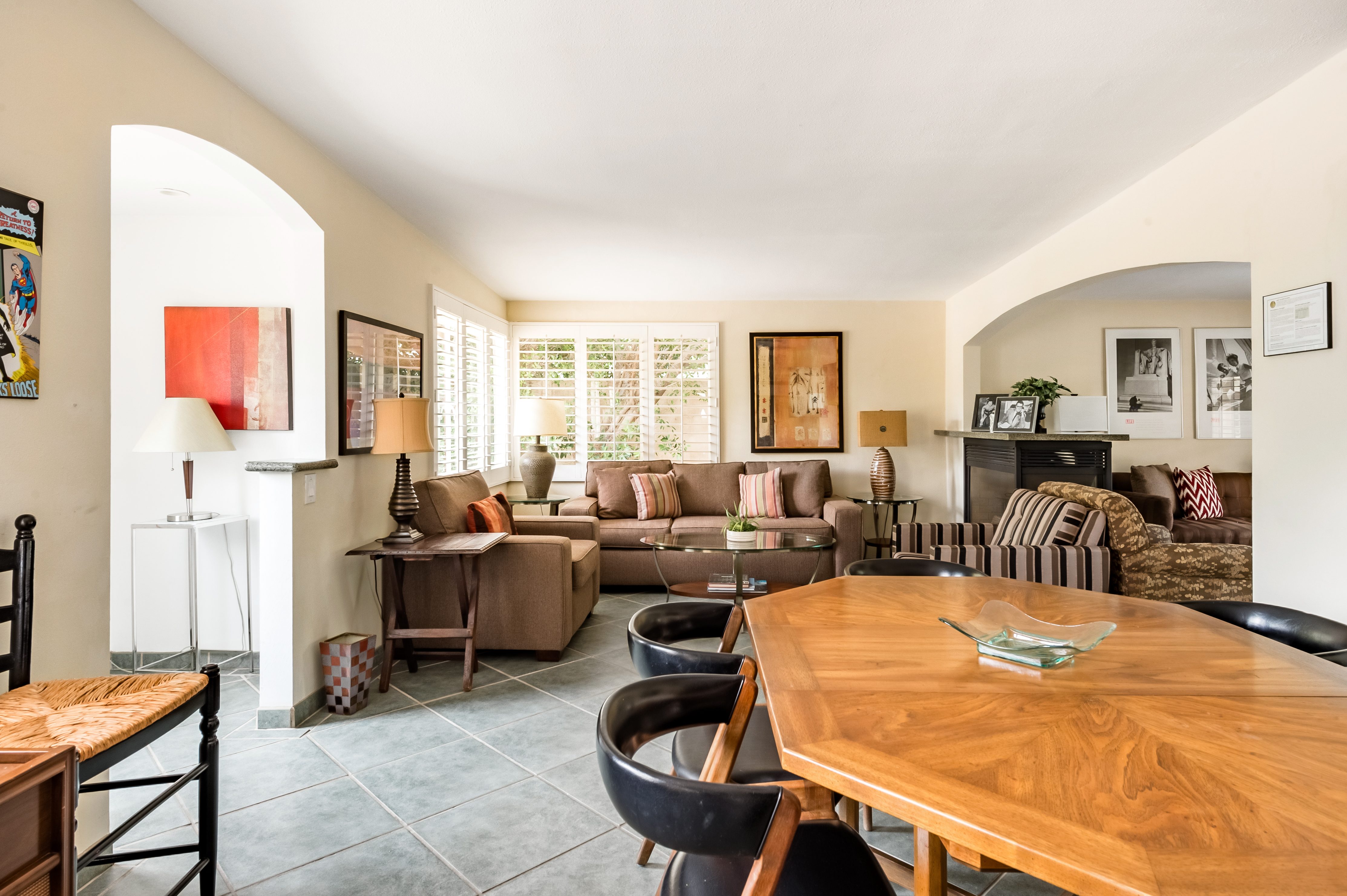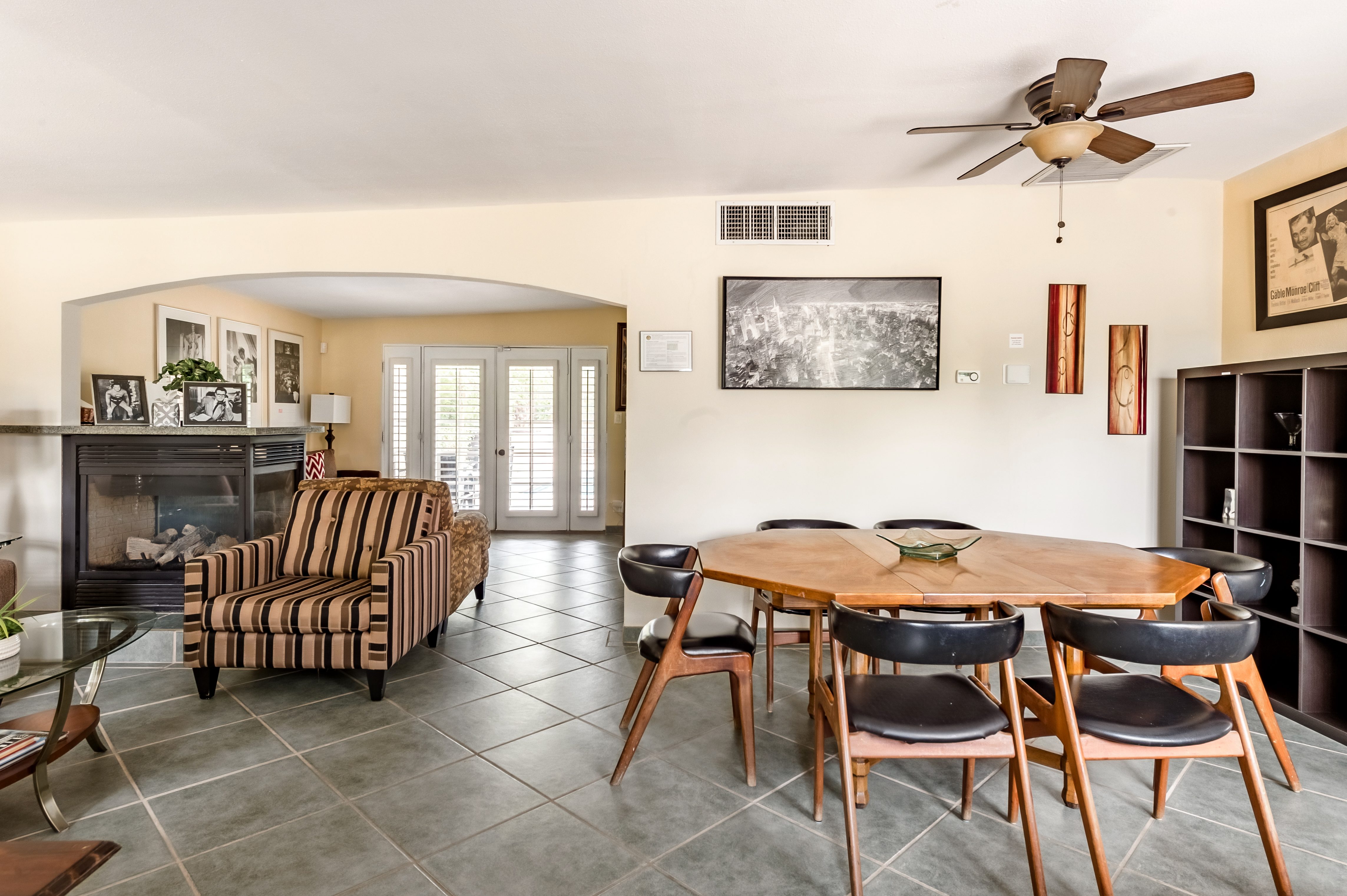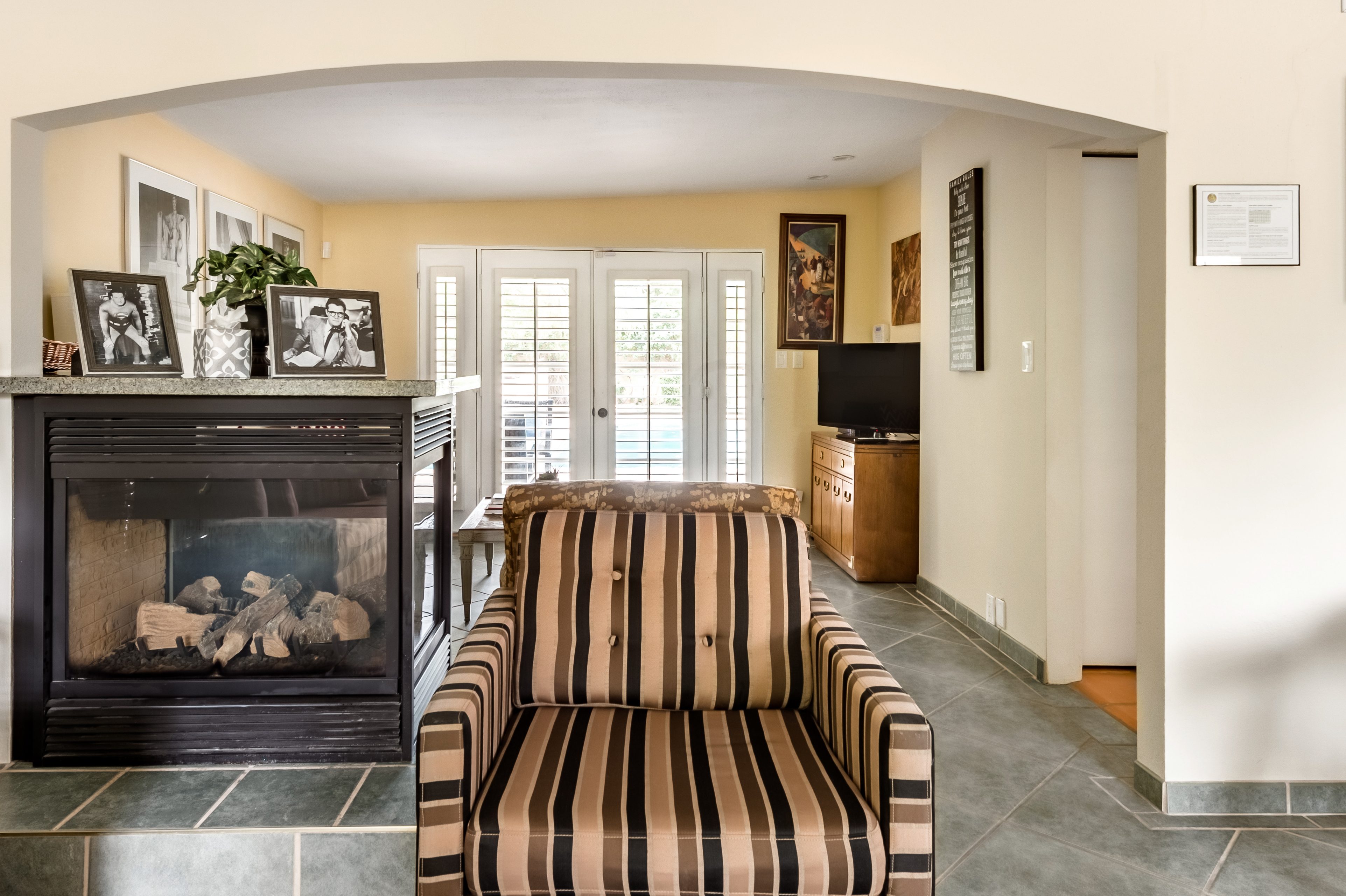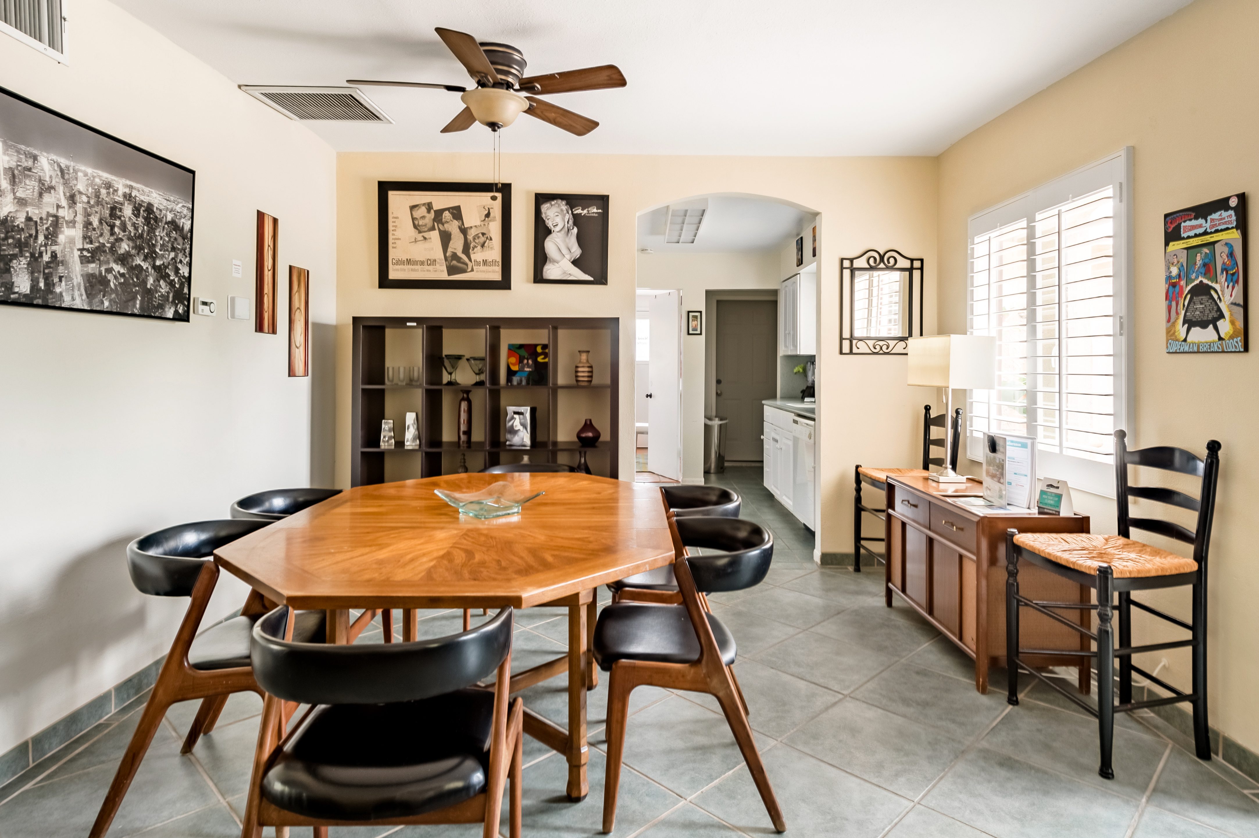 Go for a swim, then kick back under blue skies on a leafy patio offering mountain views. Warm furnishings and Hollywood-themed decor offer a vibrant tenor within this former TV star’s home. At sunset, grab a cold drink and gather by the fire pit. P.S. City ID #1173 Primary renter must be at least 25 years of age Celebrity Home near Ruth Hardy Park. 2 en suite bedrooms + en suite guest casita w/ additional poolside serving kitchen & bar. Private yard, heated pool, covered outdoor dining/ living areas, fire feature, mountain views. Walk to town. Fabulous pool home in walking distance to the world famous Palm Canyon Drive and just steps from Ruth Hardy Park. According to local lore, this was once the home of George Reeves, star of the 1950s Superman television series. So please, no Kryptonite. The owners have updated this midcentury garden house to create a fabulous Vacation Home where it’s all about relaxing in the sunshine. Gorgeous private pool yard with Spa and beautiful mountain views. Spacious open concept floor plan where all of the rooms open up to the outdoor patios, gardens and courtyards. Free WiFi, four flat screen televisions, and three en suite sleeping quarters including a guest casita with a serving kitchen and poolside bar. ABOUT THE INTERIOR LIVING SPACES There is a simple understated elegance about this home that creates a very relaxed, comfortable, easy living vibe. The open layout of the living spaces is perfect for spending time with your entire group. The great room, with its two-sided fireplace, features lots of seating for lounging, dining and binge watching your favorite TV shows. French doors open to the covered lanai to reveal the breathtaking pool yard, gardens and mountain views. The recently remodeled main kitchen with its natural gas stove, is perfect for individual or group meal prep. ABOUT THE SLEEPING QUARTERS All three of the sleeping quarters offer Queen-sized beds with hospitality-quality mattresses, en suite baths, flat screen televisions, ample storage and direct access to the outdoors. Inside the main home are two Queen Masters. The additional Queen guest casita features a poolside bar and service kitchen with a full-size refrigerator. This is Palm Springs living at its best - where we blur the lines between indoor and outdoor living - taking full advantage of the weather, sunshine and spectacular mountain views. ABOUT THE POOL YARD As gorgeous as the interior spaces of this home are - it is the outdoor spaces that are the crowning glory. The entire back yard has been walled and landscaped for complete privacy. Poolside chaise lounges, outdoor dining and hanging spaces, a fire pit, shade umbrellas - this vacation home has it all - perfect for relaxing in the sun or escaping to the shaded areas. At night, beautiful twinkling lights and landscape illumination compliment the desert’s starry skies to give this place a completely magical feel - like your own private Palm Springs resort. ABOUT THE LOCATION Tucked away on a quiet residential street in the Movie Colony East neighborhood, this property is just one block from Ruth Hardy Park, and less than a mile from the world famous Palm Canyon Drive. You’ll be in walking distance to the Palm Springs Uptown Design District with its fine dining restaurants, sidewalk cafes, specialty boutiques, art galleries and midcentury modern furniture showrooms. The casino, convention center and night spots like Tropical and The Copa are just a short stroll away. Neighborhood conveniences like grocery stores, sandwich shops, burger joints and other casual eateries are all very close by. The home is located in Palm Spring’s Movie Colony neighborhood, an area once home to many Hollywood golden-agers. The nearby Ruth Hardy Park offers lush paths and tennis courts. Downtown’s boutiques, museums, restaurants, and bars are minutes away. Certain dog breeds under 65 lbs are allowed at this home, the dog fee is $195 (2 dogs maximum).Amenities