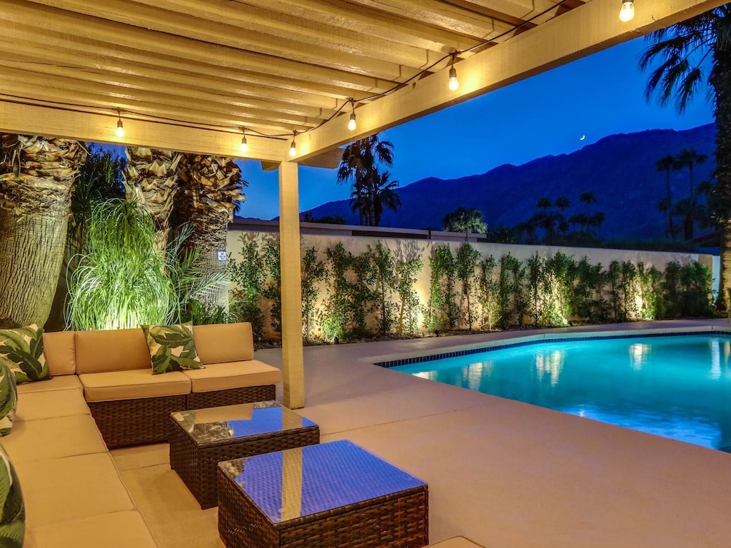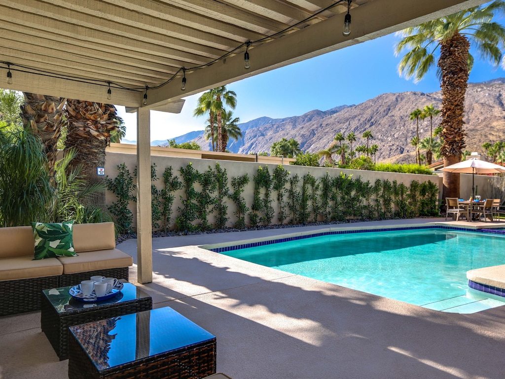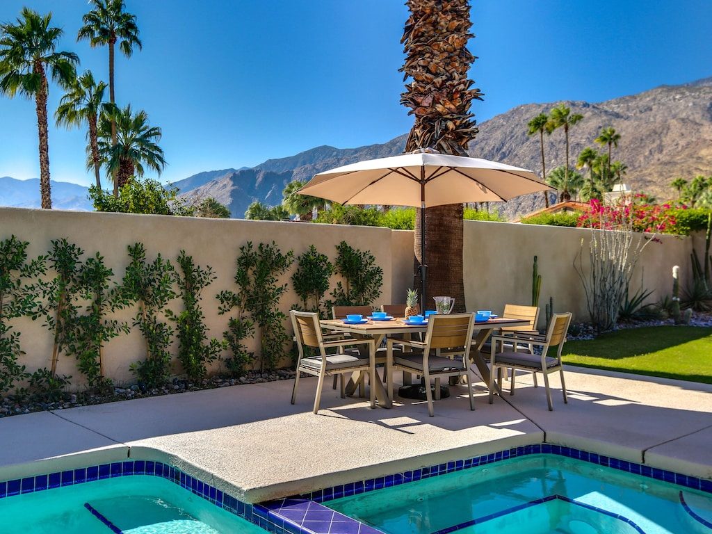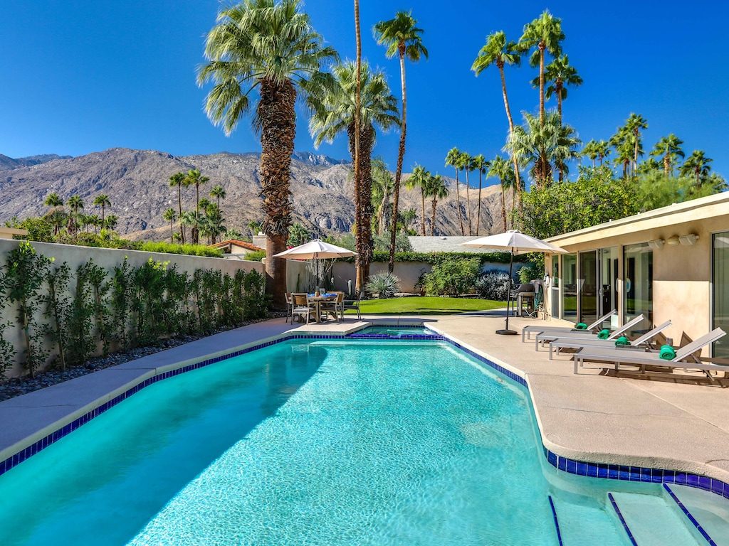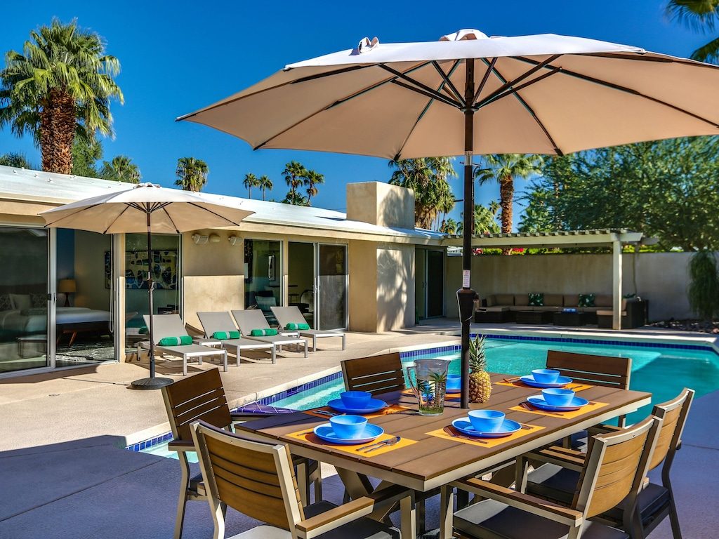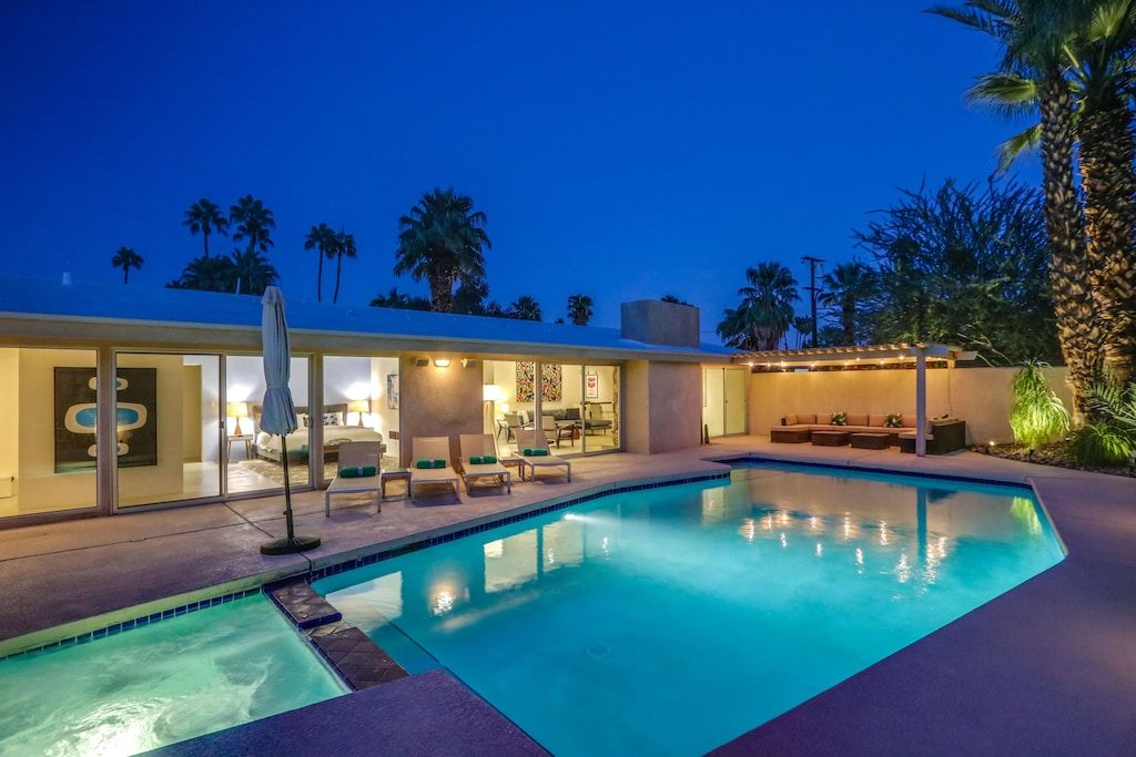 P.S. City ID #4094 **Primary renter must be at least 25 years of age** A thoughtfully remodeled mid-mod, Movie Colony Palms features a resort-style pool yard. Walled & gated, enjoy a large heated pool, integrated spa, fire feature, sun loungers, covered seating & alfresco dining areas. Sliding glass doors on two sides of a stone fireplace blur lines between outside & in. Stylish furnishings offer a colorful, comfortable open space to enjoy the company of your friends & family. Chef’s kitchen features granite counters, SS & Vulcan 6-burner stove. 3 bedrooms offer King beds & Smart TVs.Amenities