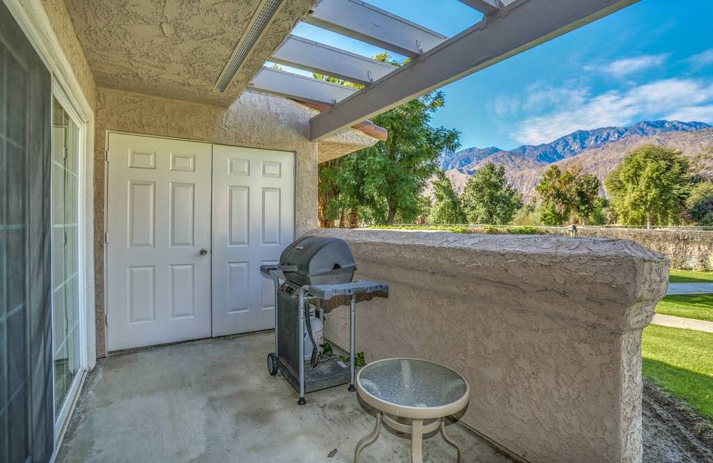 Enjoy private patio access from your living room with a gas barbecue grill and an outdoor dining table with incredible views of the mountains and golf course.
