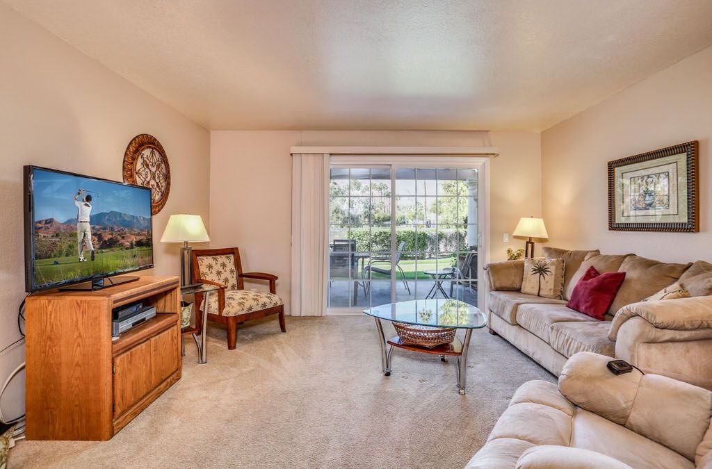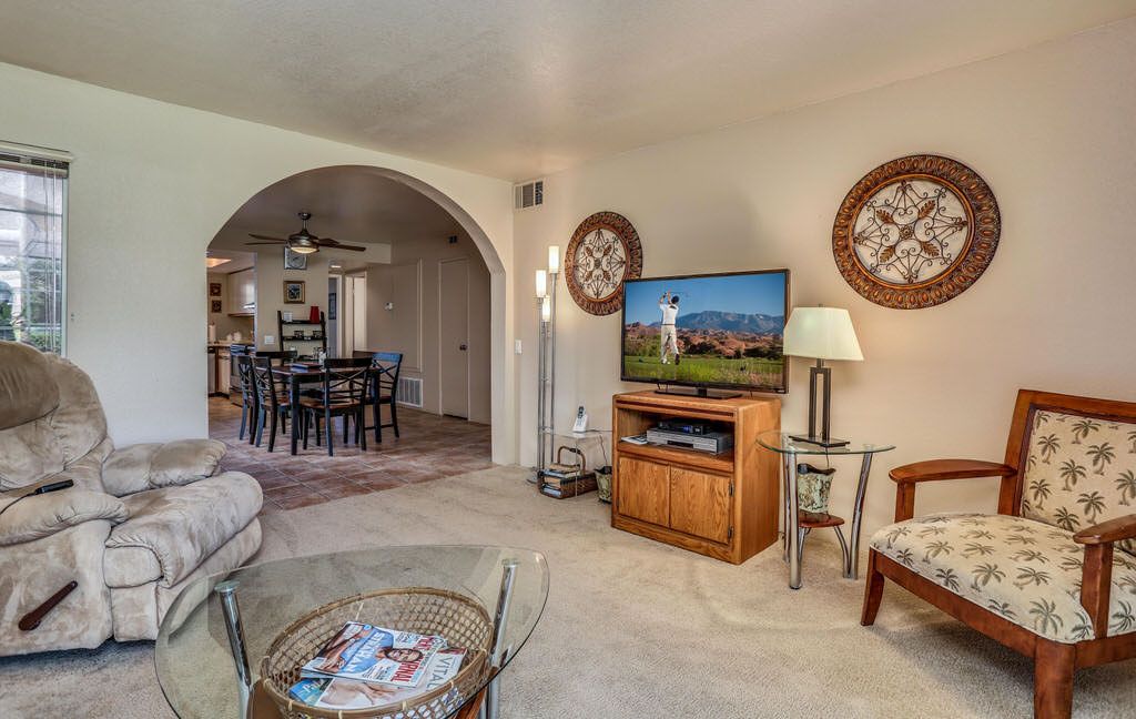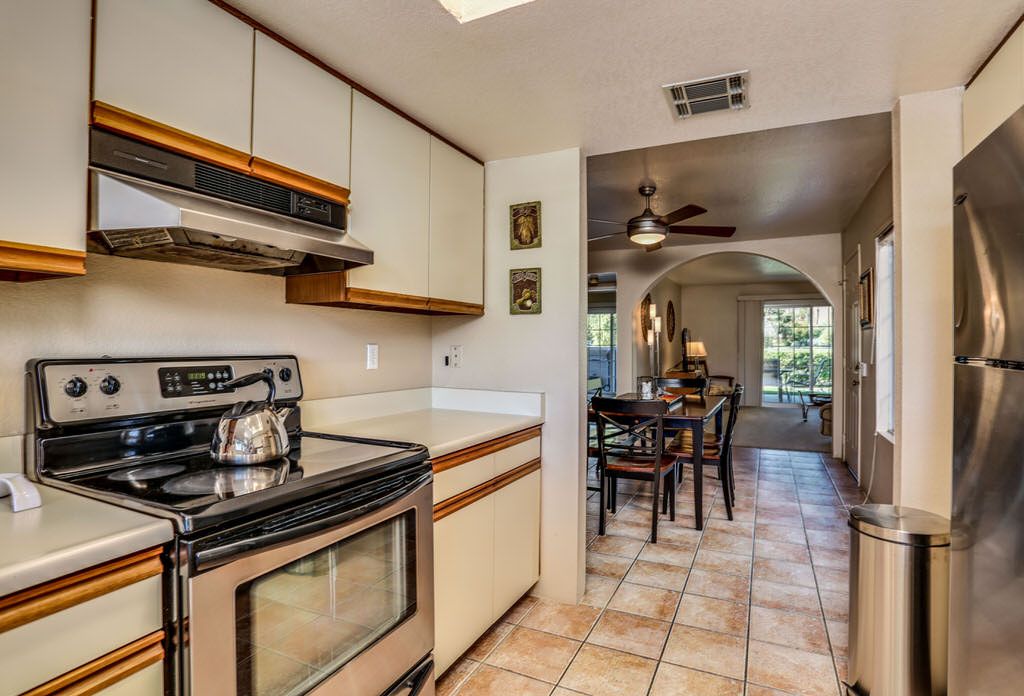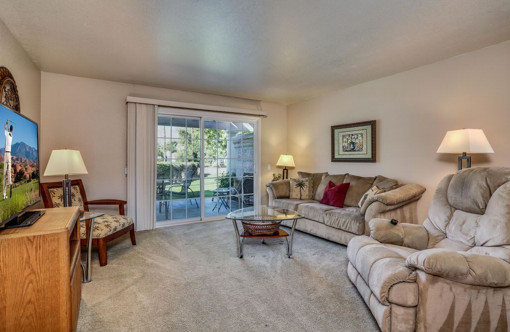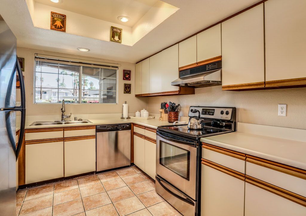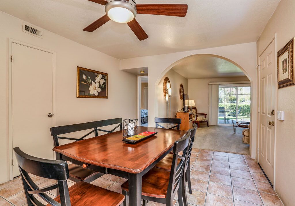 The interior is Palm Springs inspired with comfortable furnishings, lots of natural light and soothing earth tones. This Palm Springs condo for rent is bright and open with a separate dining area and a spacious kitchen for enjoying quality time with friends and family.