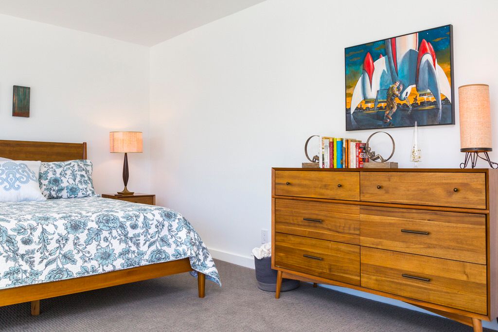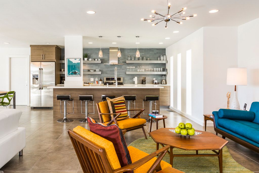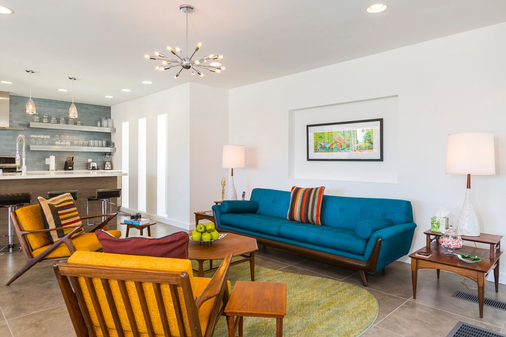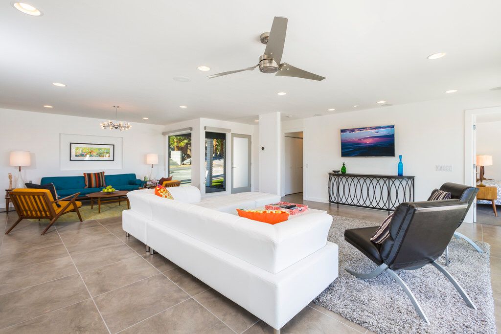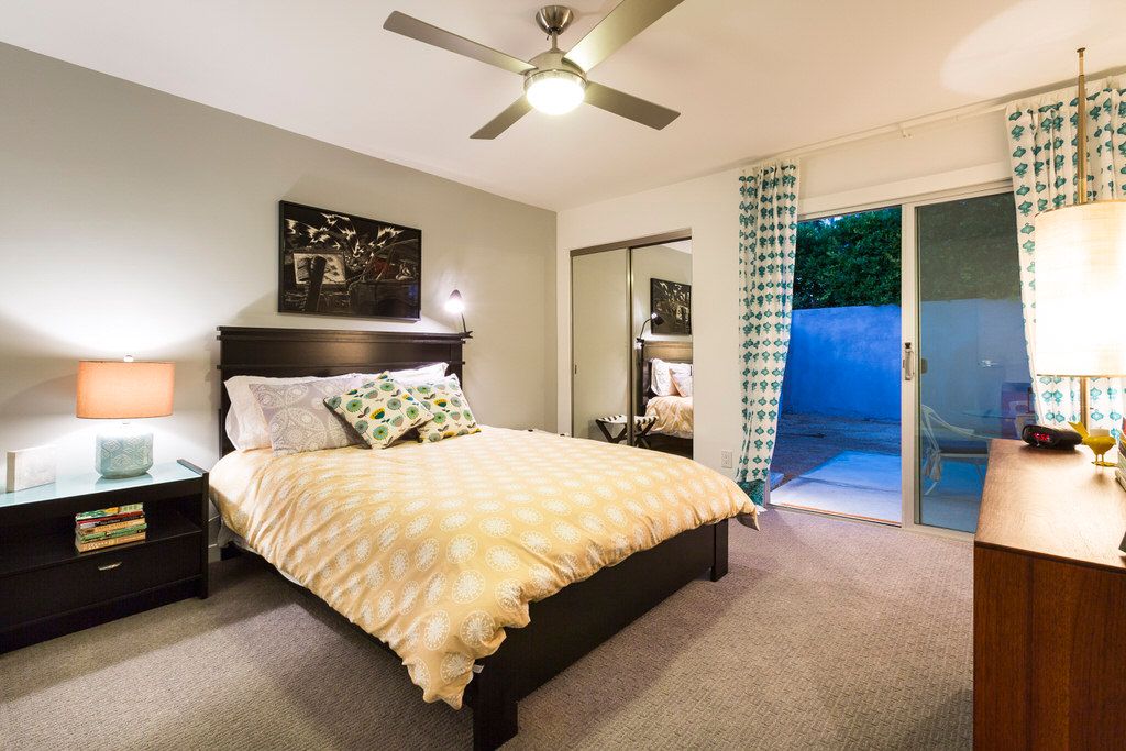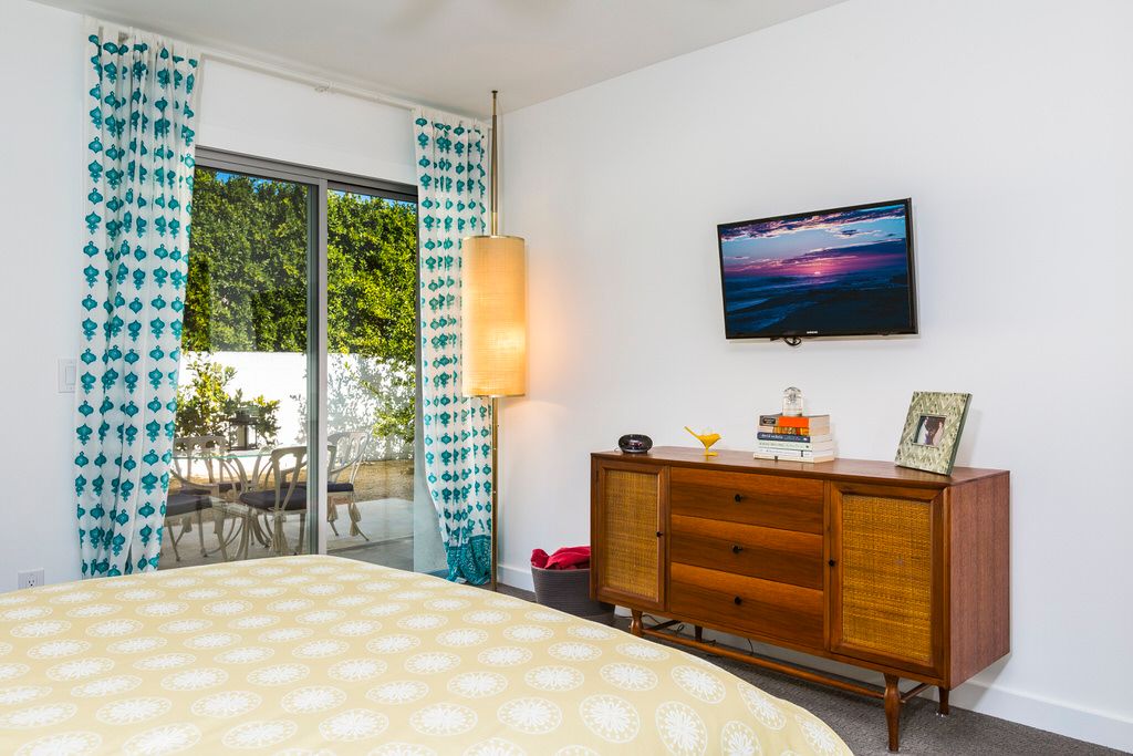 For your enjoyment a great room living area, an open gourmet kitchen, kitchen/dining table that seats 8 and an office nook. If you bring along your computer, you can enjoy this home's high speed wireless Internet access. The midcentury furnishings are offset by sparkling high gloss porcelain tile floors in the main living areas.