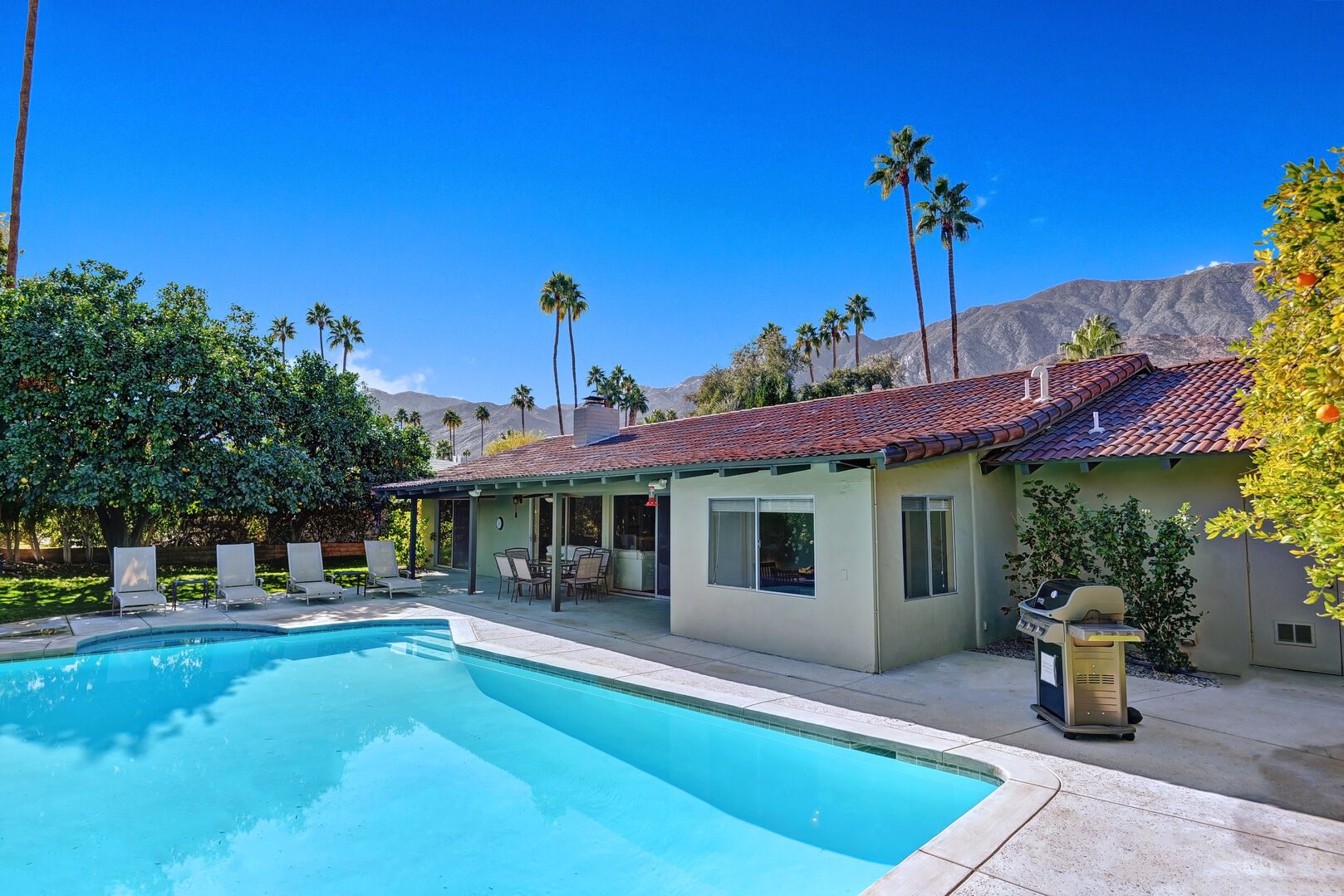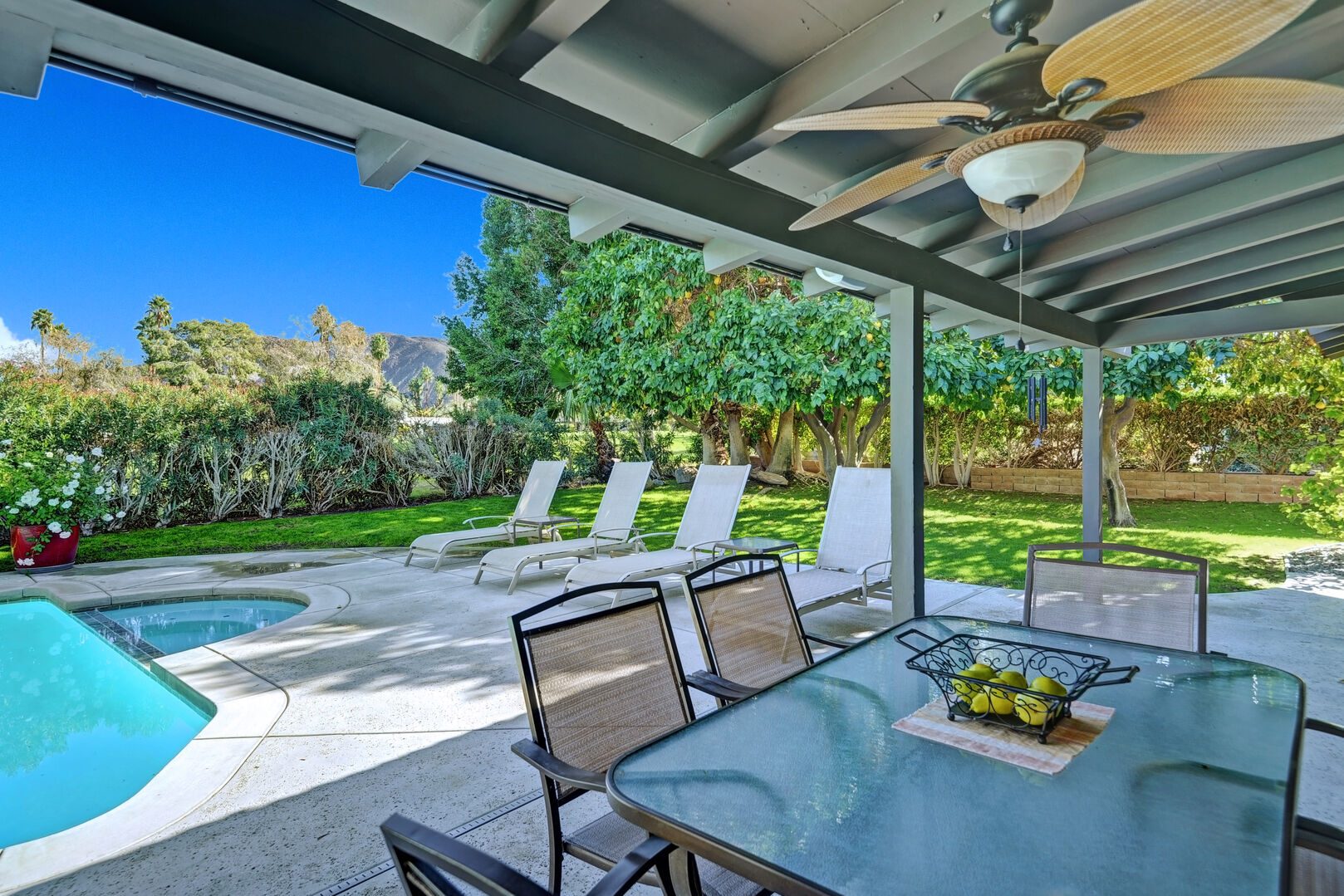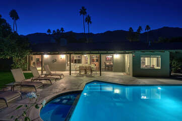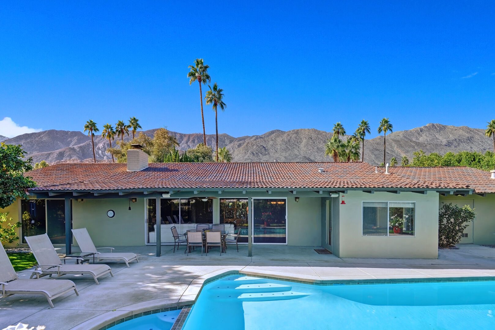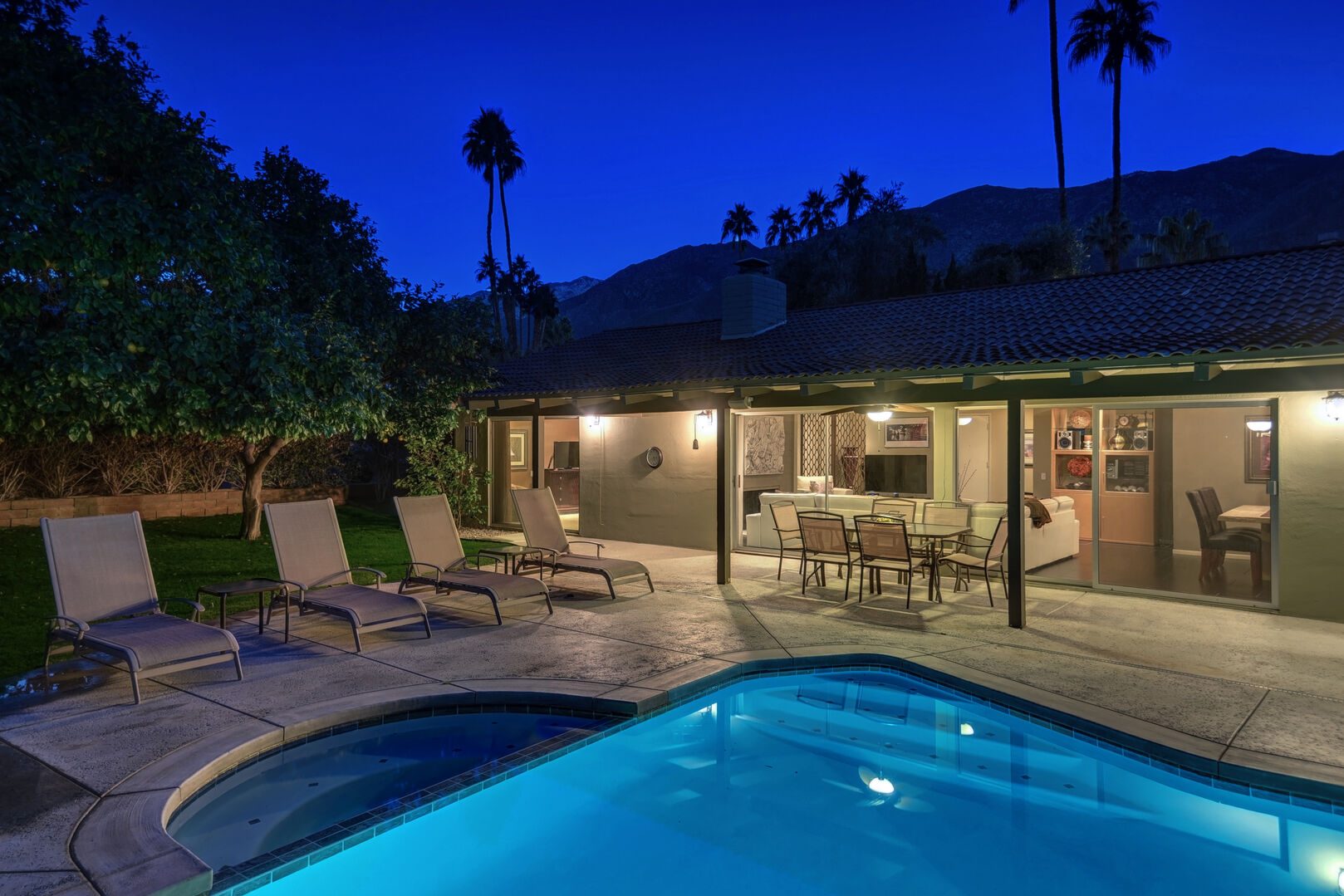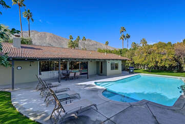 Located on the lush Indian Canyons Golf Resort's North Course, in the desirable Indian Canyons Neighborhood of South Palm Springs, this gorgeous 3 bedroom and 2 bath home is your dream vacation destination. The beautiful galley kitchen with its modern amenities will thrill the chef in you. Enjoy meals in the spacious dining area/family room, with its floor to ceiling windows offering brilliant light, or a casual bite in the sun-drenched breakfast nook.Relax poolside with its opulent views of the plush greenbelt, if that is what you're in the mood for. Whichever you choose, cap your evening off with a glass of vino in the soothing and secluded spa, or a romantic soak in the over sized tub. After you awake to the glorious mountain views, hop on the complimentary bicycles provided. Check out the neighborhood by visiting the hip coffeehouse -- Koffi, the legendary Ace Hotel or the upscale Mr. Lyons Steakhouse of Palm Springs. Spectacular mountain views, palm trees, citrus trees and this lovely and private home await your arrival!