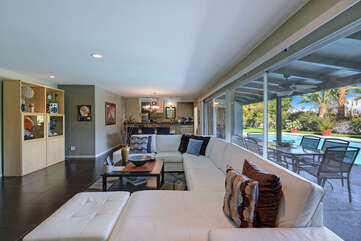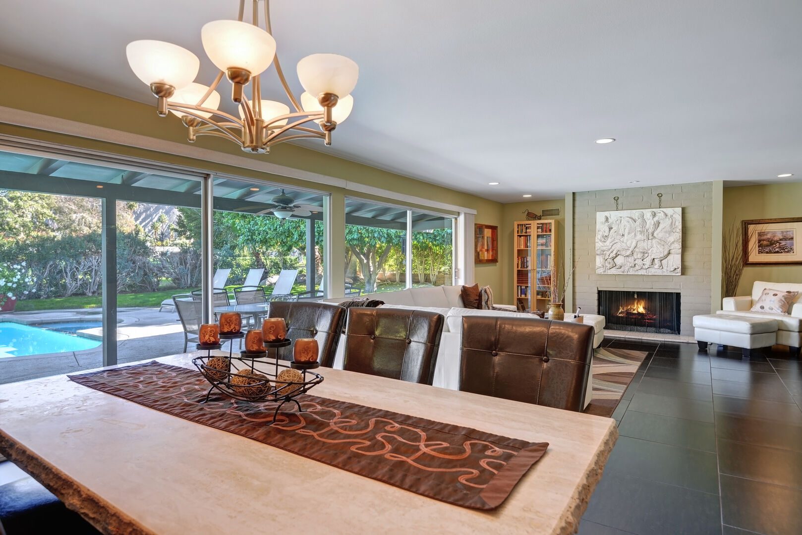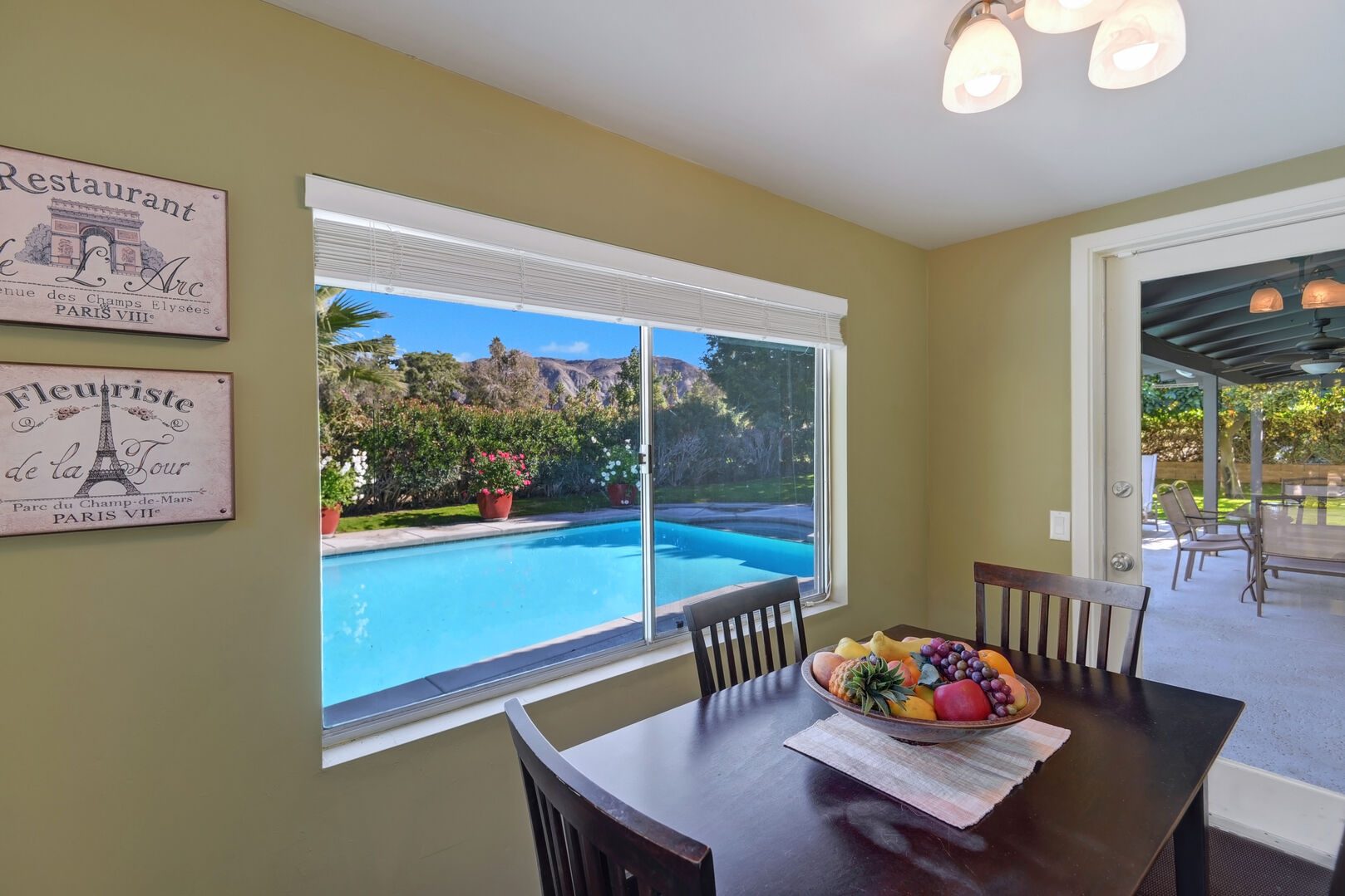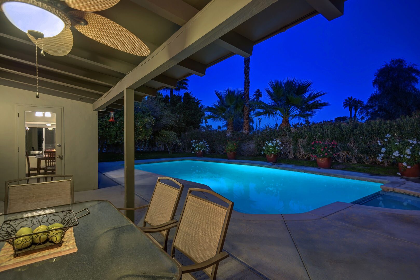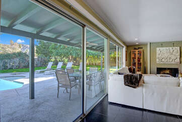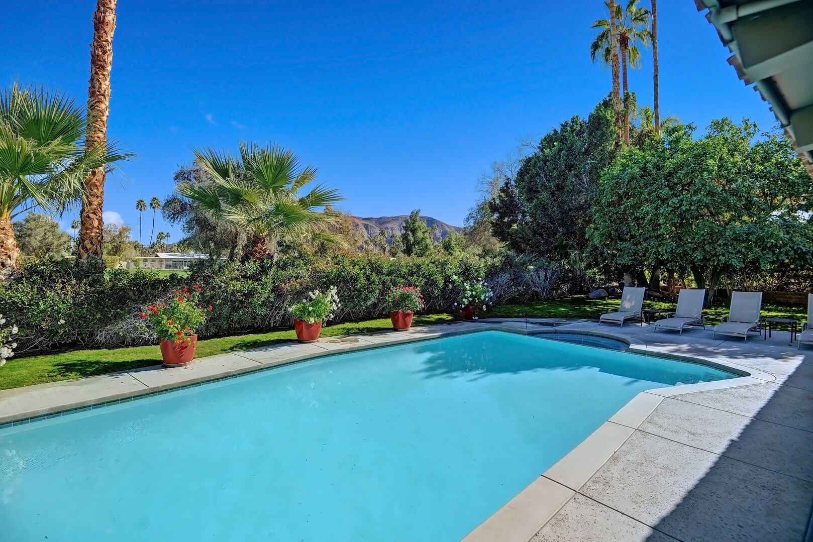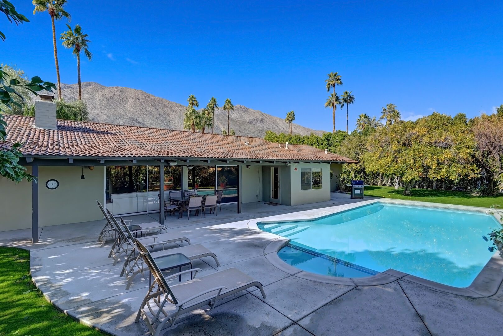 Located on the lush Indian Canyons Golf Resort's North Course, in the desirable Indian Canyons Neighborhood of South Palm Springs, this gorgeous 3 bedroom and 2 bath home is your dream vacation destination. The beautiful galley kitchen with its modern amenities will thrill the chef in you. Enjoy meals in the spacious dining area/family room, with its floor to ceiling windows offering brilliant light, or a casual bite in the sun-drenched breakfast nook.Relax poolside with its opulent views of the plush greenbelt, if that is what you're in the mood for. Whichever you choose, cap your evening off with a glass of vino in the soothing and secluded spa, or a romantic soak in the over sized tub. After you awake to the glorious mountain views, hop on the complimentary bicycles provided. Check out the neighborhood by visiting the hip coffeehouse -- Koffi, the legendary Ace Hotel or the upscale Mr. Lyons Steakhouse of Palm Springs. Spectacular mountain views, palm trees, citrus trees and this lovely and private home await your arrival!