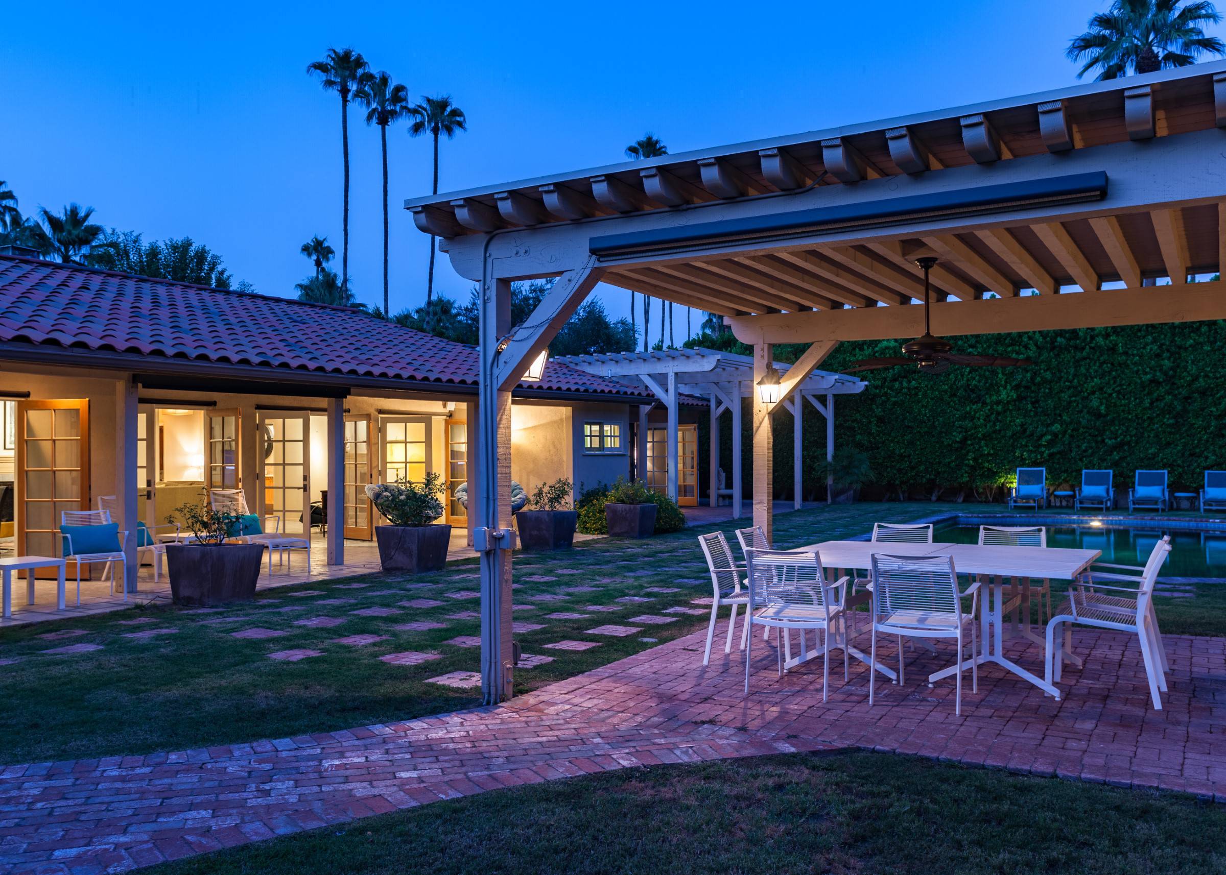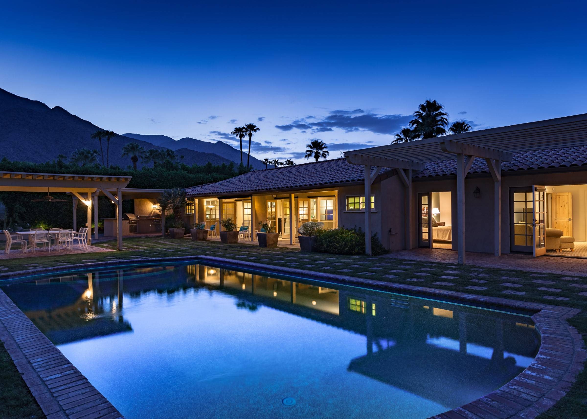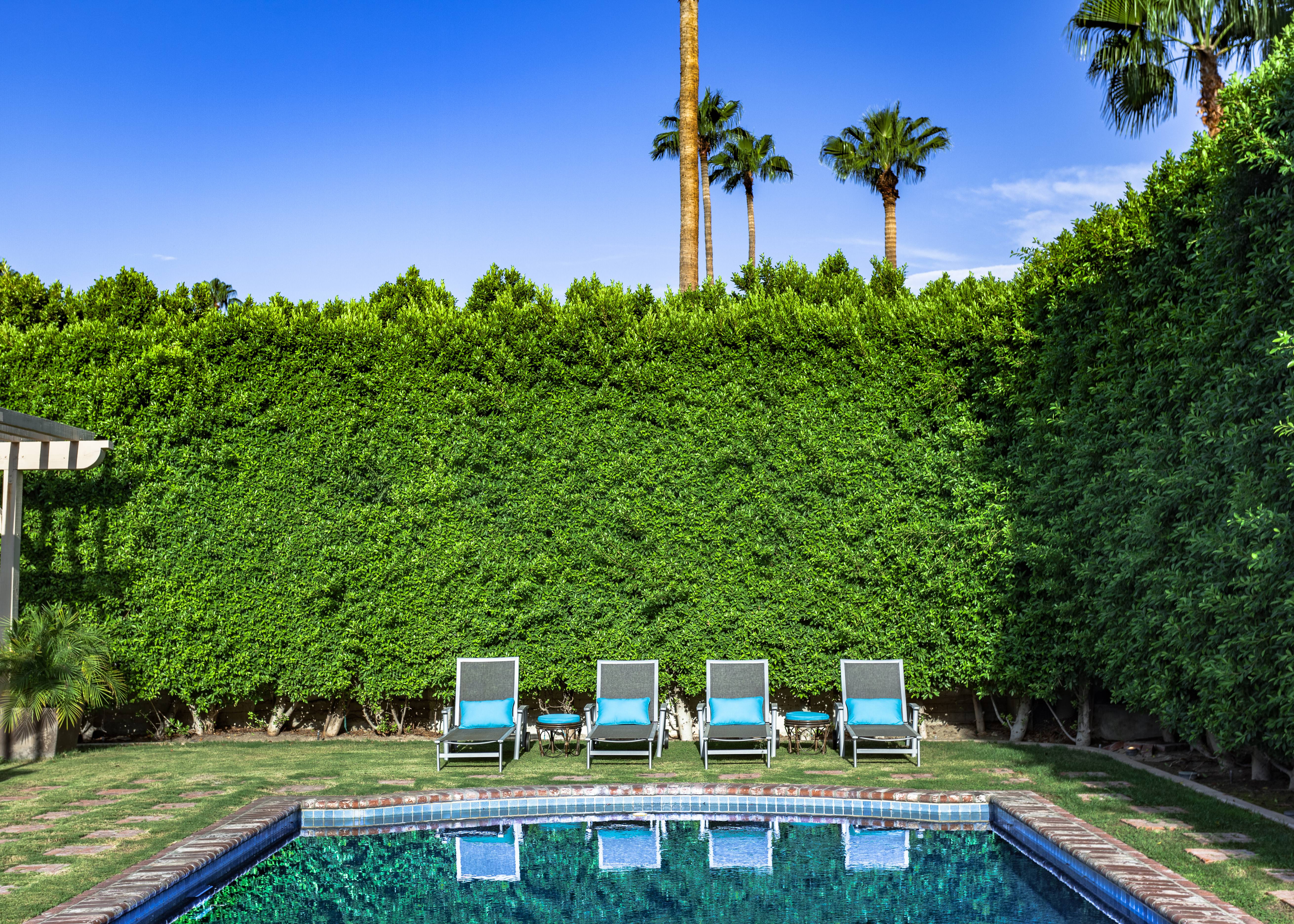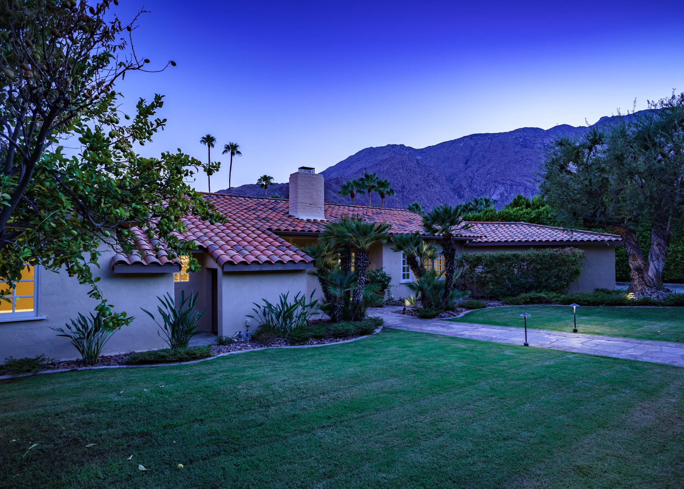 Former Sol Lesser Estate. European-style Villa in Old Las Palmas. Private resort-style yard w pool, fire feature, outdoor kitchen, covered dining pavilion. Mountain views. Walk to town. Beds: K, K, K, Q P.S. City ID #3073 Primary renter must be at least 25 years of age Completely private, fully walled & gated European-style Villa in Old Las Palmas. Walk to town. 4 Br / 3.5 Bath / Sleeps 8. Private resort-style yard w pool, fire feature, outdoor kitchen, covered dining pavilion. Mountain views. Beds: K, K, K, Q Grand Palm Springs Vacation Home Rental - just a short stroll from the world-famous Palm Canyon Drive as it runs through the Uptown Design District. Spend your vacation in this very private poolside paradise that was once the estate of Sol Lesser - the Academy Award-winning legend who produced Oliver Twist, Peck’s Bad Boy and the series of Tarzan films made popular in the 1940s and ‘50s. Nearly 3,000 square feet of old world glamour - this stately property captures the sophisticated Palm Springs vibe of yesteryear. The Sol Lesser Estate is both glamorously nostalgic and very “next century.†The architectural pedigree (Paul R. Williams) was lovingly preserved when the property was completely remodeled. New kitchen and baths, high speed internet access, five flat screen televisions and an updated climate control system. The owners have combined classic architecture, old world style and modern-day comfort to create a spectacular luxury vacation home in true Palm Springs-style. THE LIVING SPACES Built as a celebrity desert escape, this home has a luxurious open floor plan that blurs the lines between indoor and outdoor living. The great room provides an impressive yet welcoming space to spend time with your entire group. You’ll find inside dining for 8 to 10, a fireside lounging area with plenty of seating and a flat screen television. The kitchen and breakfast room has been completely remodeled with beautiful granite countertops and stainless steel appliances - including a six burner gas stove. All along the back of the house are French doors that reveal a romantic pool & yard that looks as though it were ripped from the pages of Better Homes and Gardens. THE SLEEPING QUARTERS Like an upscale boutique hotel, all of the bedrooms feature hospitality-quality mattresses, flat screen televisions and ample storage. There are three masters (two king, one queen) that each have ensuite baths. The additional king guest room has easy access to the fourth full bath. THE OUTDOOR SPACES The entire estate is completely enclosed for privacy. Once inside the gates, you will feel as though you have wandered into an episode of Lifestyles of the Rich and Famous. The front garden features a rolling lawn, stone paths and mature fruit trees. The equally private backyard is very Palm Springs-chic with a grand pebble-tec surfaced saltwater pool, a fabulous outdoor kitchen, and a covered dining pavilion with gas-fueled heater. Lounge poolside in the full sun, or beneath the shaded lanai. Enjoy sun sets over the stunning mountain view, followed by long nights gathered around the firepit with your travel companions. A PART OF PALM SPRINGS HISTORY This private compound was built in 1946 from plans by architect Paul R. Williams - known for designing Tudor revivals and Villas in the French Chateau and Regency styles for clients Frank Sinatra, Lucille Ball, Julie London and Tyrone Power. He began working in Palm Springs when weekend and seasonal getaways were all the rage for the celebrities who flocked here to relax under the radar. Today, Leonardo DiCaprio owns property in the neighborhood as do some of the biggest stars of daytime television like Bobbie Eakes (All My Children, Bold & The Beautiful) and Tristan Rogers (Young and the Restless, General Hospital). ABOUT THE LOCATION Old Las Palmas is just a quarter mile stroll from the Uptown Design District Certain dog breeds under 65 lbs are allowed at this home, the dog fee is $195 (2 dogs maximum).Amenities