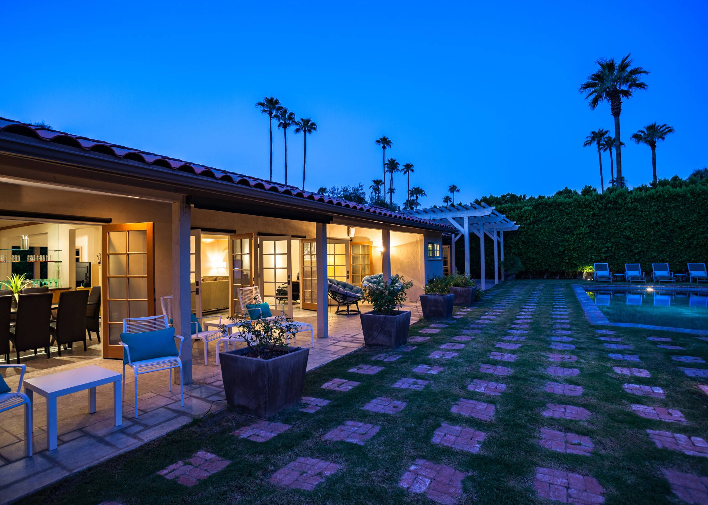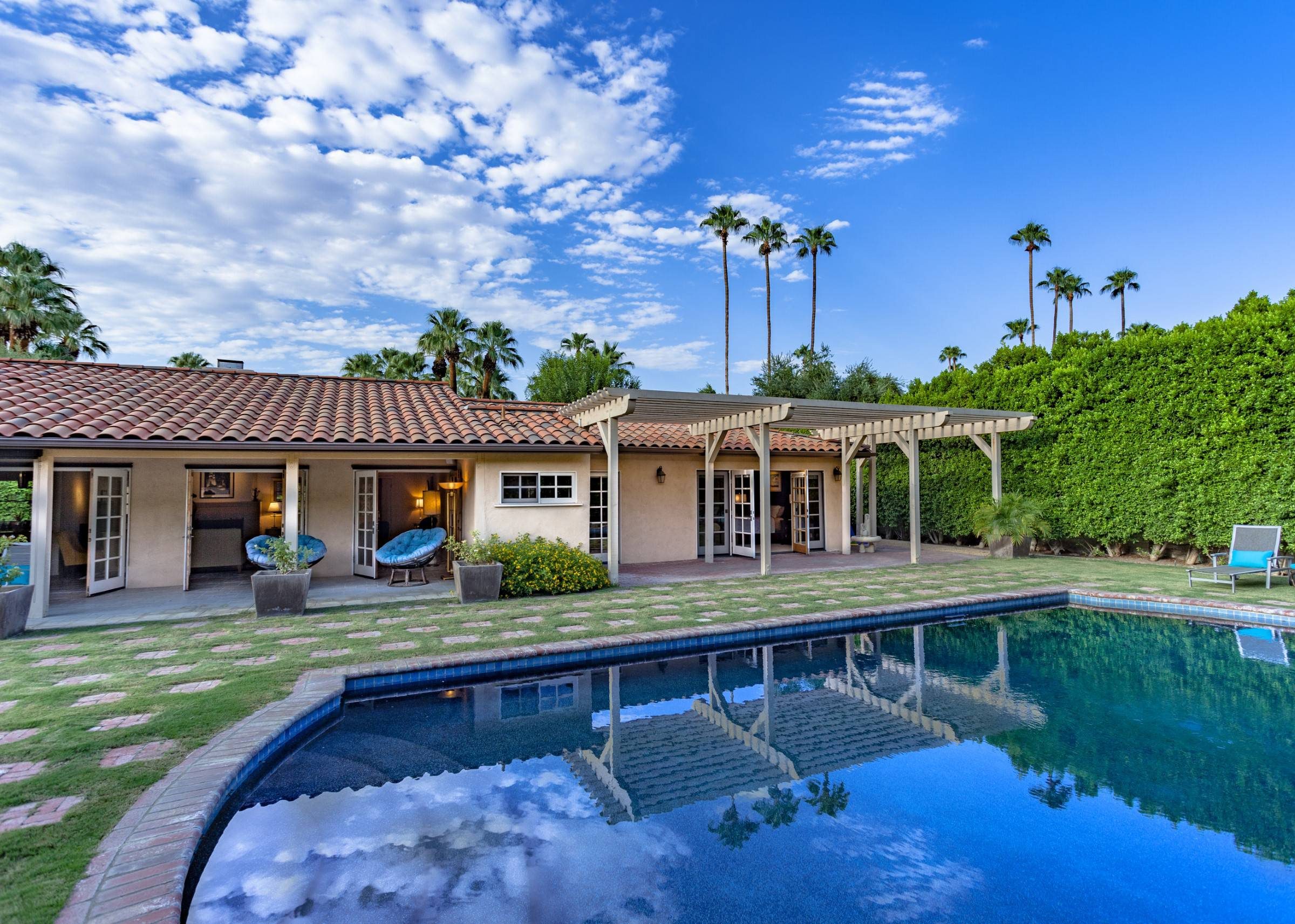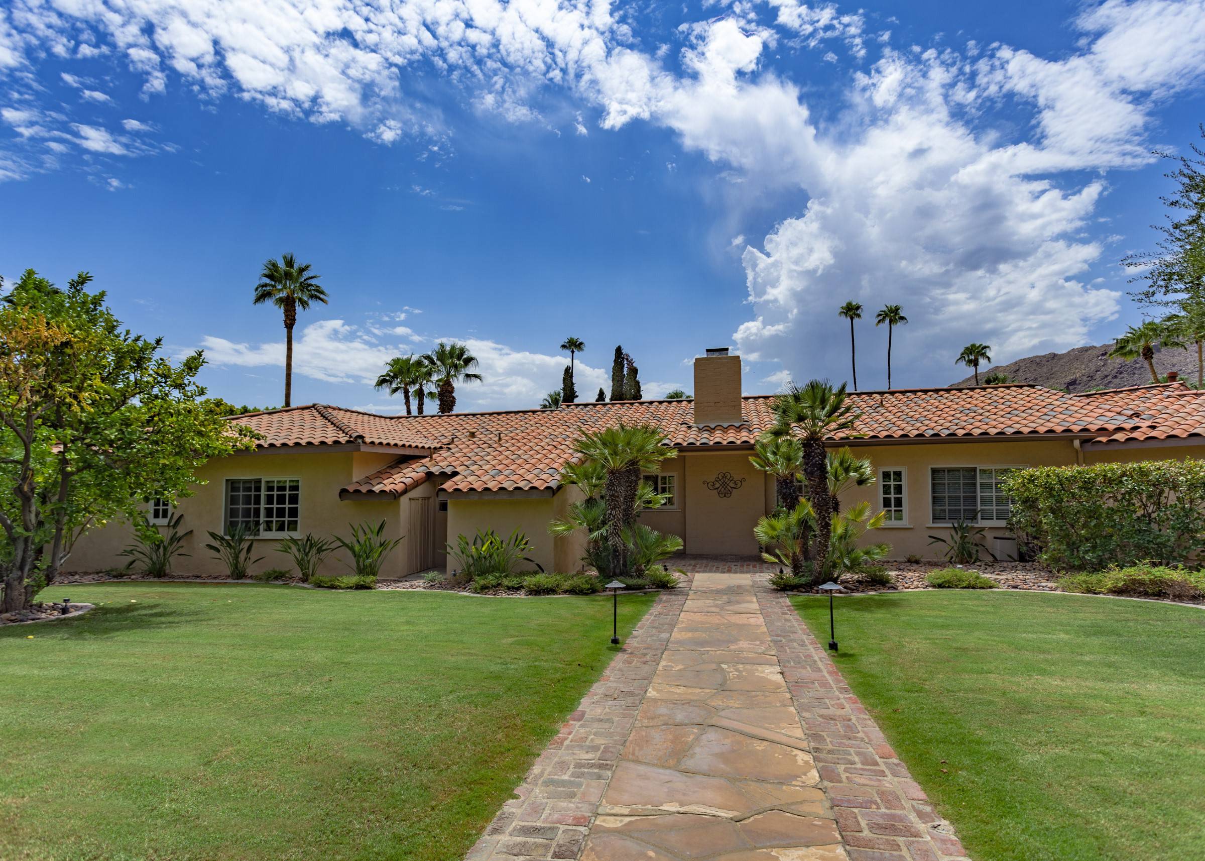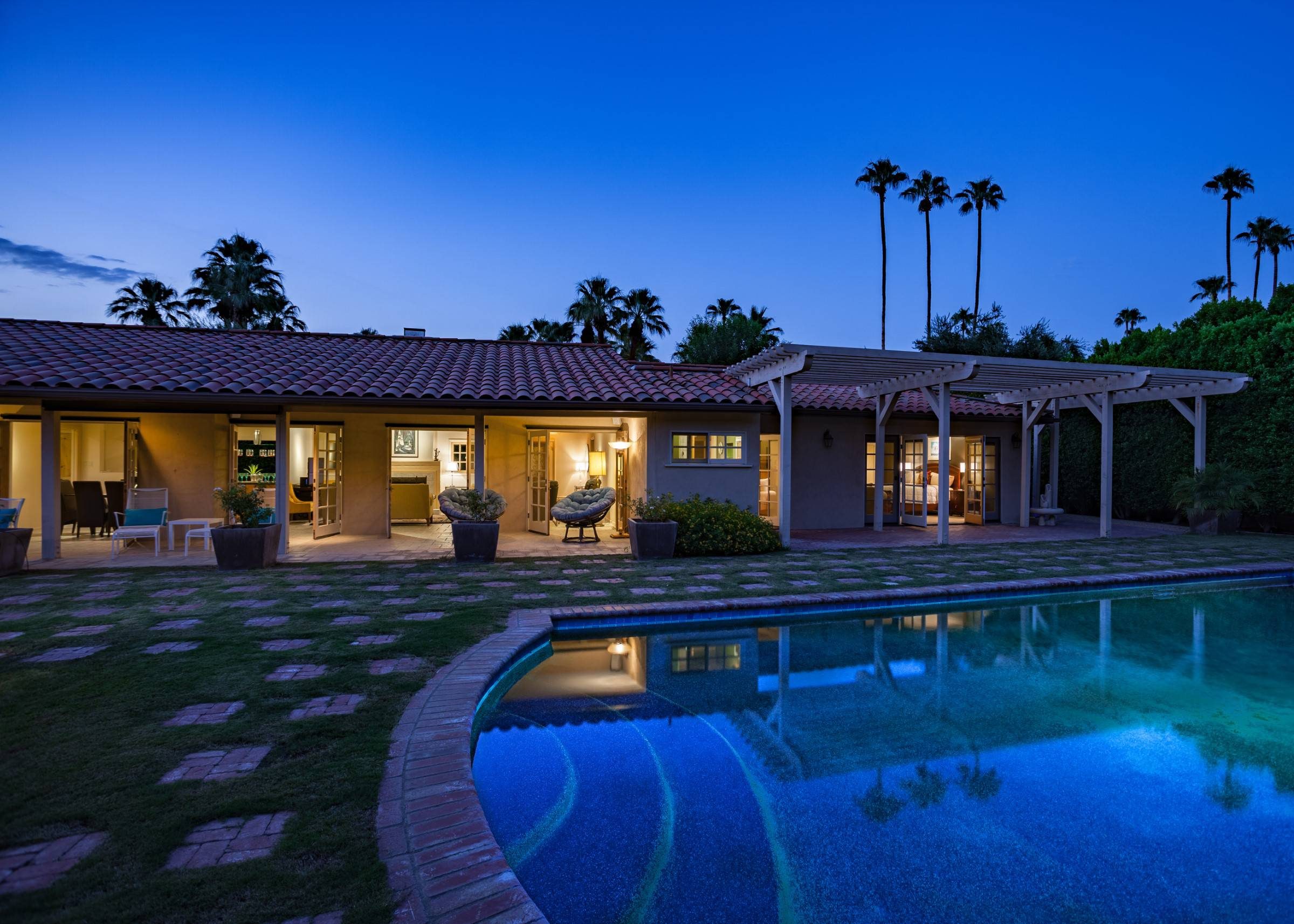 Former Sol Lesser Estate. European-style Villa in Old Las Palmas. Private resort-style yard w pool, fire feature, outdoor kitchen, covered dining pavilion. Mountain views. Walk to town. Beds: K, K, K, Q P.S. City ID #3073 Primary renter must be at least 25 years of age Completely private, fully walled & gated European-style Villa in Old Las Palmas. Walk to town. 4 Br / 3.5 Bath / Sleeps 8. Private resort-style yard w pool, fire feature, outdoor kitchen, covered dining pavilion. Mountain views. Beds: K, K, K, Q Grand Palm Springs Vacation Home Rental - just a short stroll from the world-famous Palm Canyon Drive as it runs through the Uptown Design District. Spend your vacation in this very private poolside paradise that was once the estate of Sol Lesser - the Academy Award-winning legend who produced Oliver Twist, Peck’s Bad Boy and the series of Tarzan films made popular in the 1940s and ‘50s. Nearly 3,000 square feet of old world glamour - this stately property captures the sophisticated Palm Springs vibe of yesteryear. The Sol Lesser Estate is both glamorously nostalgic and very “next century.†The architectural pedigree (Paul R. Williams) was lovingly preserved when the property was completely remodeled. New kitchen and baths, high speed internet access, five flat screen televisions and an updated climate control system. The owners have combined classic architecture, old world style and modern-day comfort to create a spectacular luxury vacation home in true Palm Springs-style. THE LIVING SPACES Built as a celebrity desert escape, this home has a luxurious open floor plan that blurs the lines between indoor and outdoor living. The great room provides an impressive yet welcoming space to spend time with your entire group. You’ll find inside dining for 8 to 10, a fireside lounging area with plenty of seating and a flat screen television. The kitchen and breakfast room has been completely remodeled with beautiful granite countertops and stainless steel appliances - including a six burner gas stove. All along the back of the house are French doors that reveal a romantic pool & yard that looks as though it were ripped from the pages of Better Homes and Gardens. THE SLEEPING QUARTERS Like an upscale boutique hotel, all of the bedrooms feature hospitality-quality mattresses, flat screen televisions and ample storage. There are three masters (two king, one queen) that each have ensuite baths. The additional king guest room has easy access to the fourth full bath. THE OUTDOOR SPACES The entire estate is completely enclosed for privacy. Once inside the gates, you will feel as though you have wandered into an episode of Lifestyles of the Rich and Famous. The front garden features a rolling lawn, stone paths and mature fruit trees. The equally private backyard is very Palm Springs-chic with a grand pebble-tec surfaced saltwater pool, a fabulous outdoor kitchen, and a covered dining pavilion with gas-fueled heater. Lounge poolside in the full sun, or beneath the shaded lanai. Enjoy sun sets over the stunning mountain view, followed by long nights gathered around the firepit with your travel companions. A PART OF PALM SPRINGS HISTORY This private compound was built in 1946 from plans by architect Paul R. Williams - known for designing Tudor revivals and Villas in the French Chateau and Regency styles for clients Frank Sinatra, Lucille Ball, Julie London and Tyrone Power. He began working in Palm Springs when weekend and seasonal getaways were all the rage for the celebrities who flocked here to relax under the radar. Today, Leonardo DiCaprio owns property in the neighborhood as do some of the biggest stars of daytime television like Bobbie Eakes (All My Children, Bold & The Beautiful) and Tristan Rogers (Young and the Restless, General Hospital). ABOUT THE LOCATION Old Las Palmas is just a quarter mile stroll from the Uptown Design District Certain dog breeds under 65 lbs are allowed at this home, the dog fee is $195 (2 dogs maximum).Amenities