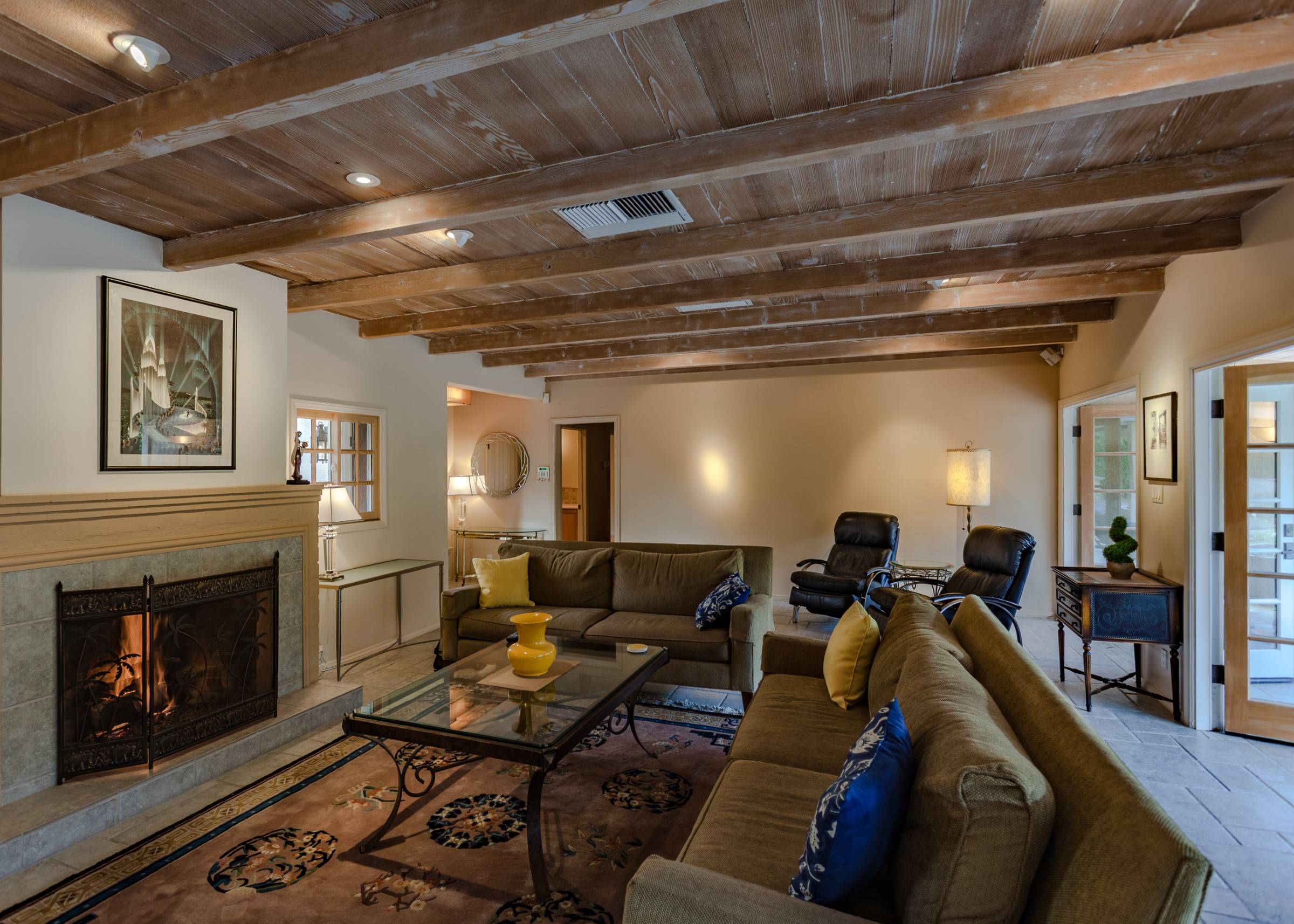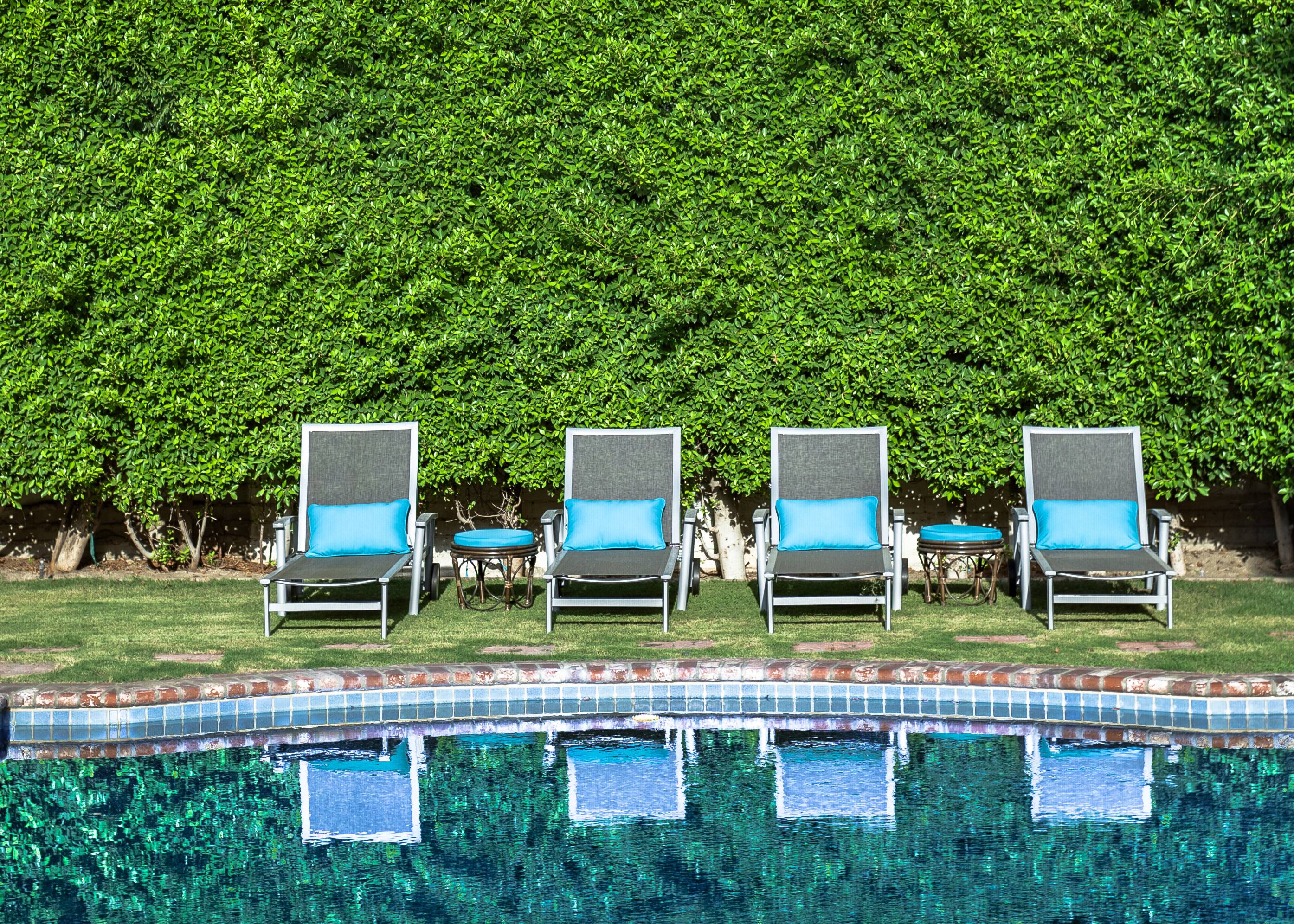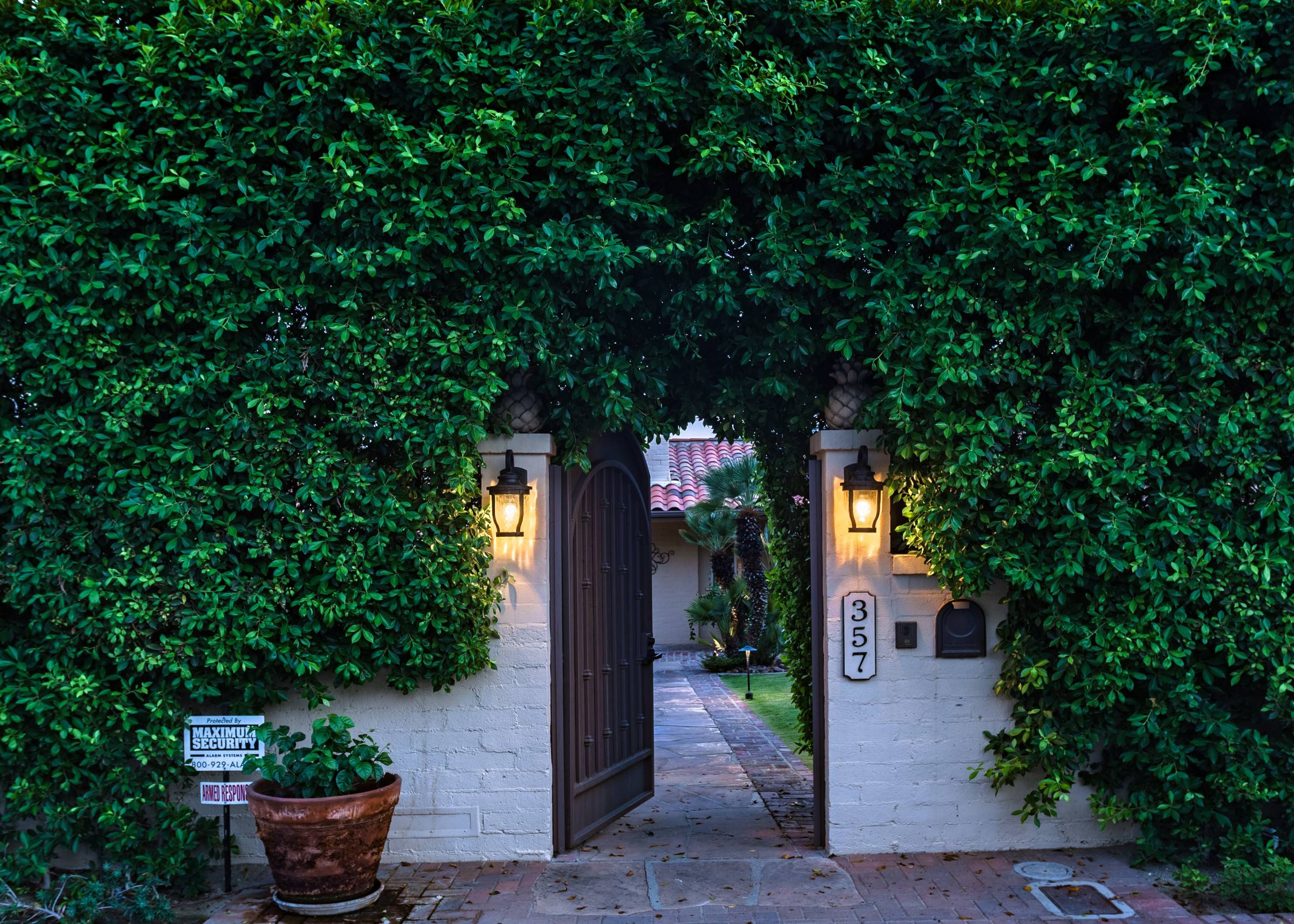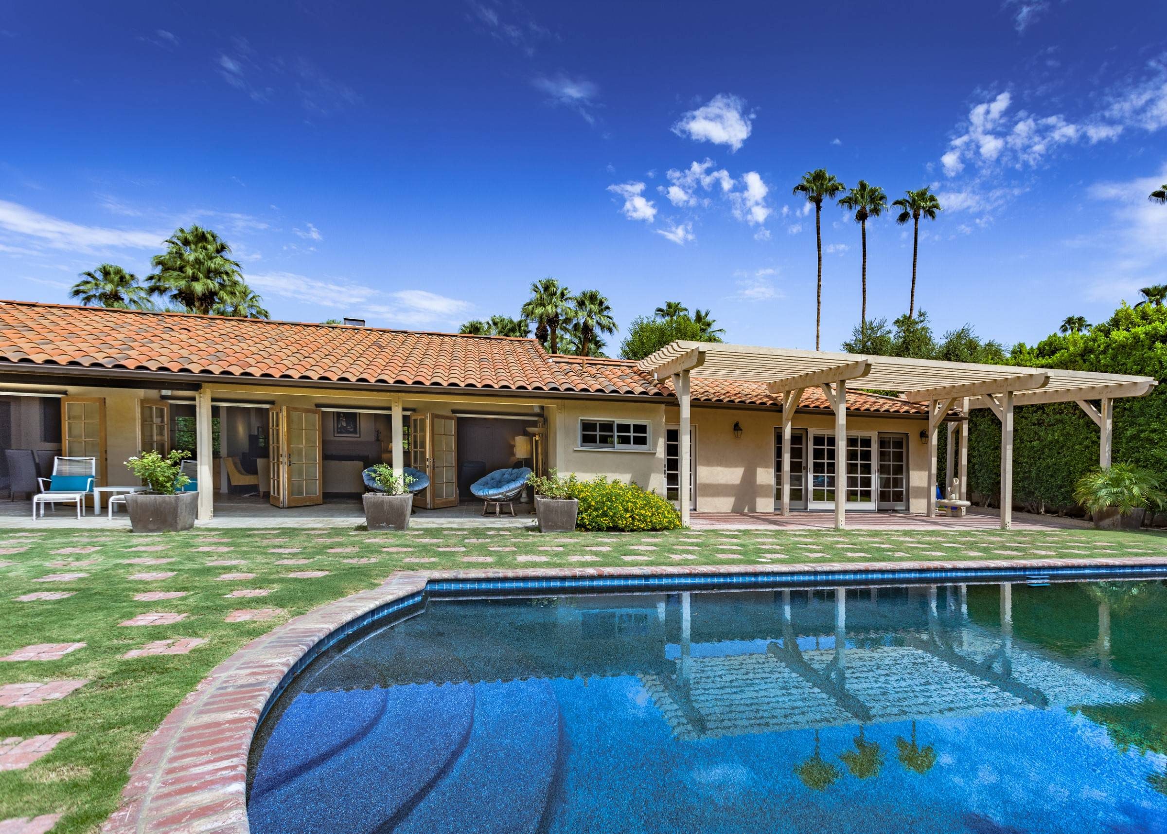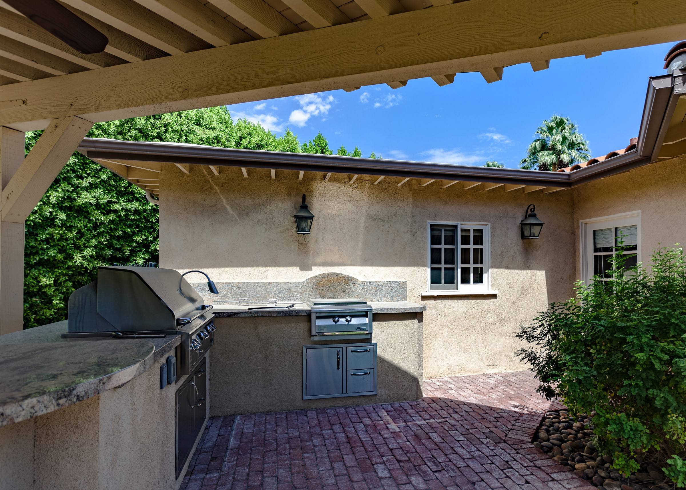 Former Sol Lesser Estate. European-style Villa in Old Las Palmas. Private resort-style yard w pool, fire feature, outdoor kitchen, covered dining pavilion. Mountain views. Walk to town. Beds: K, K, K, Q P.S. City ID #3073 Primary renter must be at least 25 years of age Completely private, fully walled & gated European-style Villa in Old Las Palmas. Walk to town. 4 Br / 3.5 Bath / Sleeps 8. Private resort-style yard w pool, fire feature, outdoor kitchen, covered dining pavilion. Mountain views. Beds: K, K, K, Q Grand Palm Springs Vacation Home Rental - just a short stroll from the world-famous Palm Canyon Drive as it runs through the Uptown Design District. Spend your vacation in this very private poolside paradise that was once the estate of Sol Lesser - the Academy Award-winning legend who produced Oliver Twist, Peck’s Bad Boy and the series of Tarzan films made popular in the 1940s and ‘50s. Nearly 3,000 square feet of old world glamour - this stately property captures the sophisticated Palm Springs vibe of yesteryear. The Sol Lesser Estate is both glamorously nostalgic and very “next century.†The architectural pedigree (Paul R. Williams) was lovingly preserved when the property was completely remodeled. New kitchen and baths, high speed internet access, five flat screen televisions and an updated climate control system. The owners have combined classic architecture, old world style and modern-day comfort to create a spectacular luxury vacation home in true Palm Springs-style. THE LIVING SPACES Built as a celebrity desert escape, this home has a luxurious open floor plan that blurs the lines between indoor and outdoor living. The great room provides an impressive yet welcoming space to spend time with your entire group. You’ll find inside dining for 8 to 10, a fireside lounging area with plenty of seating and a flat screen television. The kitchen and breakfast room has been completely remodeled with beautiful granite countertops and stainless steel appliances - including a six burner gas stove. All along the back of the house are French doors that reveal a romantic pool & yard that looks as though it were ripped from the pages of Better Homes and Gardens. THE SLEEPING QUARTERS Like an upscale boutique hotel, all of the bedrooms feature hospitality-quality mattresses, flat screen televisions and ample storage. There are three masters (two king, one queen) that each have ensuite baths. The additional king guest room has easy access to the fourth full bath. THE OUTDOOR SPACES The entire estate is completely enclosed for privacy. Once inside the gates, you will feel as though you have wandered into an episode of Lifestyles of the Rich and Famous. The front garden features a rolling lawn, stone paths and mature fruit trees. The equally private backyard is very Palm Springs-chic with a grand pebble-tec surfaced saltwater pool, a fabulous outdoor kitchen, and a covered dining pavilion with gas-fueled heater. Lounge poolside in the full sun, or beneath the shaded lanai. Enjoy sun sets over the stunning mountain view, followed by long nights gathered around the firepit with your travel companions. A PART OF PALM SPRINGS HISTORY This private compound was built in 1946 from plans by architect Paul R. Williams - known for designing Tudor revivals and Villas in the French Chateau and Regency styles for clients Frank Sinatra, Lucille Ball, Julie London and Tyrone Power. He began working in Palm Springs when weekend and seasonal getaways were all the rage for the celebrities who flocked here to relax under the radar. Today, Leonardo DiCaprio owns property in the neighborhood as do some of the biggest stars of daytime television like Bobbie Eakes (All My Children, Bold & The Beautiful) and Tristan Rogers (Young and the Restless, General Hospital). ABOUT THE LOCATION Old Las Palmas is just a quarter mile stroll from the Uptown Design District Certain dog breeds under 65 lbs are allowed at this home, the dog fee is $195 (2 dogs maximum).Amenities