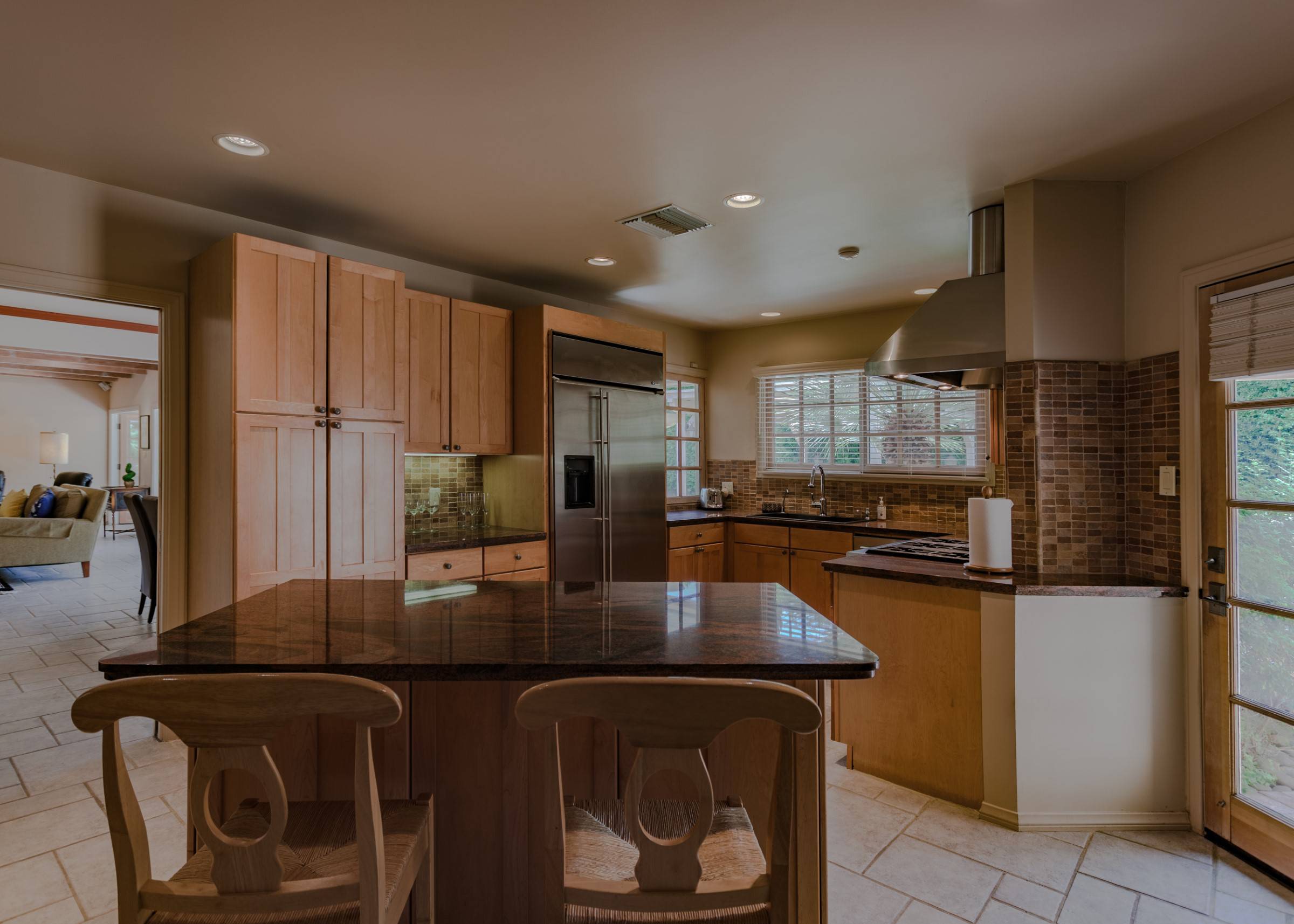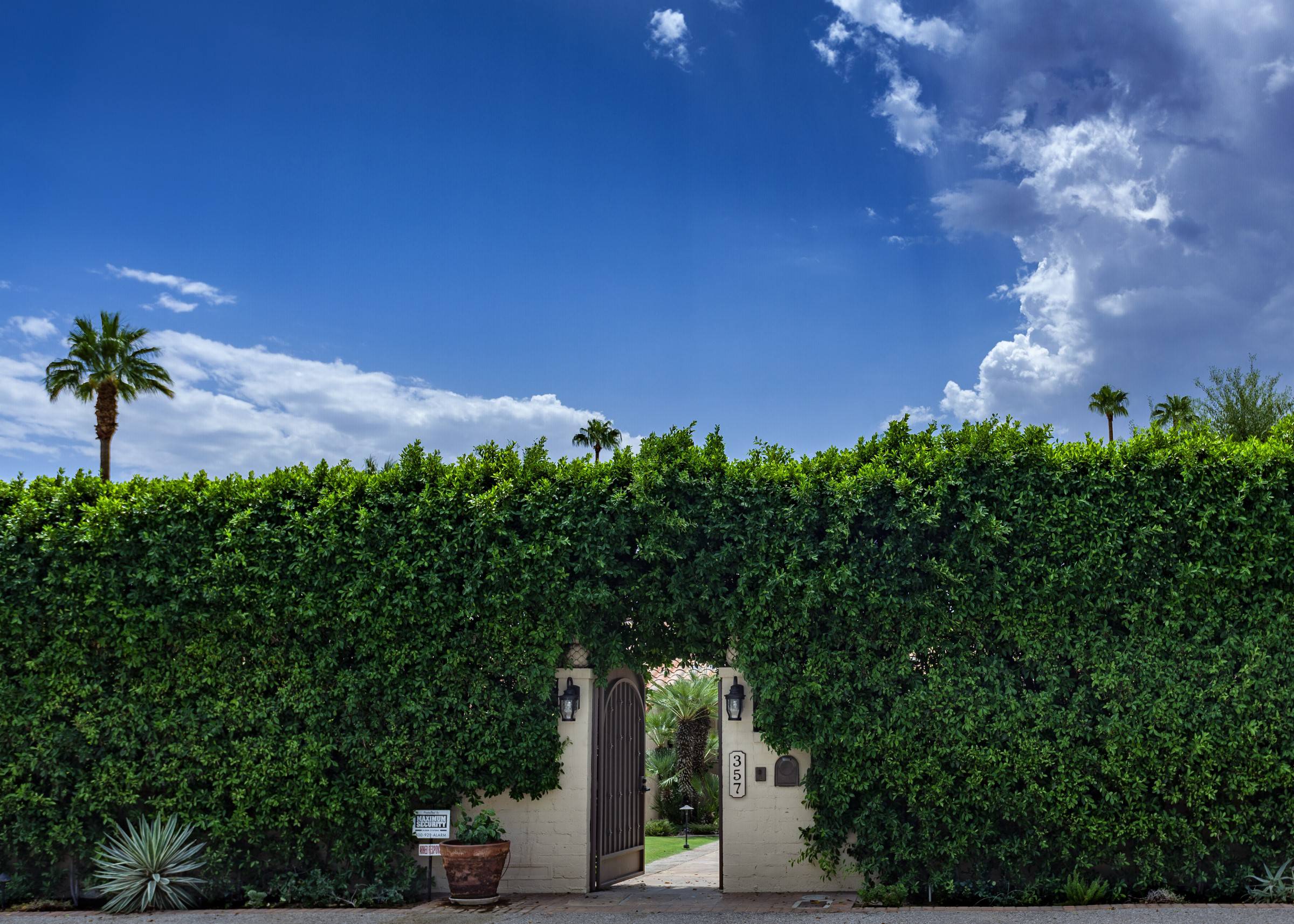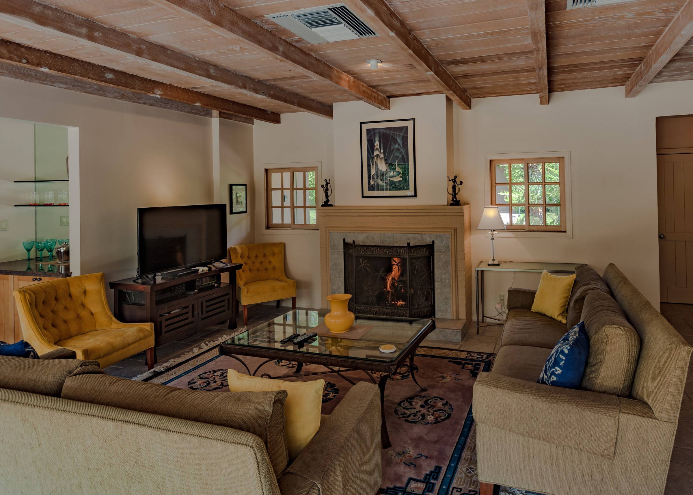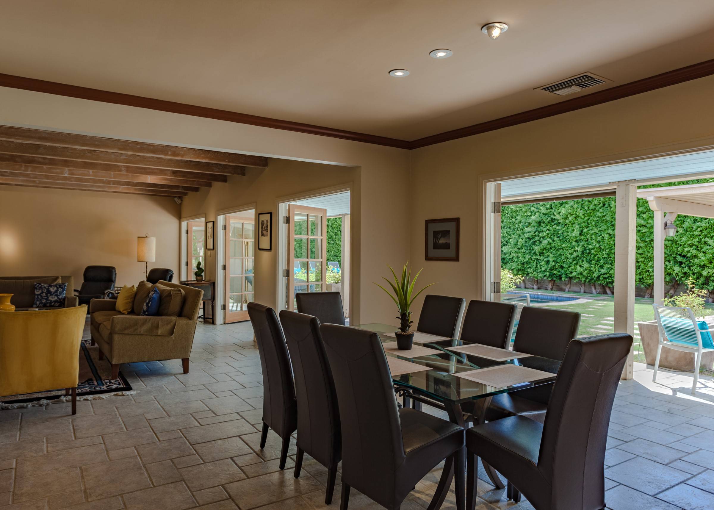 Former Sol Lesser Estate. European-style Villa in Old Las Palmas. Private resort-style yard w pool, fire feature, outdoor kitchen, covered dining pavilion. Mountain views. Walk to town. Beds: K, K, K, Q P.S. City ID #3073 Primary renter must be at least 25 years of age Completely private, fully walled & gated European-style Villa in Old Las Palmas. Walk to town. 4 Br / 3.5 Bath / Sleeps 8. Private resort-style yard w pool, fire feature, outdoor kitchen, covered dining pavilion. Mountain views. Beds: K, K, K, Q Grand Palm Springs Vacation Home Rental - just a short stroll from the world-famous Palm Canyon Drive as it runs through the Uptown Design District. Spend your vacation in this very private poolside paradise that was once the estate of Sol Lesser - the Academy Award-winning legend who produced Oliver Twist, Peck’s Bad Boy and the series of Tarzan films made popular in the 1940s and ‘50s. Nearly 3,000 square feet of old world glamour - this stately property captures the sophisticated Palm Springs vibe of yesteryear. The Sol Lesser Estate is both glamorously nostalgic and very “next century.†The architectural pedigree (Paul R. Williams) was lovingly preserved when the property was completely remodeled. New kitchen and baths, high speed internet access, five flat screen televisions and an updated climate control system. The owners have combined classic architecture, old world style and modern-day comfort to create a spectacular luxury vacation home in true Palm Springs-style. THE LIVING SPACES Built as a celebrity desert escape, this home has a luxurious open floor plan that blurs the lines between indoor and outdoor living. The great room provides an impressive yet welcoming space to spend time with your entire group. You’ll find inside dining for 8 to 10, a fireside lounging area with plenty of seating and a flat screen television. The kitchen and breakfast room has been completely remodeled with beautiful granite countertops and stainless steel appliances - including a six burner gas stove. All along the back of the house are French doors that reveal a romantic pool & yard that looks as though it were ripped from the pages of Better Homes and Gardens. THE SLEEPING QUARTERS Like an upscale boutique hotel, all of the bedrooms feature hospitality-quality mattresses, flat screen televisions and ample storage. There are three masters (two king, one queen) that each have ensuite baths. The additional king guest room has easy access to the fourth full bath. THE OUTDOOR SPACES The entire estate is completely enclosed for privacy. Once inside the gates, you will feel as though you have wandered into an episode of Lifestyles of the Rich and Famous. The front garden features a rolling lawn, stone paths and mature fruit trees. The equally private backyard is very Palm Springs-chic with a grand pebble-tec surfaced saltwater pool, a fabulous outdoor kitchen, and a covered dining pavilion with gas-fueled heater. Lounge poolside in the full sun, or beneath the shaded lanai. Enjoy sun sets over the stunning mountain view, followed by long nights gathered around the firepit with your travel companions. A PART OF PALM SPRINGS HISTORY This private compound was built in 1946 from plans by architect Paul R. Williams - known for designing Tudor revivals and Villas in the French Chateau and Regency styles for clients Frank Sinatra, Lucille Ball, Julie London and Tyrone Power. He began working in Palm Springs when weekend and seasonal getaways were all the rage for the celebrities who flocked here to relax under the radar. Today, Leonardo DiCaprio owns property in the neighborhood as do some of the biggest stars of daytime television like Bobbie Eakes (All My Children, Bold & The Beautiful) and Tristan Rogers (Young and the Restless, General Hospital). ABOUT THE LOCATION Old Las Palmas is just a quarter mile stroll from the Uptown Design District Certain dog breeds under 65 lbs are allowed at this home, the dog fee is $195 (2 dogs maximum).Amenities
