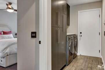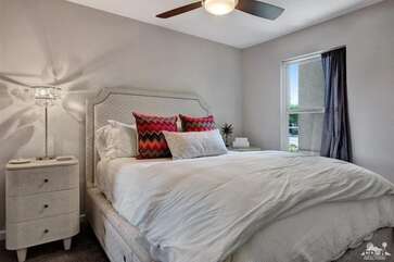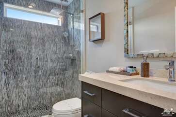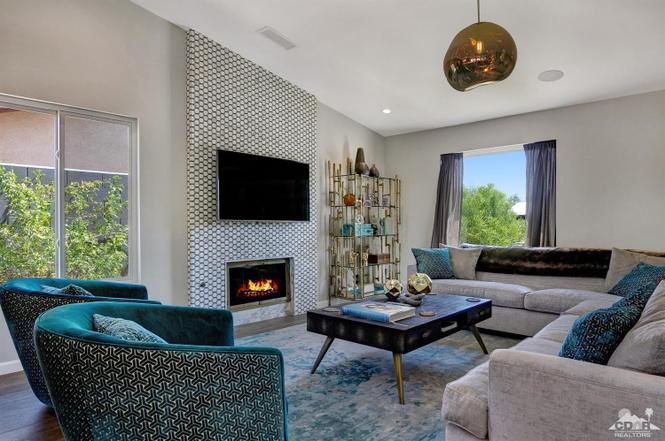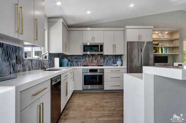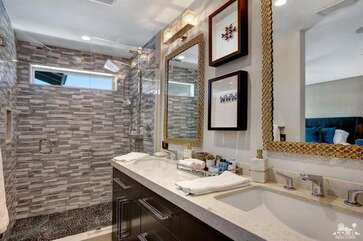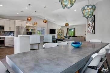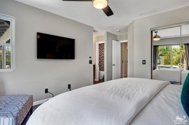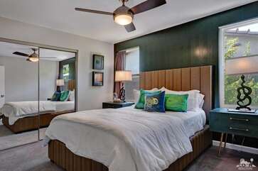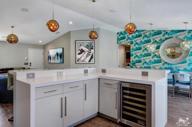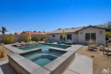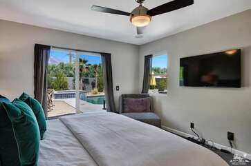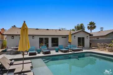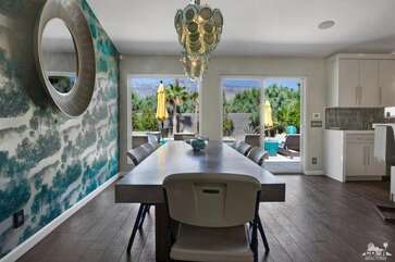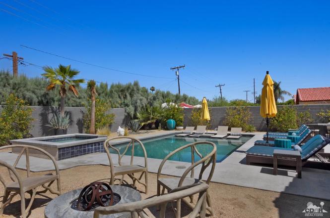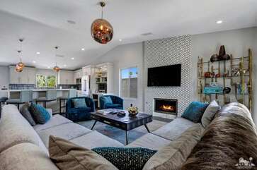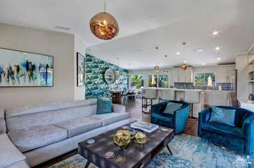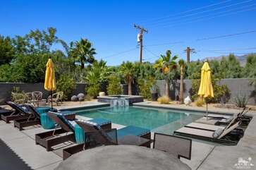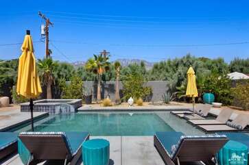 Recently renovated from the ground up, this stylish 3-bed, 2-bath Palm Springs vacation rental boasts a sparkling pool and hot tub in a serene, mountain-facing backyard, as well as an open plan concept living space with a plethora of incredibly stunning amenities. With no detail overlooked, the decadent furnishings complement the exquisite decor and professional styling throughout. Quirky, unique touches like the gorgeously bold wallpaper accents make this property a whimsical, memorable experience for your Palm Springs vacation.Ten minutes from downtown Palm Springs and a quick jaunt from the airport, restaurants and supermarkets, this home is as convenient as it is one-of-a-kind. The living room features comfortable seating upholstered in rich fabrics wrapping around a cozy gas fireplace and a large flat-screen TV with a fully loaded cable package. The fully appointed chef's kitchen boasts brand new, gleaming stainless steel Bosch appliances. Flanked by 5 swanky bar stools, the counter top island features a wraparound bar. As a bonus, there's even a Viking wine fridge to keep your favorite libations at the most perfect temperature. The kitchen comes fully stocked with glassware, cookware and any utensils you could need.Looking outside, the windows bring in views of the San Jacinto Mountains and backyard, easily accessed through sliding glass doors. A true oasis in the desert! The mountain-facing backyard showcases a sparkling swimming pool with an attached hot tub and a relaxing waterfall feature. Escape the heat with a dip in the pool, bask and relax in the chaise lounges, or warm up on a chilly evening around the cozy outdoor gas fire pit. There's even an outdoor dining set for 4 near the kitchen. There is also a natural gas BBQ grill installed. You are never going to want to leave!Property DescriptionApproximately 1584 sq ftLocated in Palm Springs4 TVsWiFiWasher and DryerPropane BBQPrivate Pool and SpaOptional Pool/Spa Heating Available at Additional Charge October-MayFire PitNo Pets AllowedChildren 16+ Allowed3 Night MinimumPalm Springs City ID #3218TOT #4004Bed ConfigurationMaster: King Bed Guest 1: Queen BedGuest 2: Queen BedBathroom ConfigurationMaster: En Suite Walk In Shower & Dual Sinks Guest: Walk In ShowerAmenities