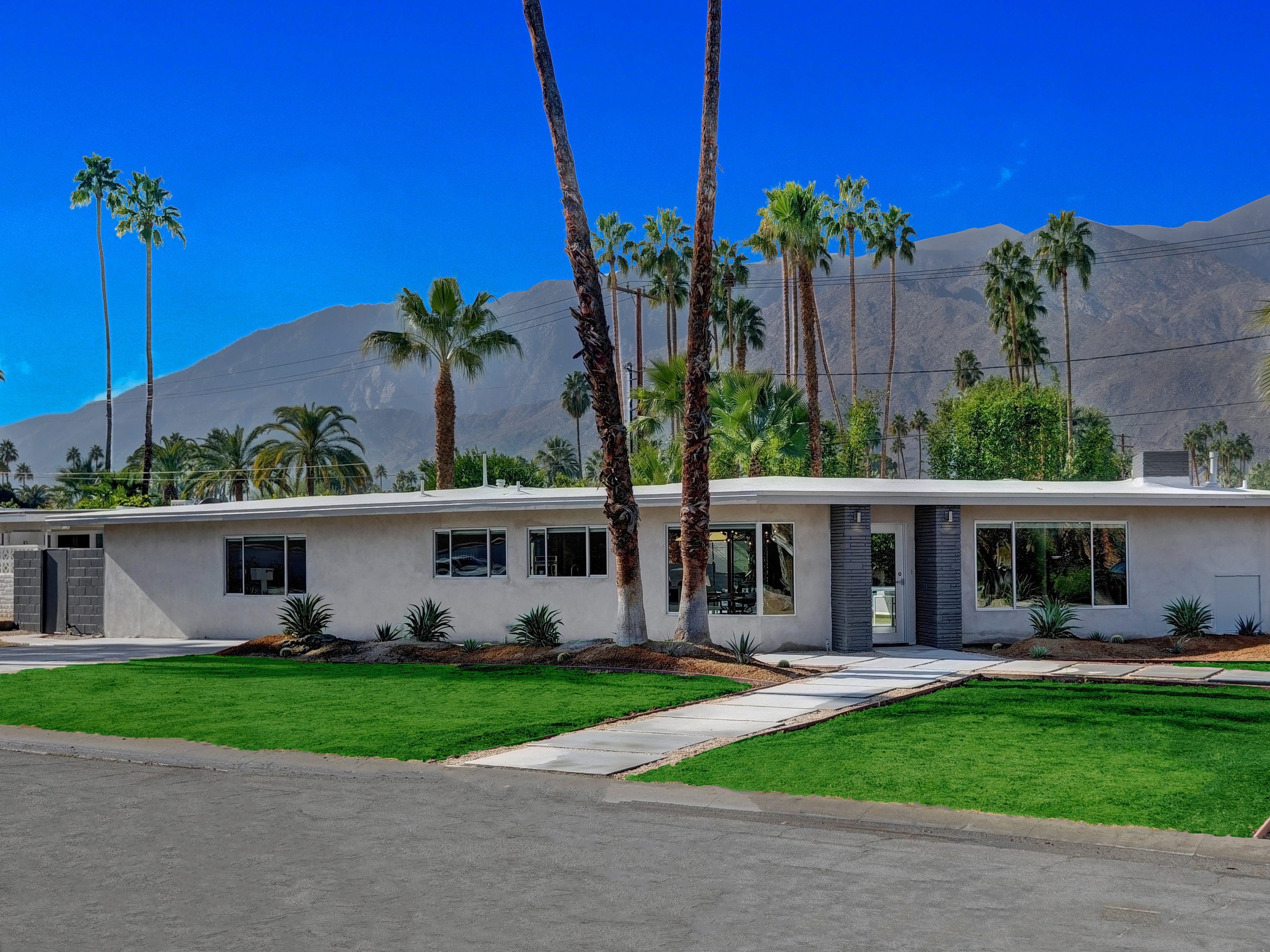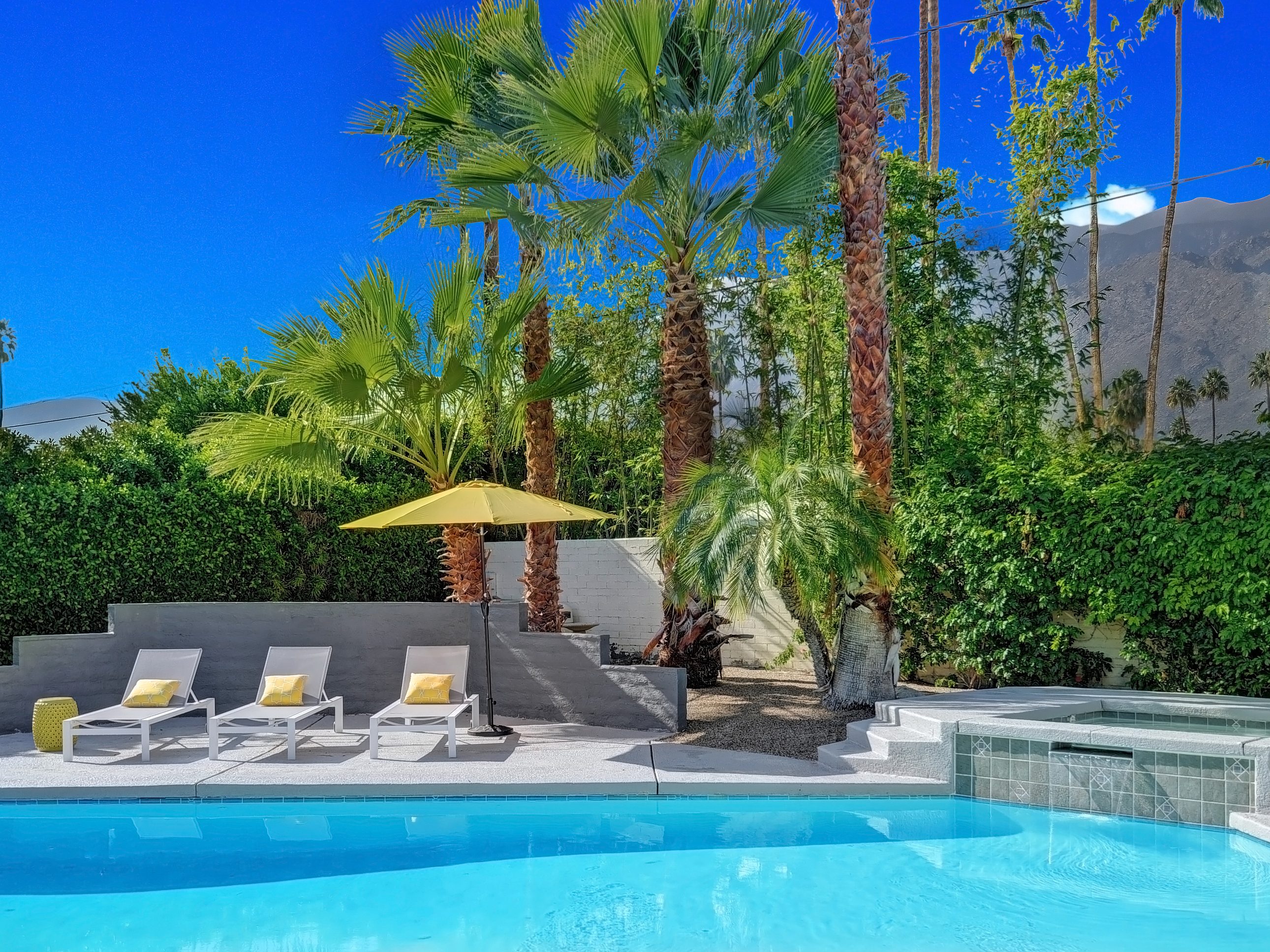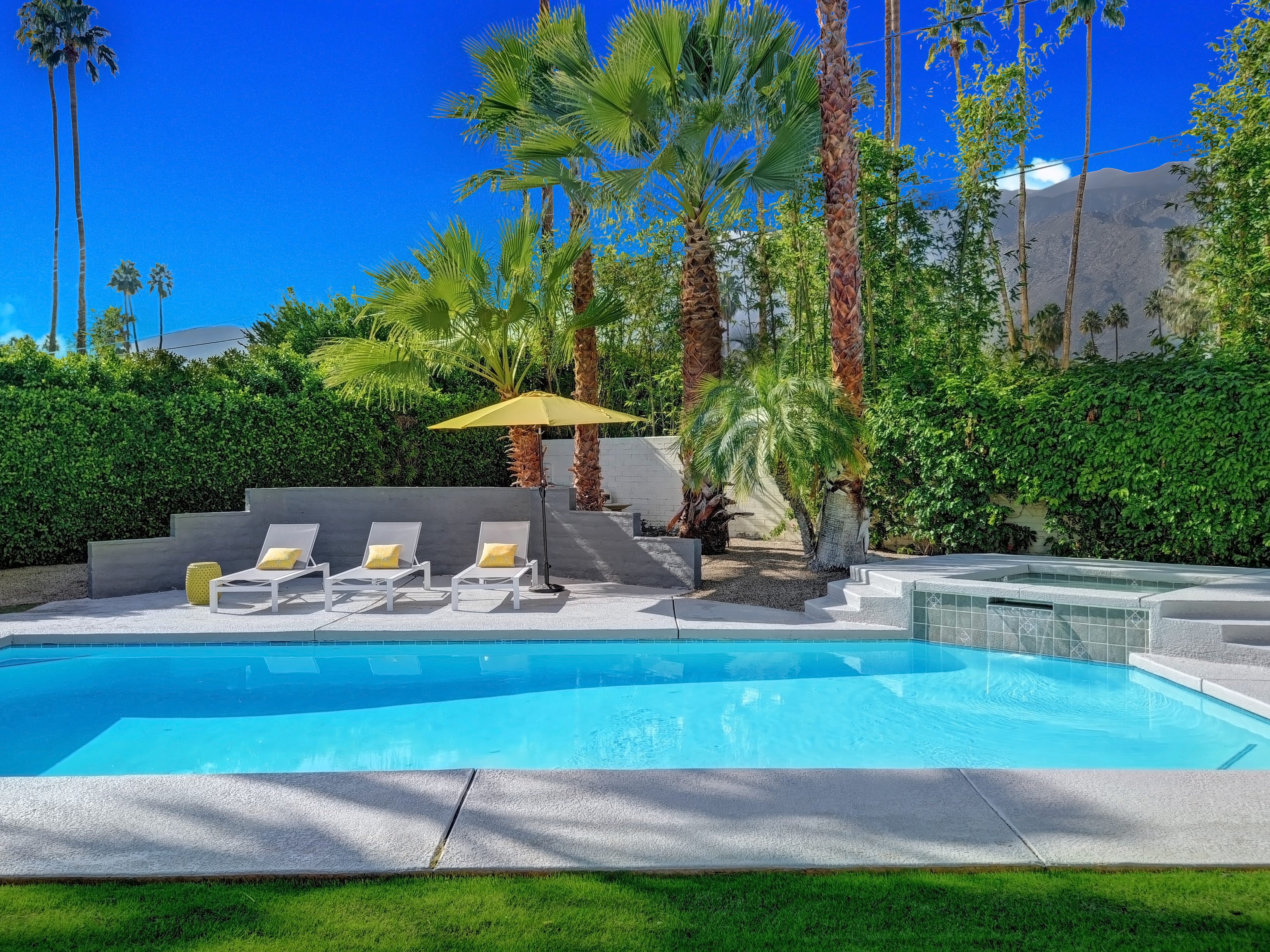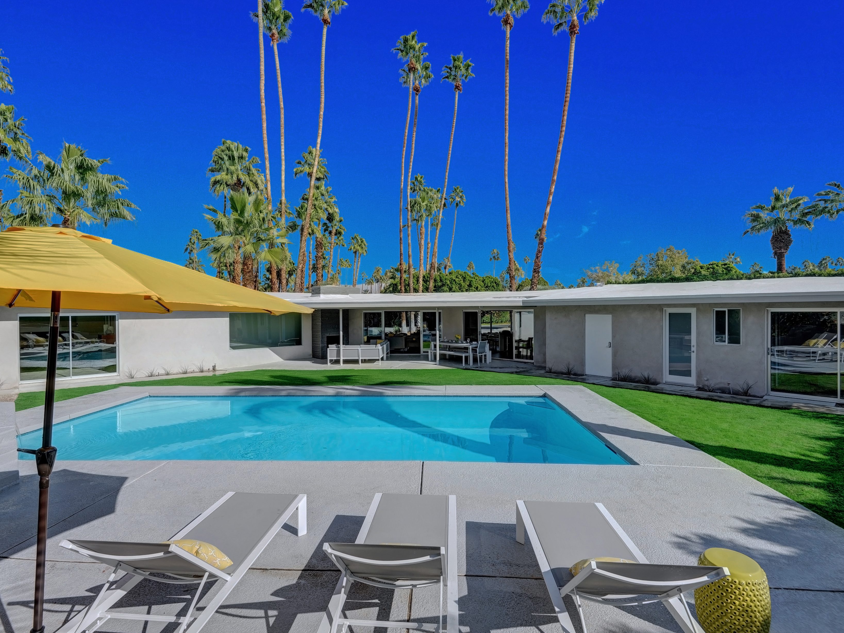 Completely Remodeled Executive Villa (circa 1953) in the popular Deepwell Neighborhood. Walk to Palm Canyon Drive. Private yard w heated pool, integrated waterfall spa, fire feature, covered outdoor living pavilion. Mountain views. Beds: K, Q, Q, K (or T, T) Primary renter must be at least 25 years of age Completely Remodeled Executive Villa (circa 1953) in the popular Deepwell Neighborhood. Walk to Palm Canyon Drive. Private yard w heated pool, integrated waterfall spa, fire feature, covered outdoor living pavilion. Mountain views. Beds: K, Q, Q, K (or T, T) Stunning midcentury executive home in the exclusive Deepwell Neighborhood - an easy stroll to the world-famous Palm Canyon Drive. This upscale vacation home has been totally updated for the way we live today. Gorgeous new kitchen, deluxe baths, high-speed internet, five flat-screen televisions, open concept floor plan, comfortable Mid Mod-inspired furnishings, and fabulous sleeping quarters.