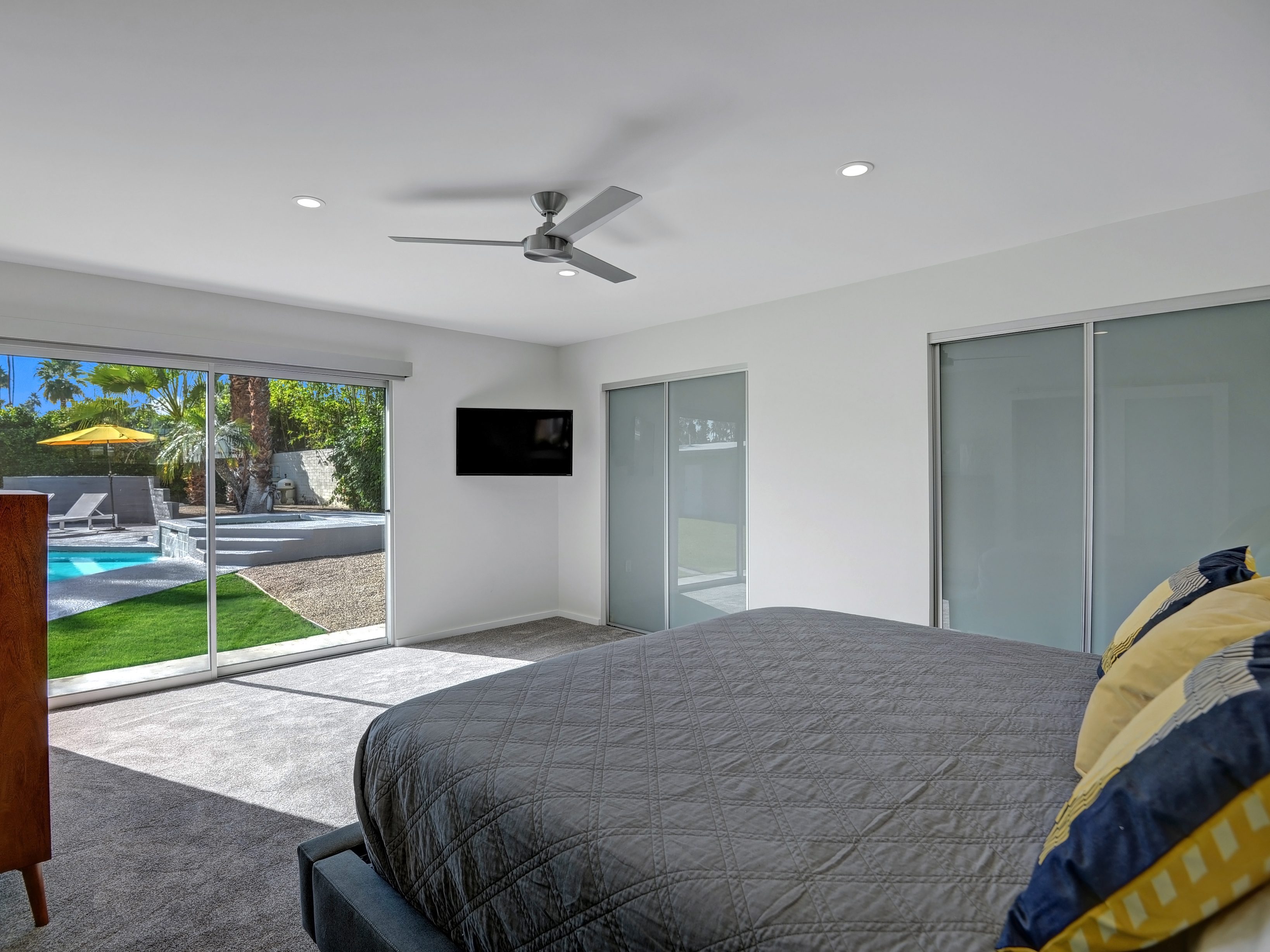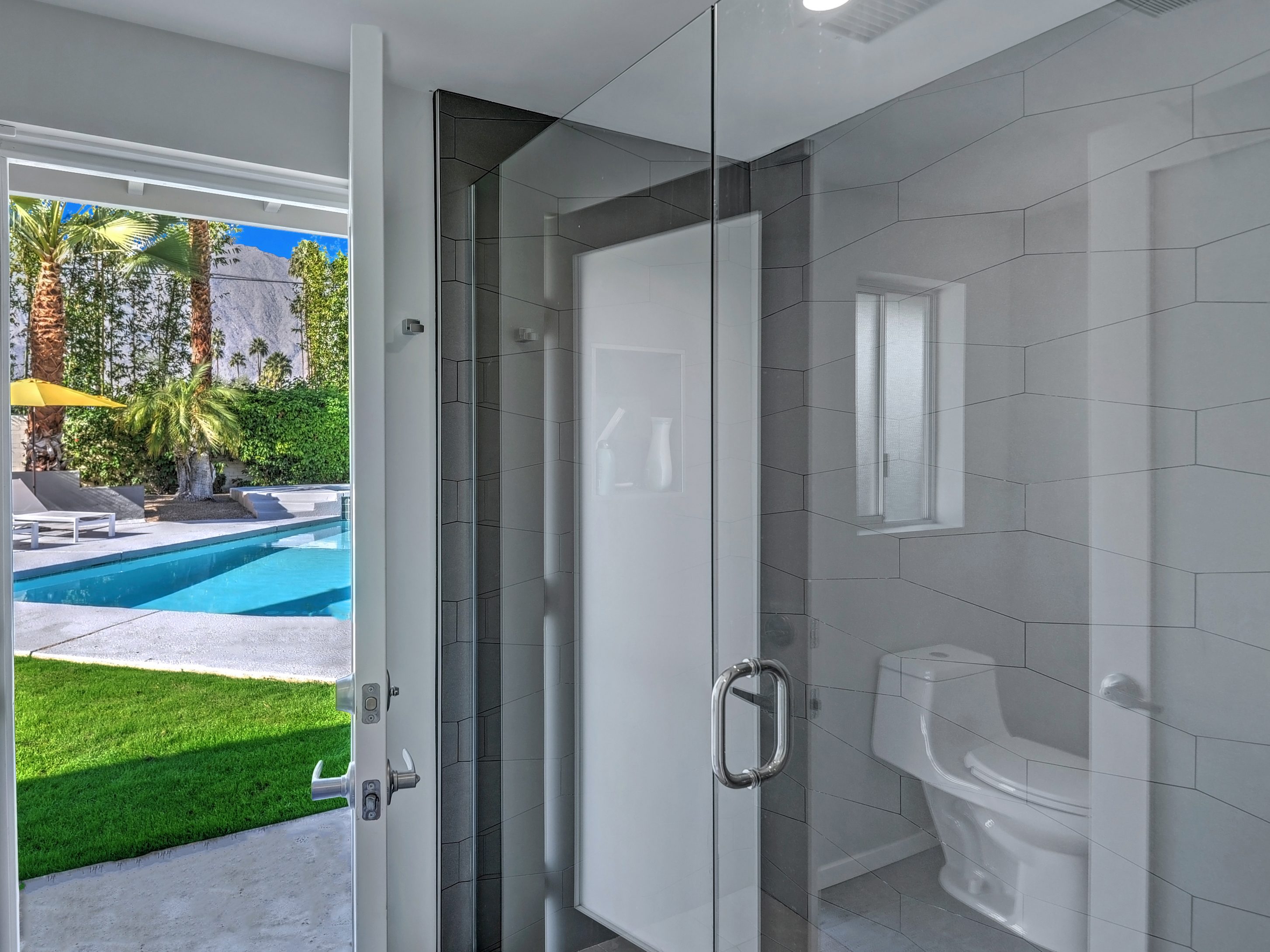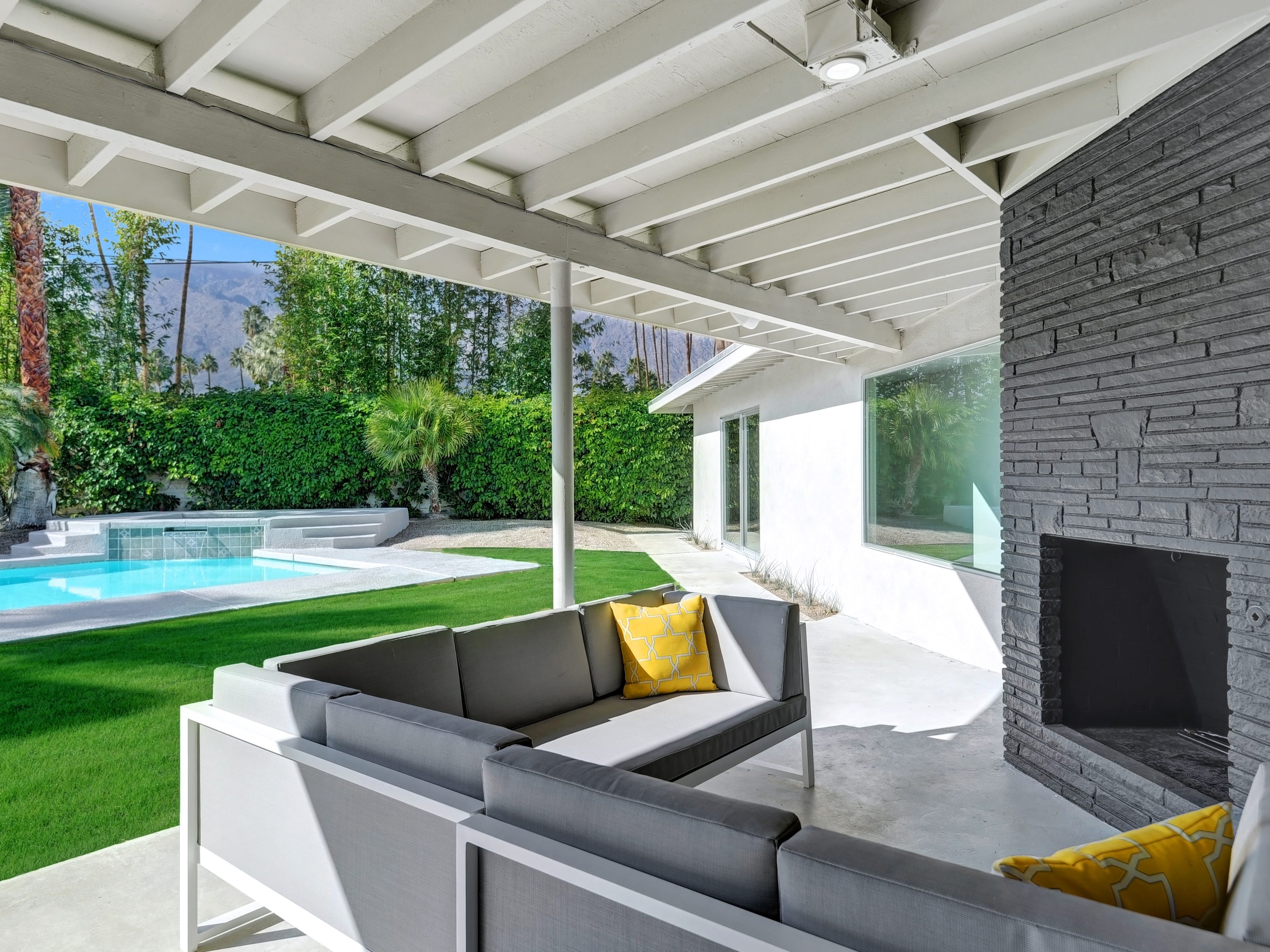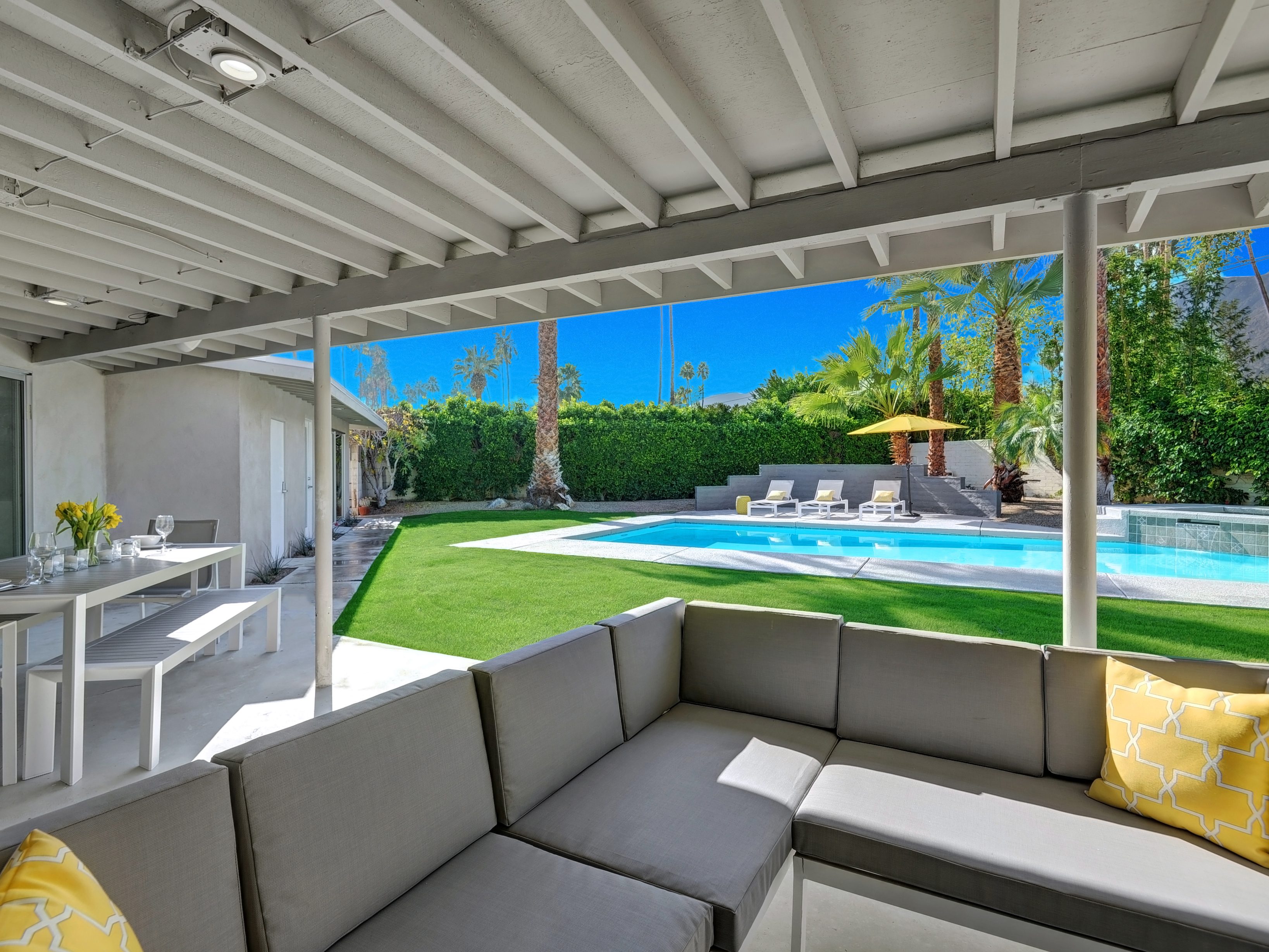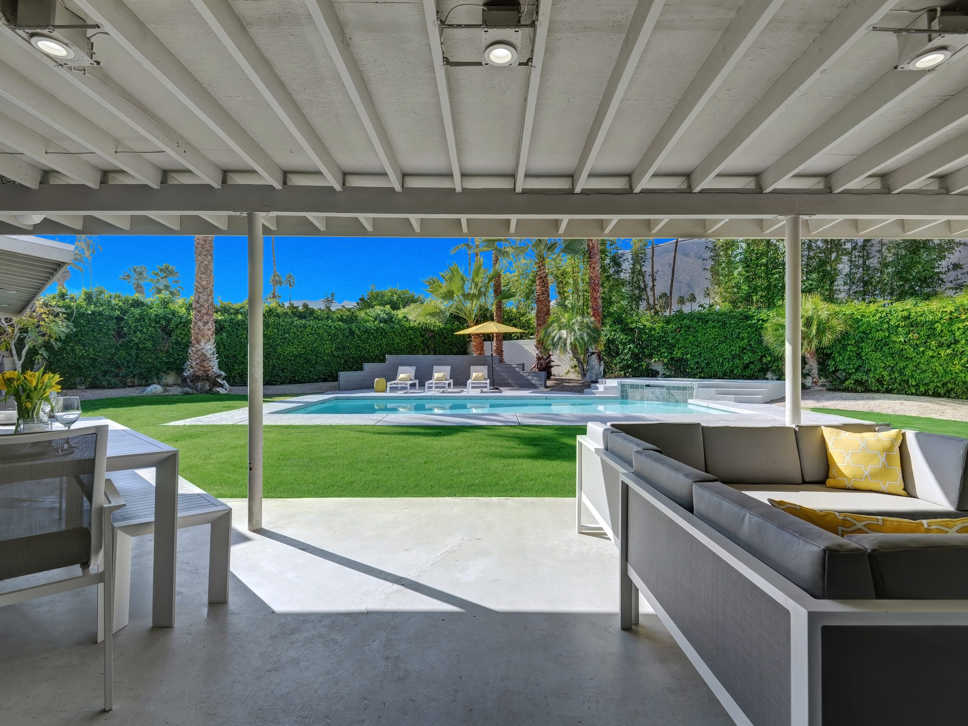 Completely Remodeled Executive Villa (circa 1953) in the popular Deepwell Neighborhood. Walk to Palm Canyon Drive. Private yard w heated pool, integrated waterfall spa, fire feature, covered outdoor living pavilion. Mountain views. Beds: K, Q, Q, K (or T, T) Primary renter must be at least 25 years of age Completely Remodeled Executive Villa (circa 1953) in the popular Deepwell Neighborhood. Walk to Palm Canyon Drive. Private yard w heated pool, integrated waterfall spa, fire feature, covered outdoor living pavilion. Mountain views. Beds: K, Q, Q, K (or T, T) Stunning midcentury executive home in the exclusive Deepwell Neighborhood - an easy stroll to the world-famous Palm Canyon Drive. This upscale vacation home has been totally updated for the way we live today. Gorgeous new kitchen, deluxe baths, high-speed internet, five flat-screen televisions, open concept floor plan, comfortable Mid Mod-inspired furnishings, and fabulous sleeping quarters.
