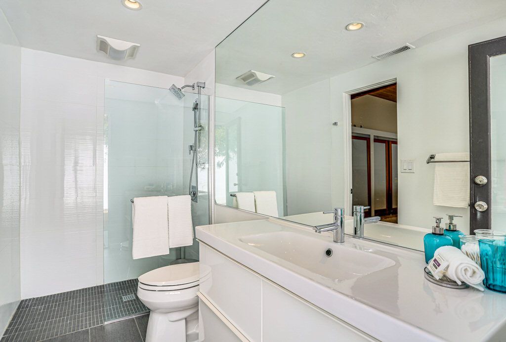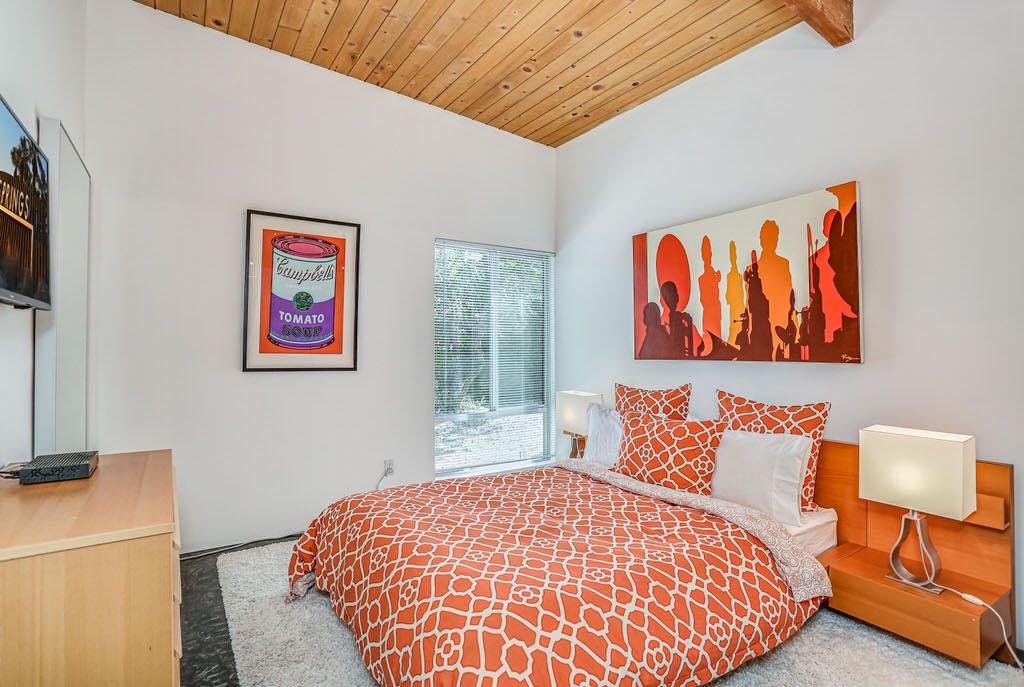 The spacious master bedroom features a California king bed, private patio, modern ensuite bath with walk in shower as well as an outdoor shower. One guest bedroom features a California king bed, and the other a queen bed. Both guest bedrooms have windows looking out to the private front yard. The two guest bedrooms share a hall bath with walk in shower. All bedrooms feature large TVs fully equipped with cable and Netflix. The house also features a large den/media room with sectional sleeper sofa for added flexibility and guests.
