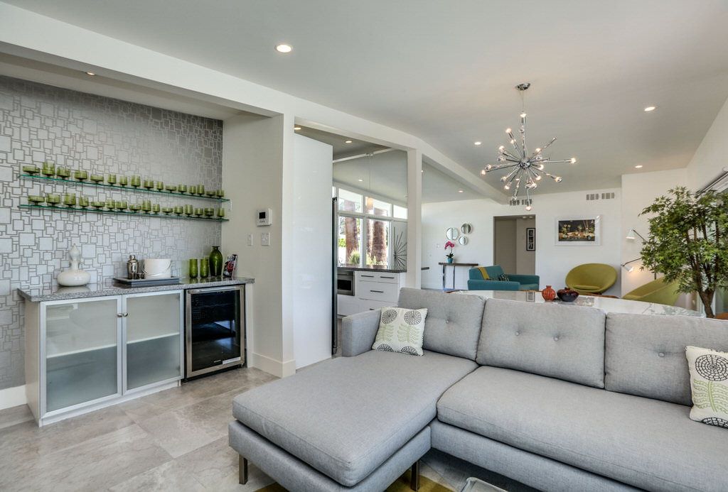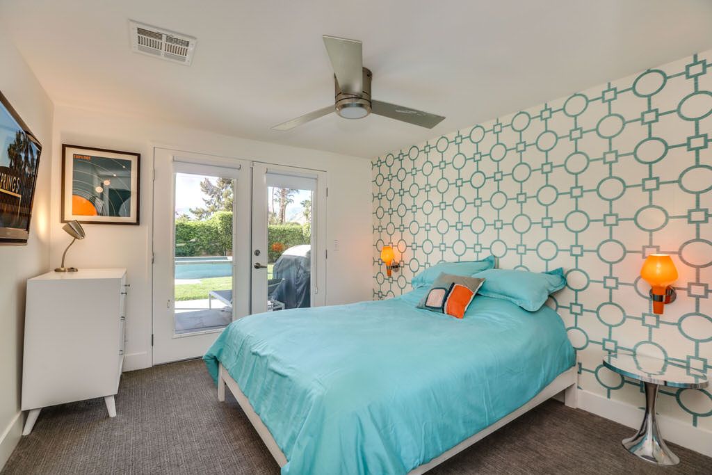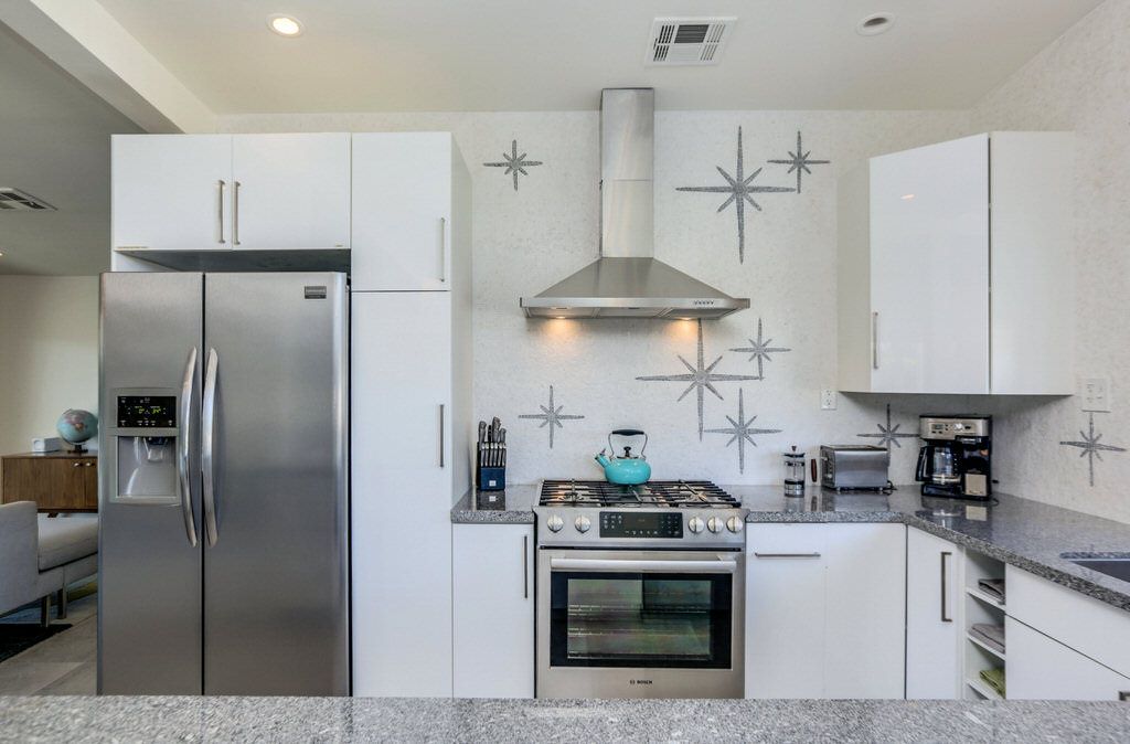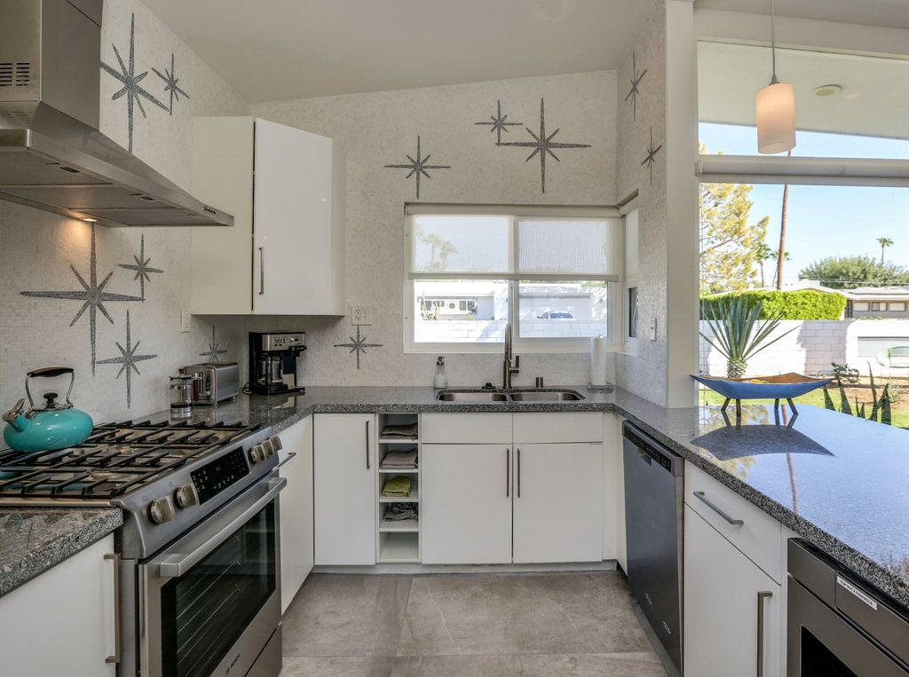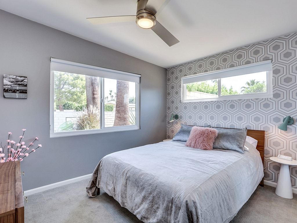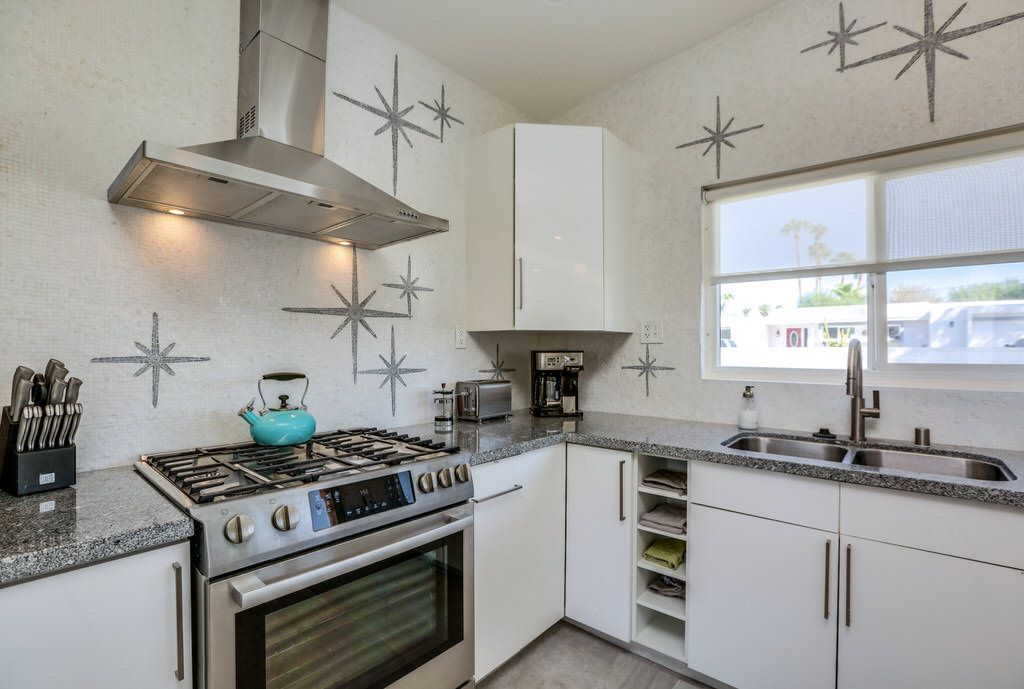 Designed by Melinamade Interiors, this Palm Springs vacation rental home has been tastefully decorated with designer furnishings and comes furnished with quartzite counter-tops, stainless steel appliances, sun-filled windows and beautiful artwork.