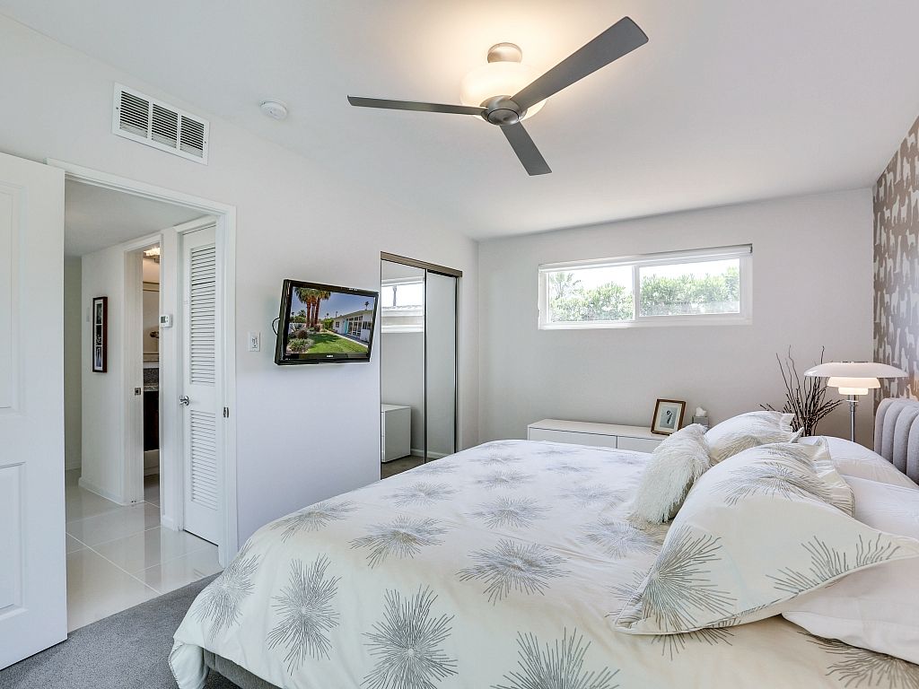 Each bedroom in this Palm Springs vacation home provides guests with ultimate comfort. Each bedroom includes Bellagio Hotel Mattresses appointed with elegant linens and soft cotton sheets, 32inch flat-screen TVs.