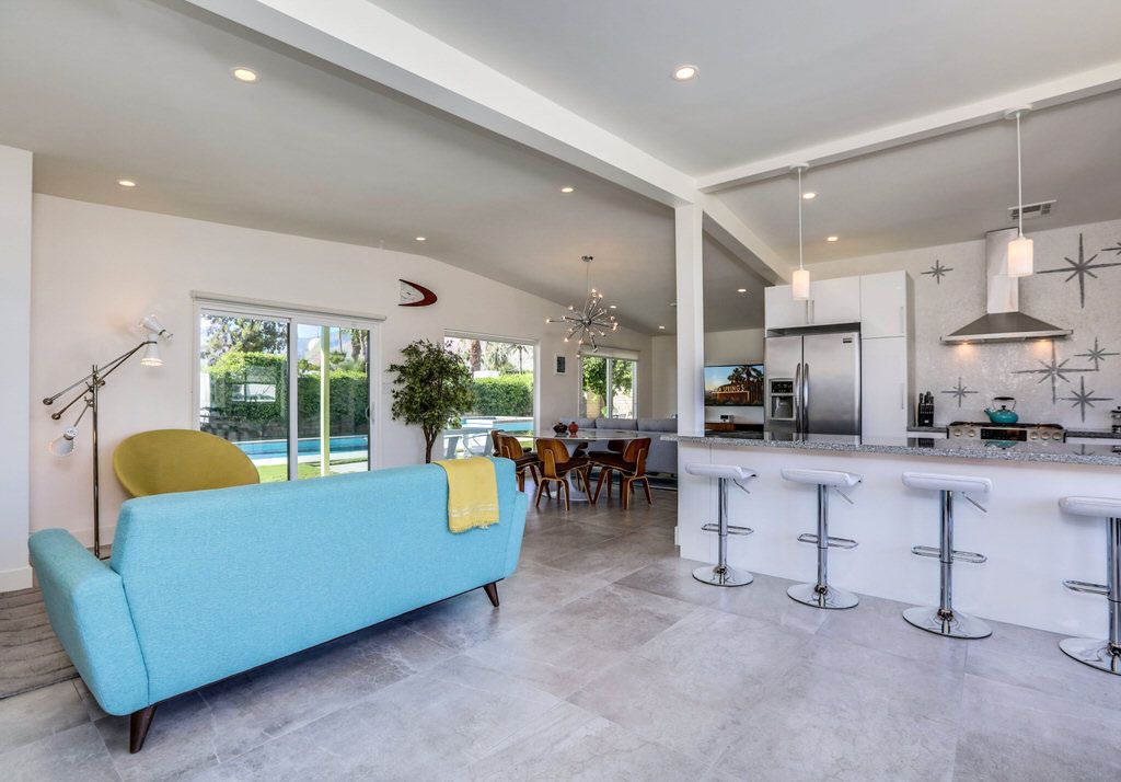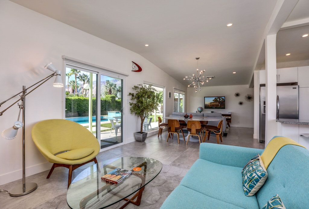 The living area of this Palm Springs getaway is open and spacious with large walls of glass, over-looking the gorgeous backyard. Just by looking outside your windows, you will be taken away by the beauty of Palm Springs.