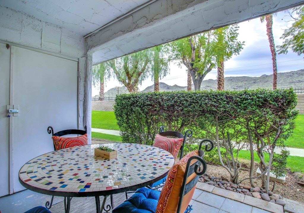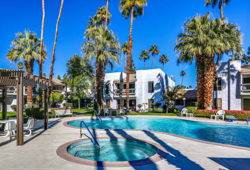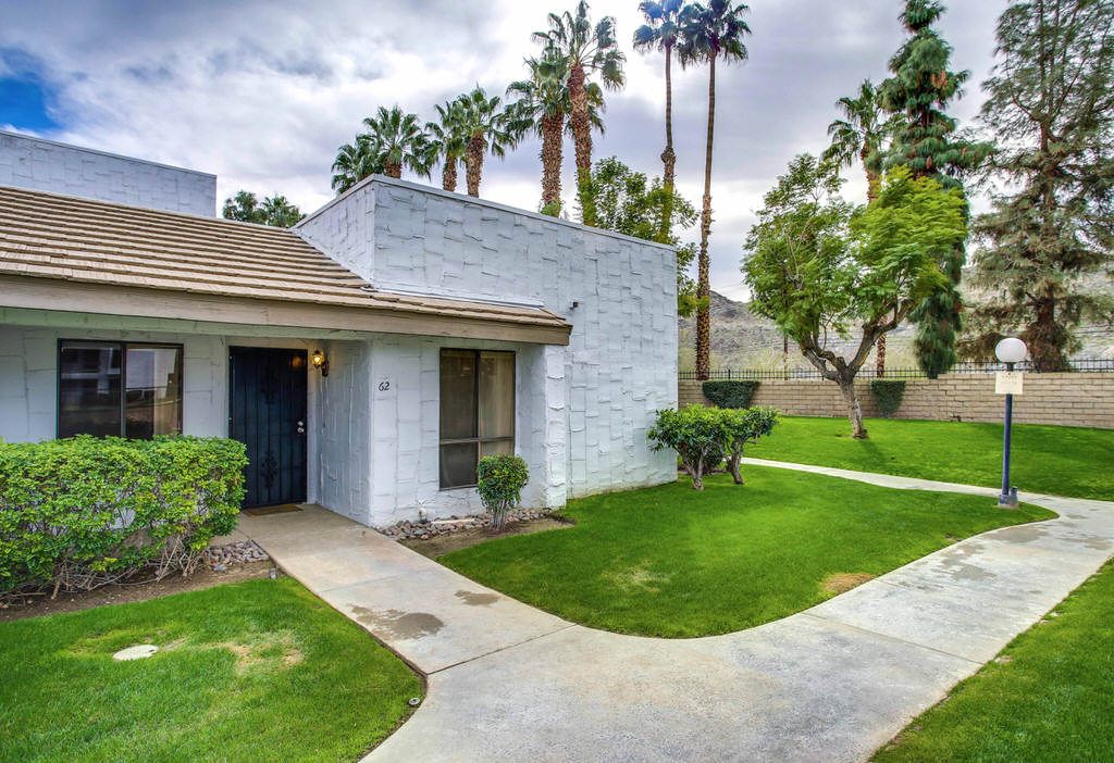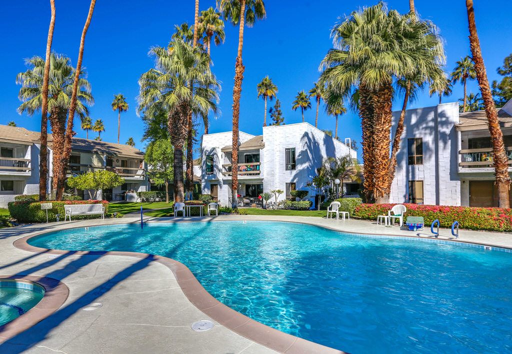 On the grounds of this Palm Springs condominium community, Palm Canyon Villas, you'll find lush landscaping and beautiful mountain views there are four large heated community pool and spas, along with tennis courts for your use.