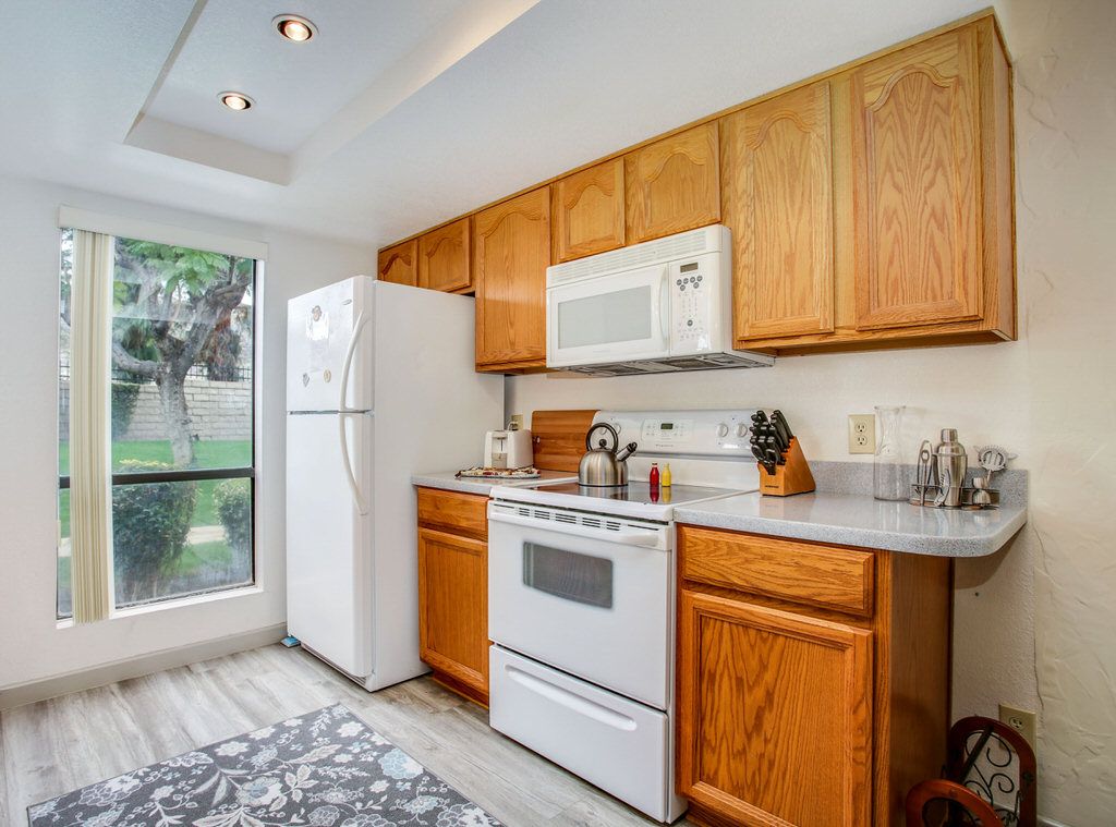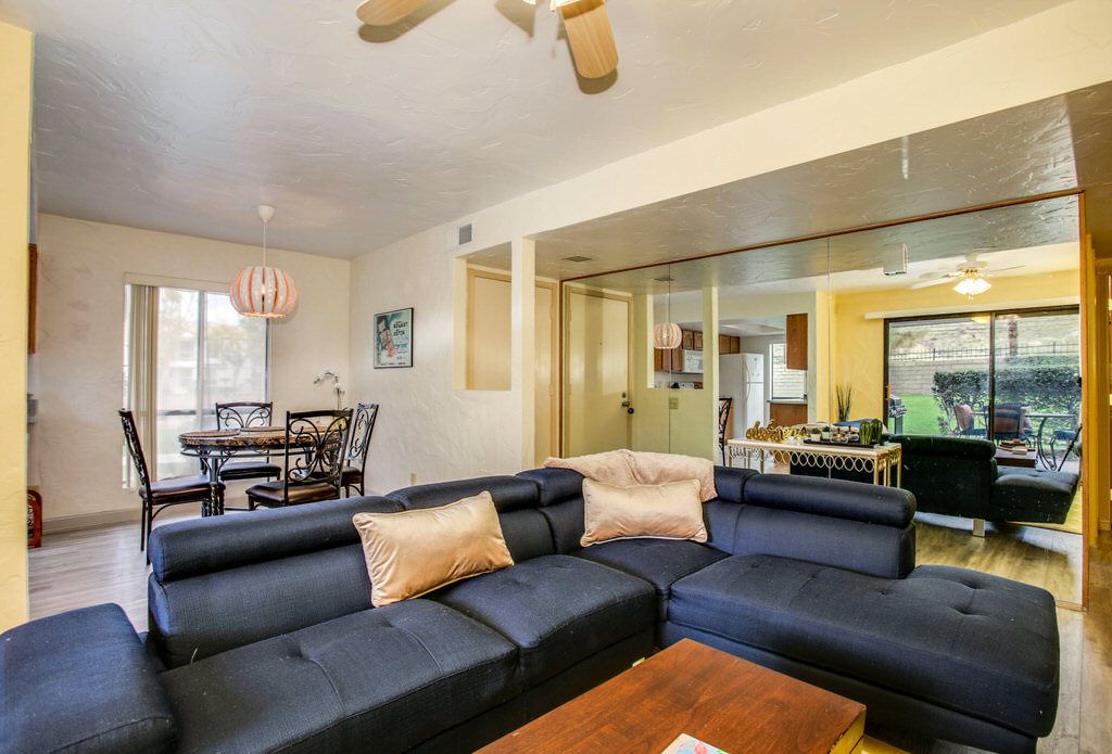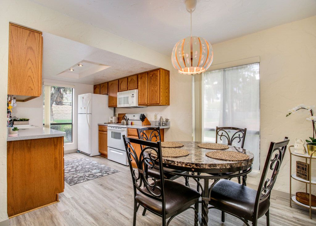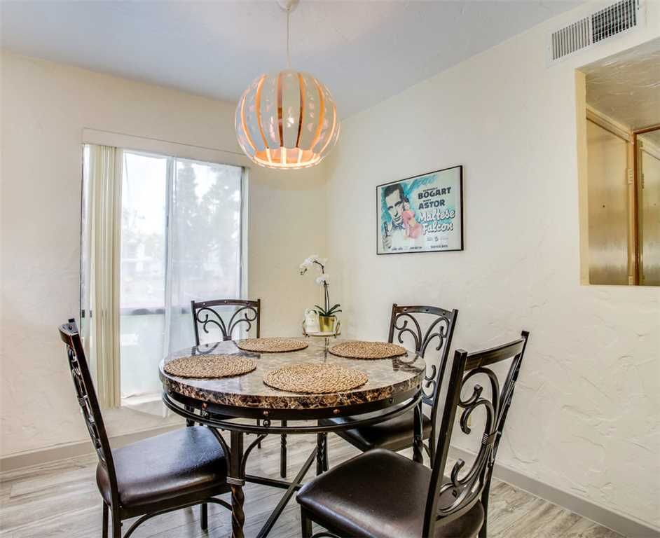 The dining area is equipped to sit four as natural light fills the living and dining rooms through a large sliding glass door opening to the patio.