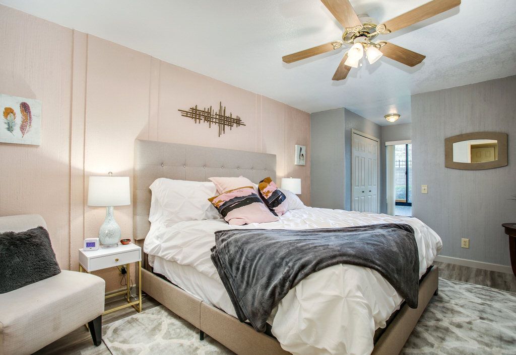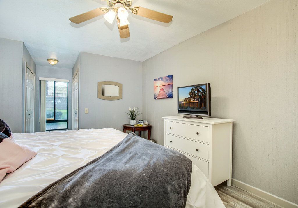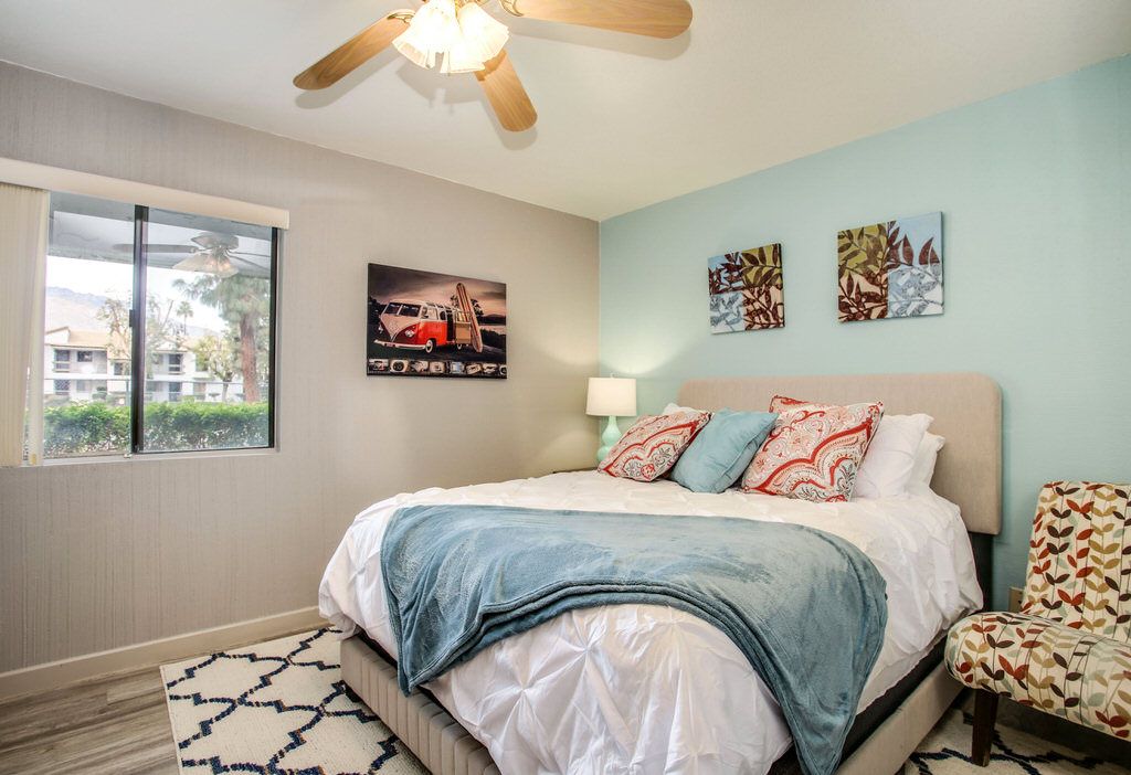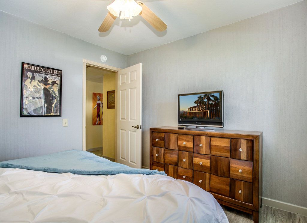 The master bedroom of this Palm Springs vacation condo is spacious and has a King size bed, 32” television with Roku, closet and en-suite bath with a walk-in shower.
