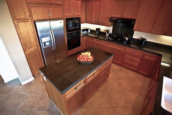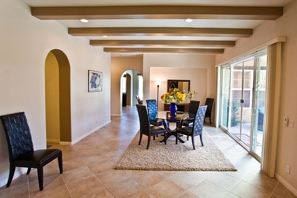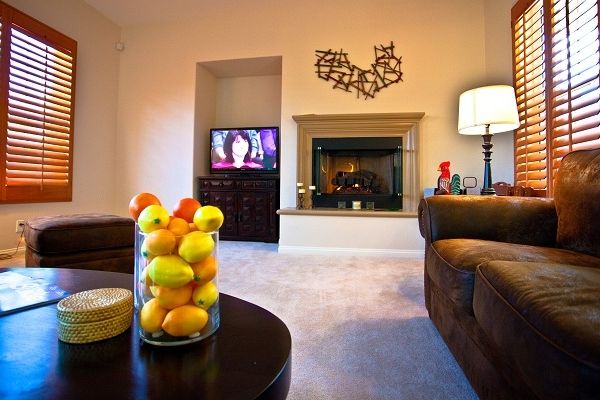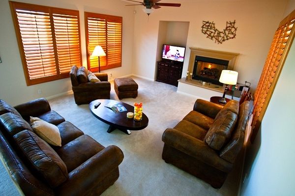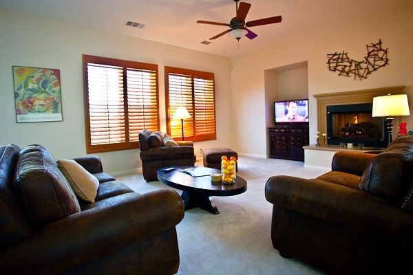 This Rancho Mirage vacation home features a gourmet kitchen with a large island, complete with all the utensils and amenities for the inspired chef. This vacation home has an open great room featuring comfortable seating, a fireplace and large flat screen TV, all available for your enjoyment.