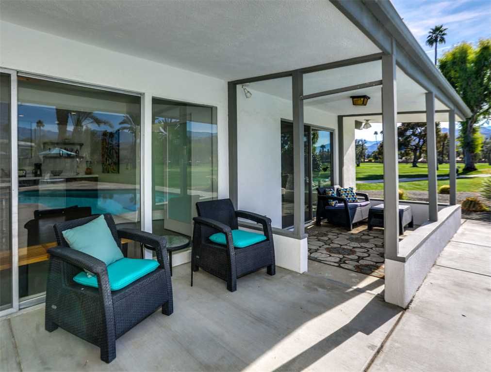 The outdoor furniture at ""Mod Reflections"" is comfortable and stylish and invites you to relax on one of the 4 lounge chairs, read a book in the outdoor living room style seating area, or watch golfers tee off as you lounge on a pool float.